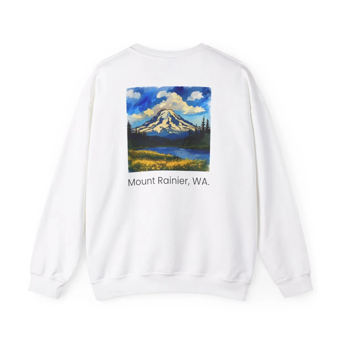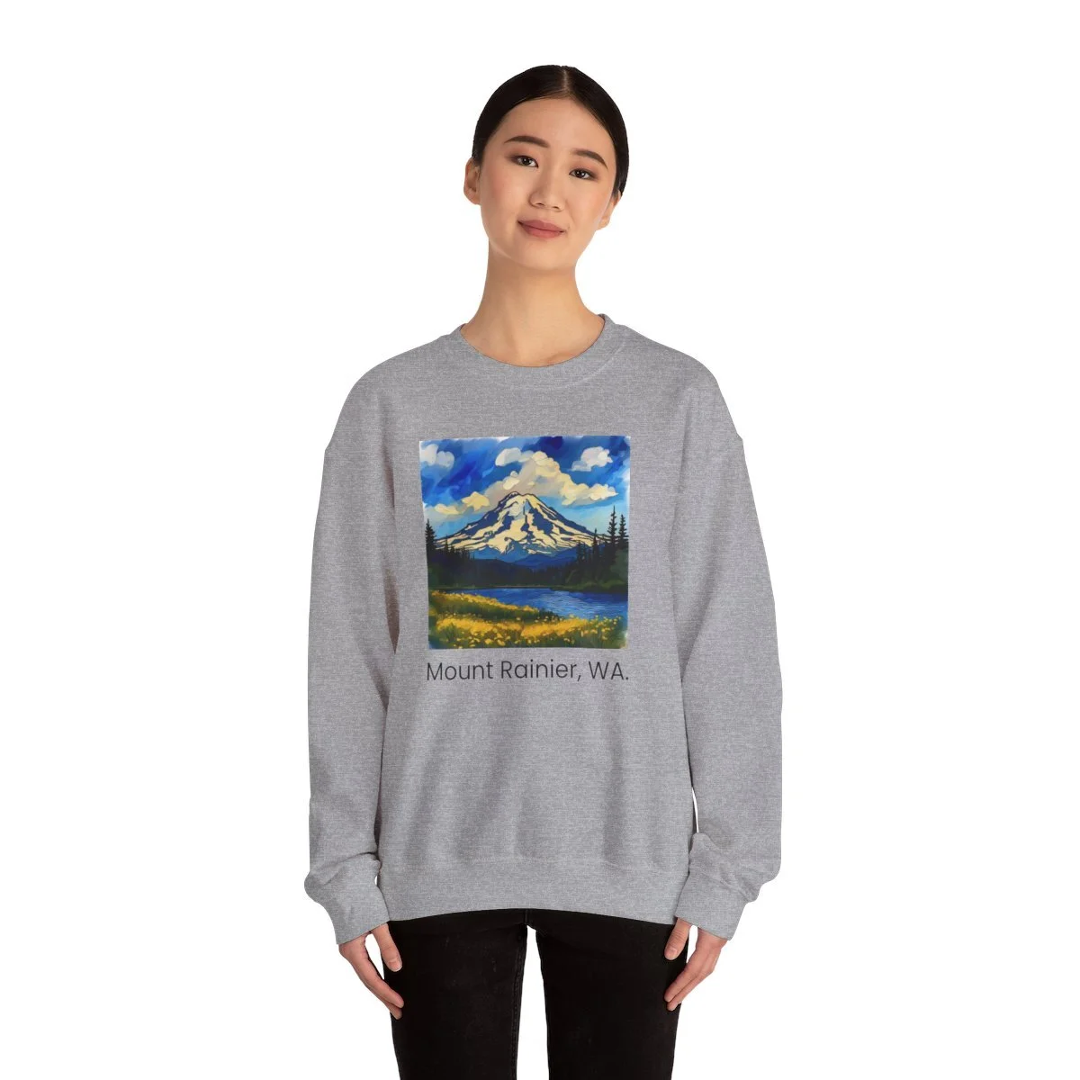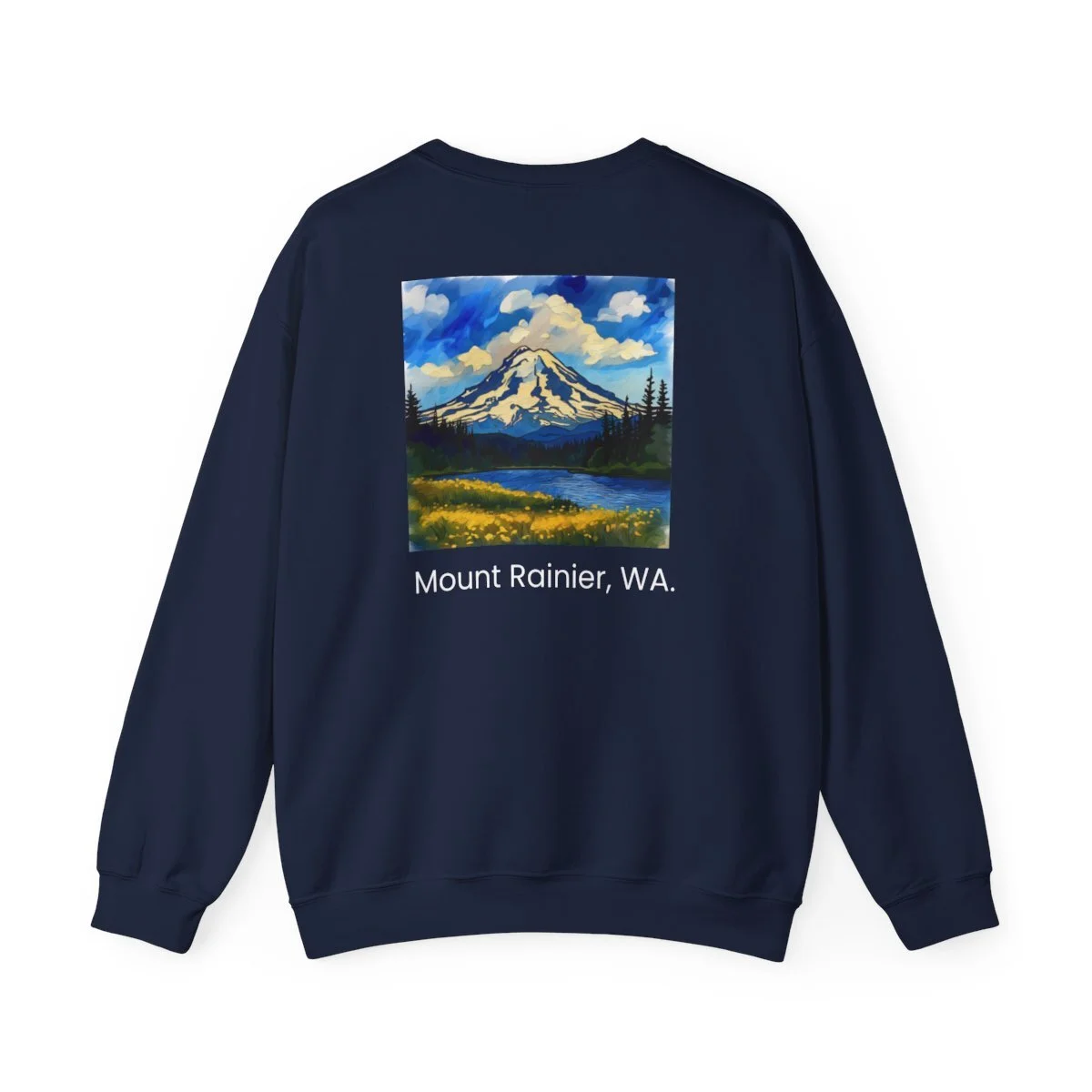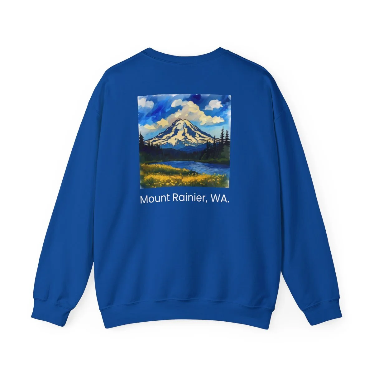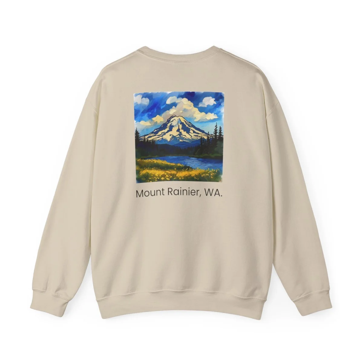 Ideal for any situation, this unisex heavy blend crewneck sweatshirt is pure comfort. These garments are made from polyester and cotton. The collar is ribbed knit, so it retains its shape even after washing. There are no itchy side seams on these sweaters. The sweatshirt is designed with a picturesque watercolor image of a beautiful day in the valley below Mount Rainier, Washington. Both the image and the lettering appear on both sides of the sweatshirt.