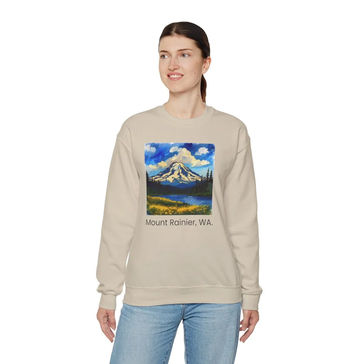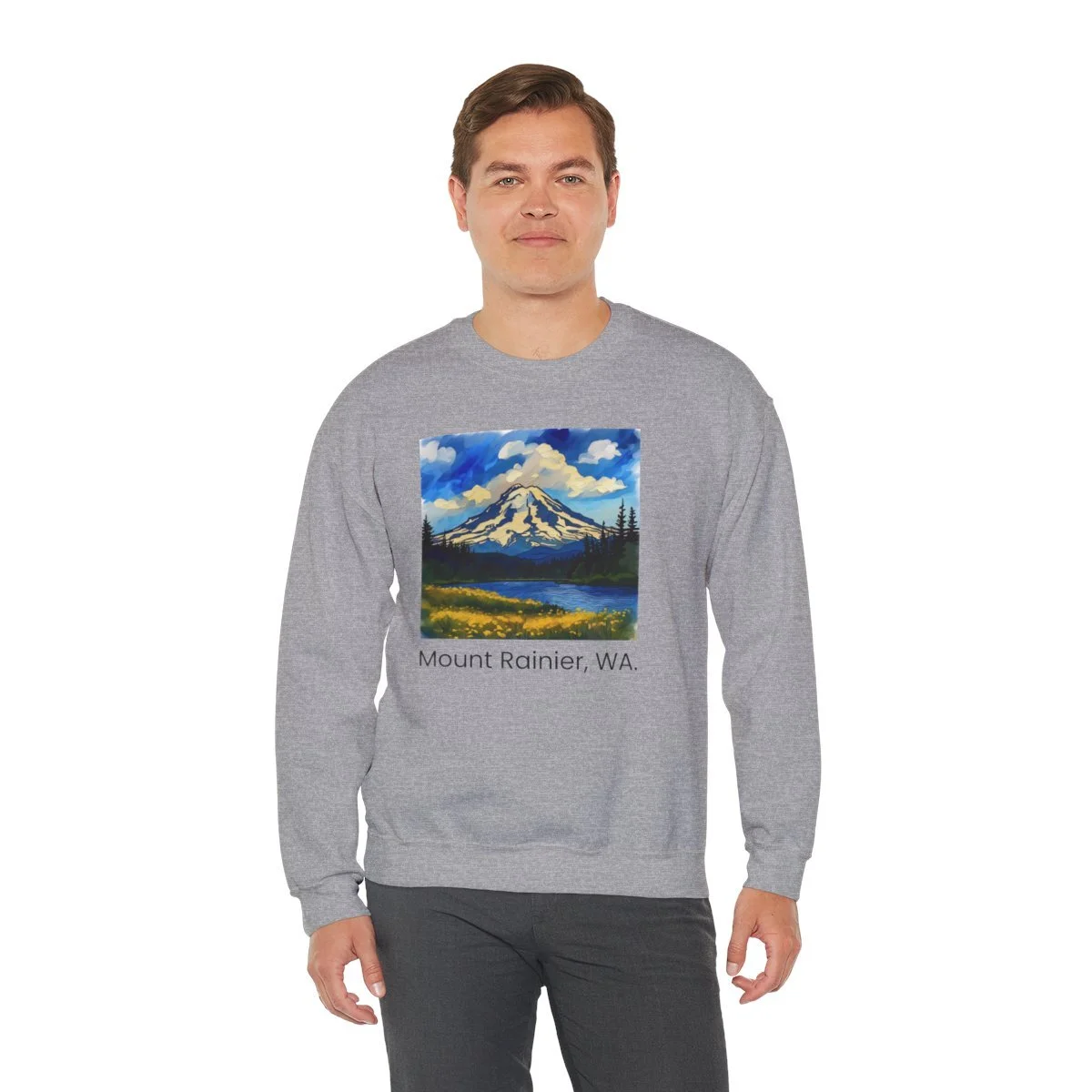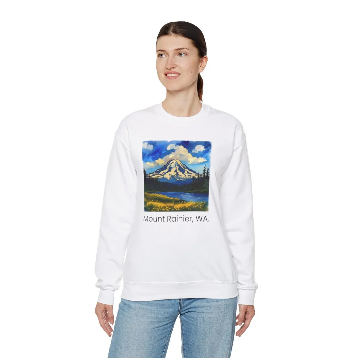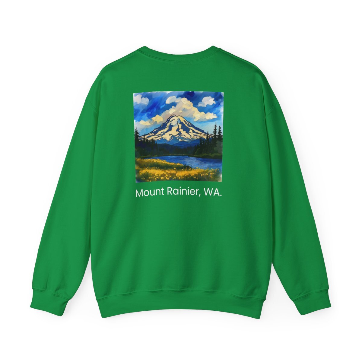 Ideal for any situation, this unisex heavy blend crewneck sweatshirt is pure comfort. These garments are made from polyester and cotton. The collar is ribbed knit, so it retains its shape even after washing. There are no itchy side seams on these sweaters. The sweatshirt is designed with a picturesque watercolor image of a beautiful day in the valley below Mount Rainier, Washington. Both the image and the lettering appear on both sides of the sweatshirt.