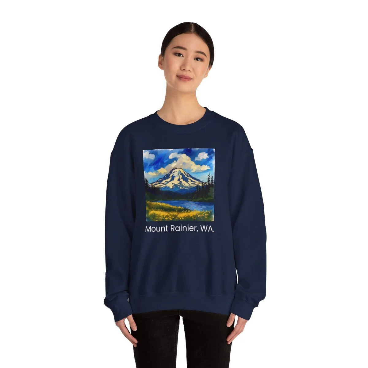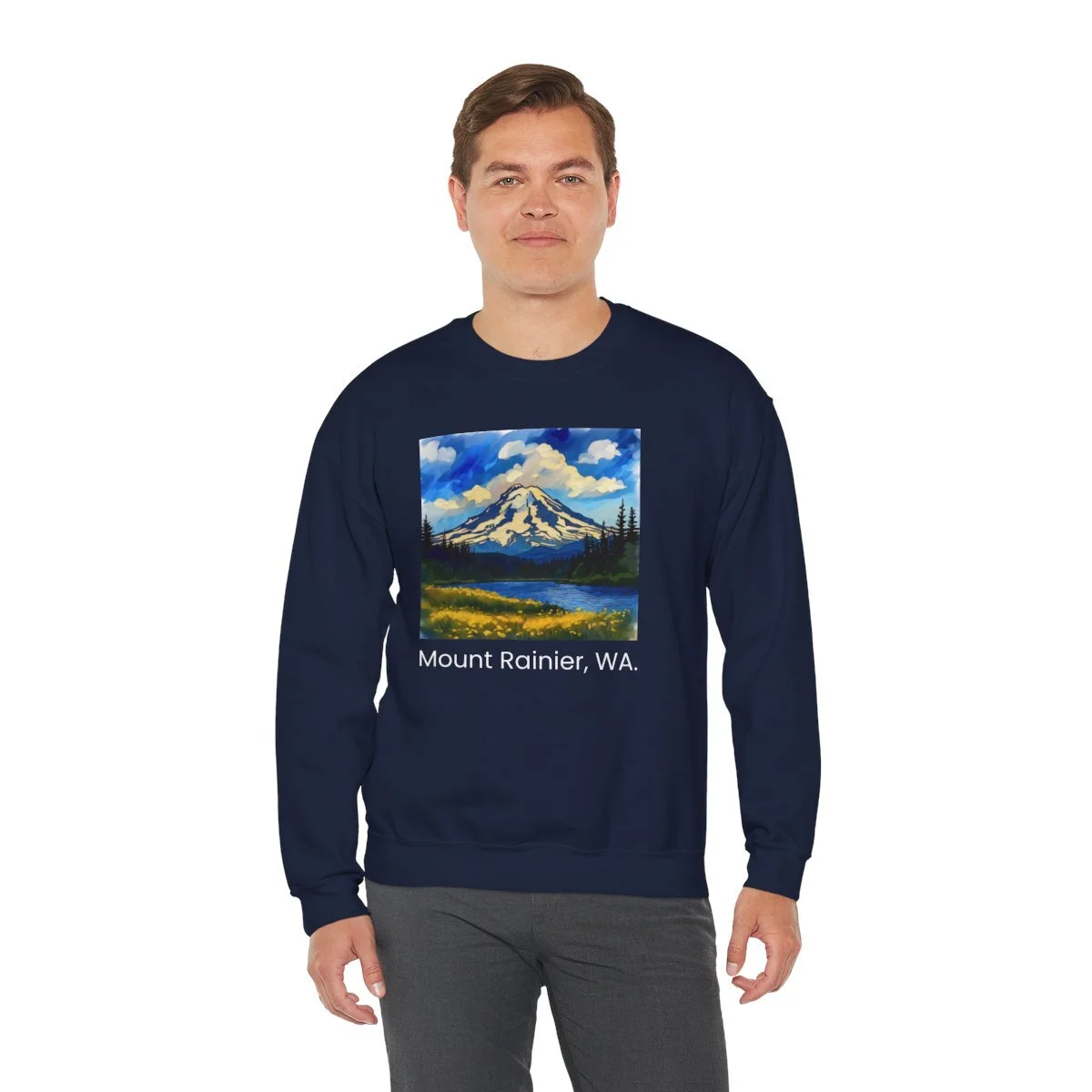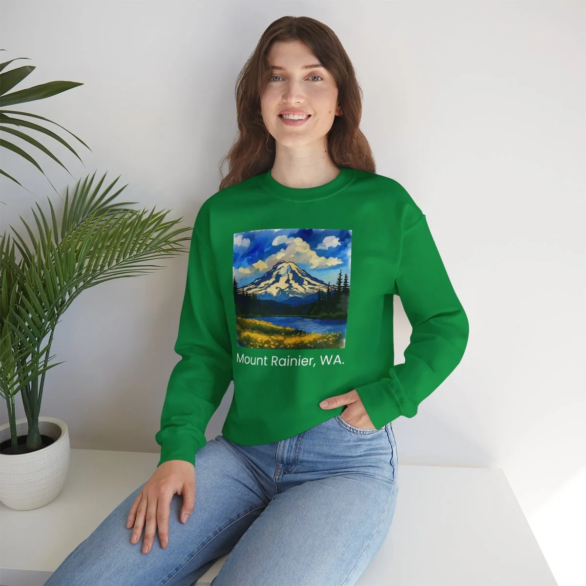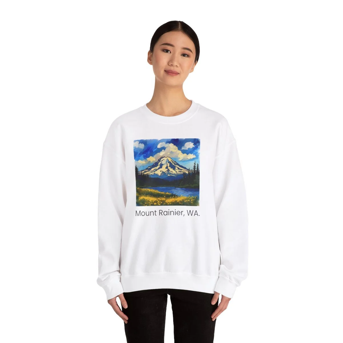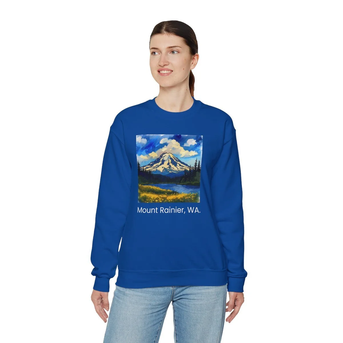 Ideal for any situation, this unisex heavy blend crewneck sweatshirt is pure comfort. These garments are made from polyester and cotton. The collar is ribbed knit, so it retains its shape even after washing. There are no itchy side seams on these sweaters. The sweatshirt is designed with a picturesque watercolor image of a beautiful day in the valley below Mount Rainier, Washington. Both the image and the lettering appear on both sides of the sweatshirt.