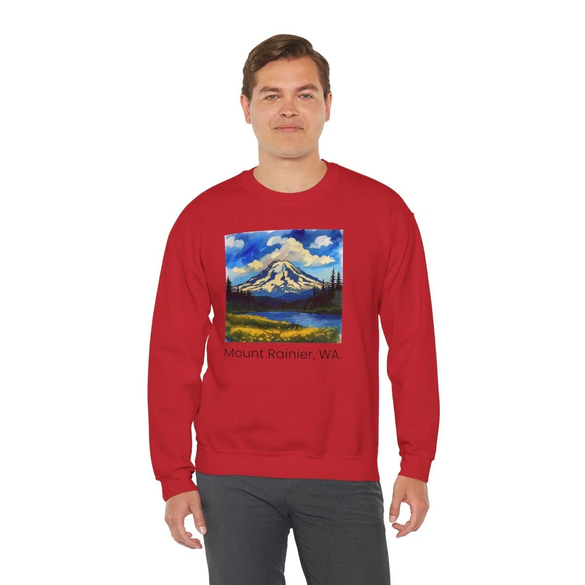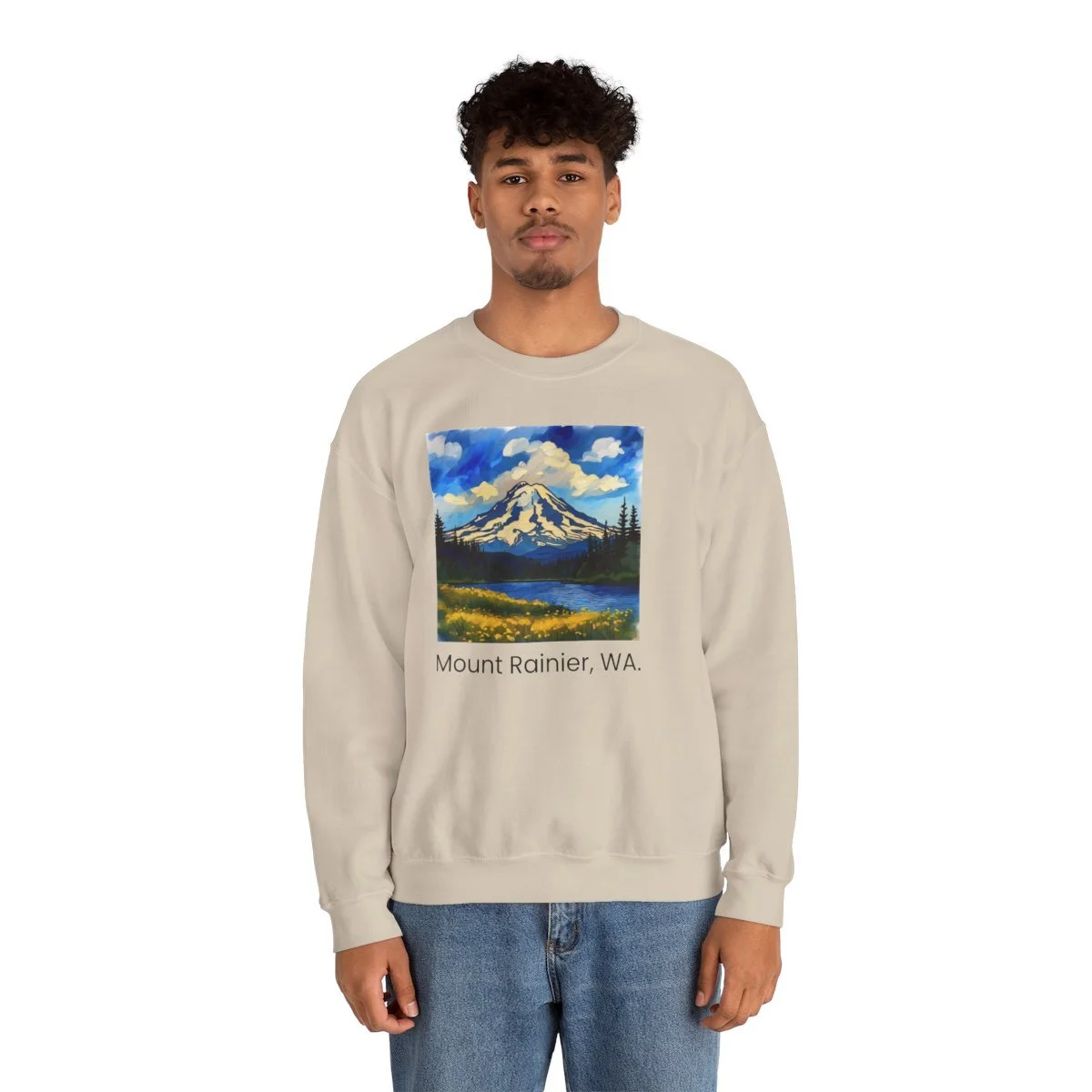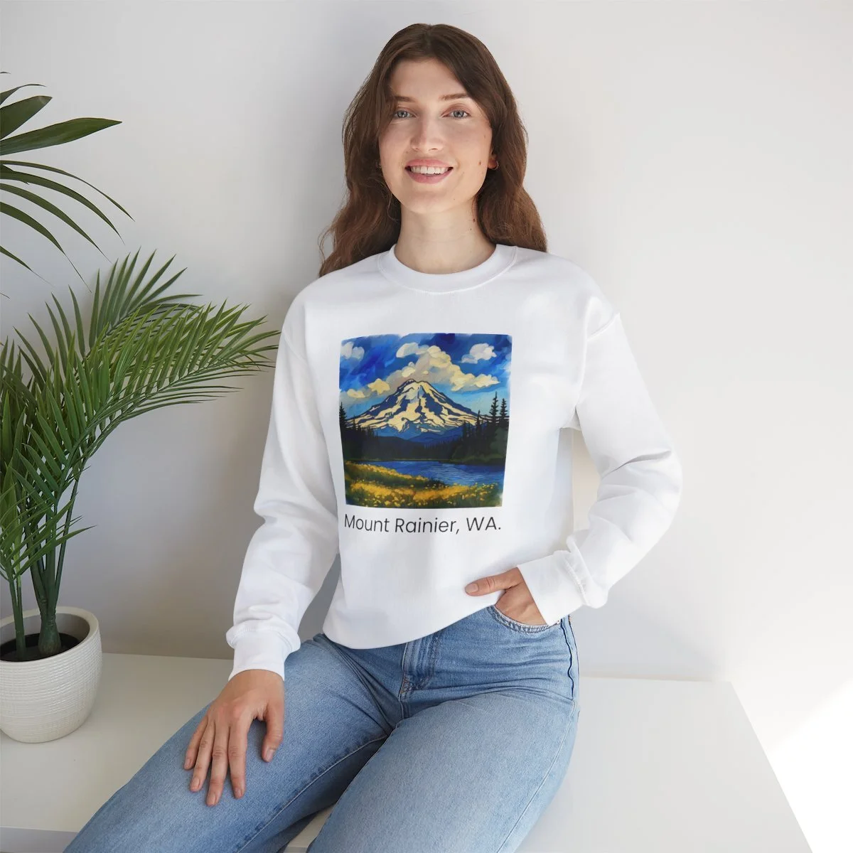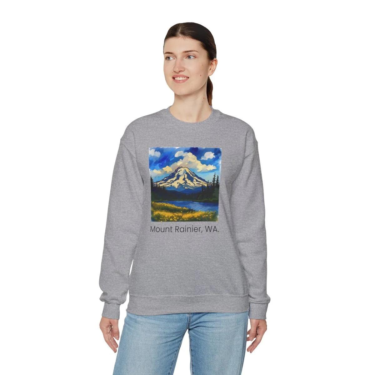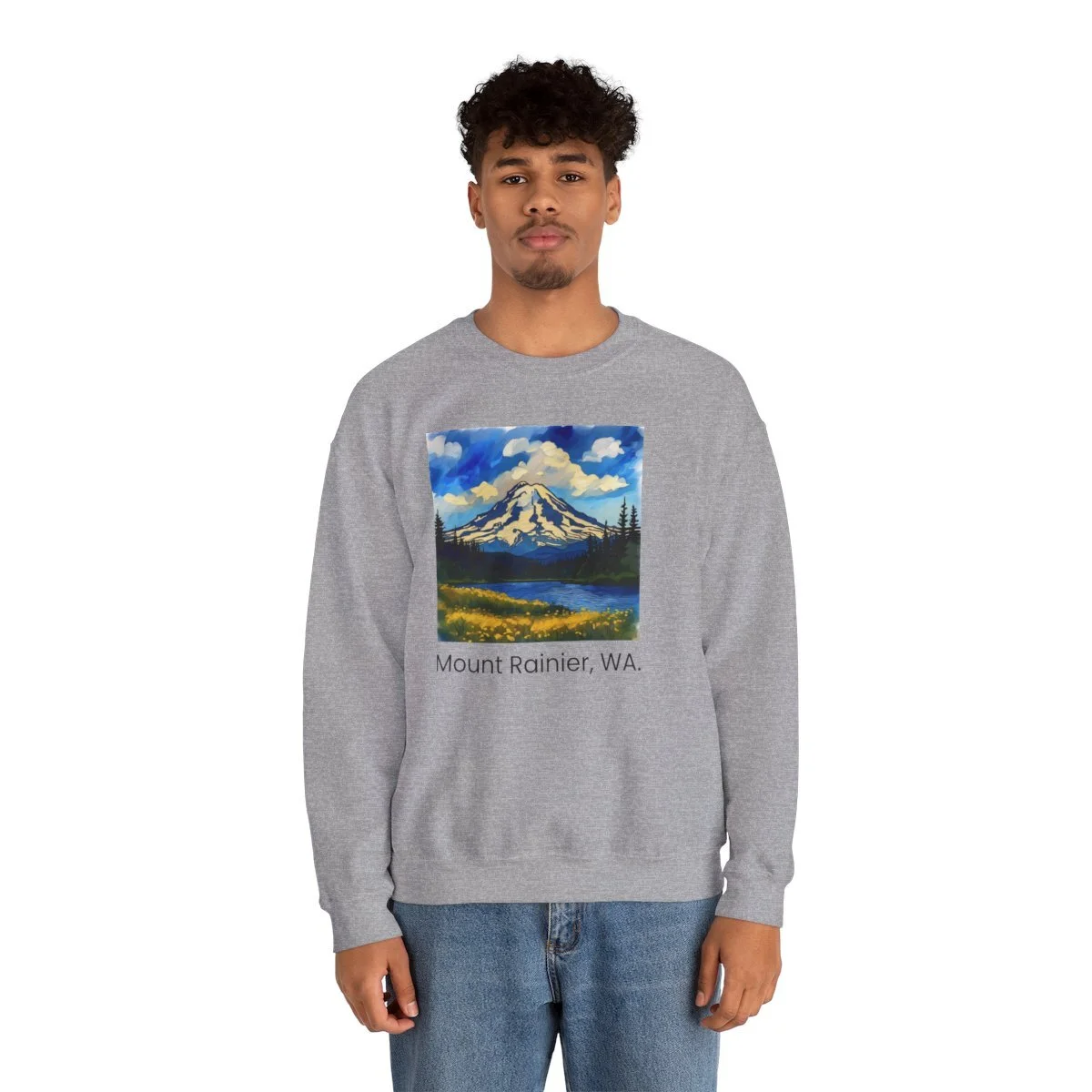Ideal for any situation, this unisex heavy blend crewneck sweatshirt is pure comfort. These garments are made from polyester and cotton. The collar is ribbed knit, so it retains its shape even after washing. There are no itchy side seams on these sweaters. The sweatshirt is designed with a picturesque watercolor image of a beautiful day in the valley below Mount Rainier, Washington. Both the image and the lettering appear on both sides of the sweatshirt.