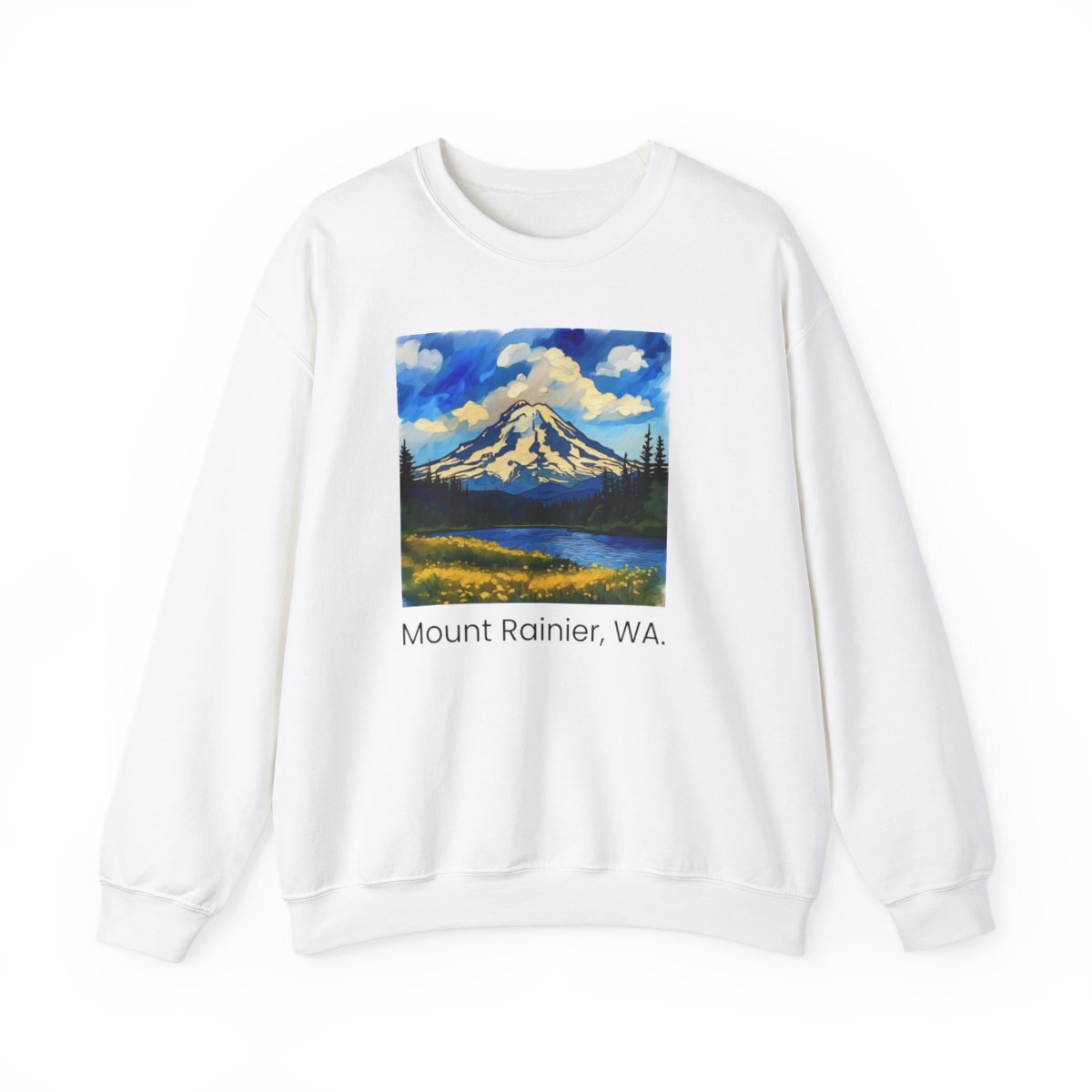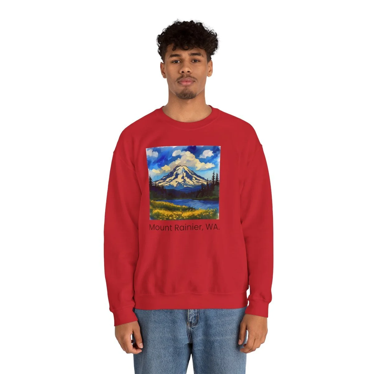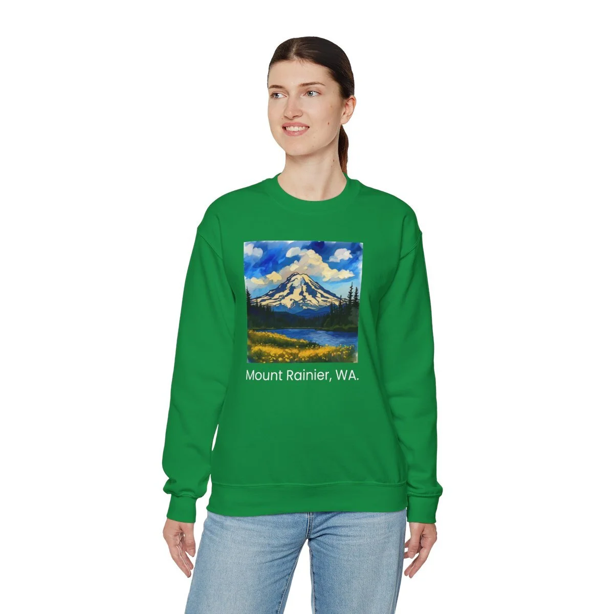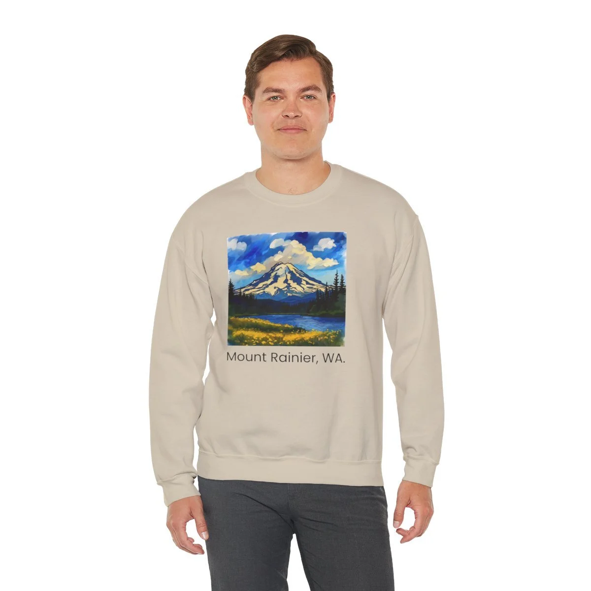 Ideal for any situation, this unisex heavy blend crewneck sweatshirt is pure comfort. These garments are made from polyester and cotton. The collar is ribbed knit, so it retains its shape even after washing. There are no itchy side seams on these sweaters. The sweatshirt is designed with a picturesque watercolor image of a beautiful day in the valley below Mount Rainier, Washington. Both the image and the lettering appear on both sides of the sweatshirt.