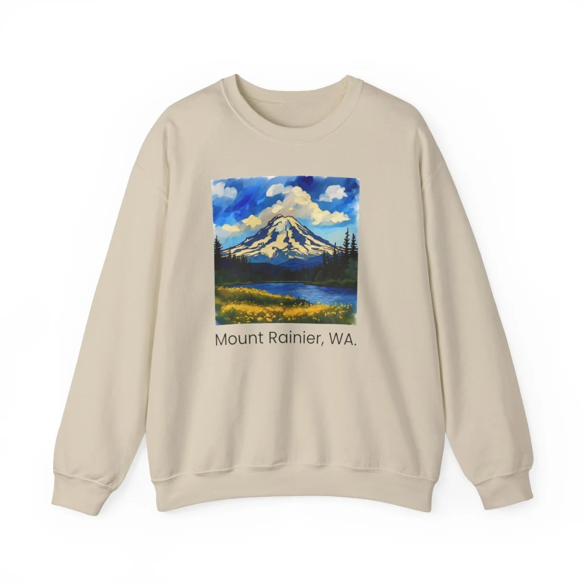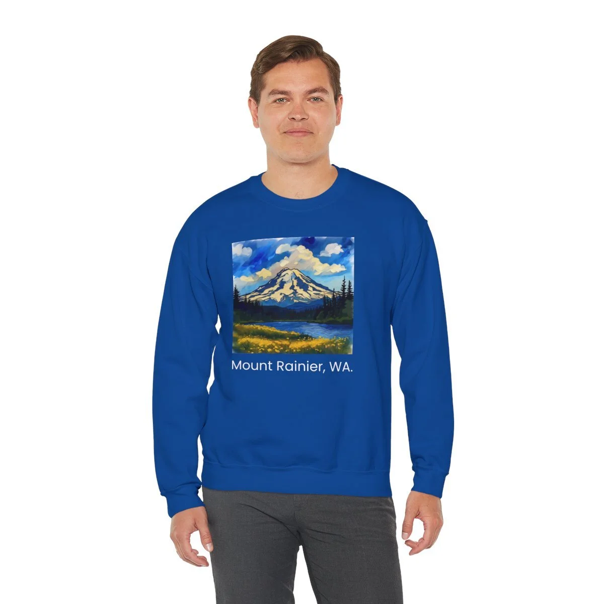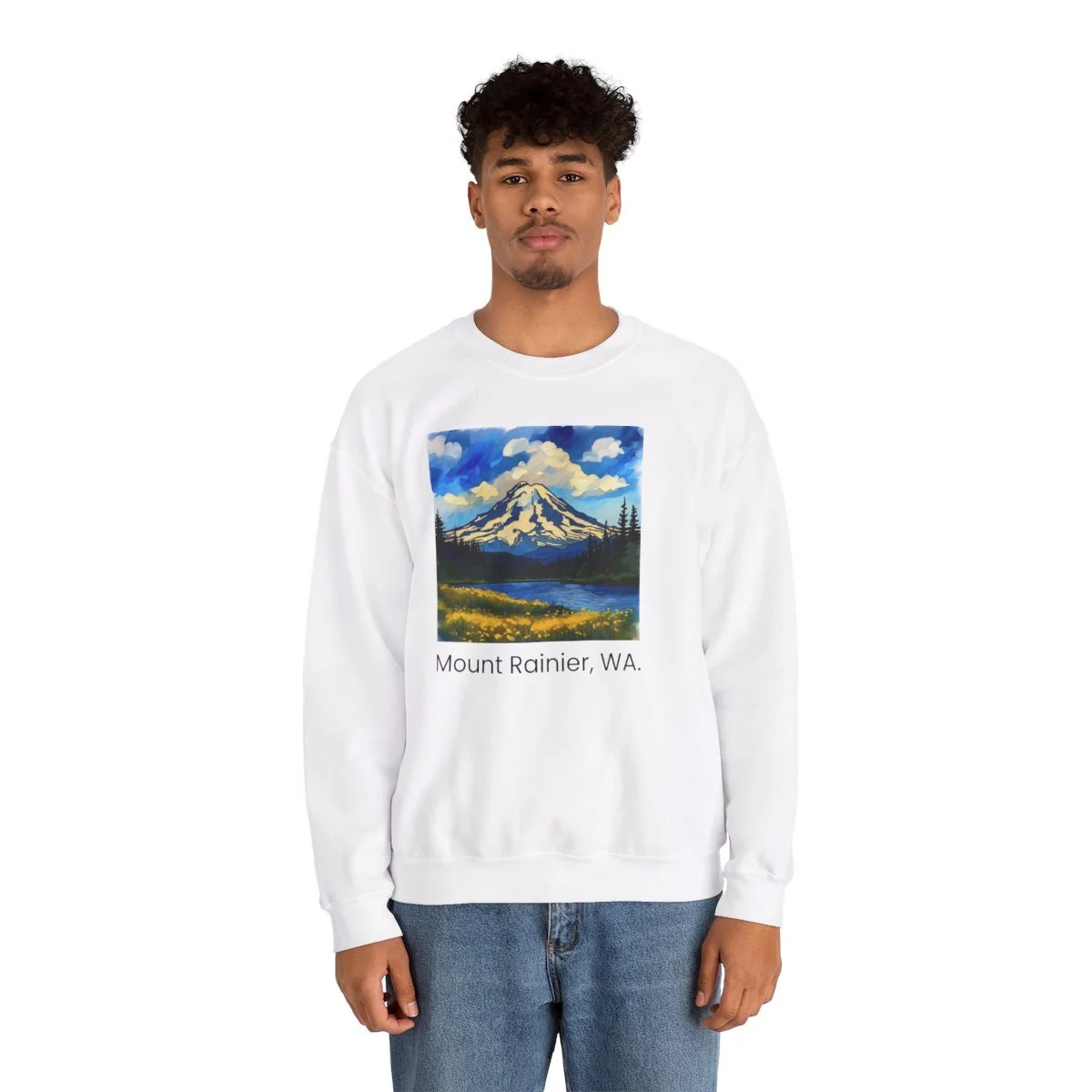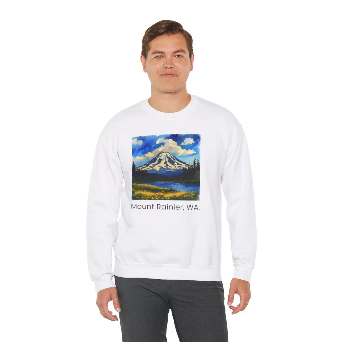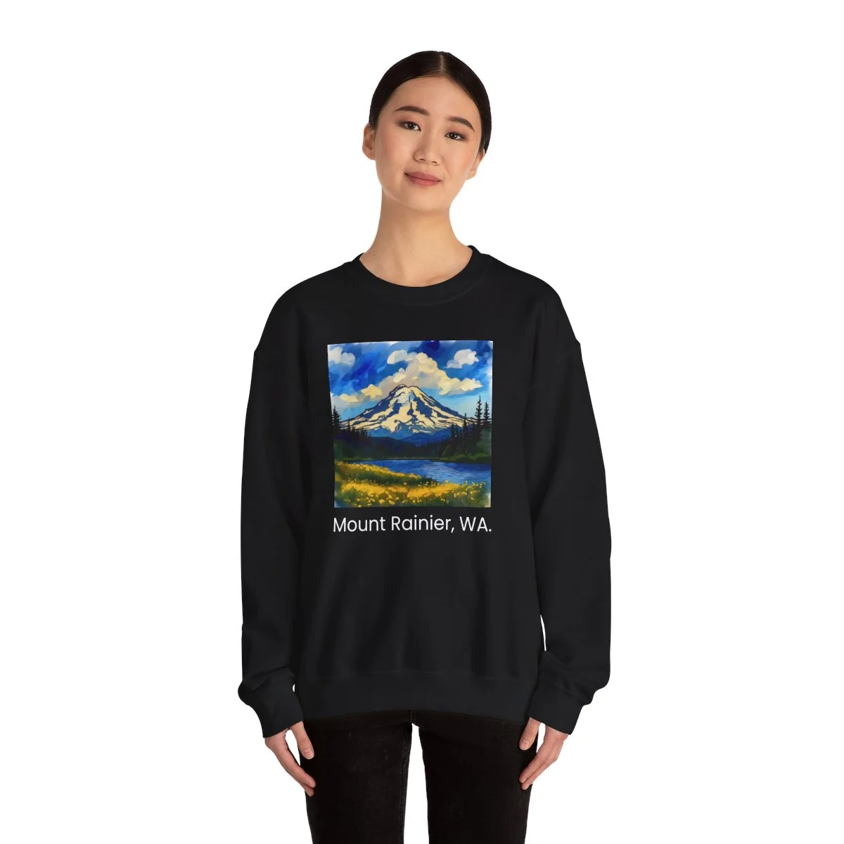Ideal for any situation, this unisex heavy blend crewneck sweatshirt is pure comfort. These garments are made from polyester and cotton. The collar is ribbed knit, so it retains its shape even after washing. There are no itchy side seams on these sweaters. The sweatshirt is designed with a picturesque watercolor image of a beautiful day in the valley below Mount Rainier, Washington. Both the image and the lettering appear on both sides of the sweatshirt.