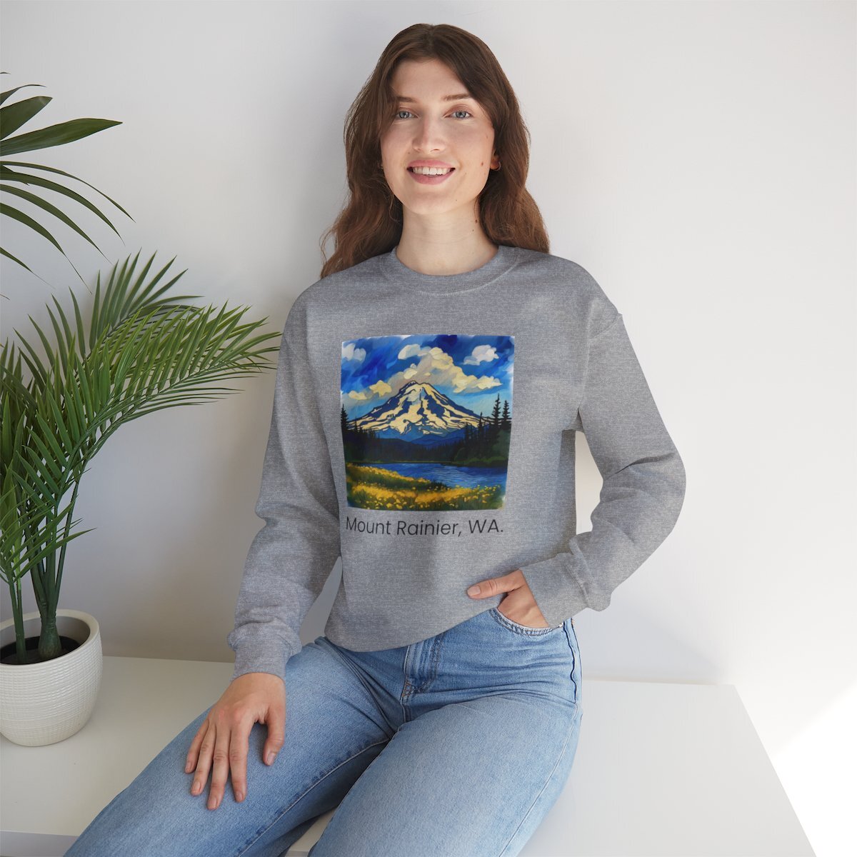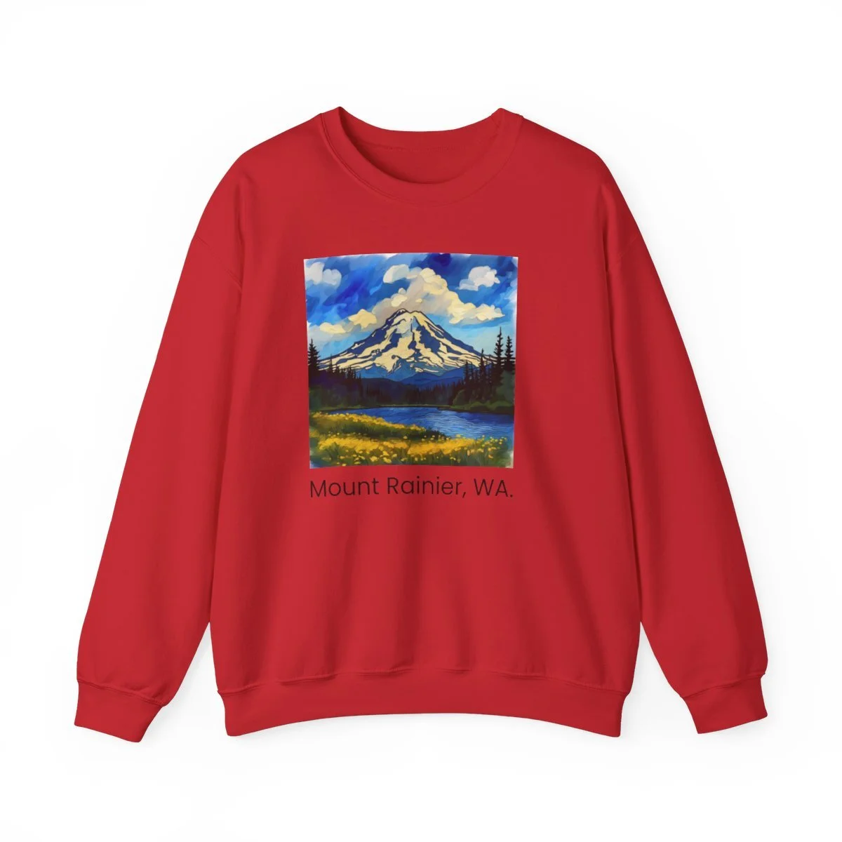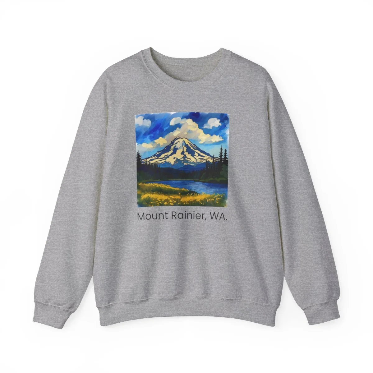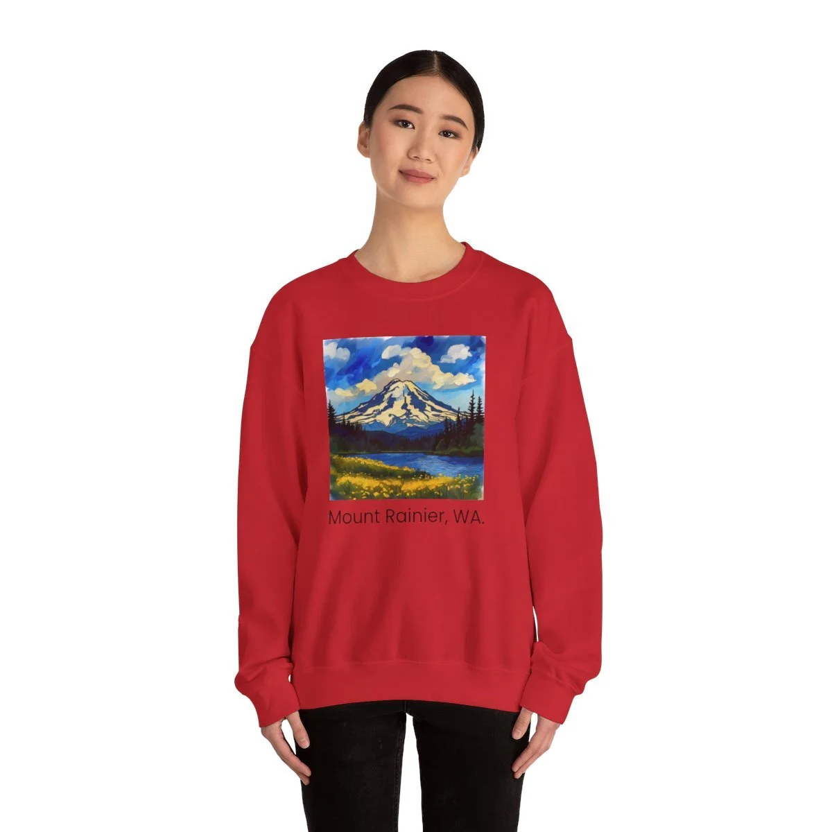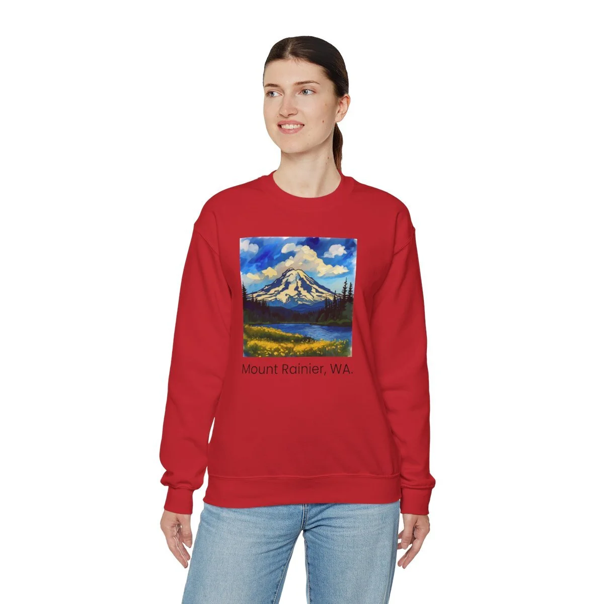 Ideal for any situation, this unisex heavy blend crewneck sweatshirt is pure comfort. These garments are made from polyester and cotton. The collar is ribbed knit, so it retains its shape even after washing. There are no itchy side seams on these sweaters. The sweatshirt is designed with a picturesque watercolor image of a beautiful day in the valley below Mount Rainier, Washington. Both the image and the lettering appear on both sides of the sweatshirt.