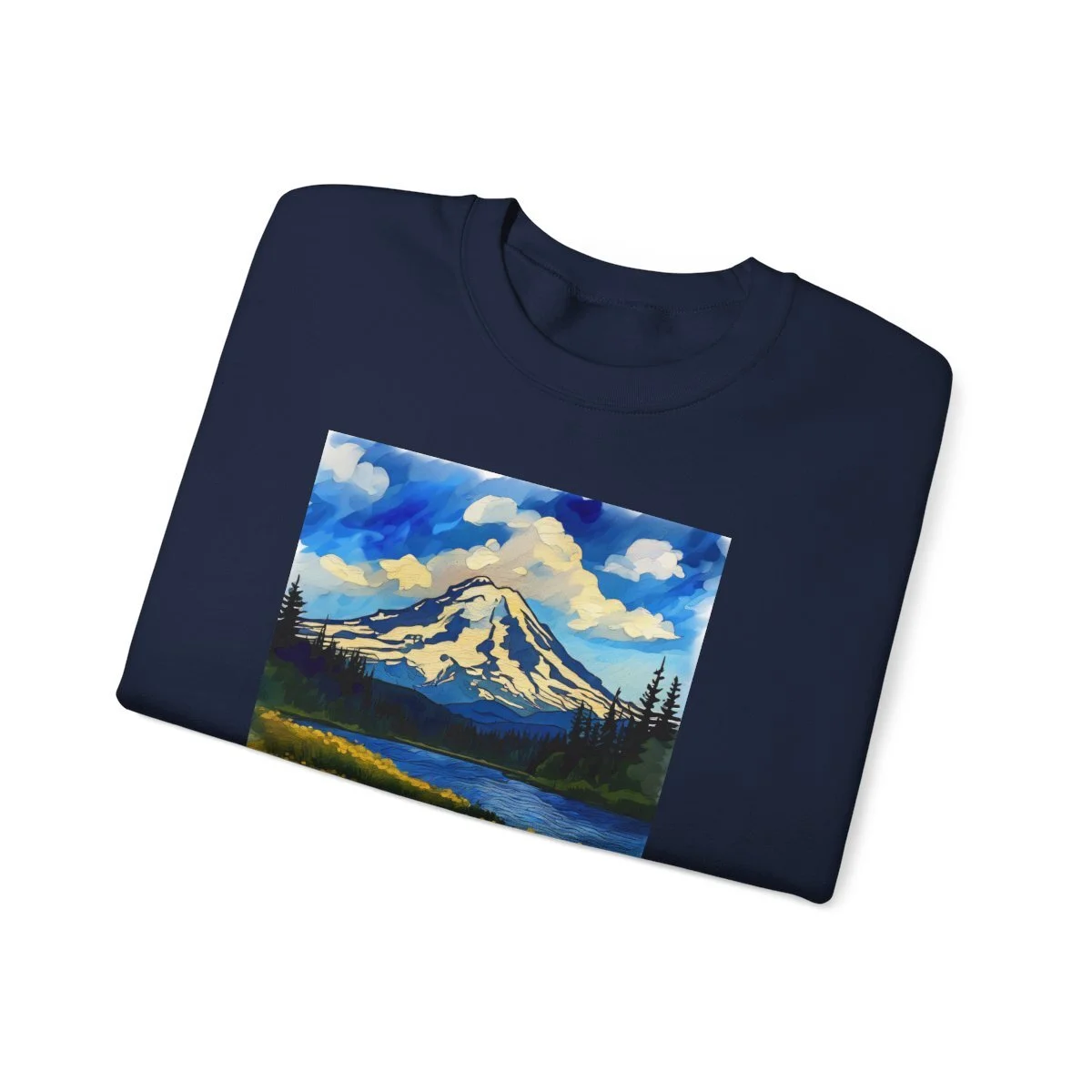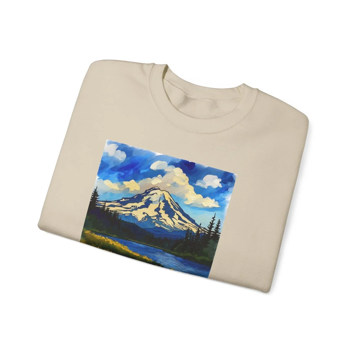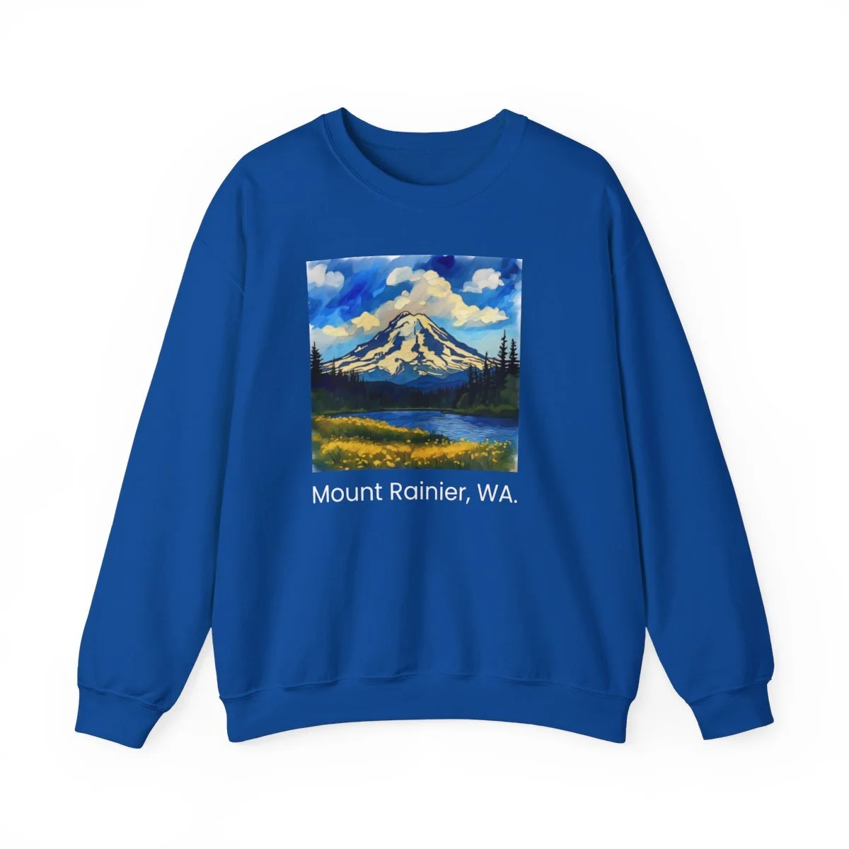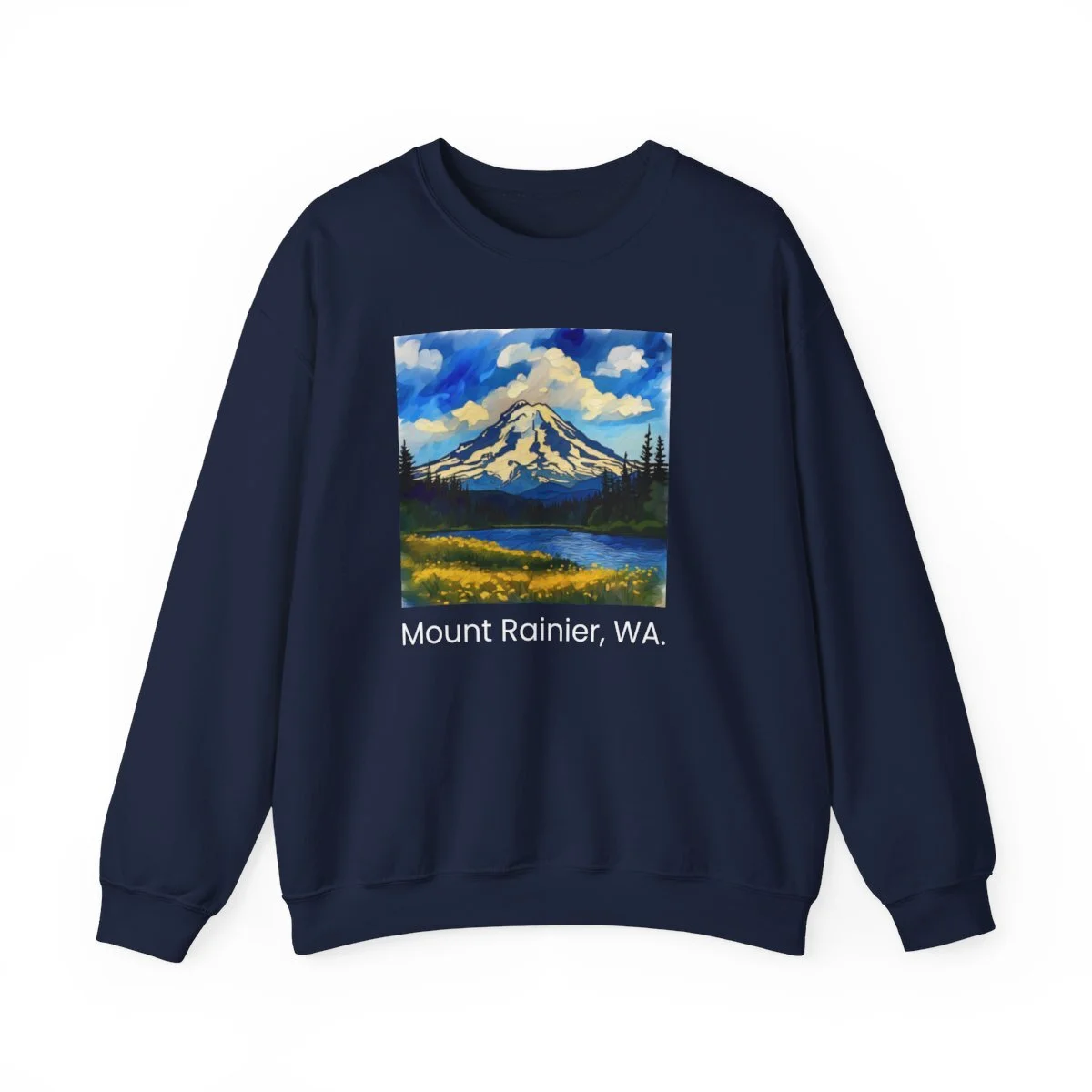 Ideal for any situation, this unisex heavy blend crewneck sweatshirt is pure comfort. These garments are made from polyester and cotton. The collar is ribbed knit, so it retains its shape even after washing. There are no itchy side seams on these sweaters. The sweatshirt is designed with a picturesque watercolor image of a beautiful day in the valley below Mount Rainier, Washington. Both the image and the lettering appear on both sides of the sweatshirt.