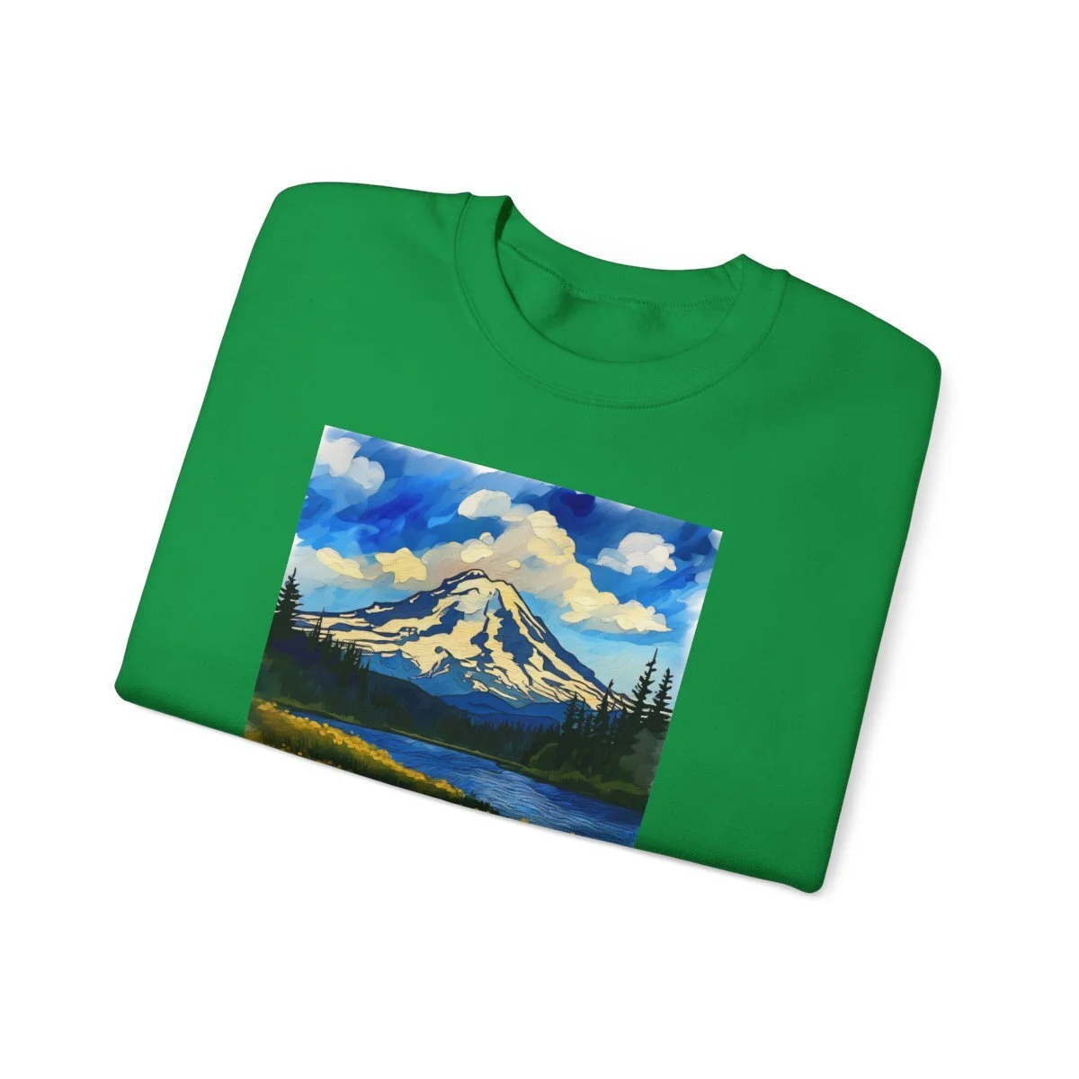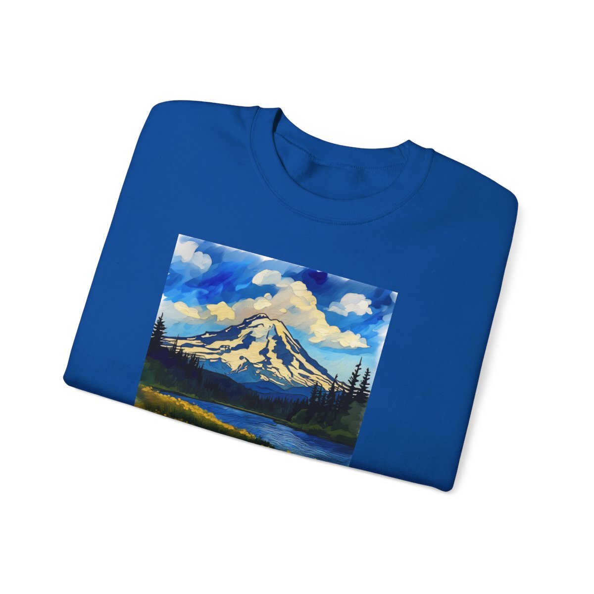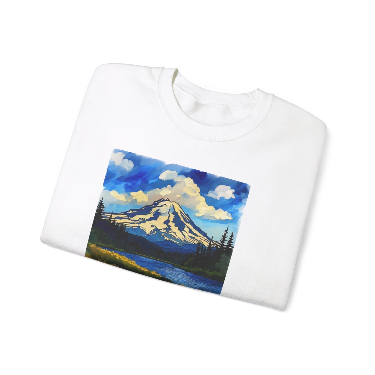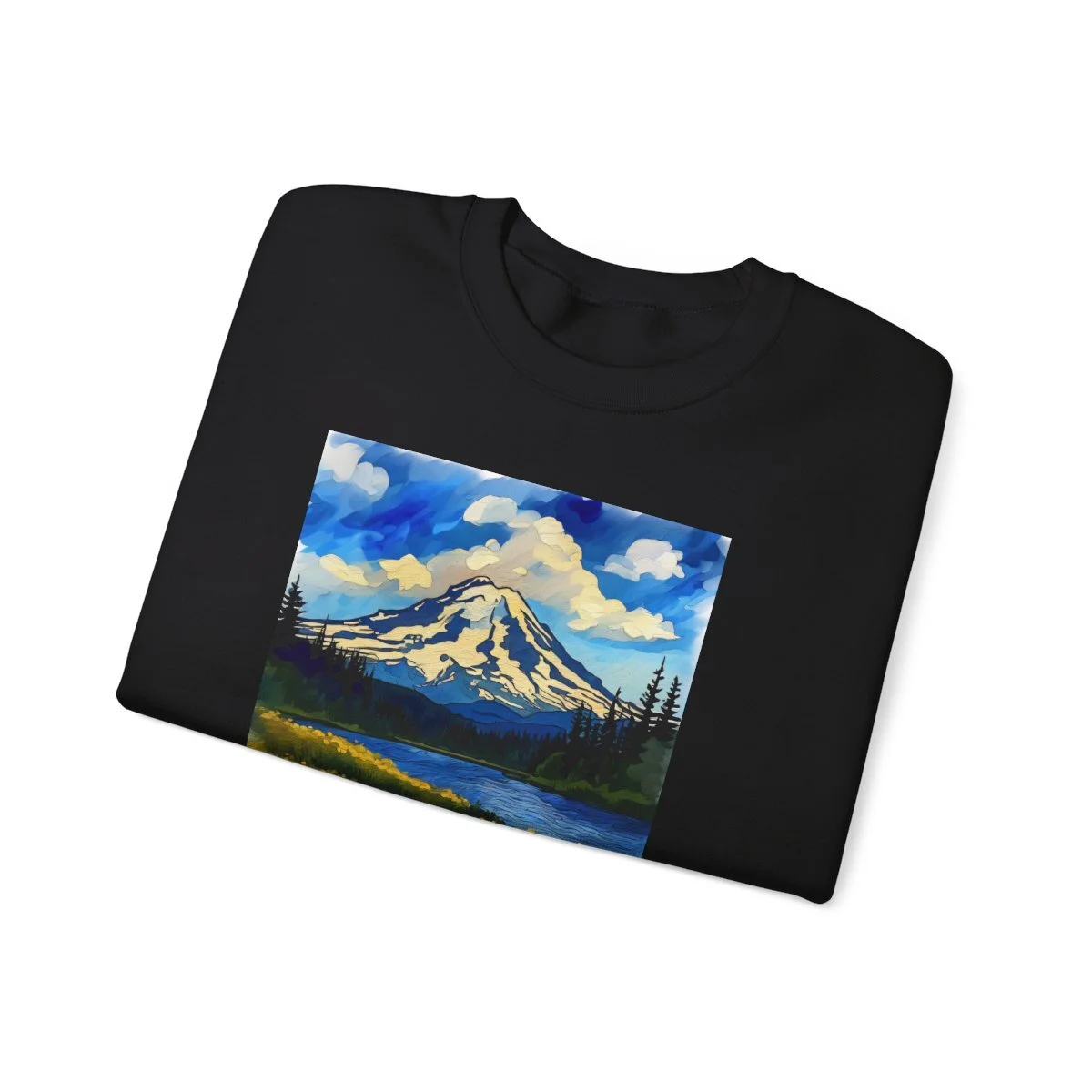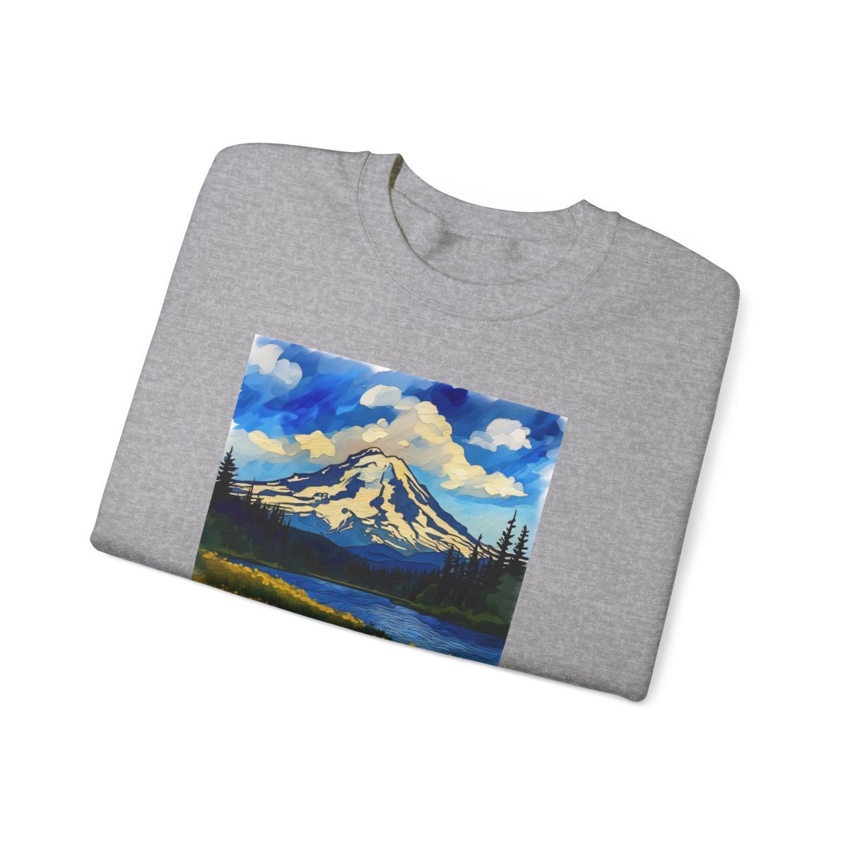 Ideal for any situation, this unisex heavy blend crewneck sweatshirt is pure comfort. These garments are made from polyester and cotton. The collar is ribbed knit, so it retains its shape even after washing. There are no itchy side seams on these sweaters. The sweatshirt is designed with a picturesque watercolor image of a beautiful day in the valley below Mount Rainier, Washington. Both the image and the lettering appear on both sides of the sweatshirt.