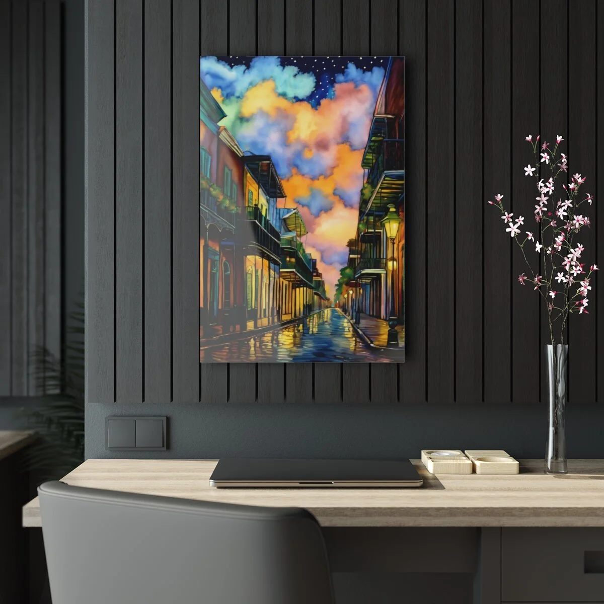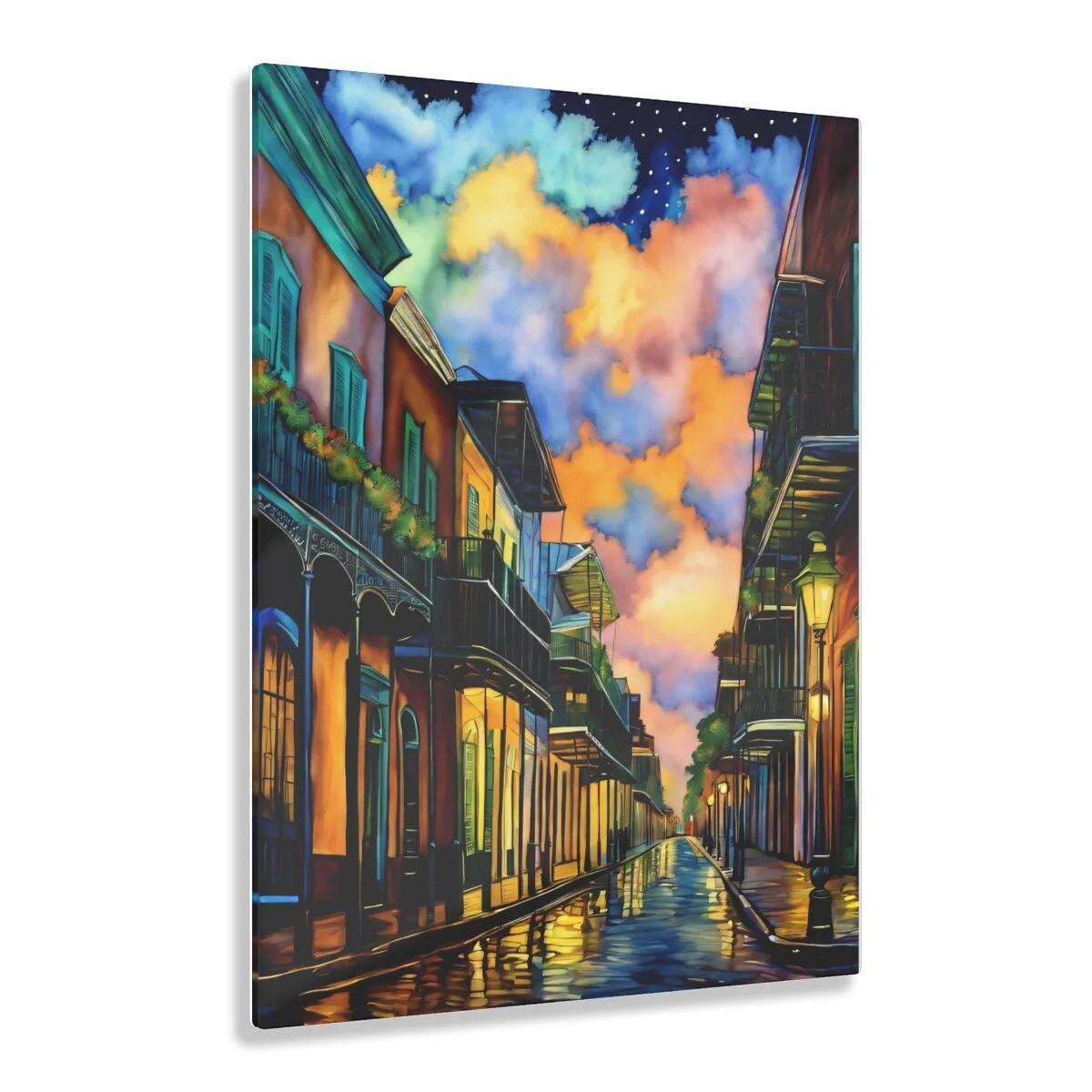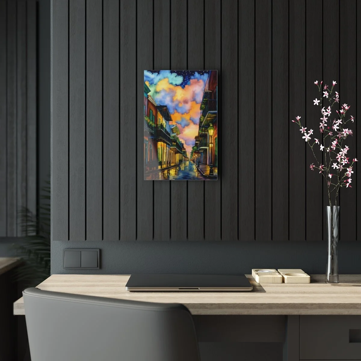 Capture the beauty of evening on Bourbon Street, in this stunning watercolor image. Made to seem like your images are printed on a glass surface, these acrylic photo prints never fail to dazzle. This image is second-surface printed directly on a 1/4" acrylic panel for a stunning result. Each acrylic print comes ready to hang, and floats 1.5" off the wall.