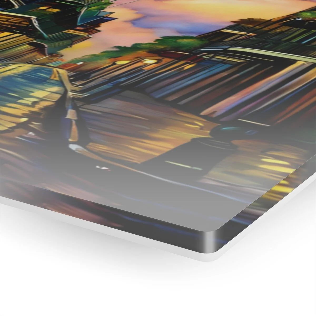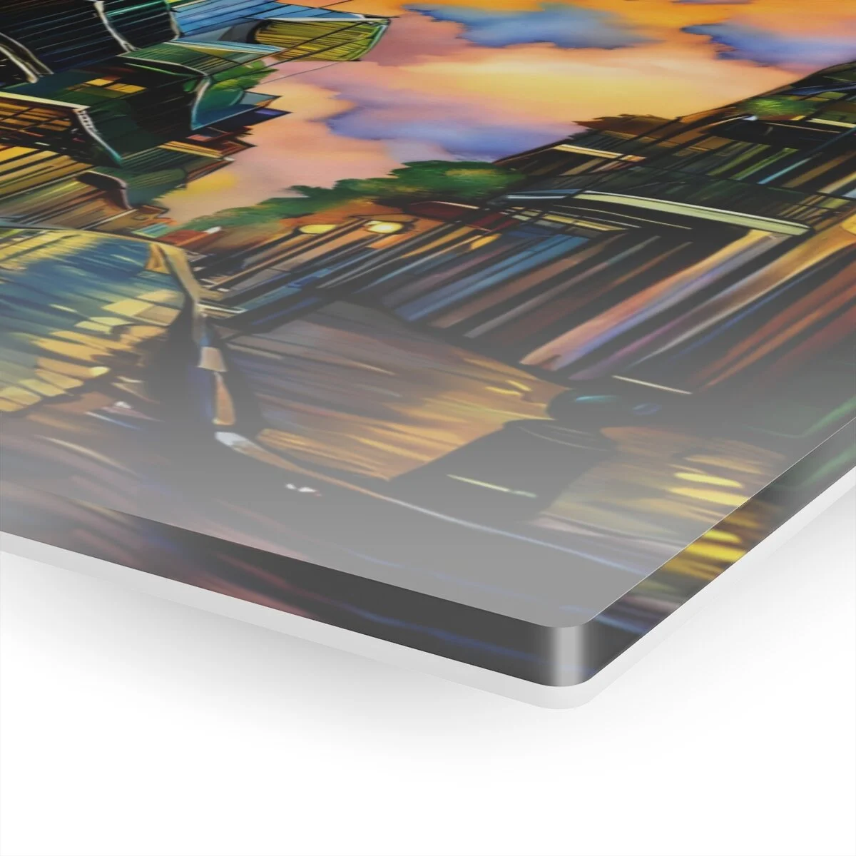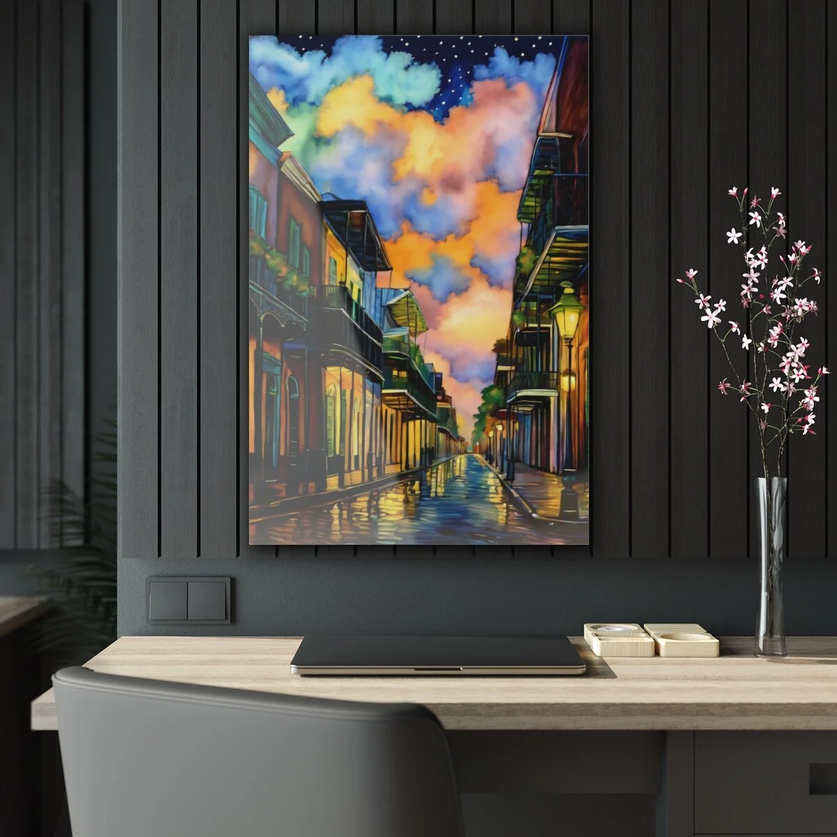 Capture the beauty of evening on Bourbon Street, in this stunning watercolor image. Made to seem like your images are printed on a glass surface, these acrylic photo prints never fail to dazzle. This image is second-surface printed directly on a 1/4" acrylic panel for a stunning result. Each acrylic print comes ready to hang, and floats 1.5" off the wall.