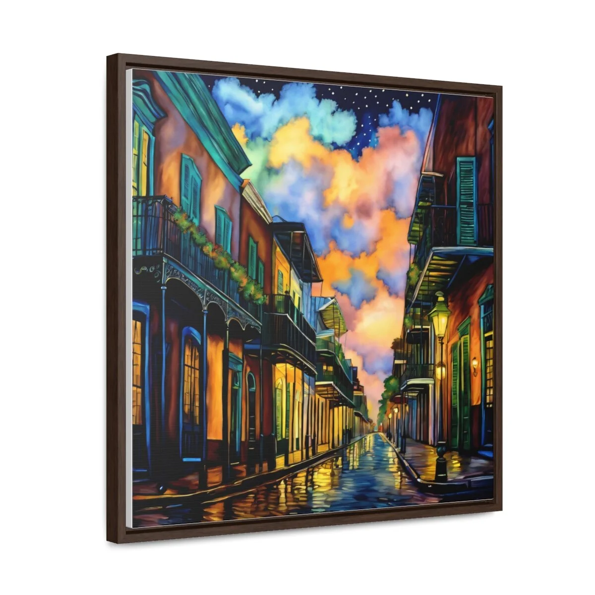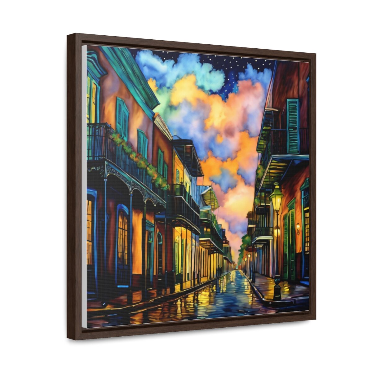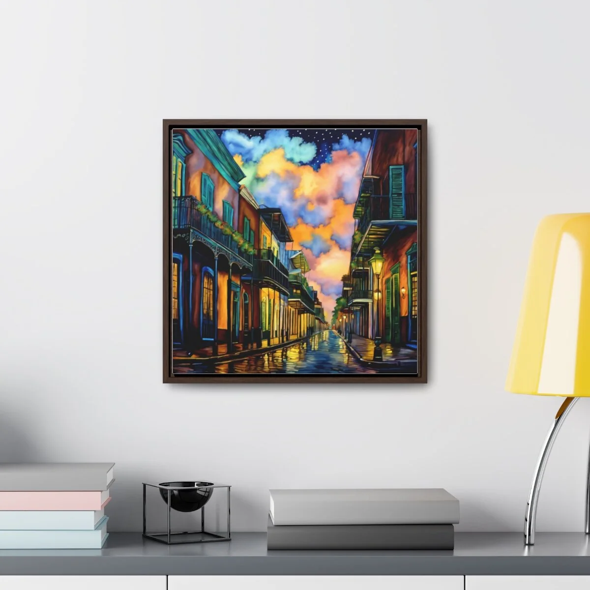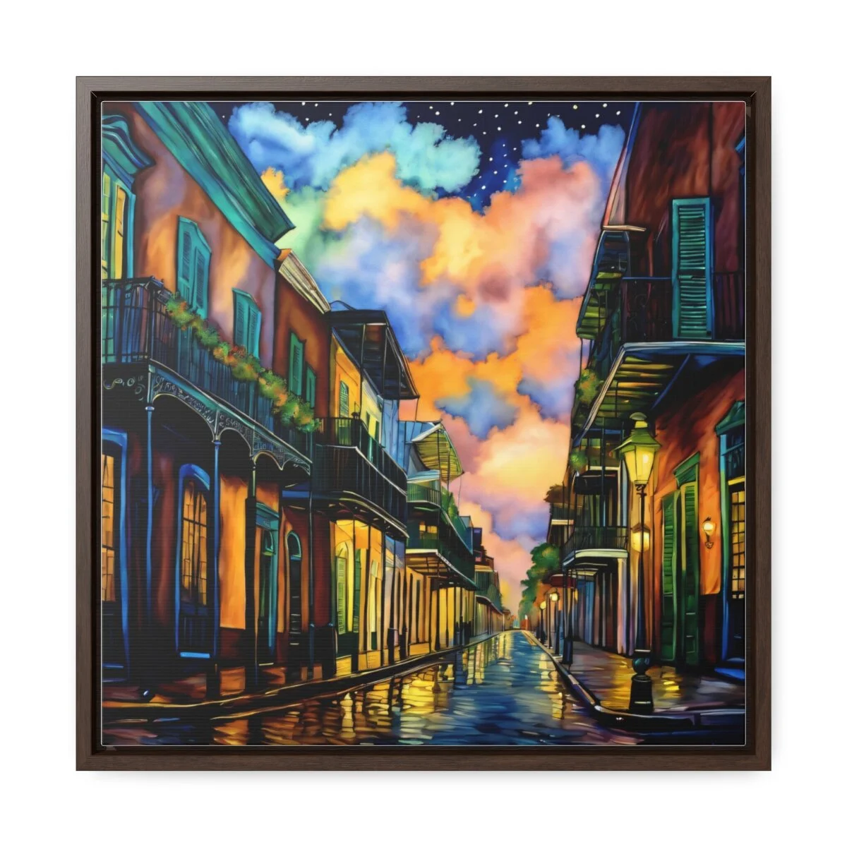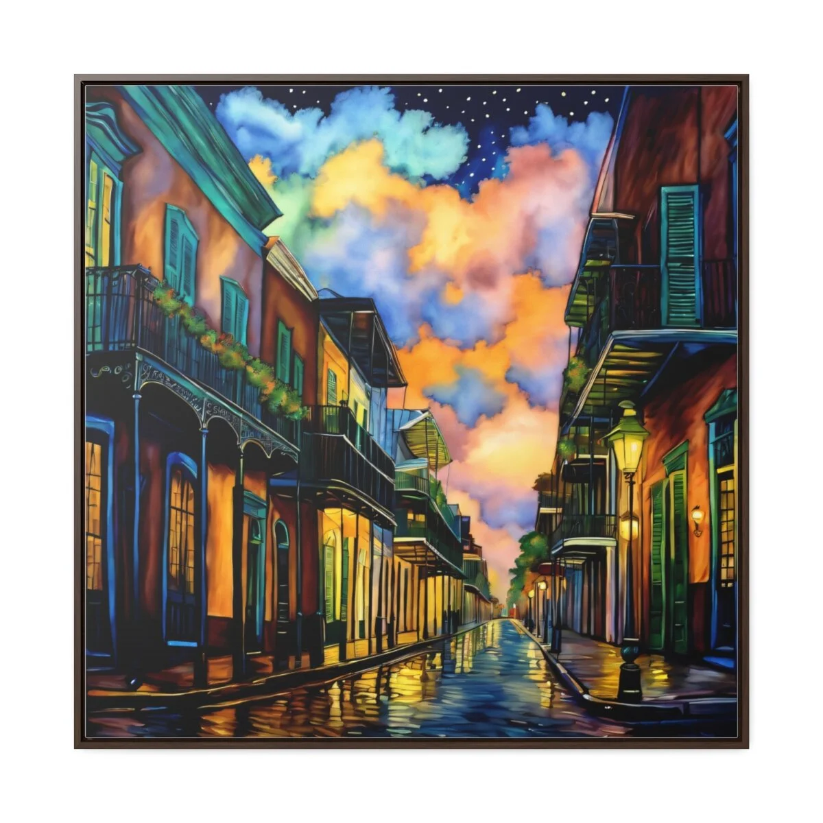 Capture the beauty of an evening on Bourbon Street, in this stunning watercolor image. This square gallery wrapped canvas print will always look as tight and flat as the day it was made. Every frame is built with a solid face to support the canvas and prevent deforming. Available in multiple sizes, comes in walnut and black frame options.