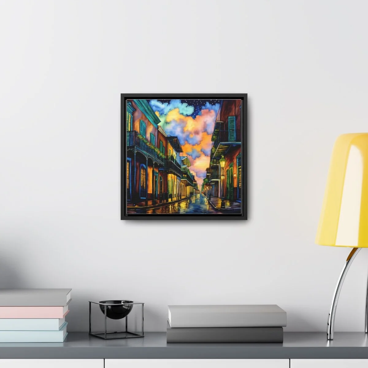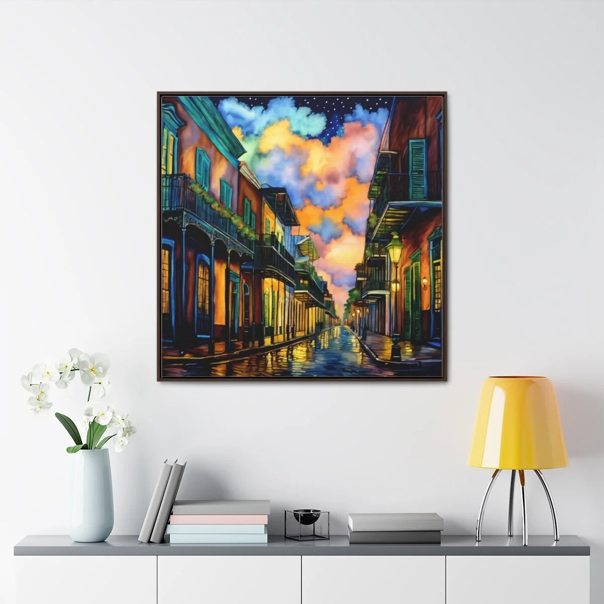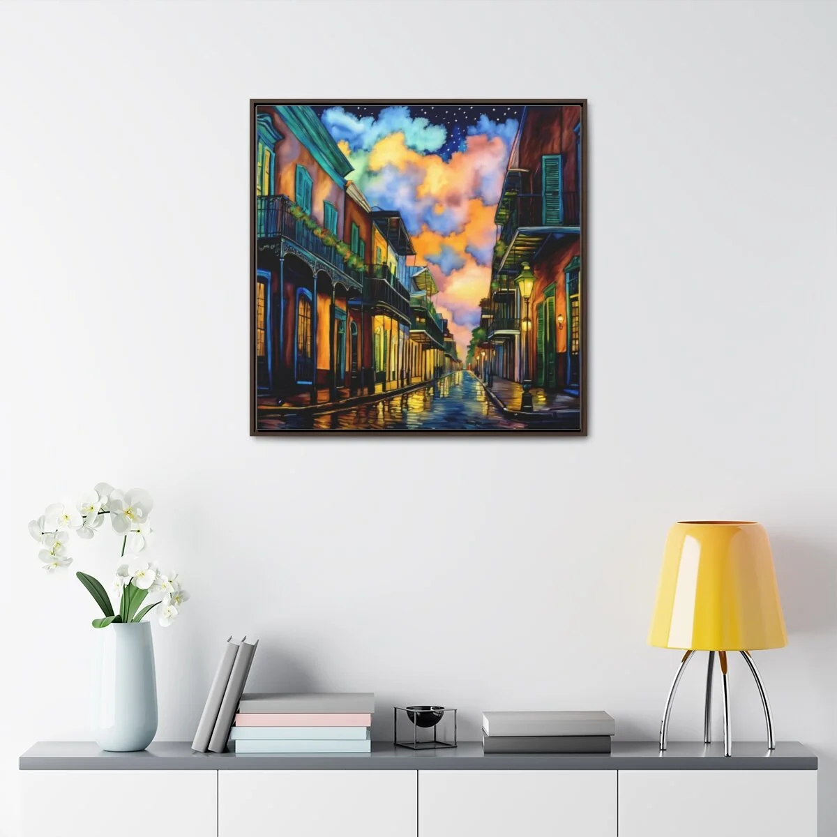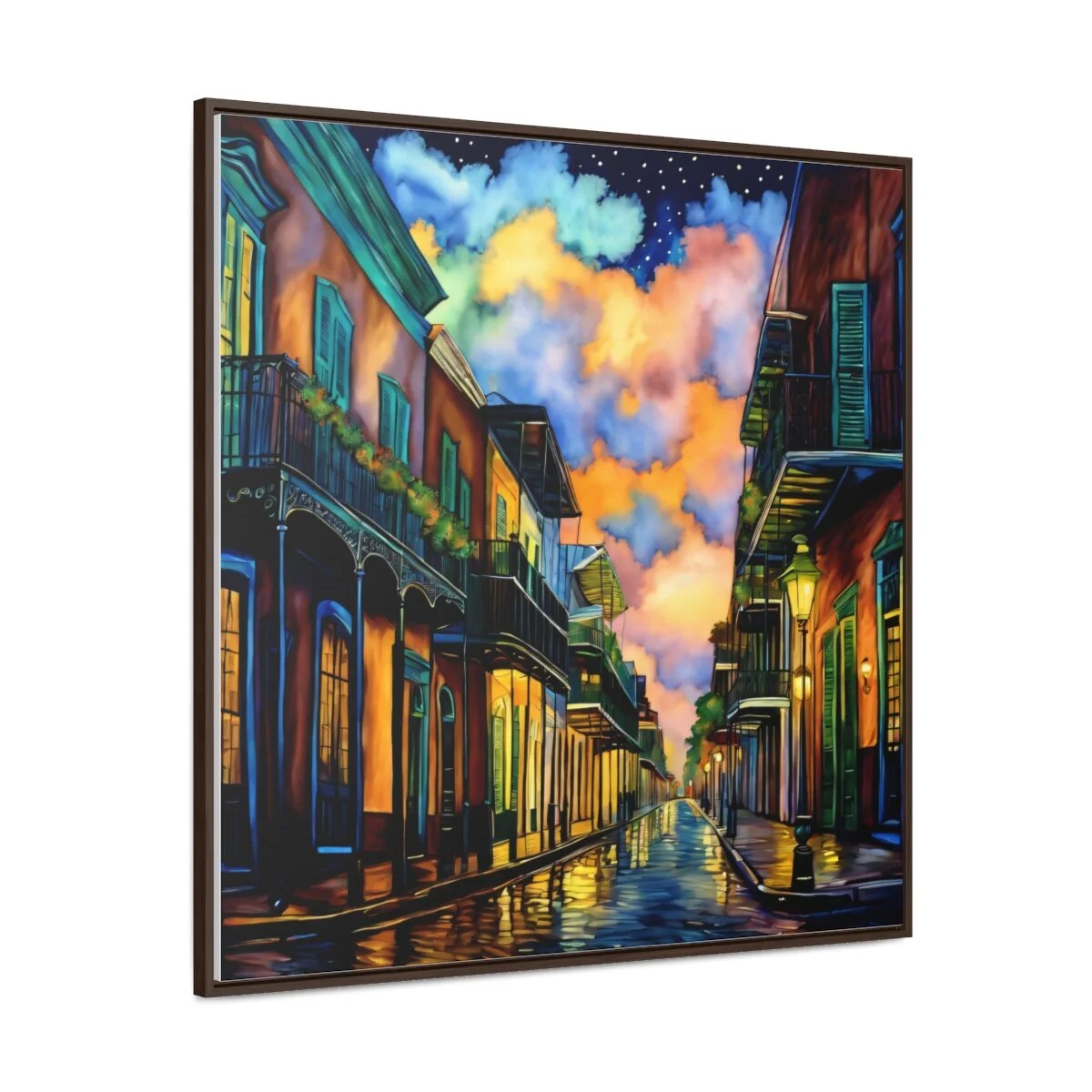 Capture the beauty of an evening on Bourbon Street, in this stunning watercolor image. This square gallery wrapped canvas print will always look as tight and flat as the day it was made. Every frame is built with a solid face to support the canvas and prevent deforming. Available in multiple sizes, comes in walnut and black frame options.