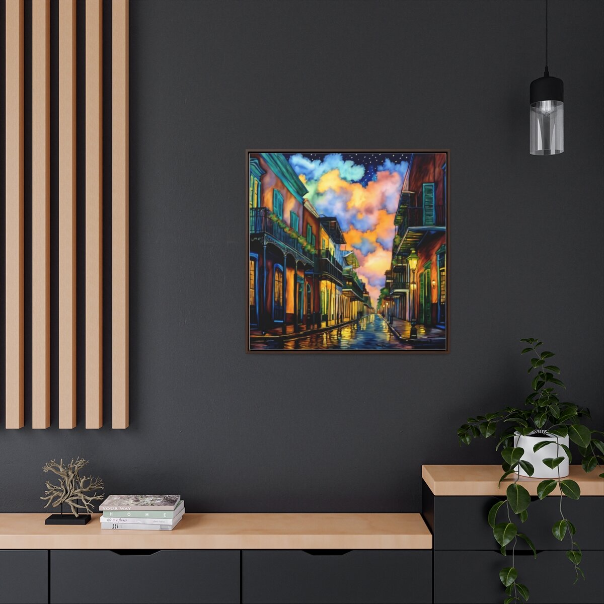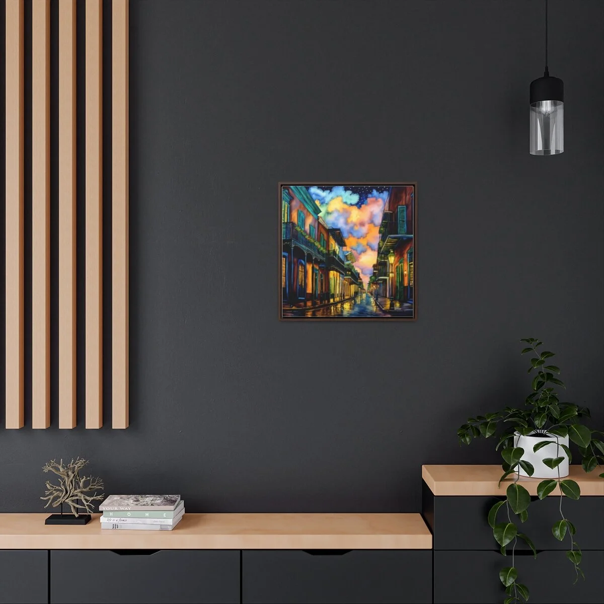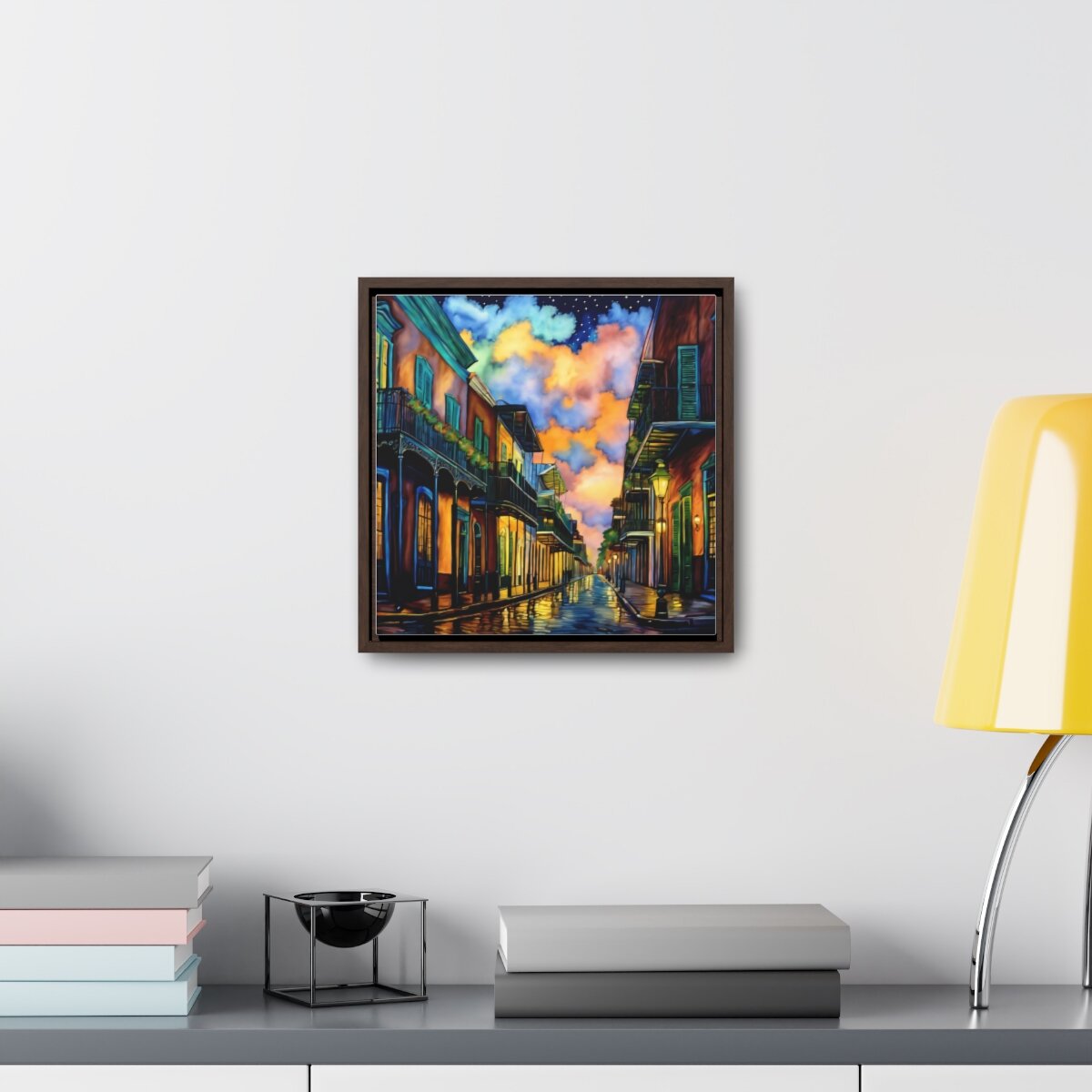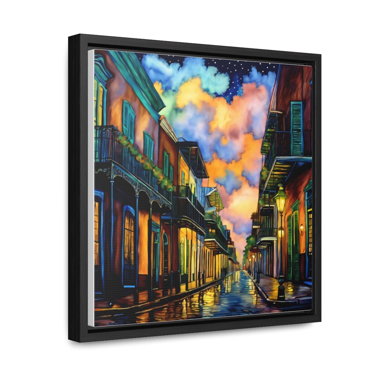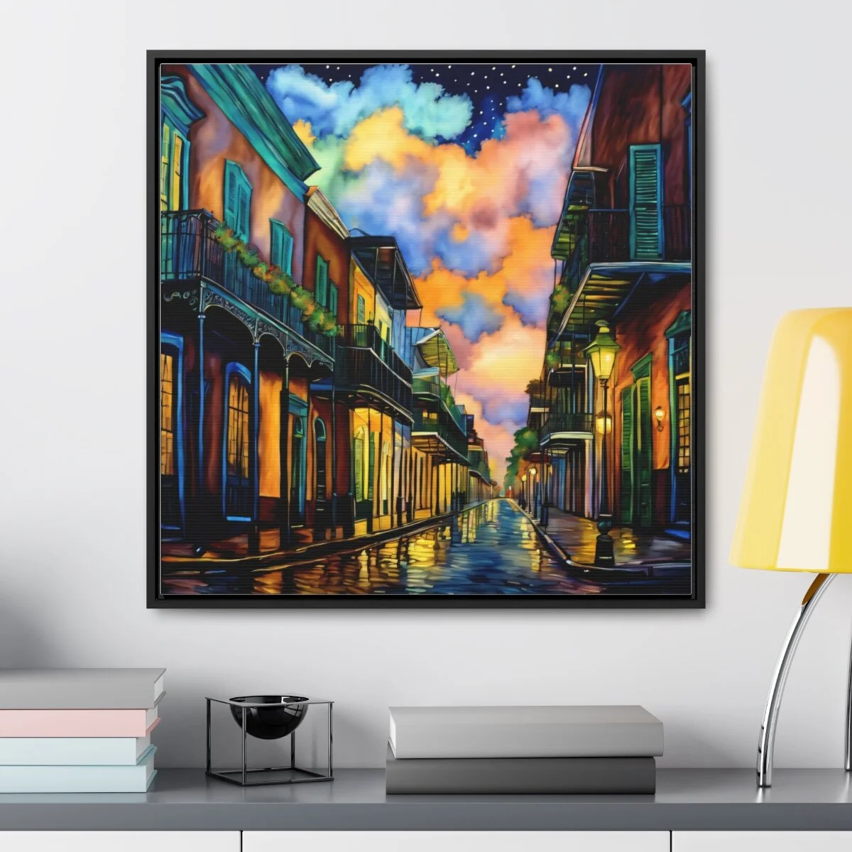 Capture the beauty of an evening on Bourbon Street, in this stunning watercolor image. This square gallery wrapped canvas print will always look as tight and flat as the day it was made. Every frame is built with a solid face to support the canvas and prevent deforming. Available in multiple sizes, comes in walnut and black frame options.