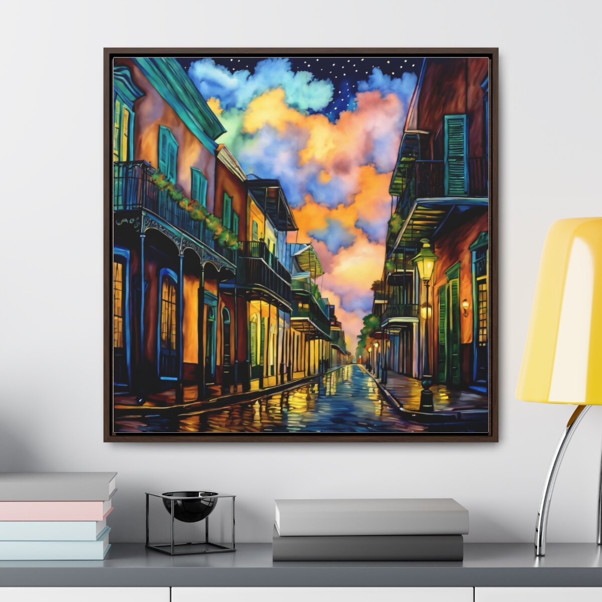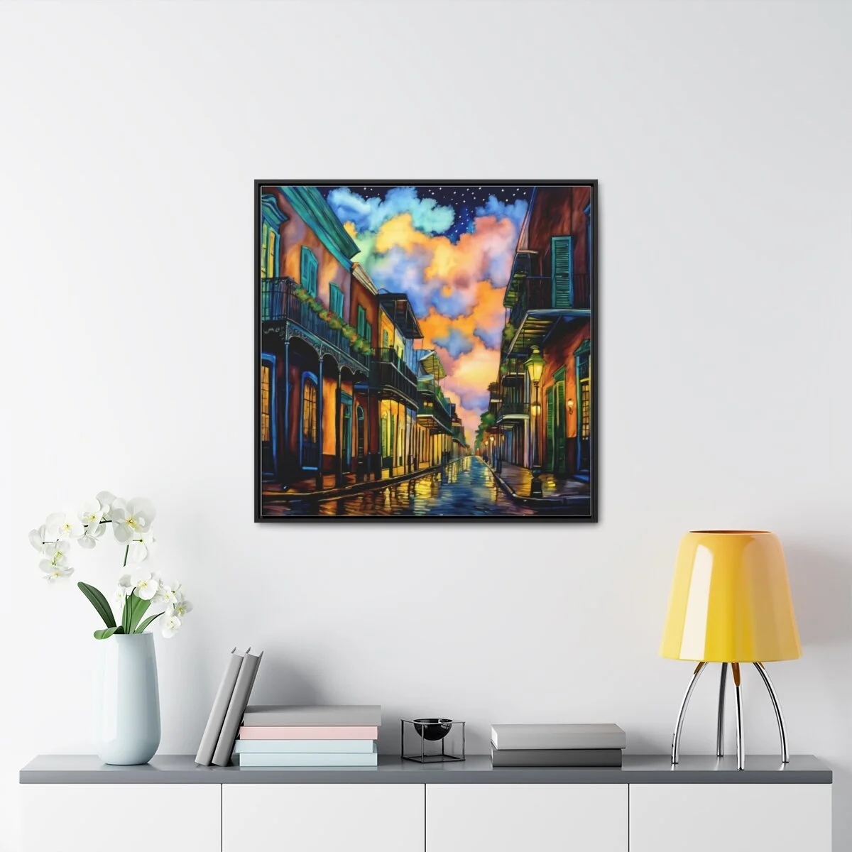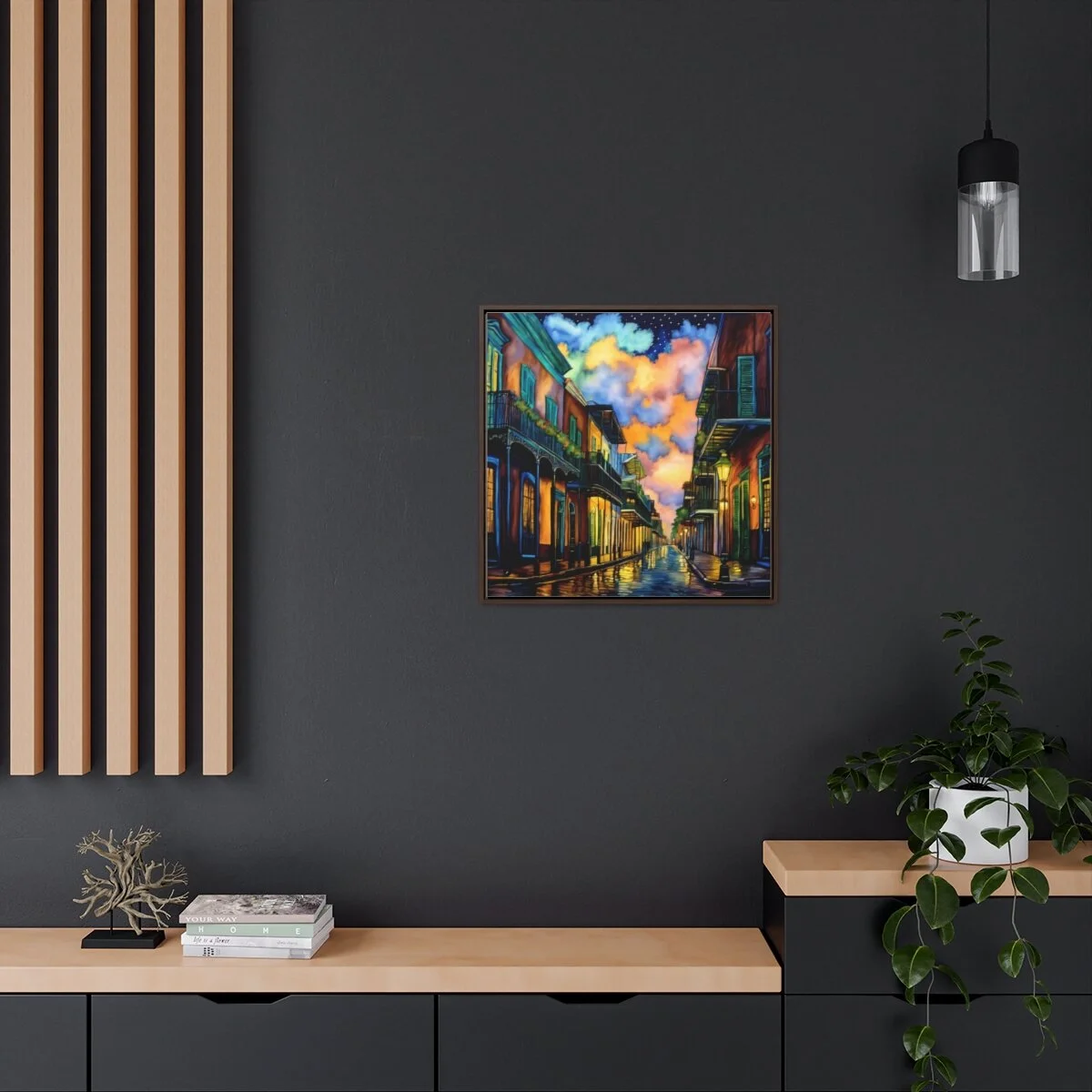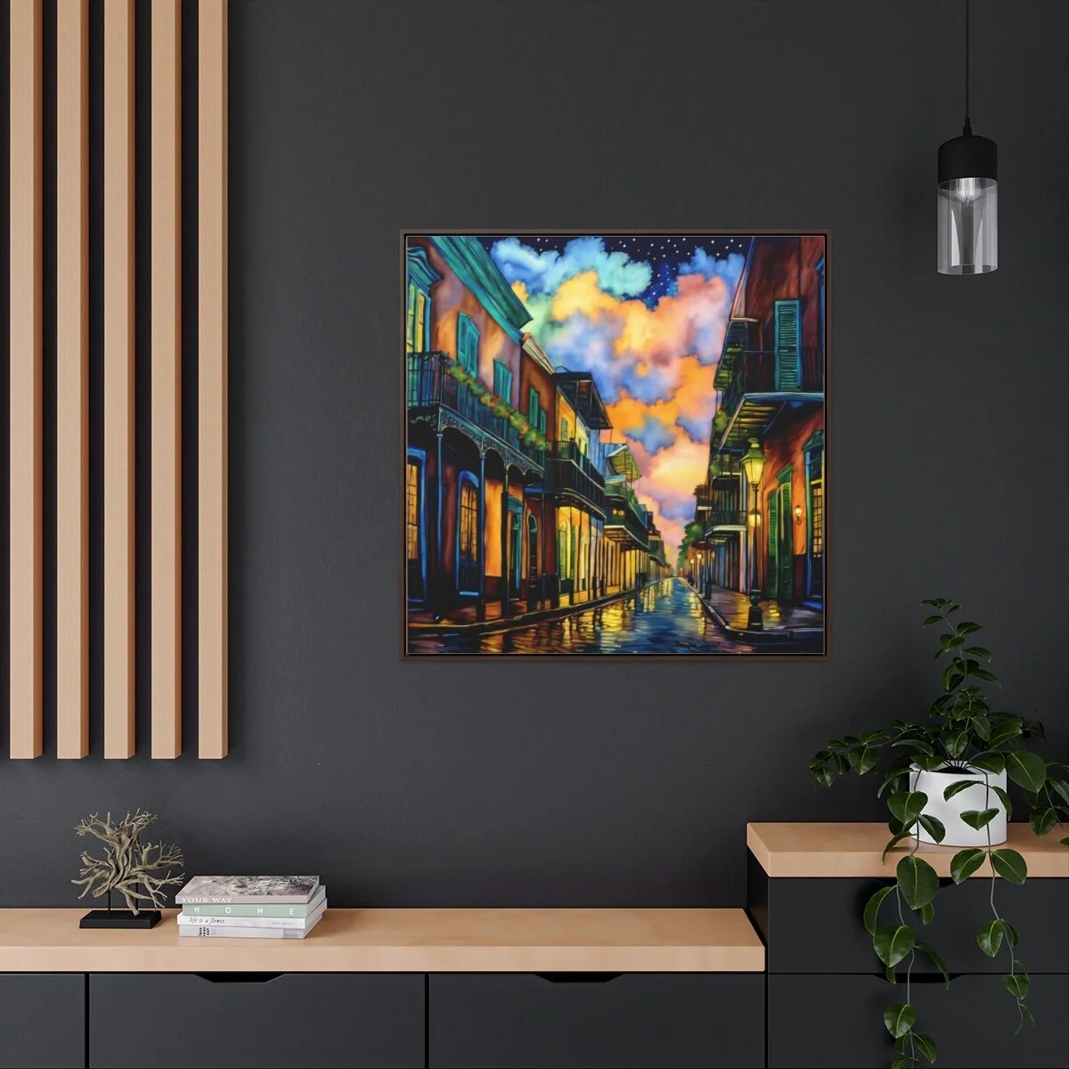 Capture the beauty of an evening on Bourbon Street, in this stunning watercolor image. This square gallery wrapped canvas print will always look as tight and flat as the day it was made. Every frame is built with a solid face to support the canvas and prevent deforming. Available in multiple sizes, comes in walnut and black frame options.
