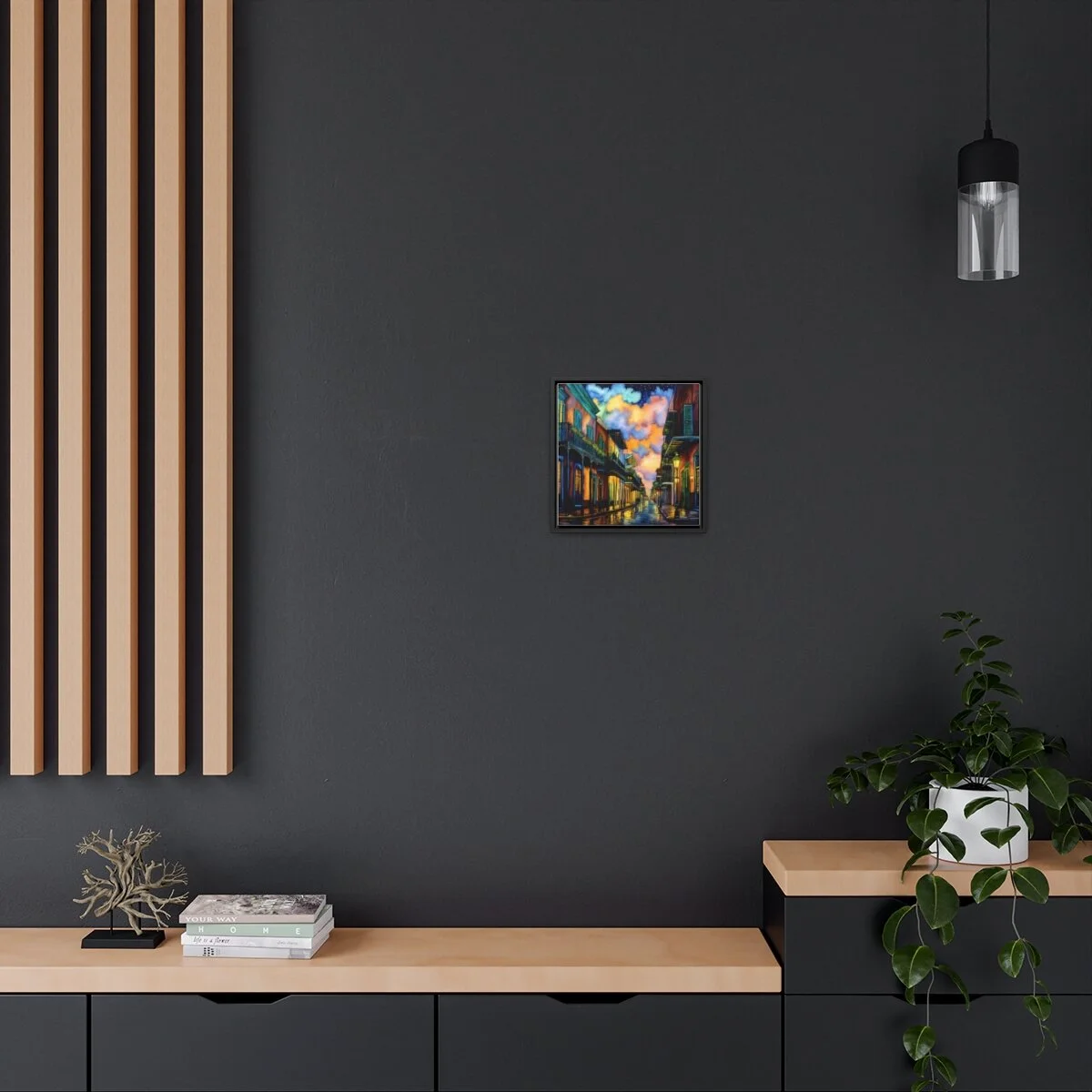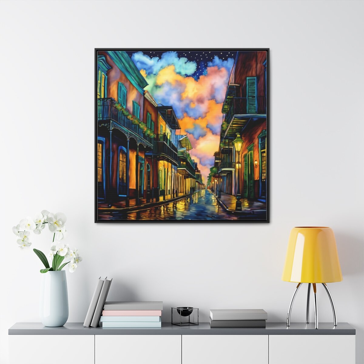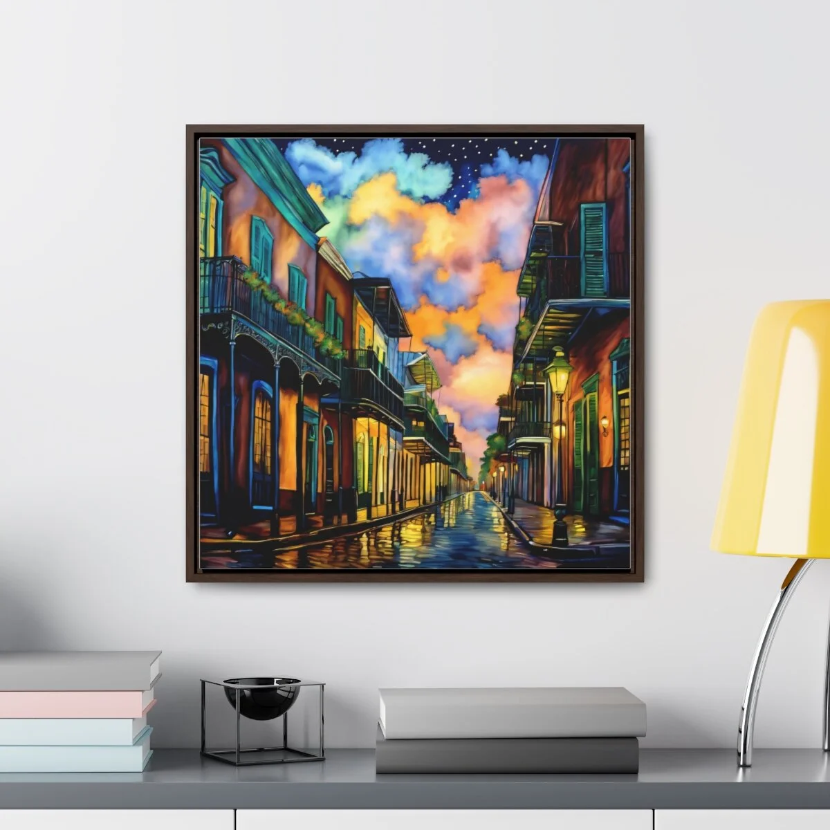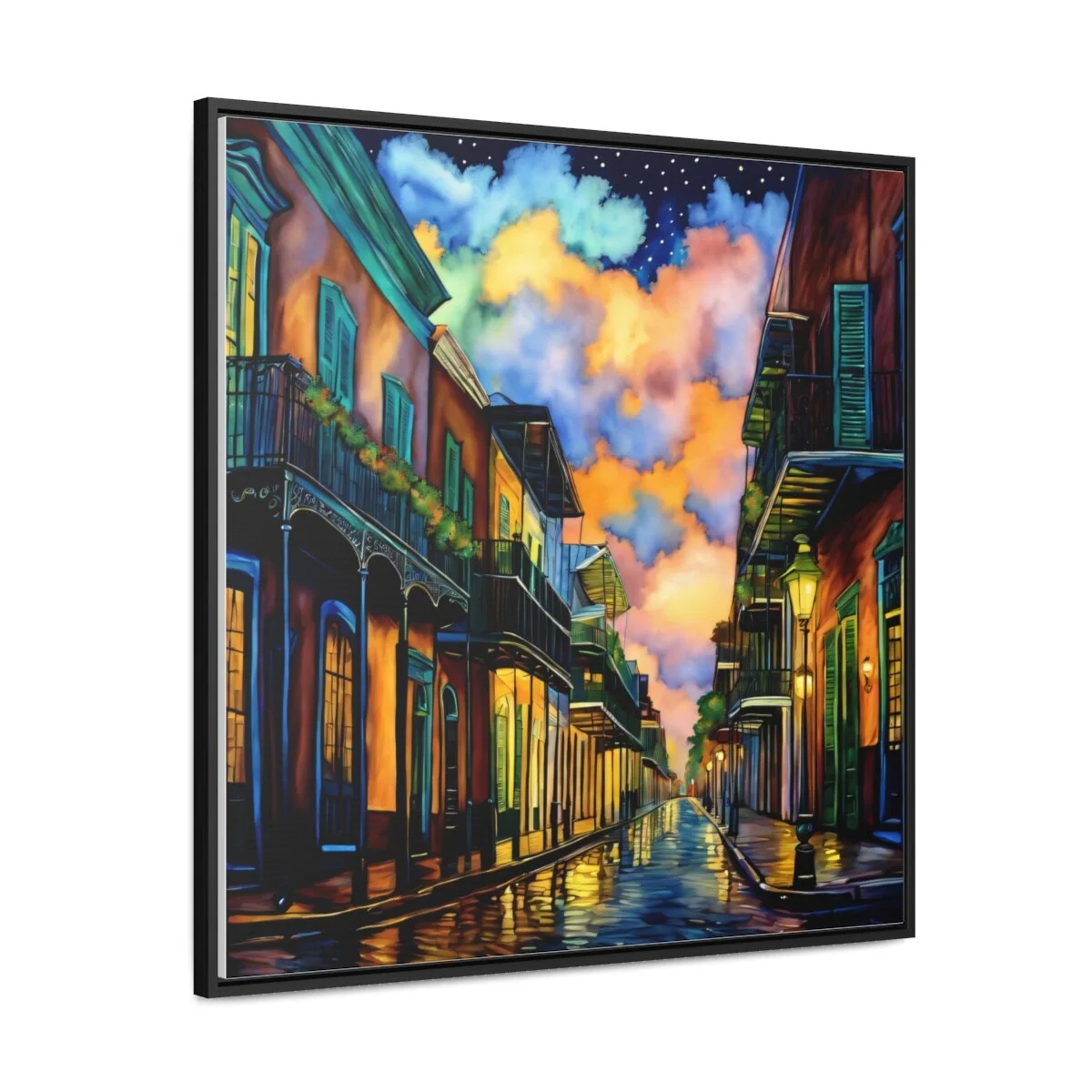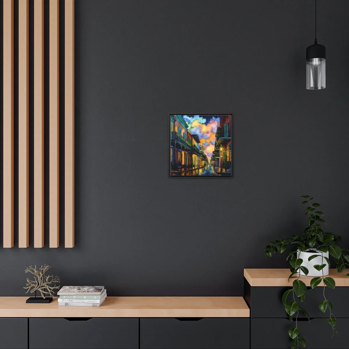 Capture the beauty of an evening on Bourbon Street, in this stunning watercolor image. This square gallery wrapped canvas print will always look as tight and flat as the day it was made. Every frame is built with a solid face to support the canvas and prevent deforming. Available in multiple sizes, comes in walnut and black frame options.
