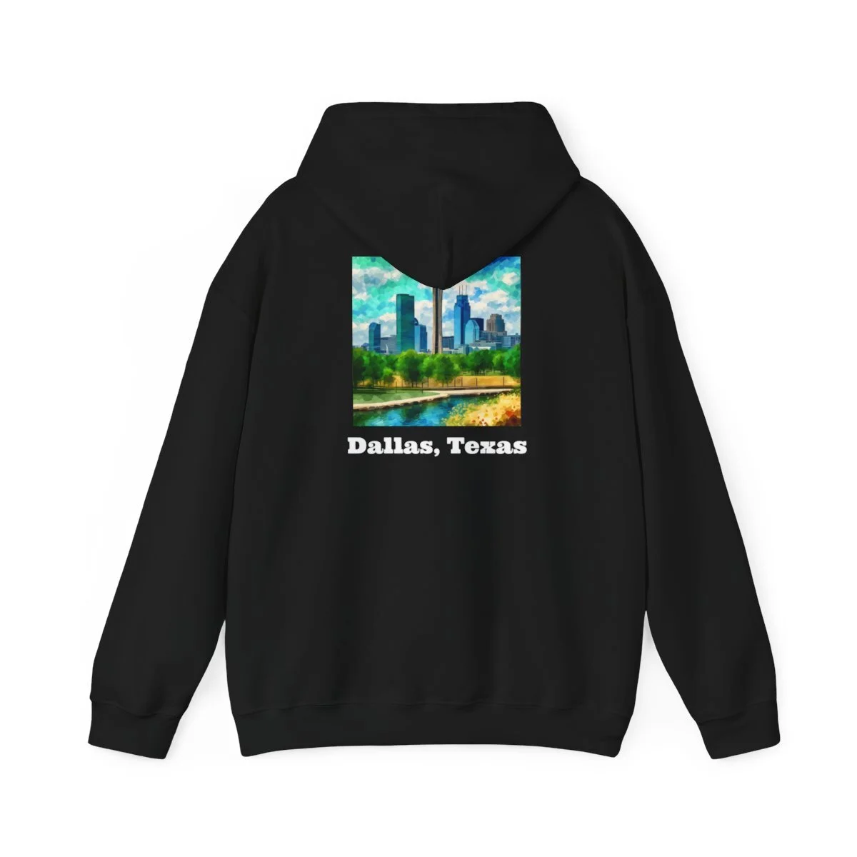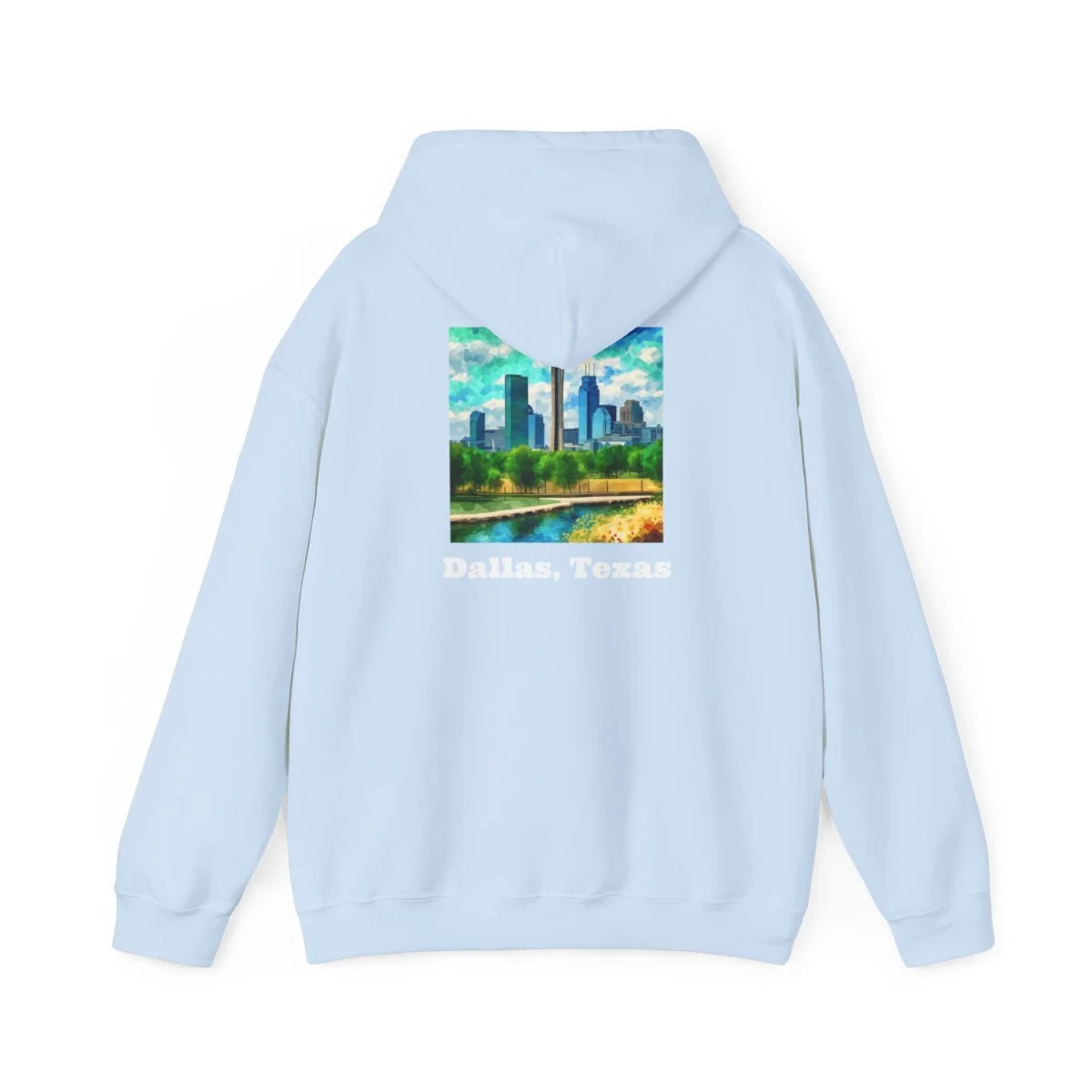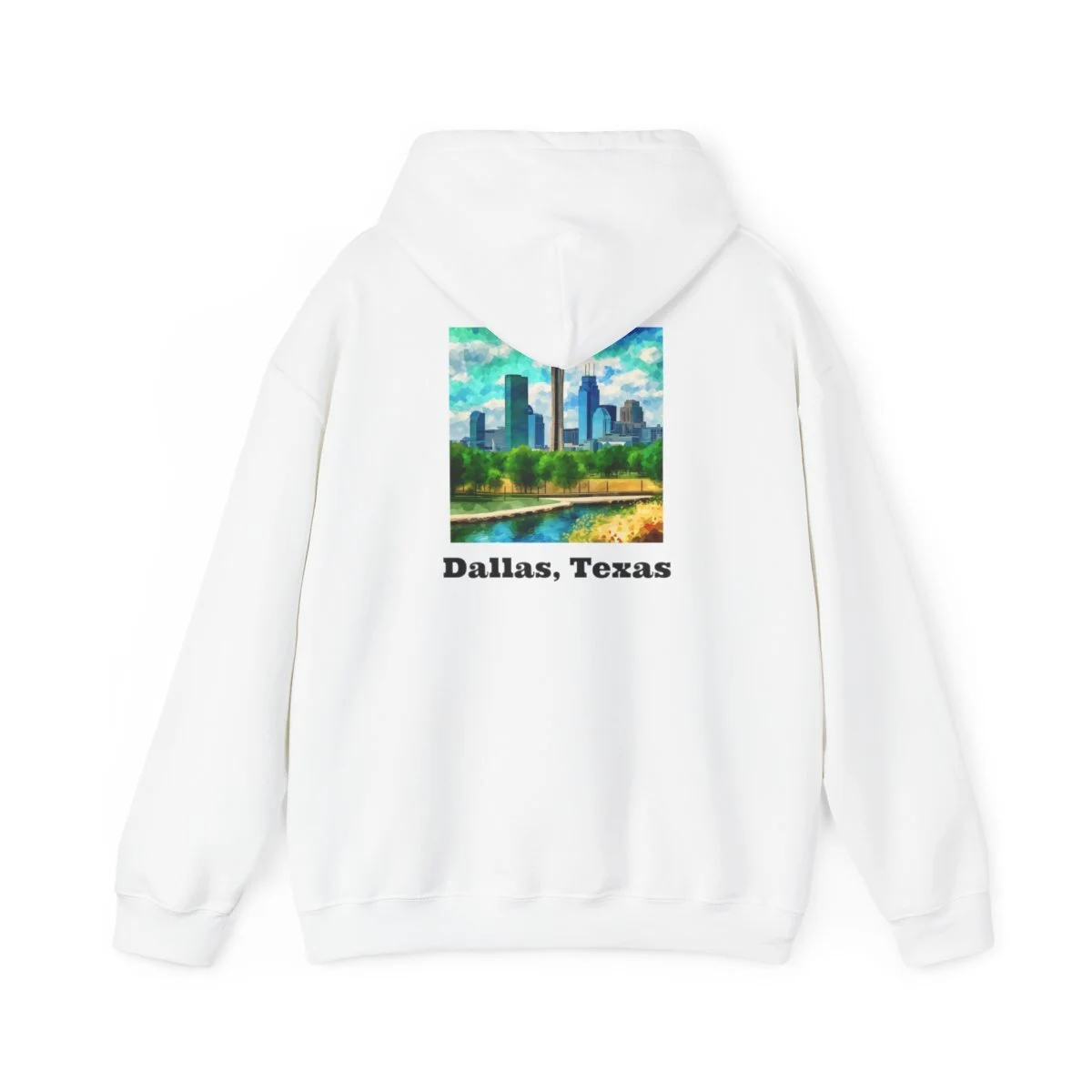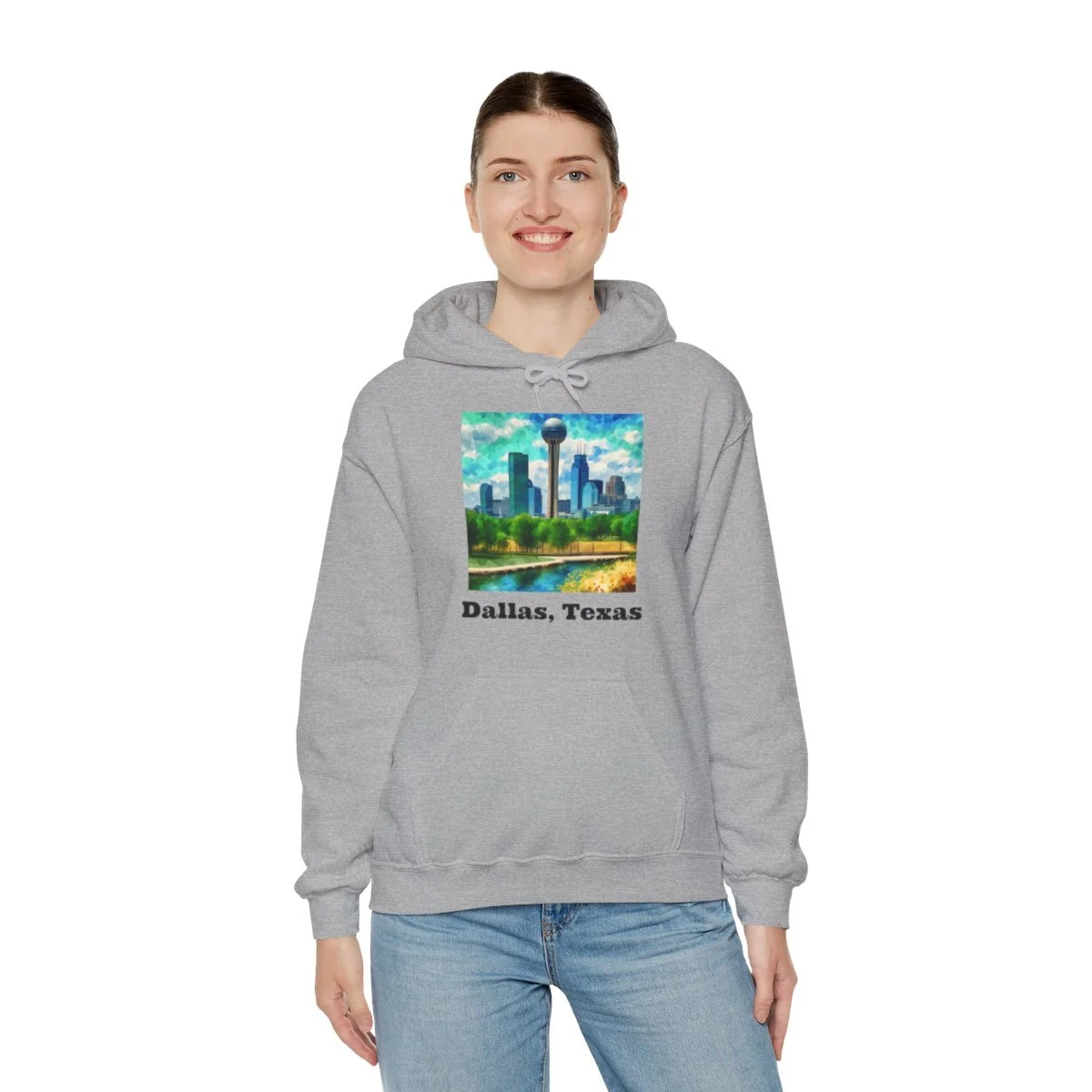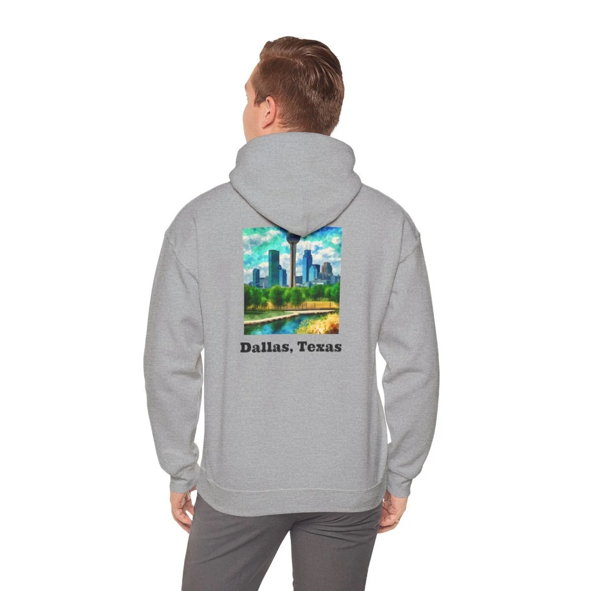 A unique hoodie with a beautiful watercolor image of the skyline of Dallas, Texas featuring the Reunion Tower. This unisex heavy blend hooded sweatshirt is relaxation itself. Made with a thick blend of cotton and polyester, it feels plush, soft and warm, a perfect choice for any cold day. In the front, the spacious kangaroo pocket adds daily practicality while the hood's drawstring is the same color as the base sweater for extra style points. As an added plus the image and lettering is on the front and back of the hoodie.