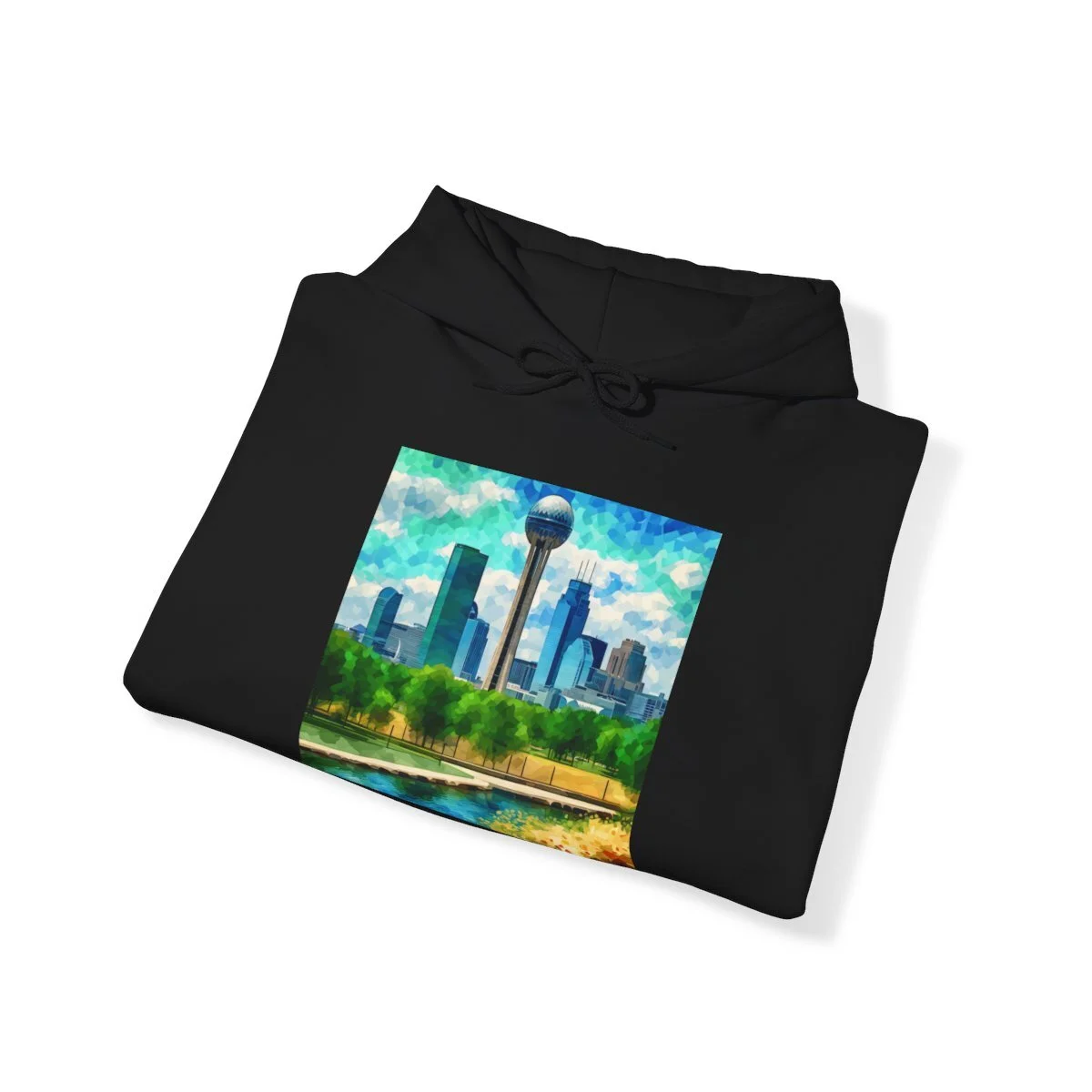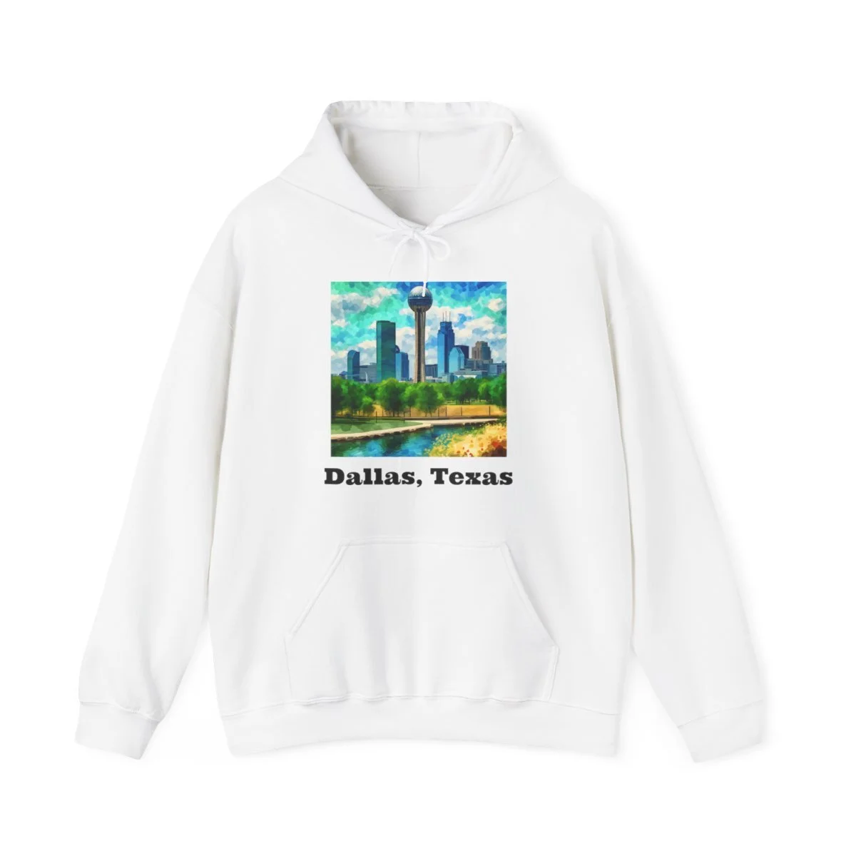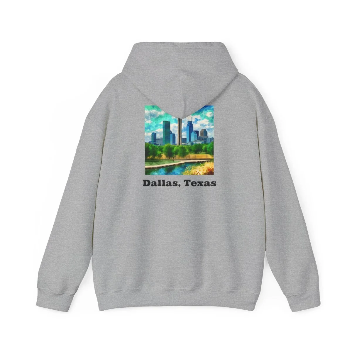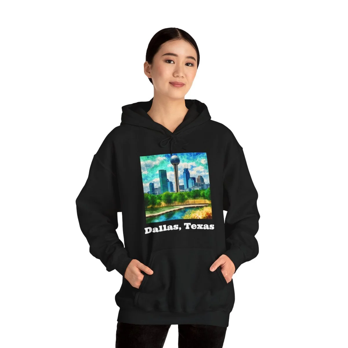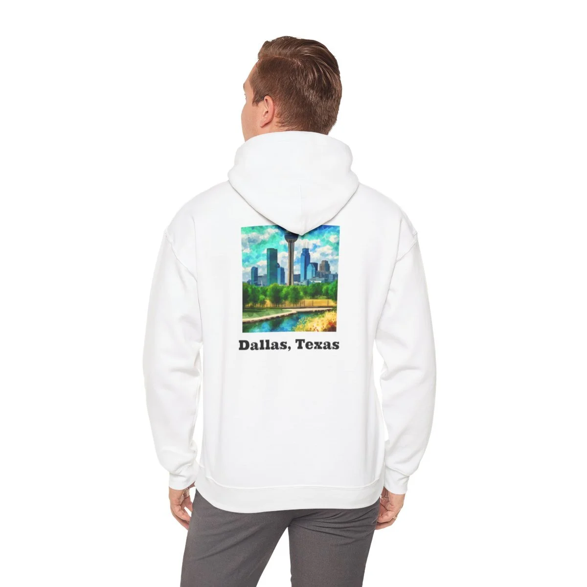A unique hoodie with a beautiful watercolor image of the skyline of Dallas, Texas featuring the Reunion Tower. This unisex heavy blend hooded sweatshirt is relaxation itself. Made with a thick blend of cotton and polyester, it feels plush, soft and warm, a perfect choice for any cold day. In the front, the spacious kangaroo pocket adds daily practicality while the hood's drawstring is the same color as the base sweater for extra style points. As an added plus the image and lettering is on the front and back of the hoodie.