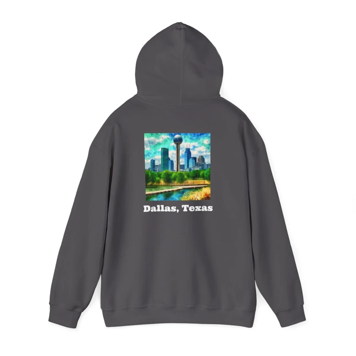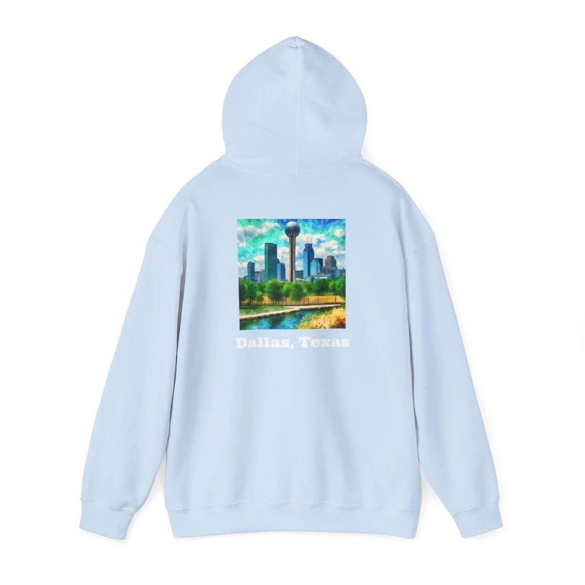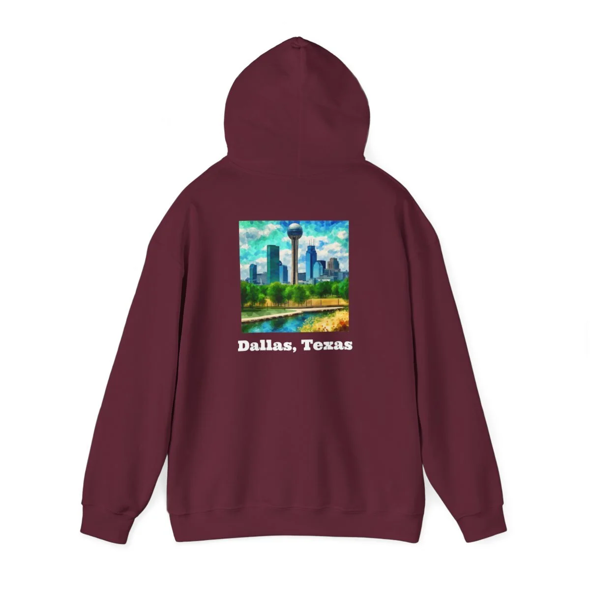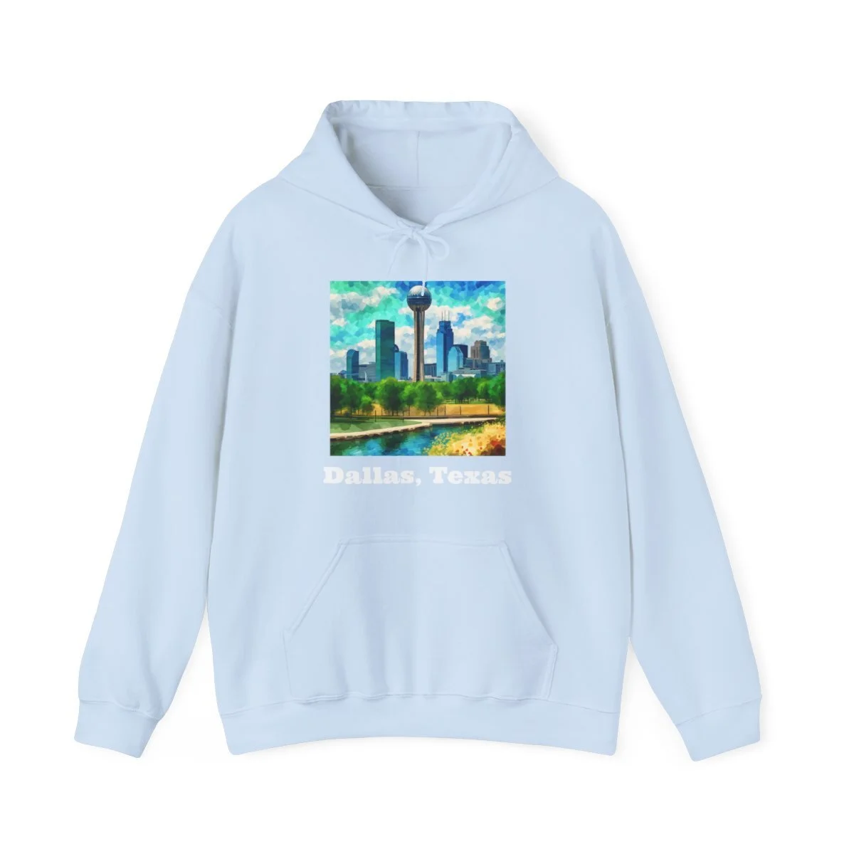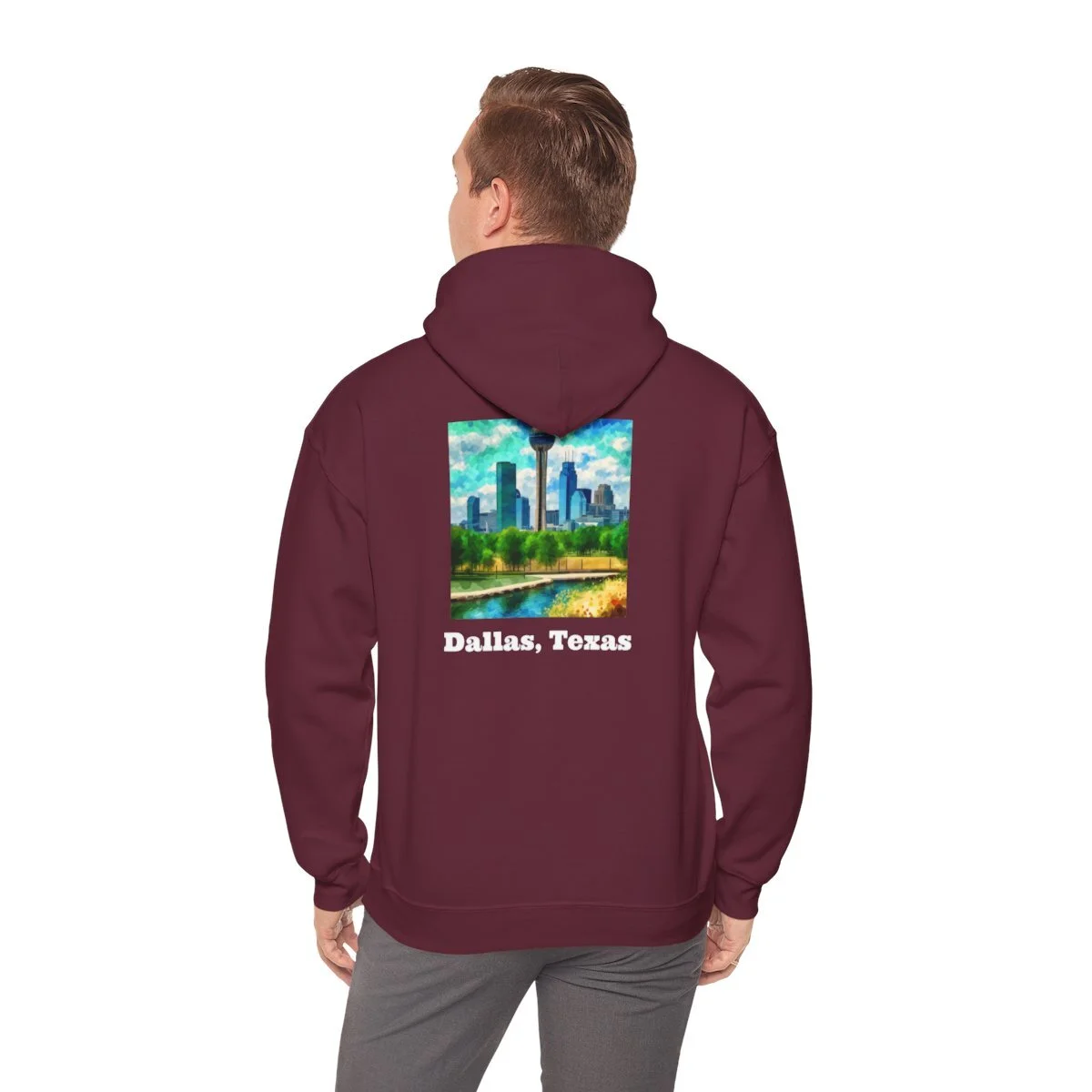 A unique hoodie with a beautiful watercolor image of the skyline of Dallas, Texas featuring the Reunion Tower. This unisex heavy blend hooded sweatshirt is relaxation itself. Made with a thick blend of cotton and polyester, it feels plush, soft and warm, a perfect choice for any cold day. In the front, the spacious kangaroo pocket adds daily practicality while the hood's drawstring is the same color as the base sweater for extra style points. As an added plus the image and lettering is on the front and back of the hoodie.