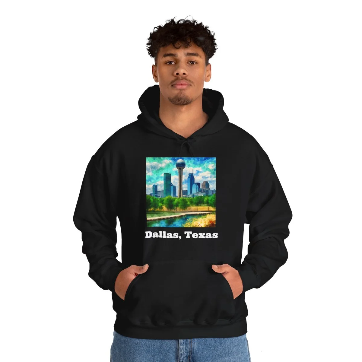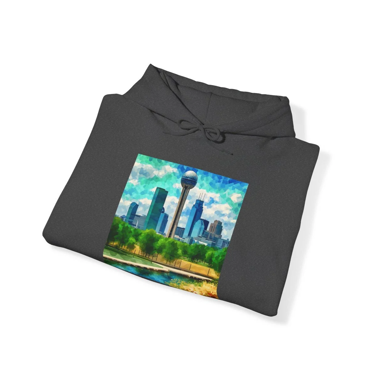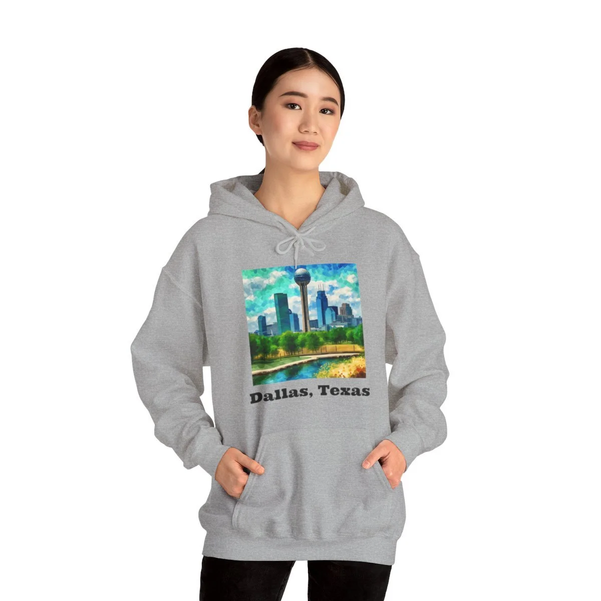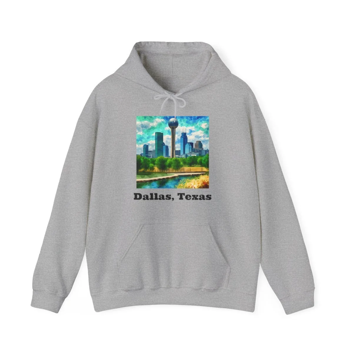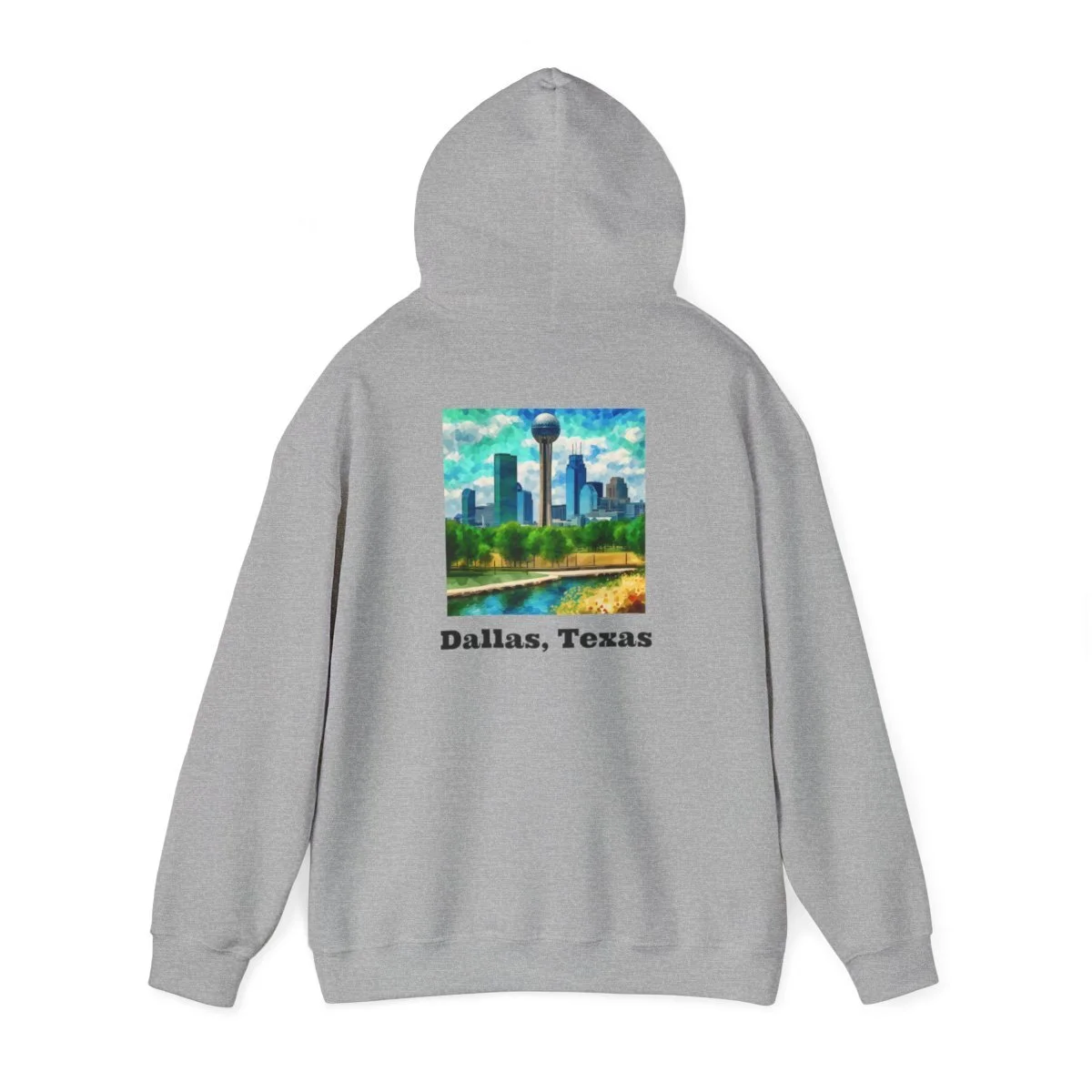 A unique hoodie with a beautiful watercolor image of the skyline of Dallas, Texas featuring the Reunion Tower. This unisex heavy blend hooded sweatshirt is relaxation itself. Made with a thick blend of cotton and polyester, it feels plush, soft and warm, a perfect choice for any cold day. In the front, the spacious kangaroo pocket adds daily practicality while the hood's drawstring is the same color as the base sweater for extra style points. As an added plus the image and lettering is on the front and back of the hoodie.