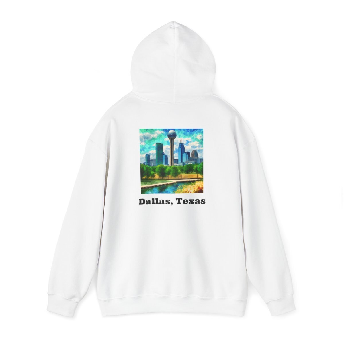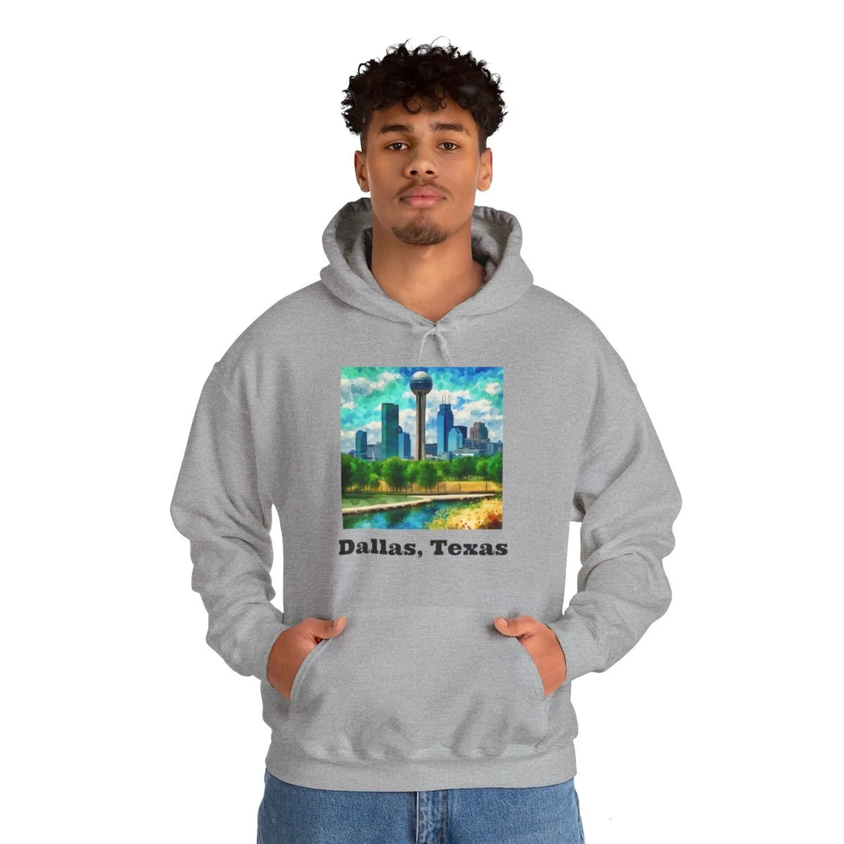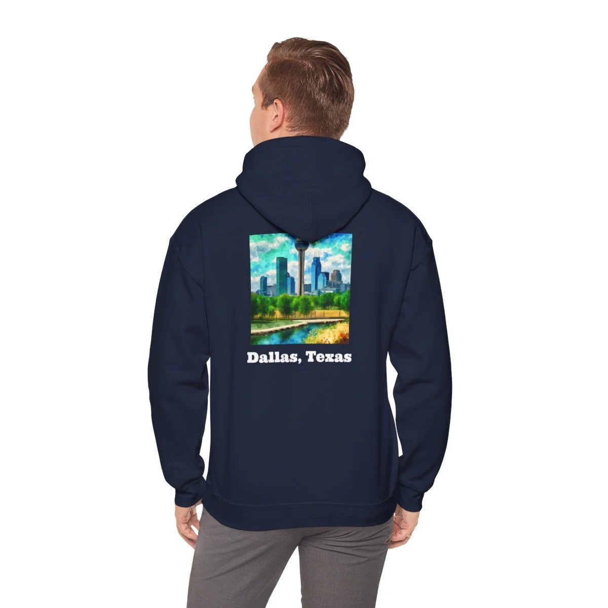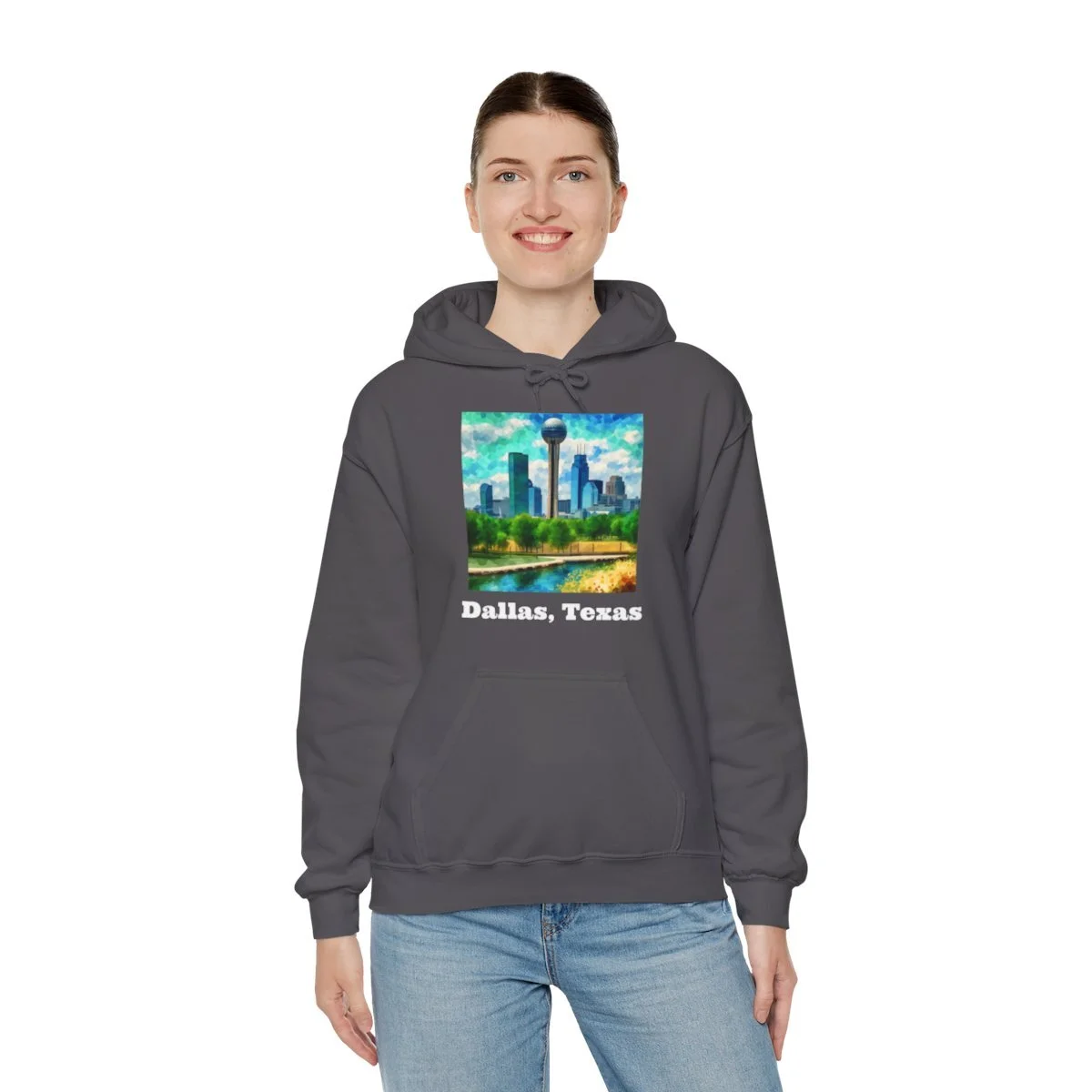 A unique hoodie with a beautiful watercolor image of the skyline of Dallas, Texas featuring the Reunion Tower. This unisex heavy blend hooded sweatshirt is relaxation itself. Made with a thick blend of cotton and polyester, it feels plush, soft and warm, a perfect choice for any cold day. In the front, the spacious kangaroo pocket adds daily practicality while the hood's drawstring is the same color as the base sweater for extra style points. As an added plus the image and lettering is on the front and back of the hoodie.