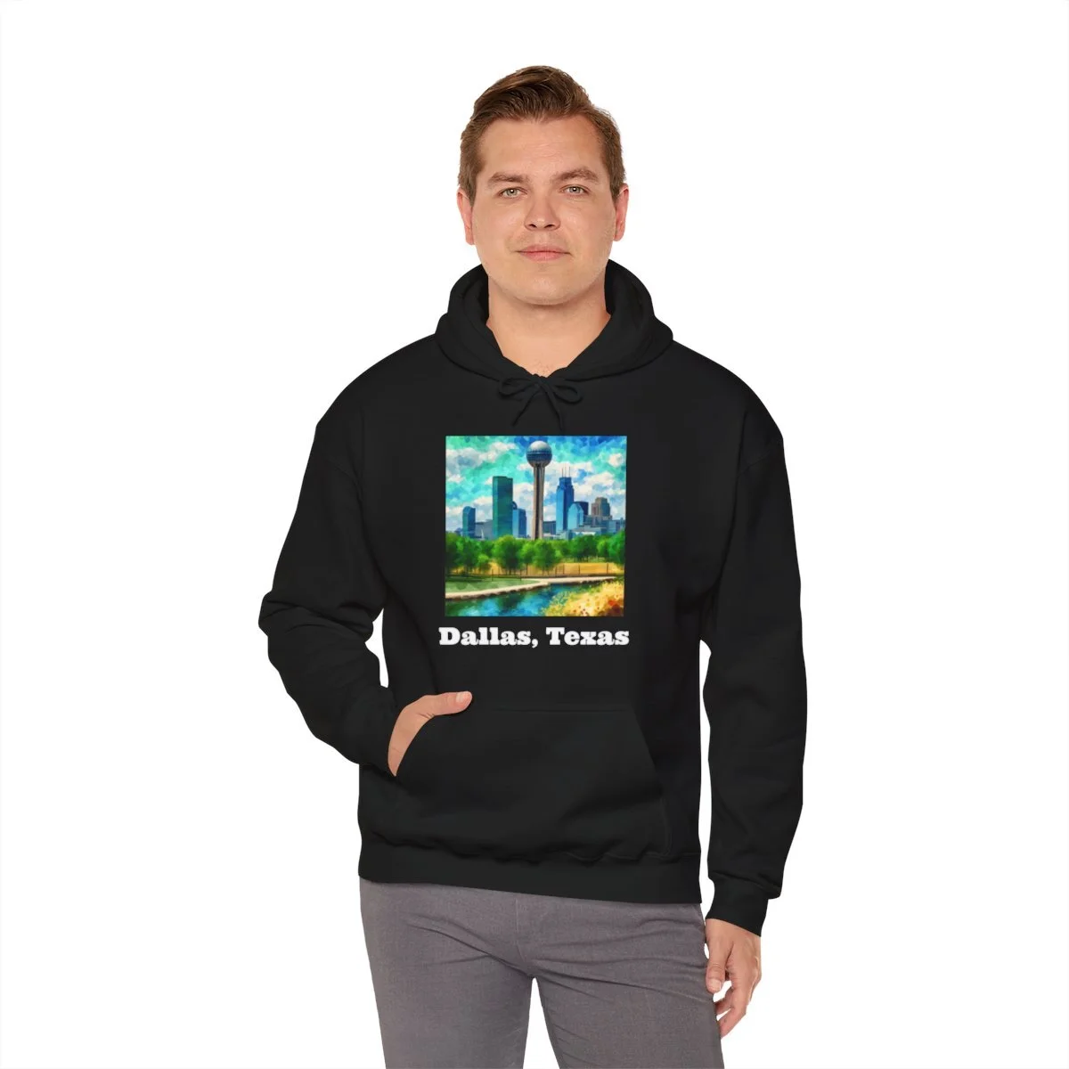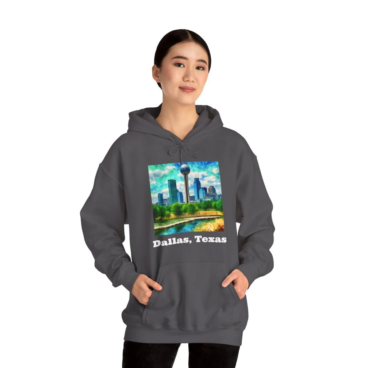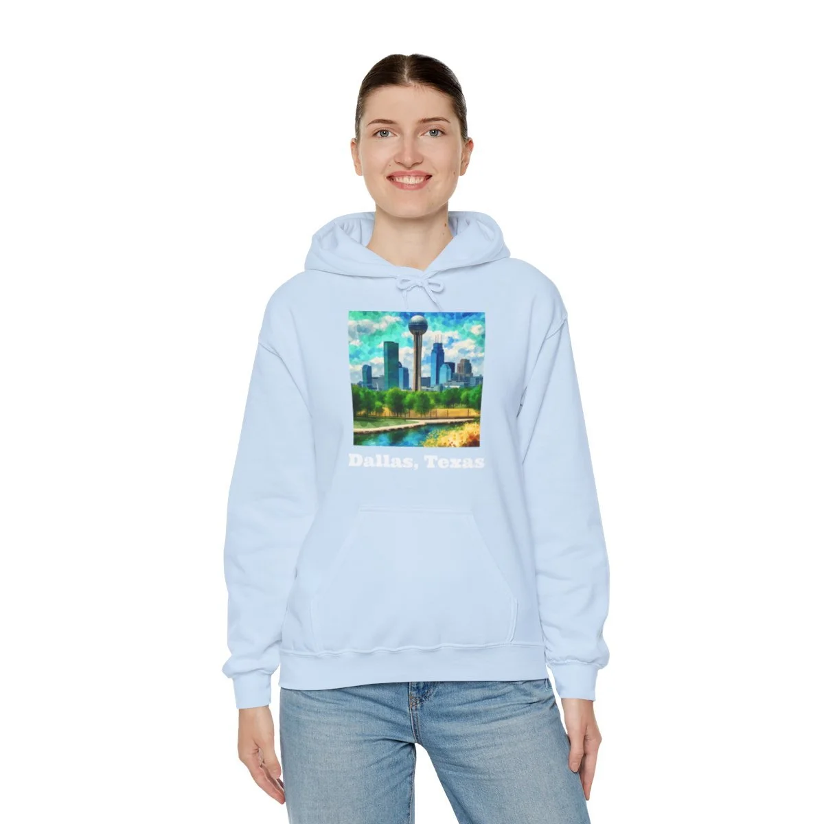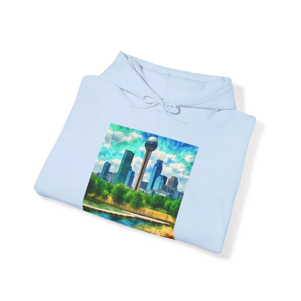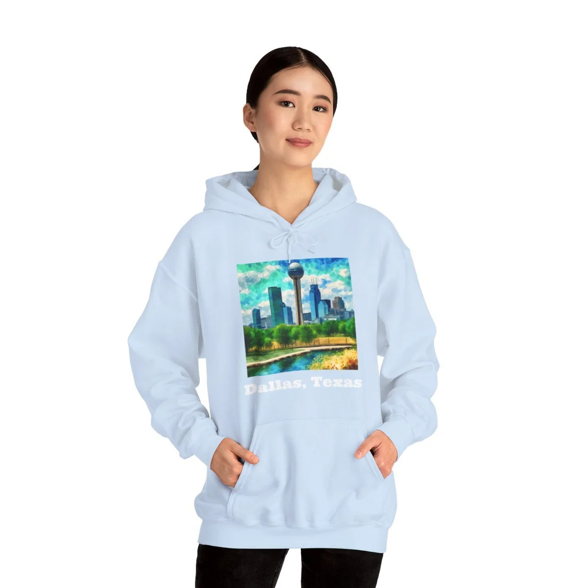 A unique hoodie with a beautiful watercolor image of the skyline of Dallas, Texas featuring the Reunion Tower. This unisex heavy blend hooded sweatshirt is relaxation itself. Made with a thick blend of cotton and polyester, it feels plush, soft and warm, a perfect choice for any cold day. In the front, the spacious kangaroo pocket adds daily practicality while the hood's drawstring is the same color as the base sweater for extra style points. As an added plus the image and lettering is on the front and back of the hoodie.