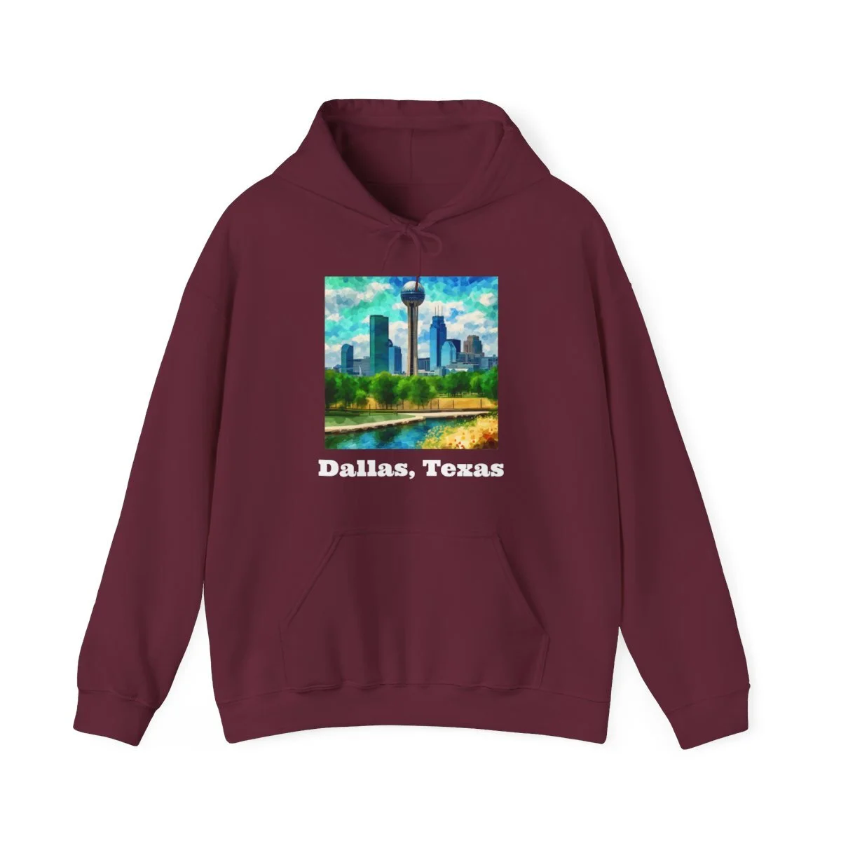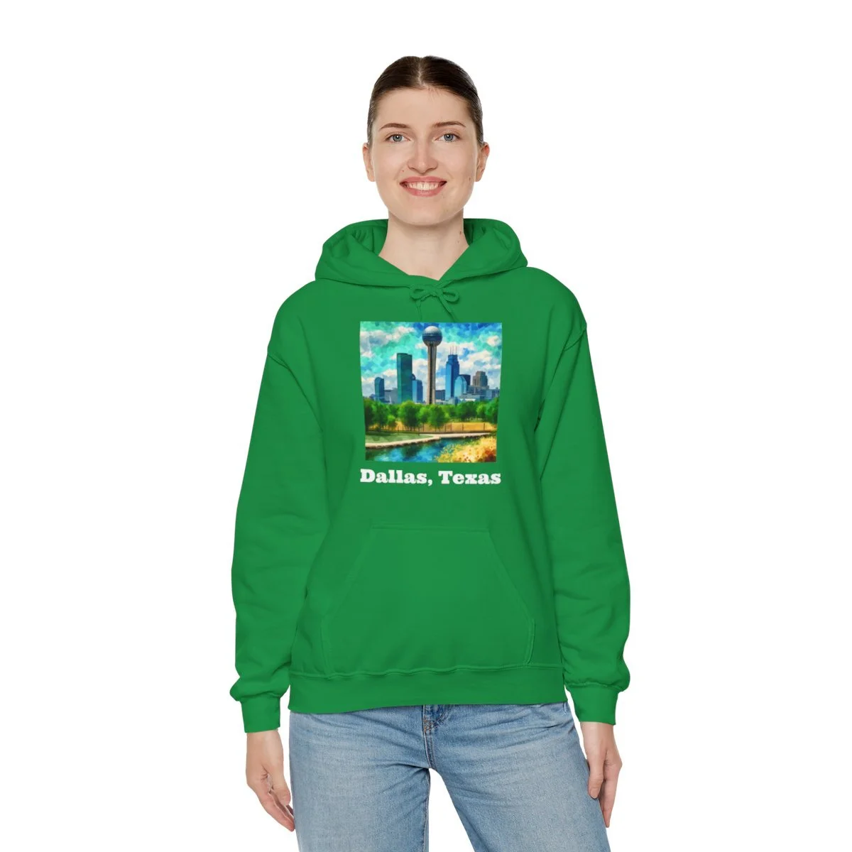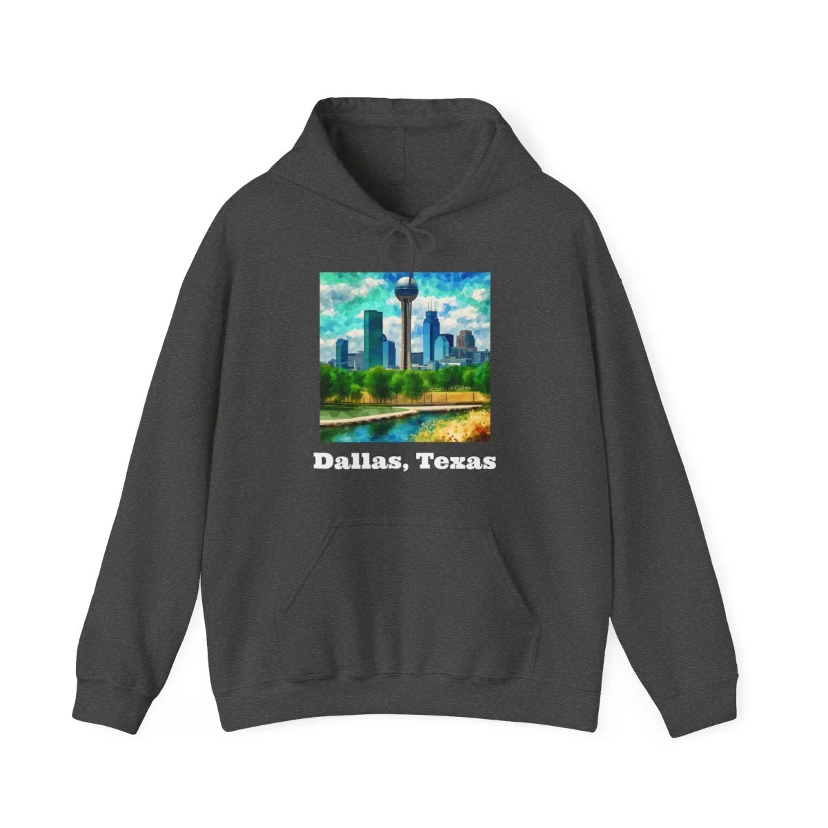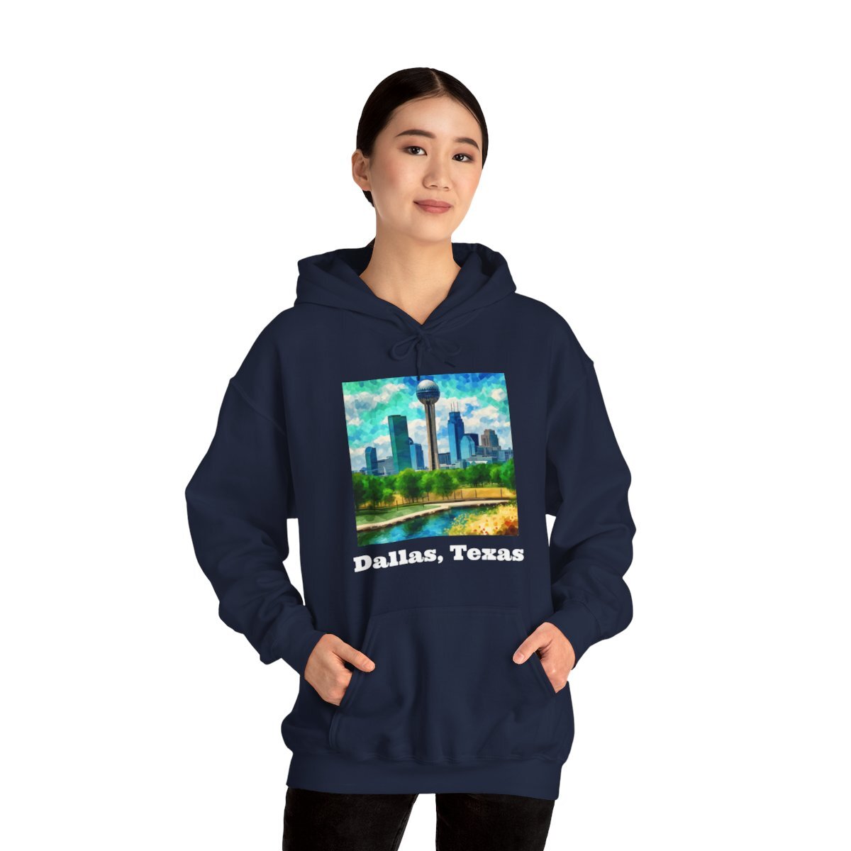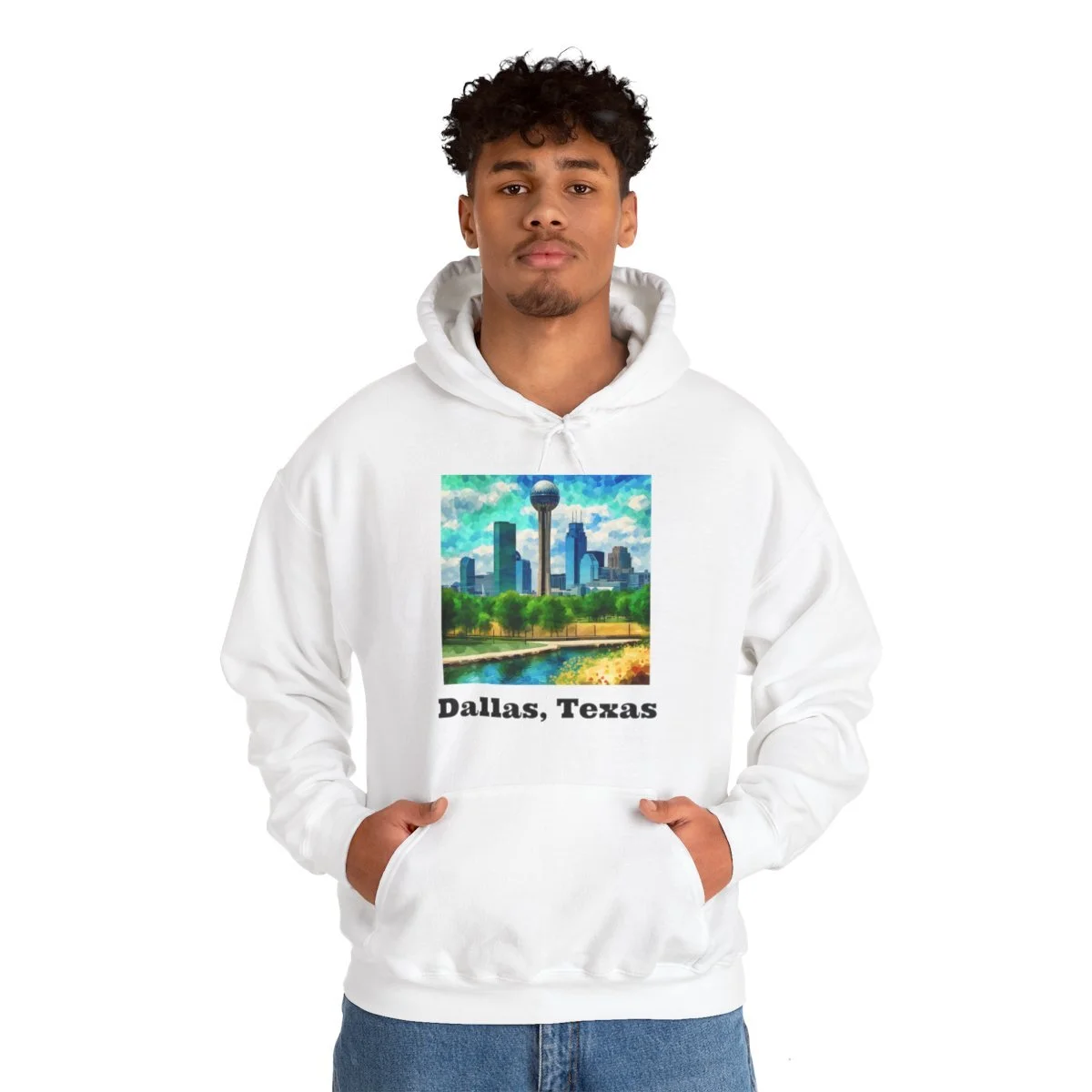 A unique hoodie with a beautiful watercolor image of the skyline of Dallas, Texas featuring the Reunion Tower. This unisex heavy blend hooded sweatshirt is relaxation itself. Made with a thick blend of cotton and polyester, it feels plush, soft and warm, a perfect choice for any cold day. In the front, the spacious kangaroo pocket adds daily practicality while the hood's drawstring is the same color as the base sweater for extra style points. As an added plus the image and lettering is on the front and back of the hoodie.