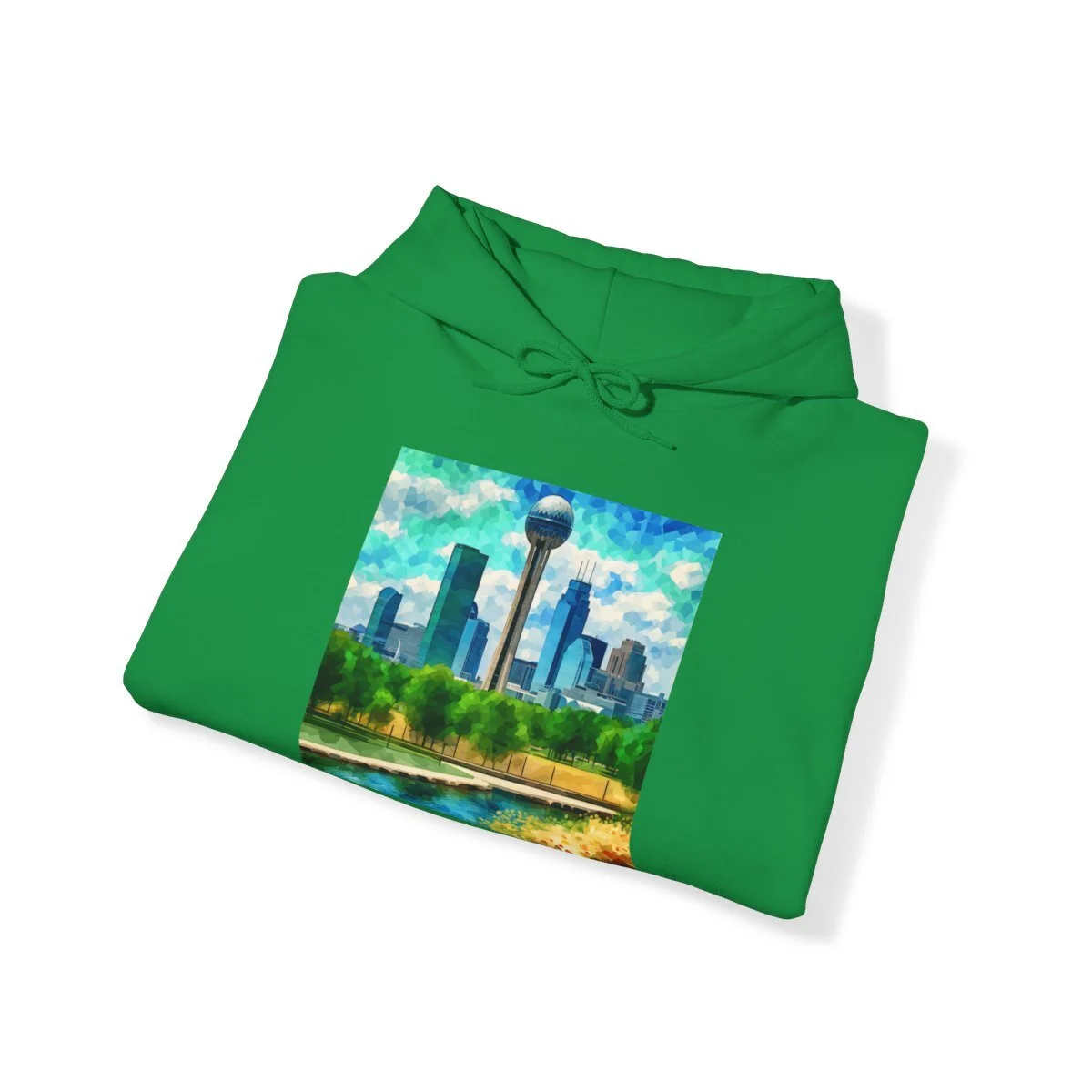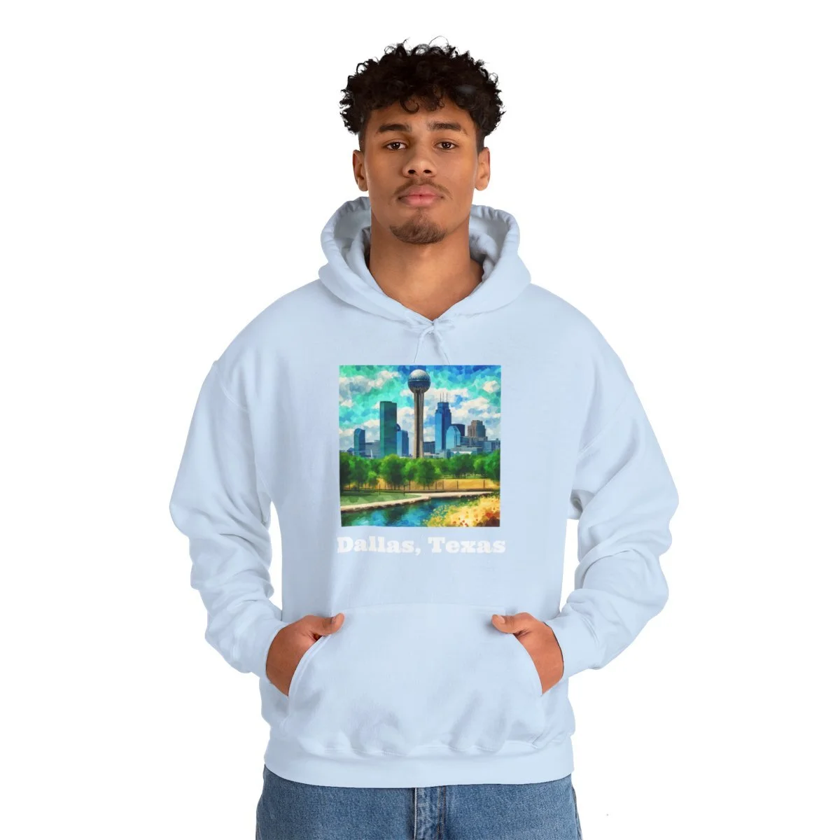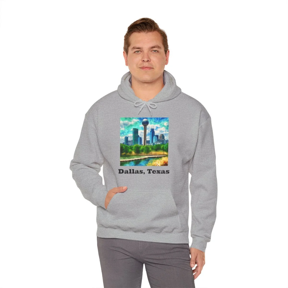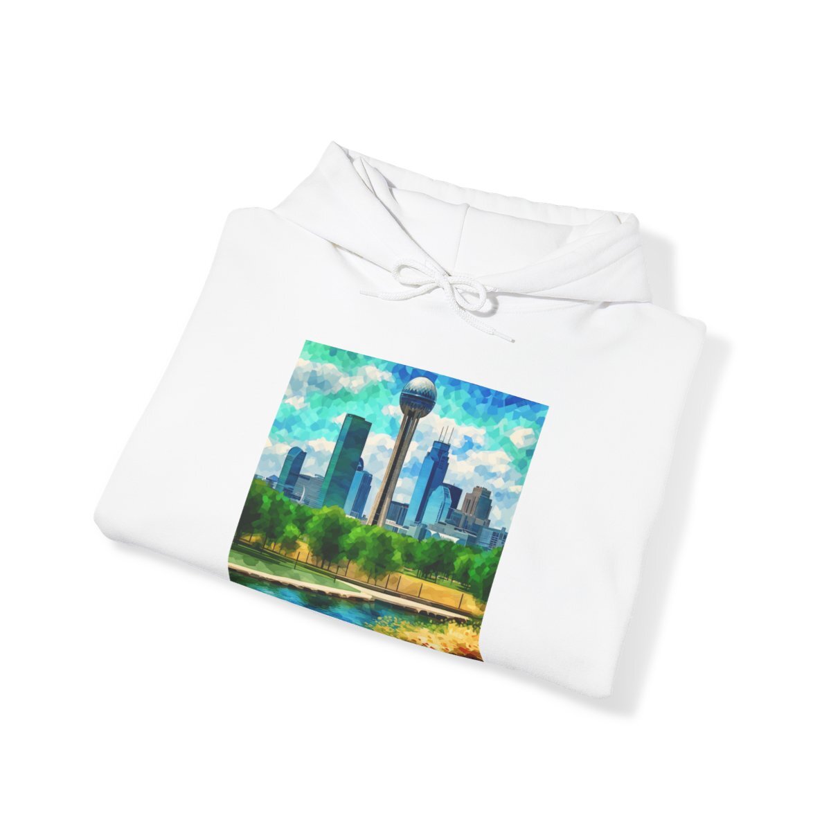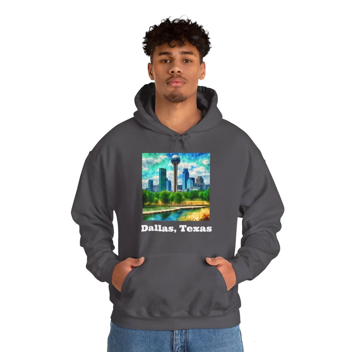 A unique hoodie with a beautiful watercolor image of the skyline of Dallas, Texas featuring the Reunion Tower. This unisex heavy blend hooded sweatshirt is relaxation itself. Made with a thick blend of cotton and polyester, it feels plush, soft and warm, a perfect choice for any cold day. In the front, the spacious kangaroo pocket adds daily practicality while the hood's drawstring is the same color as the base sweater for extra style points. As an added plus the image and lettering is on the front and back of the hoodie.