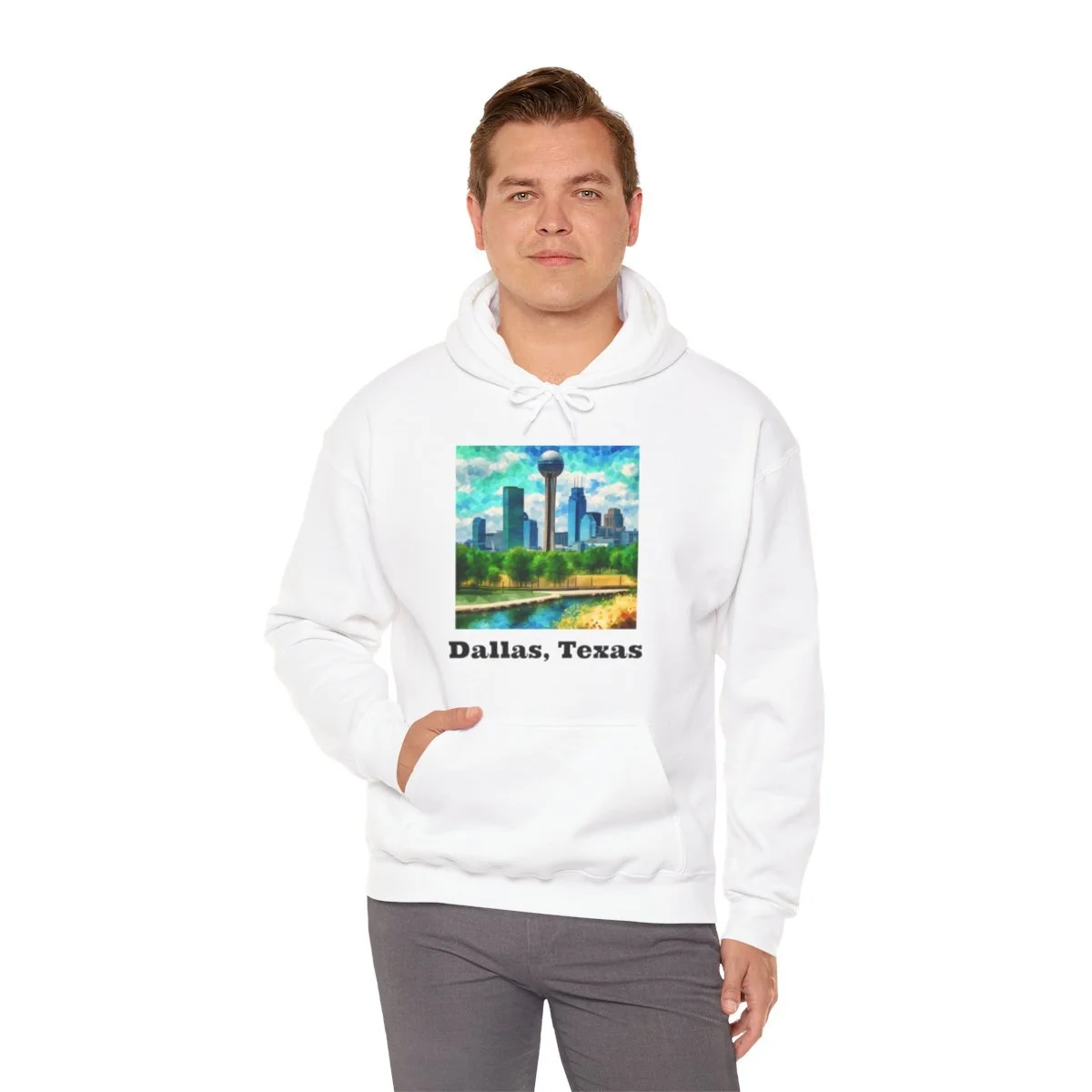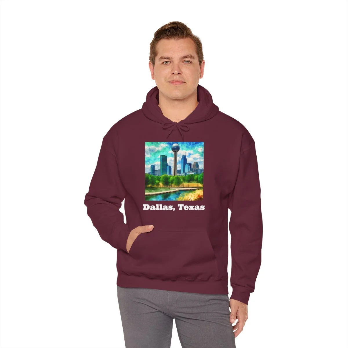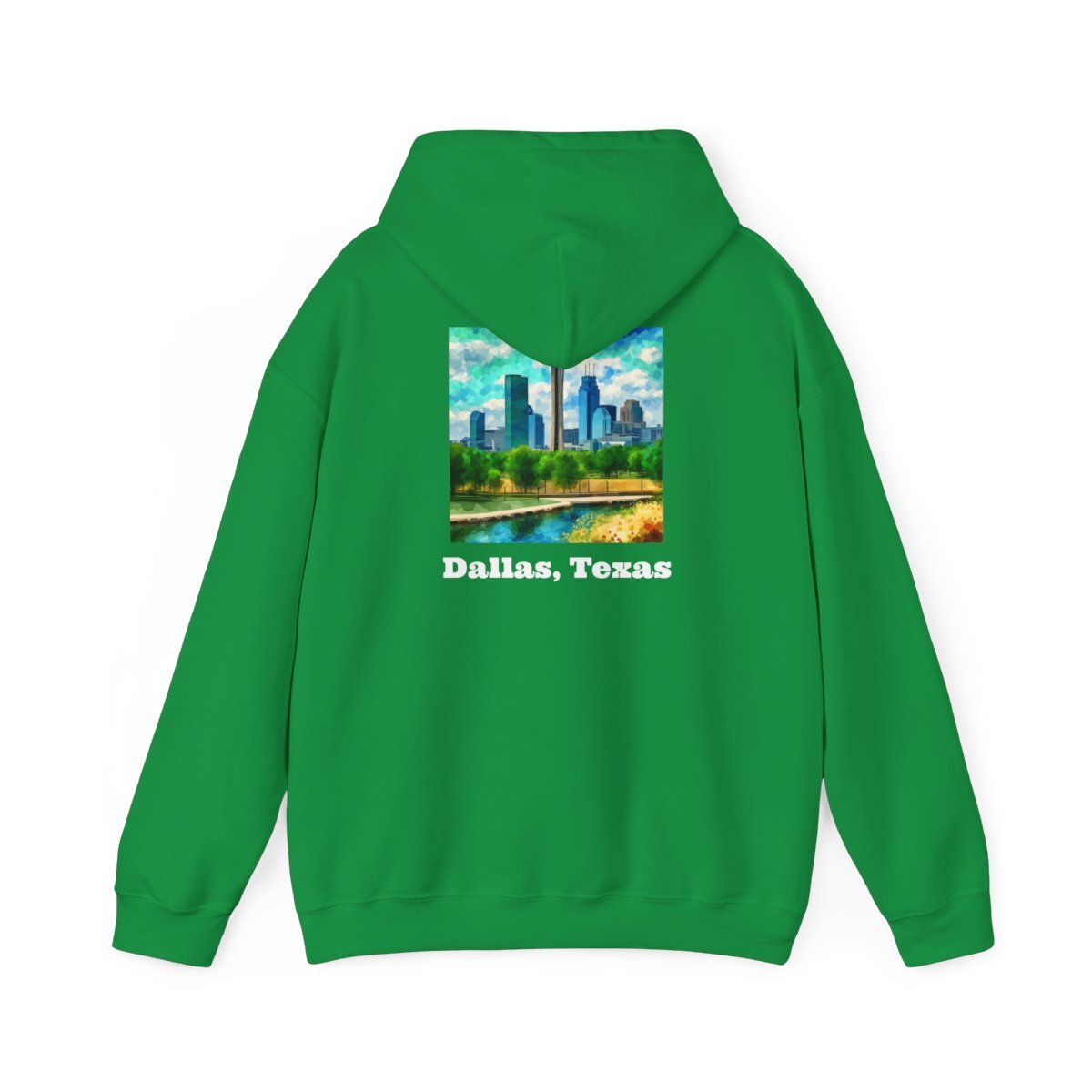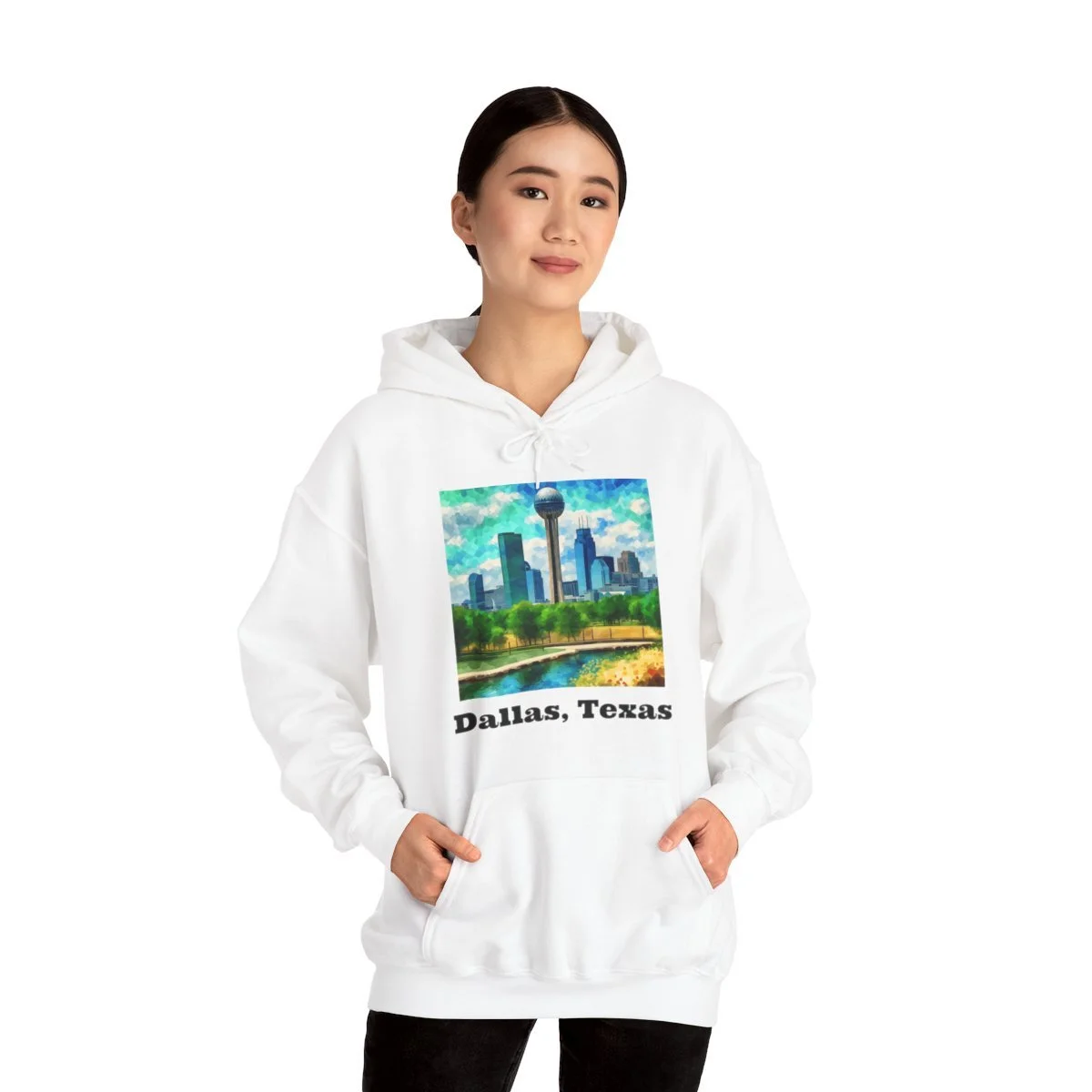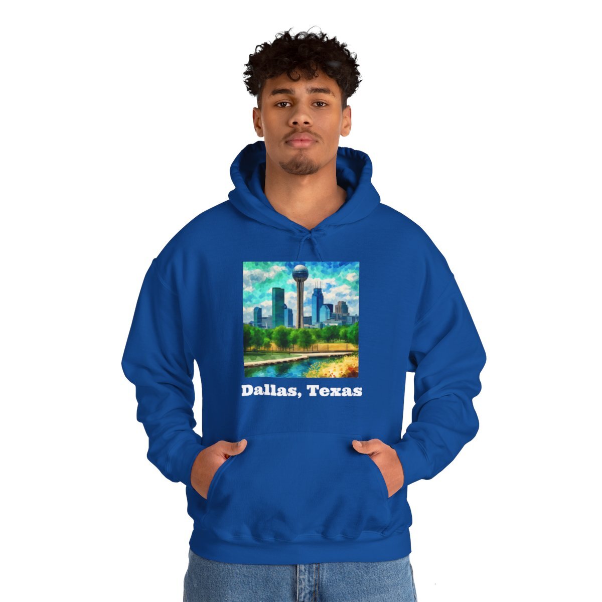 A unique hoodie with a beautiful watercolor image of the skyline of Dallas, Texas featuring the Reunion Tower. This unisex heavy blend hooded sweatshirt is relaxation itself. Made with a thick blend of cotton and polyester, it feels plush, soft and warm, a perfect choice for any cold day. In the front, the spacious kangaroo pocket adds daily practicality while the hood's drawstring is the same color as the base sweater for extra style points. As an added plus the image and lettering is on the front and back of the hoodie.