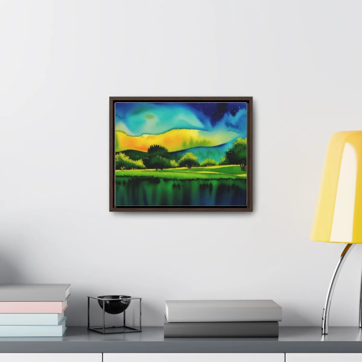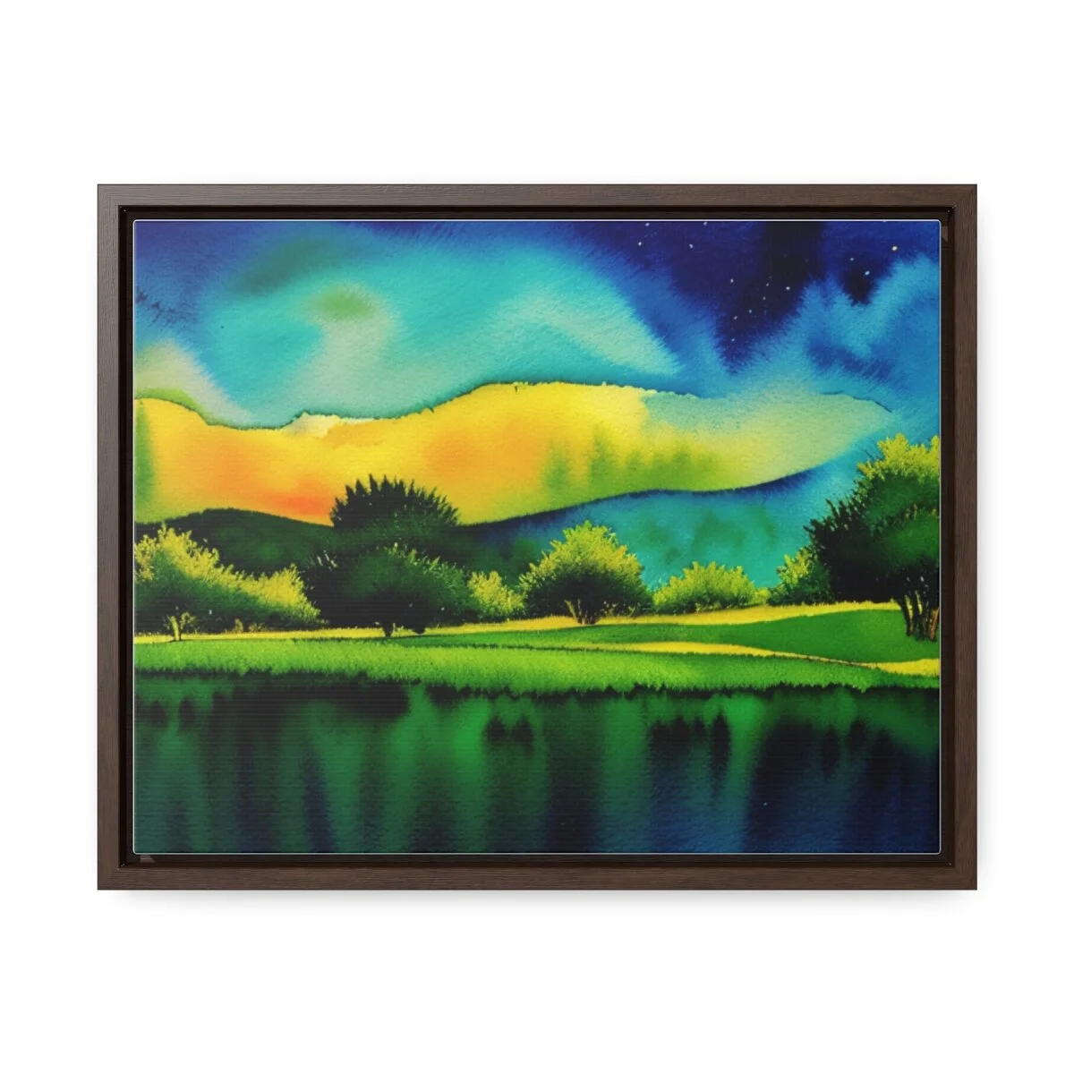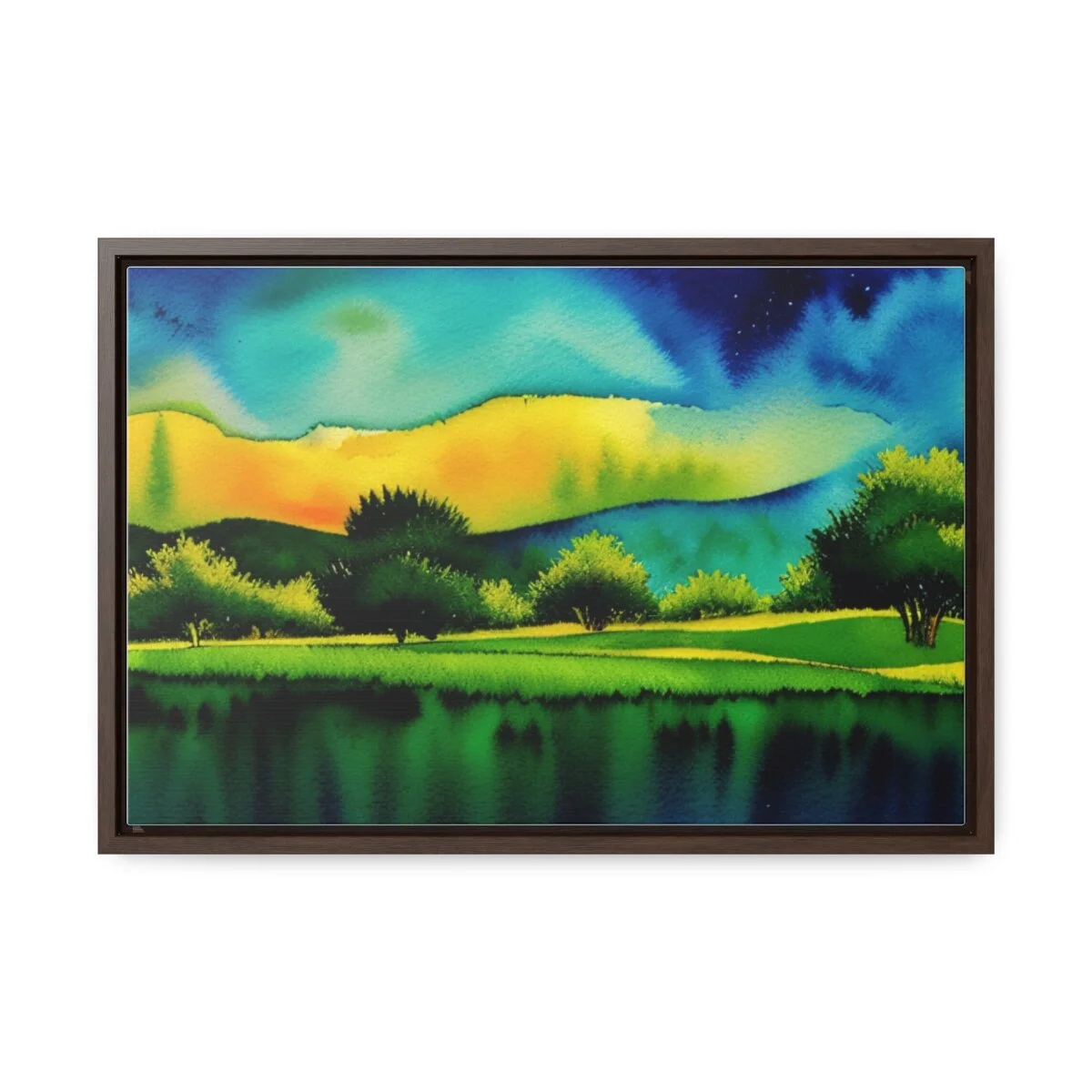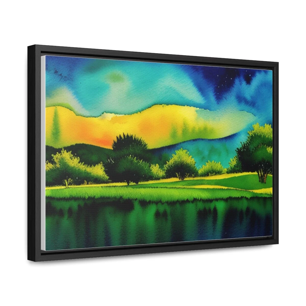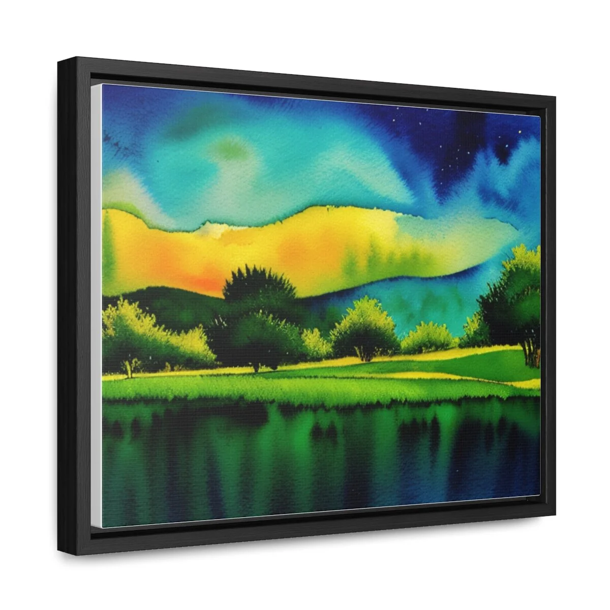 The Interlochen Sunrise watercolor image captures an early morning sunrise over Duck Lake, in Interlochen, Michigan. This horizontal gallery wrapped canvas print will always look as tight and flat as the day it was made. Every frame is built with a solid face to support the canvas and prevent deforming. Available in multiple sizes, comes in walnut and black frame options.