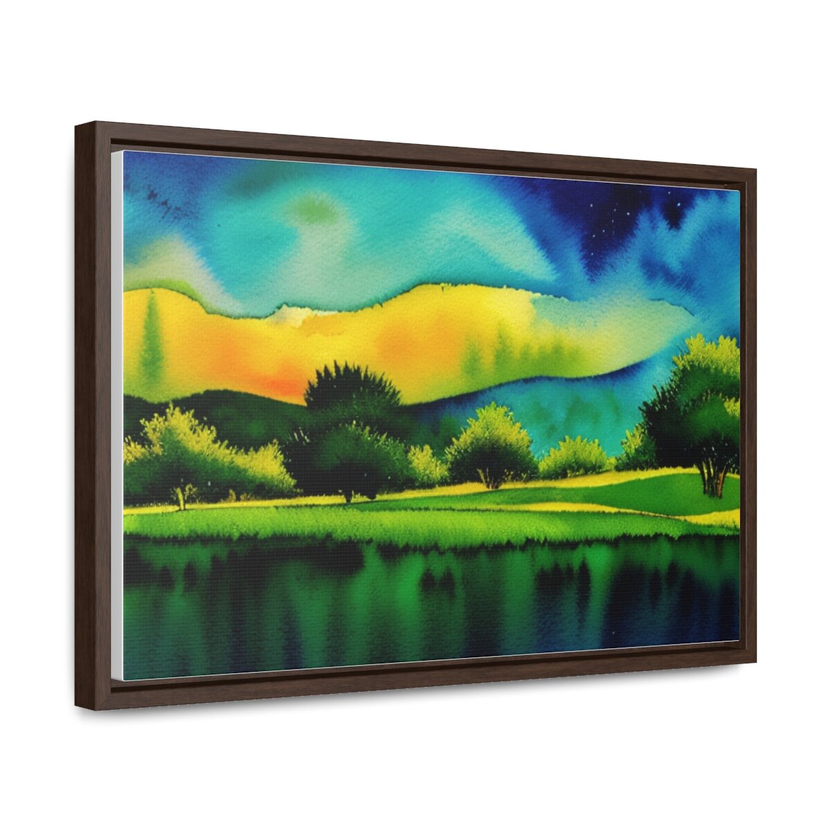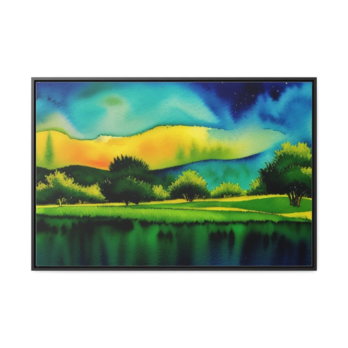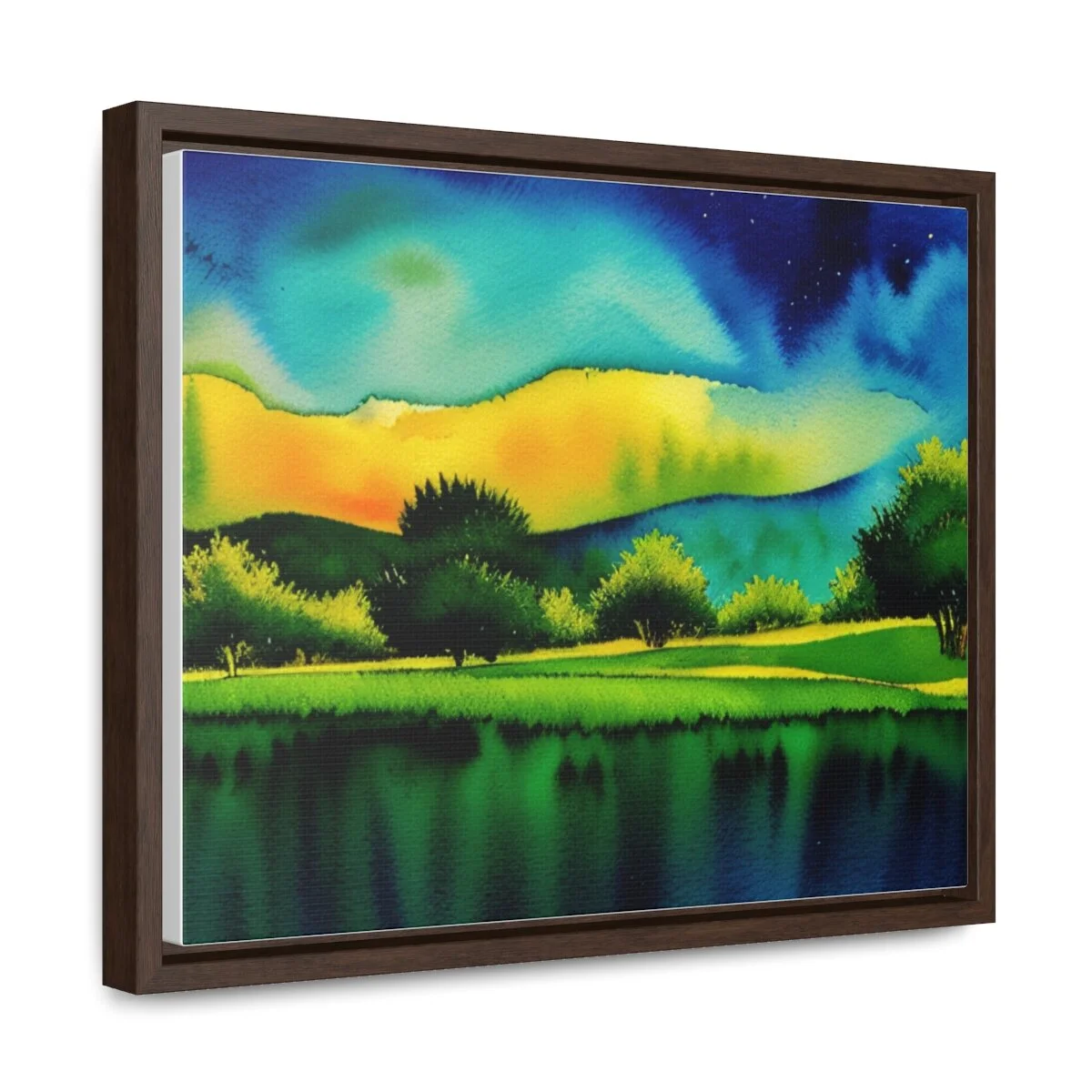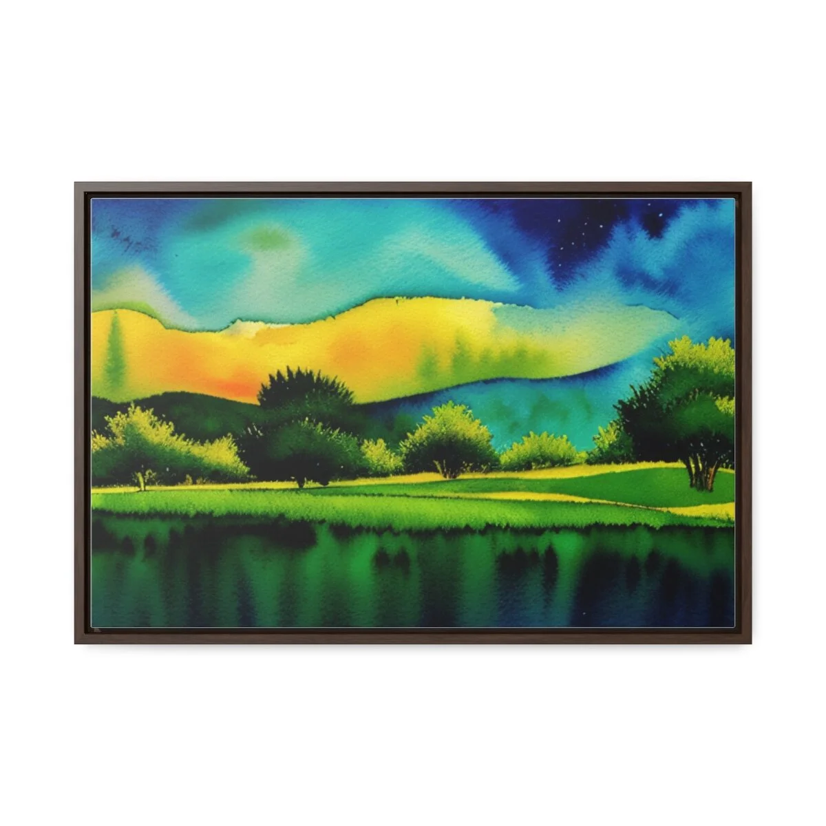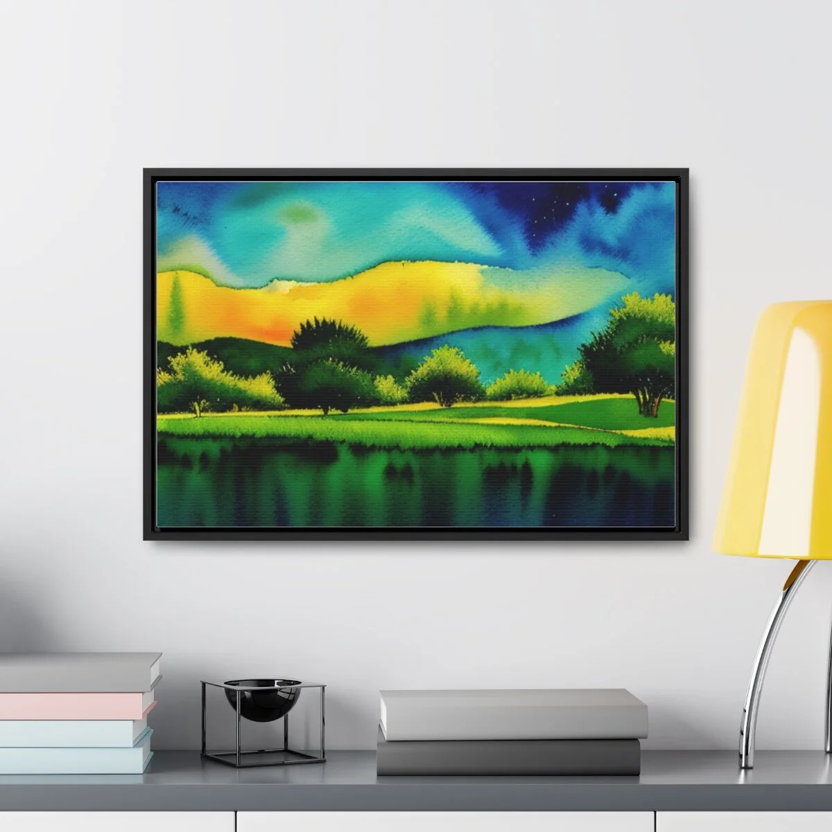 The Interlochen Sunrise watercolor image captures an early morning sunrise over Duck Lake, in Interlochen, Michigan. This horizontal gallery wrapped canvas print will always look as tight and flat as the day it was made. Every frame is built with a solid face to support the canvas and prevent deforming. Available in multiple sizes, comes in walnut and black frame options.