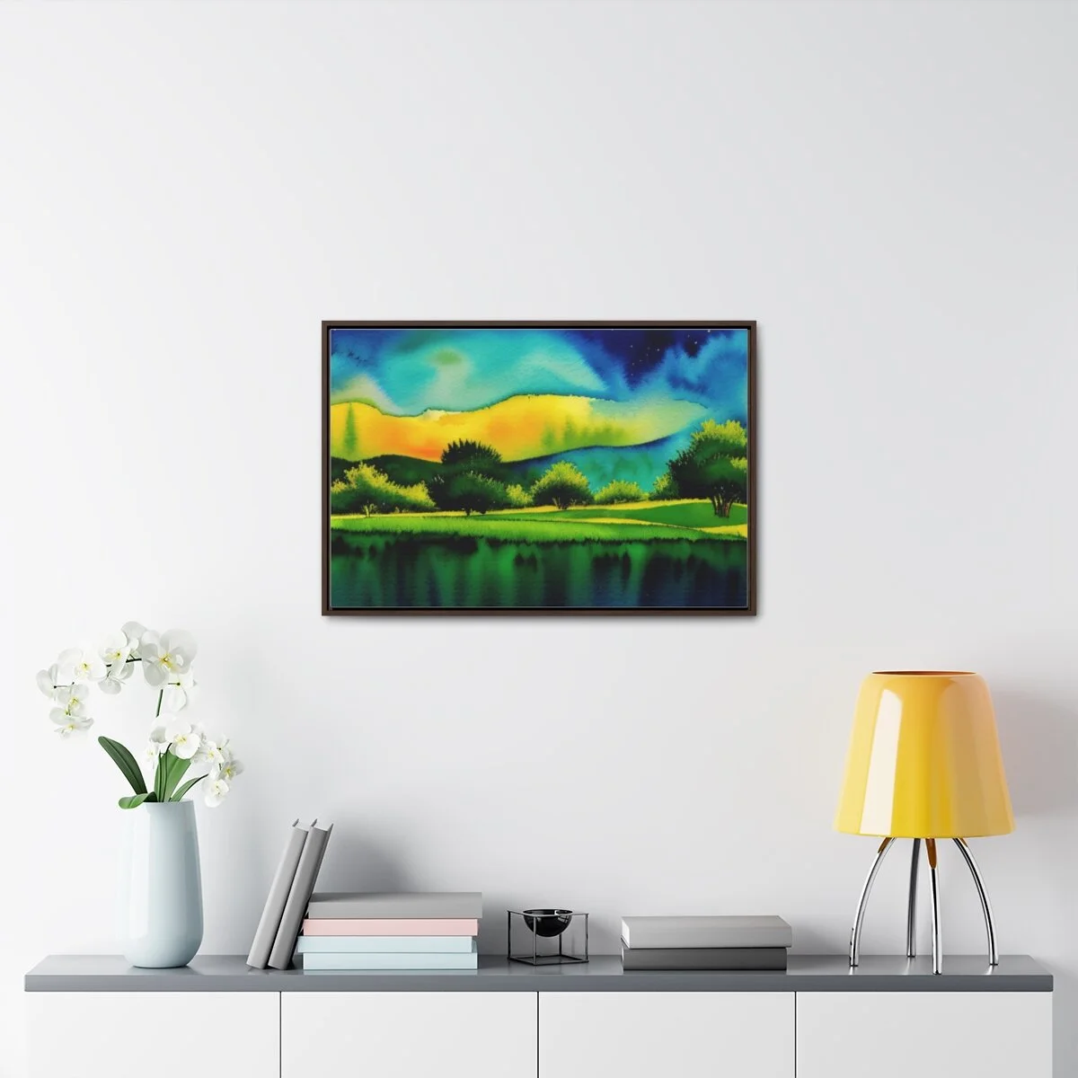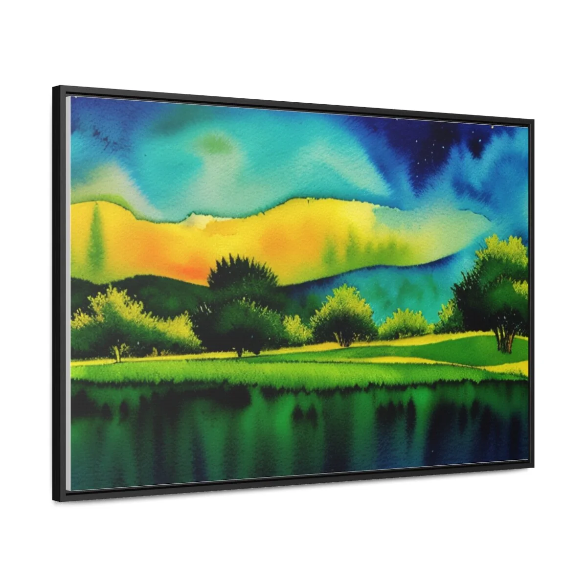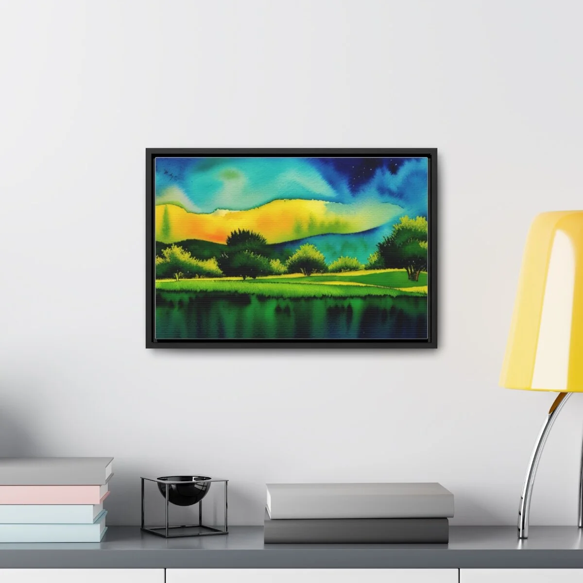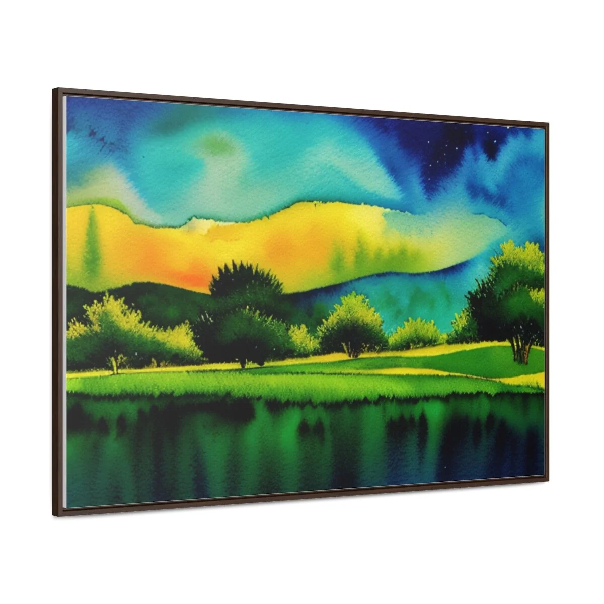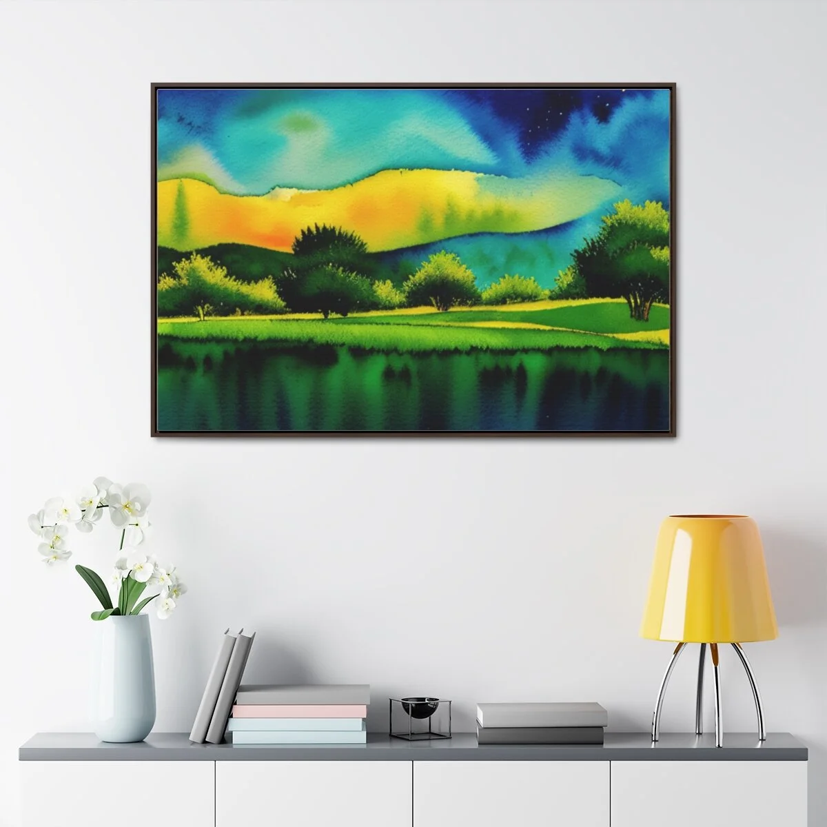The Interlochen Sunrise watercolor image captures an early morning sunrise over Duck Lake, in Interlochen, Michigan. This horizontal gallery wrapped canvas print will always look as tight and flat as the day it was made. Every frame is built with a solid face to support the canvas and prevent deforming. Available in multiple sizes, comes in walnut and black frame options.