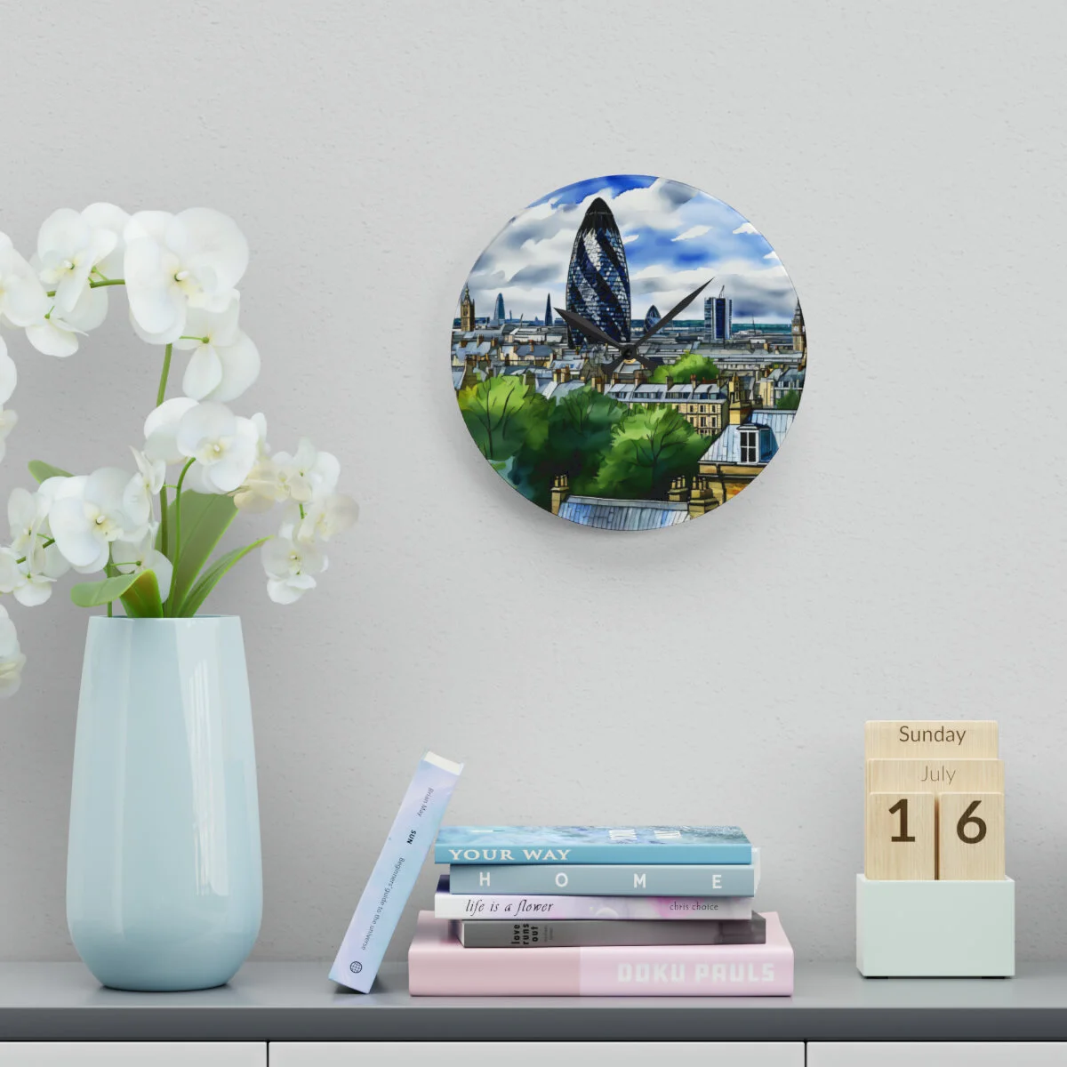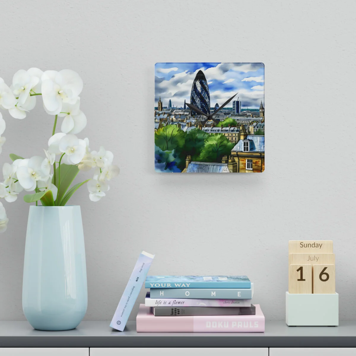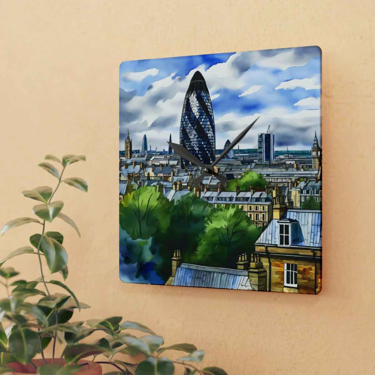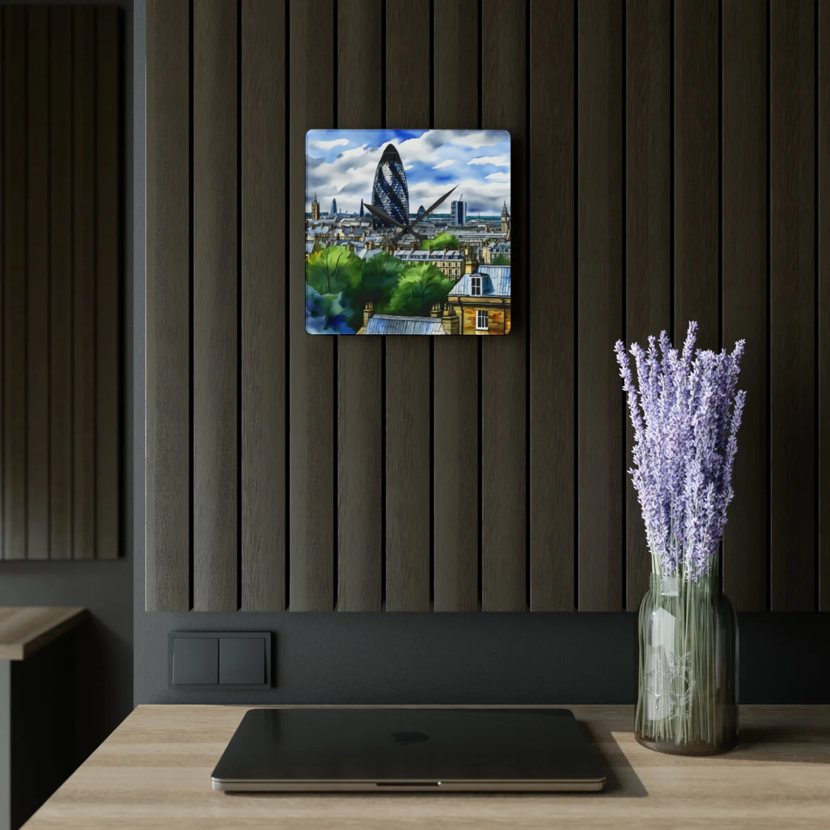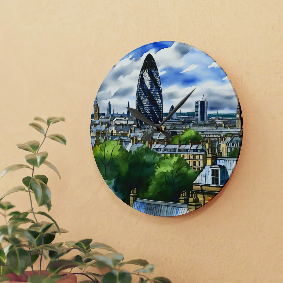 The watercolor image for this clock shows a combination of the old and the new architecture of London with the Gherkin Building, a modern architectural icon. These clocks come in two shapes (round and square). Each clock has a keyhole at the back for easy hanging on a wall. They're made from an acrylic material that looks like glass but is more durable and sturdier.
