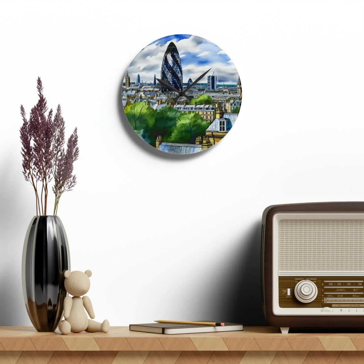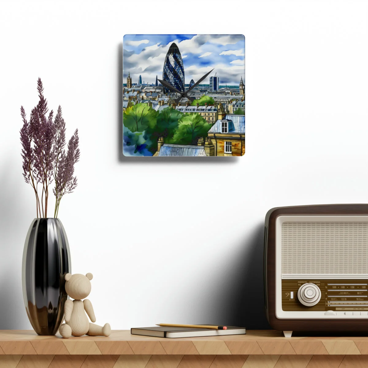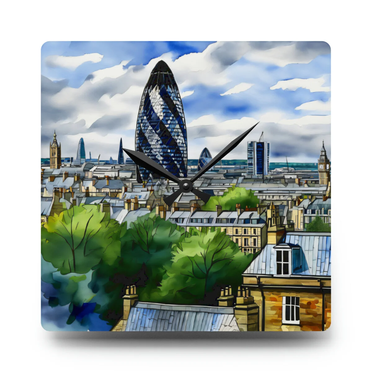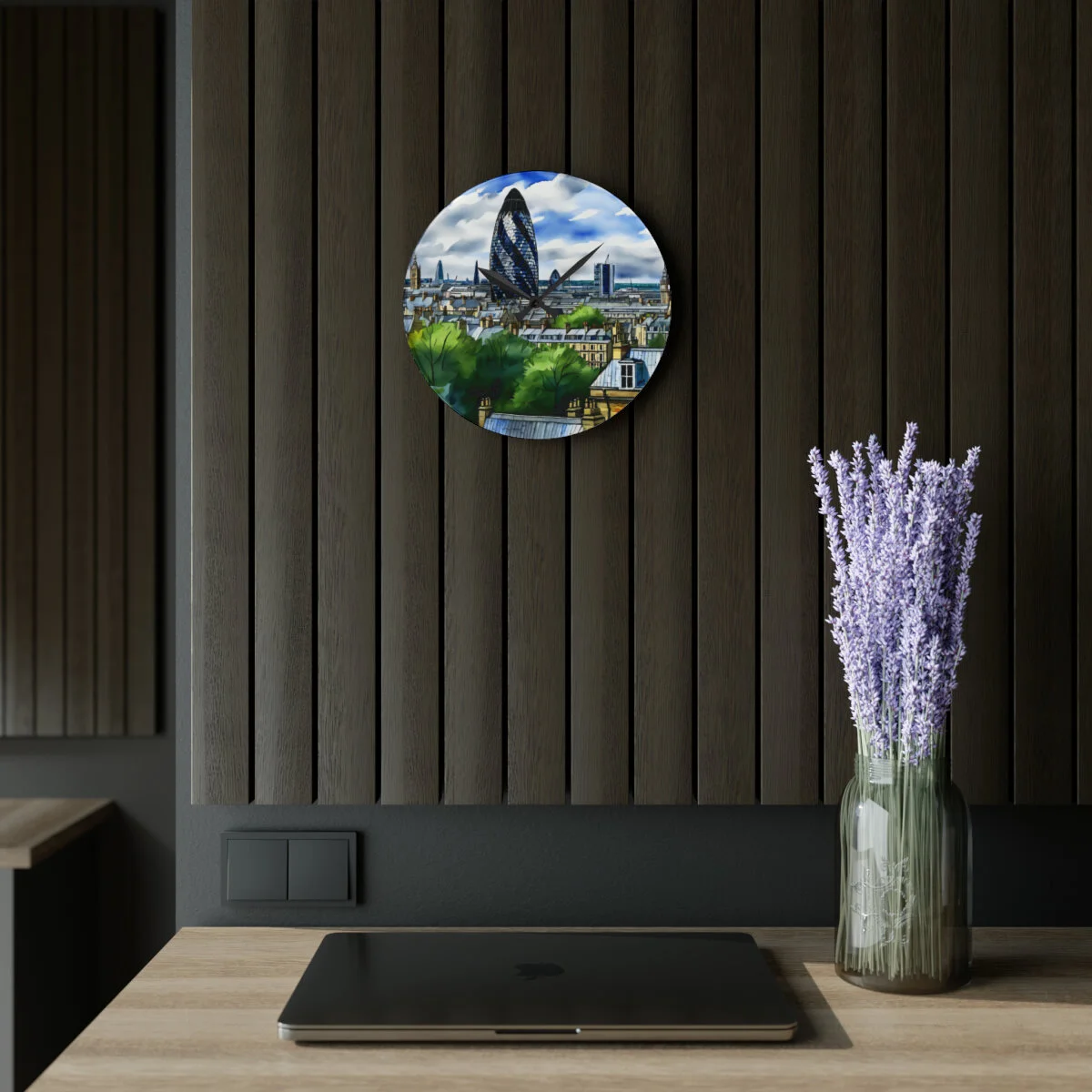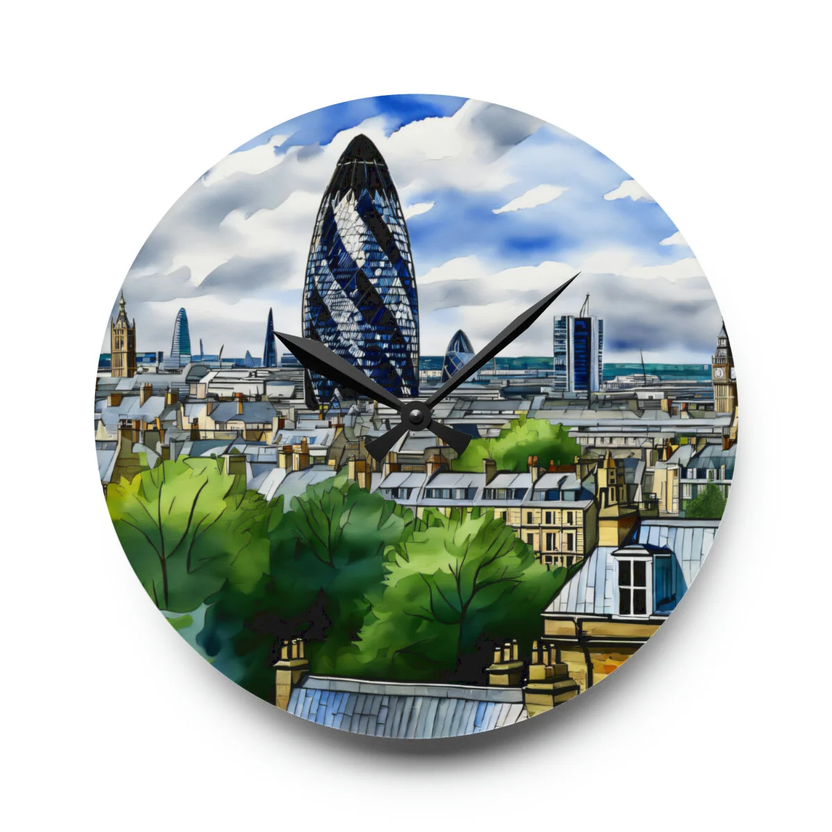 The watercolor image for this clock shows a combination of the old and the new architecture of London with the Gherkin Building, a modern architectural icon. These clocks come in two shapes (round and square). Each clock has a keyhole at the back for easy hanging on a wall. They're made from an acrylic material that looks like glass but is more durable and sturdier.