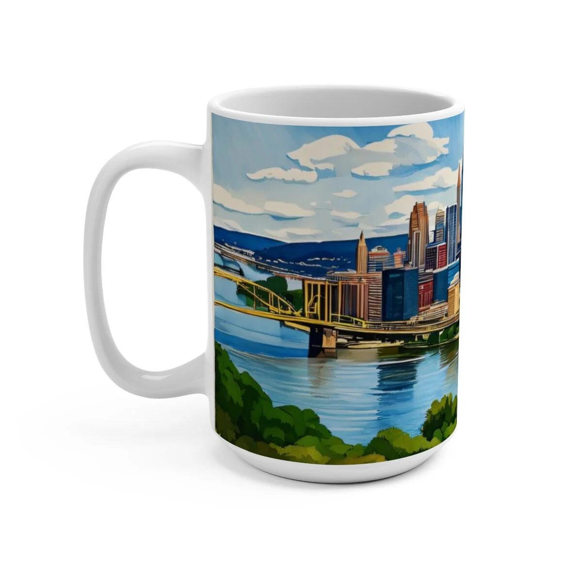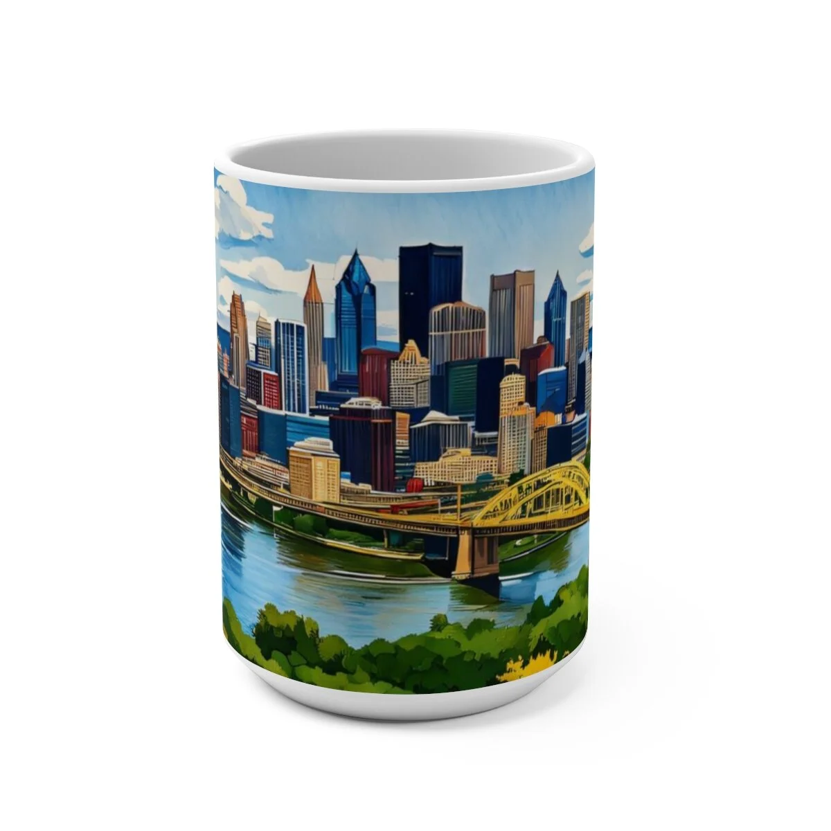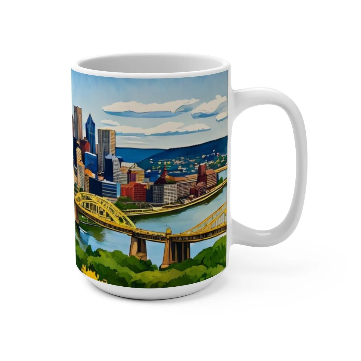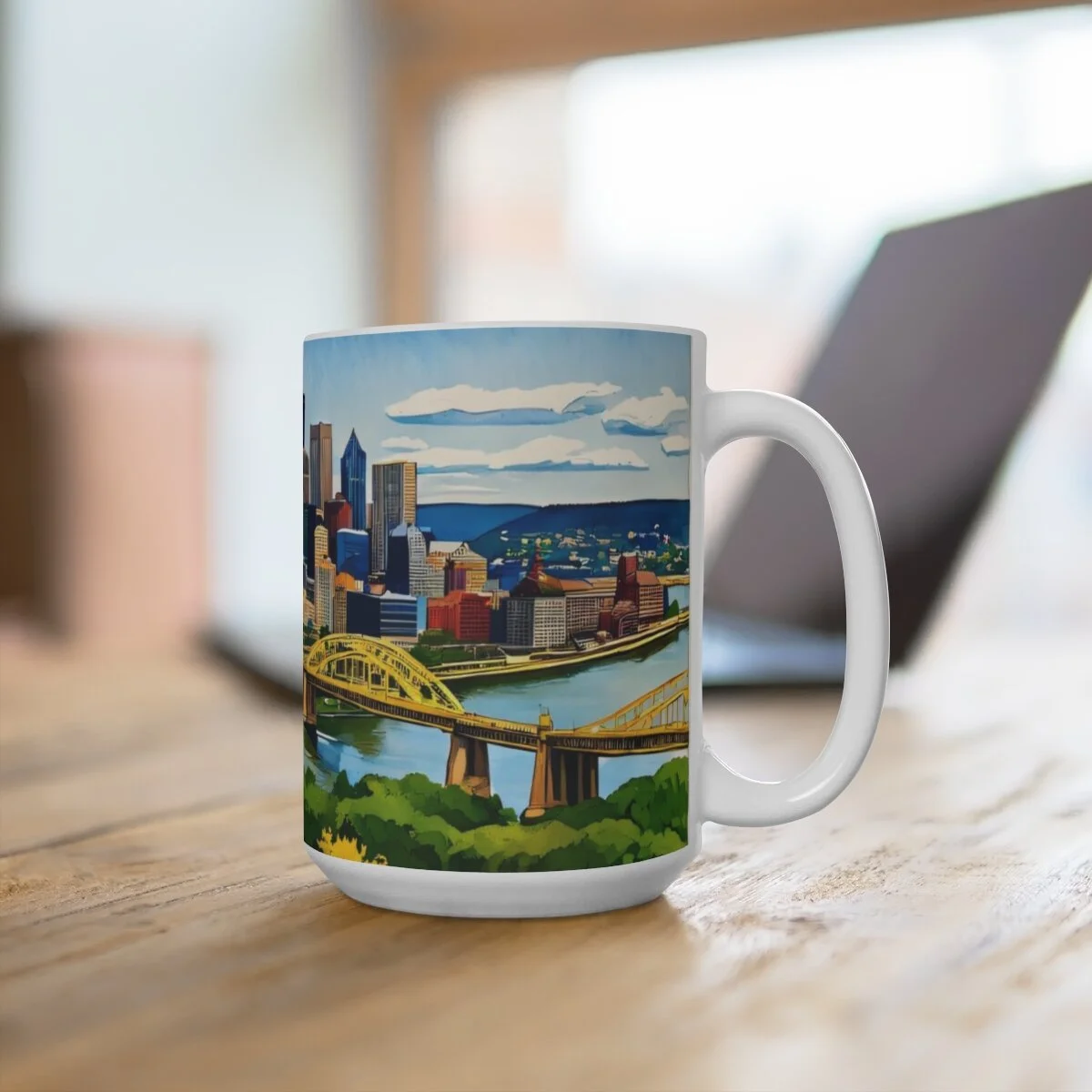 There's never too much coffee! A big size (15oz) white, durable ceramic mug is just what you need. While you are enjoying your coffee, tea or other hot beverage enjoy the scenic watercolor image of the Pittsburgh skyline in a beautiful afternoon. This gorgeous, high quality mug is a great addition to your personal collection and it makes it an appreciated gift for every true hot beverage lover.