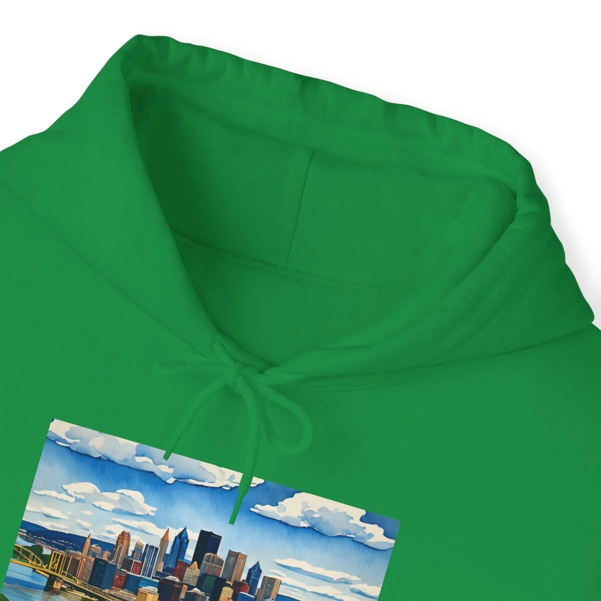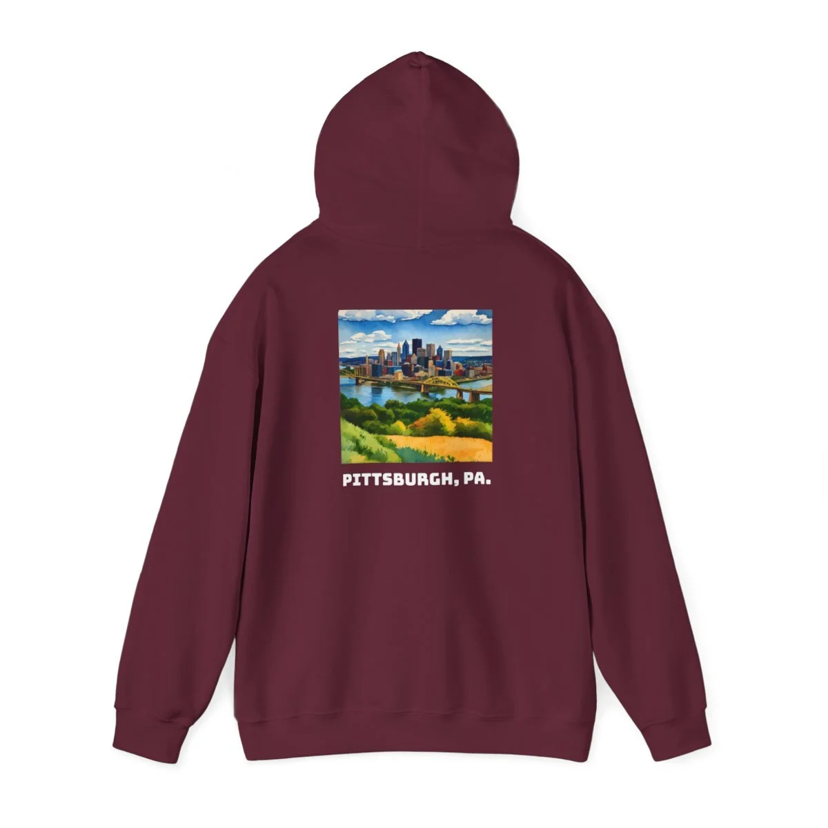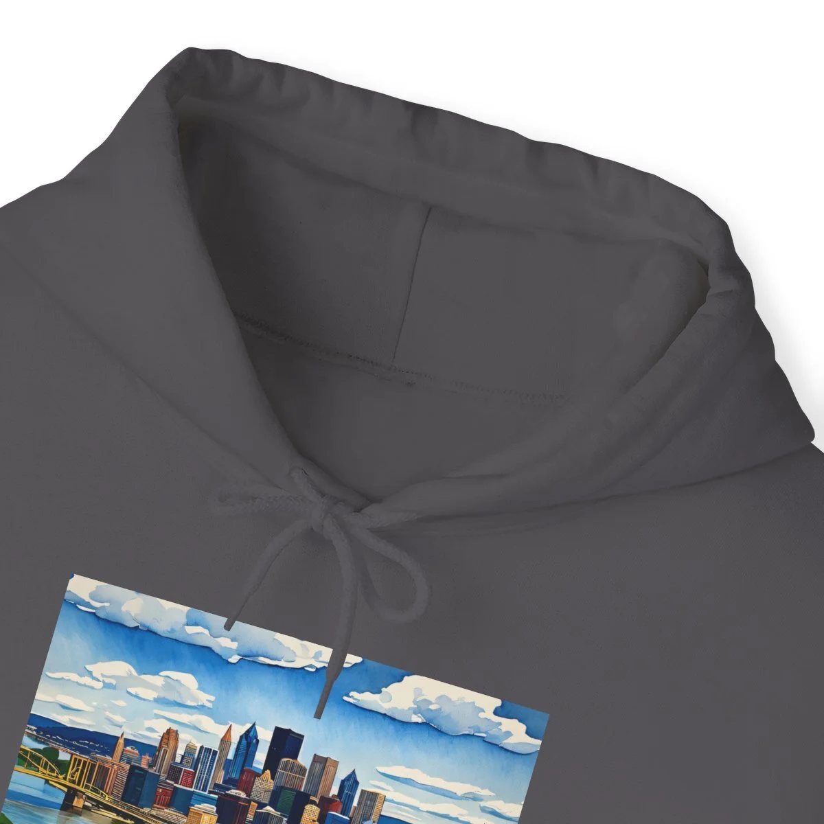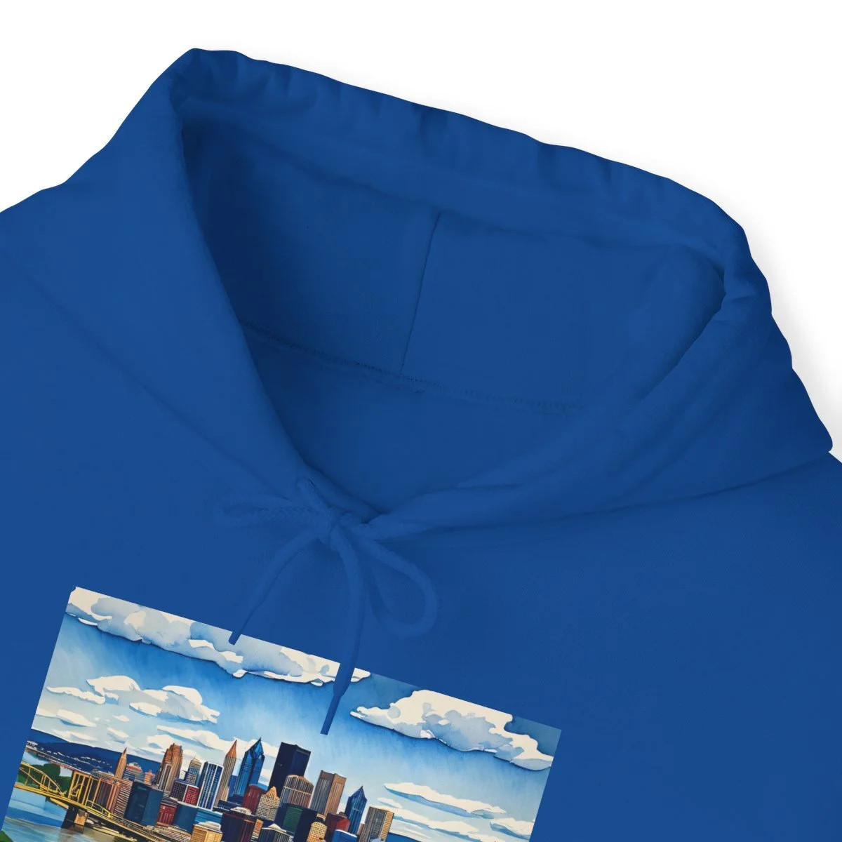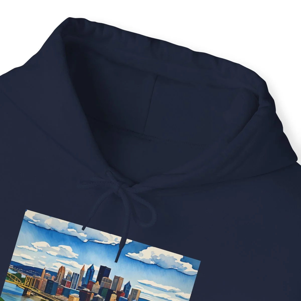 This hoodie is designed with a watercolor image of the skyline of downtown Pittsburgh, Pennsylvania on a beautiful day. This unisex heavy blend hoodie is relaxation itself. Made with a thick blend of cotton and polyester, it feels plush, soft and warm, a perfect choice for any cold day. The image and lettering are on both sides. In the front, the spacious kangaroo pocket adds daily practicality while the hood's drawstring is the same color as the base sweater for extra style points.