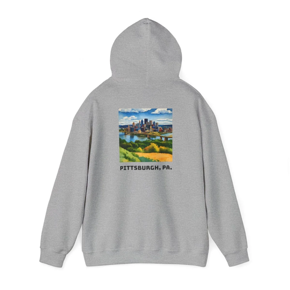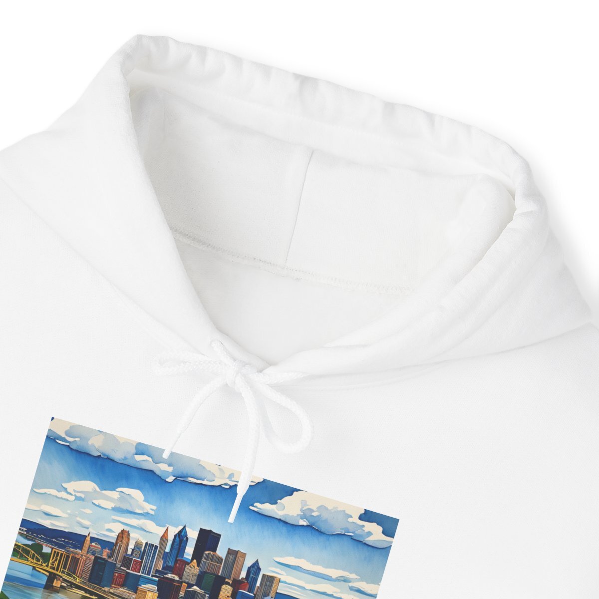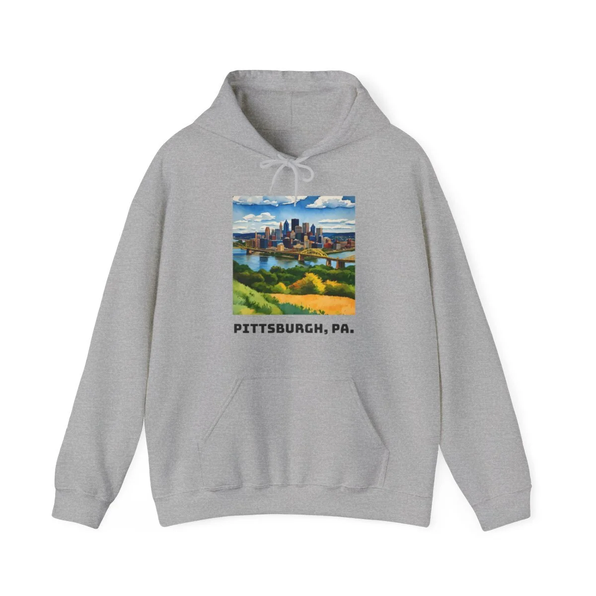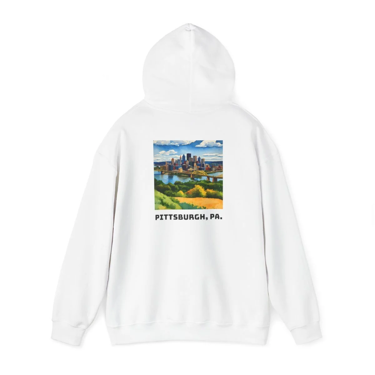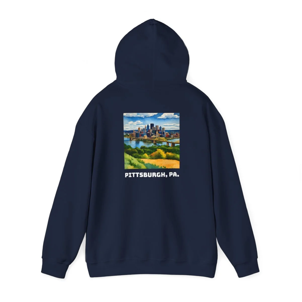 This hoodie is designed with a watercolor image of the skyline of downtown Pittsburgh, Pennsylvania on a beautiful day. This unisex heavy blend hoodie is relaxation itself. Made with a thick blend of cotton and polyester, it feels plush, soft and warm, a perfect choice for any cold day. The image and lettering are on both sides. In the front, the spacious kangaroo pocket adds daily practicality while the hood's drawstring is the same color as the base sweater for extra style points.