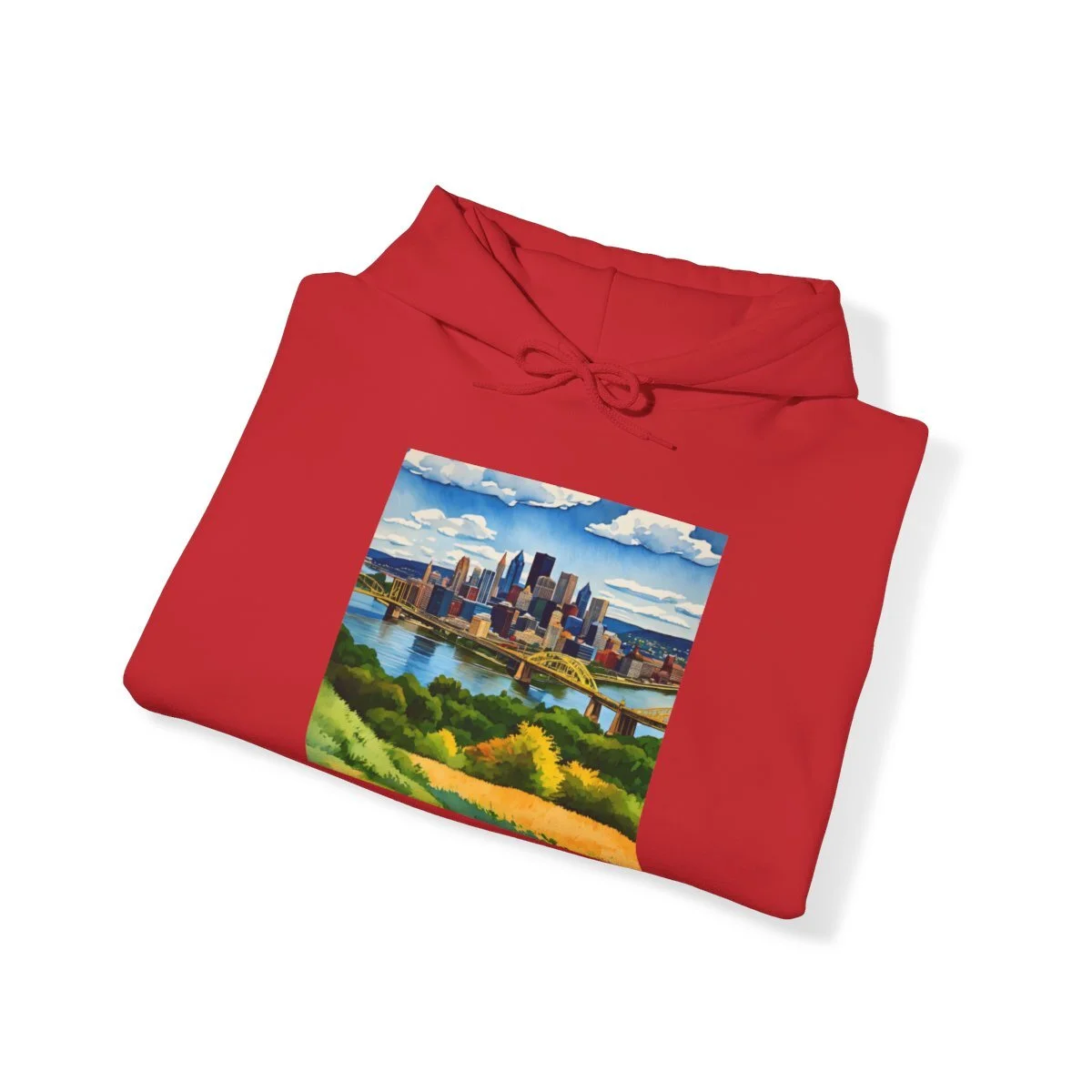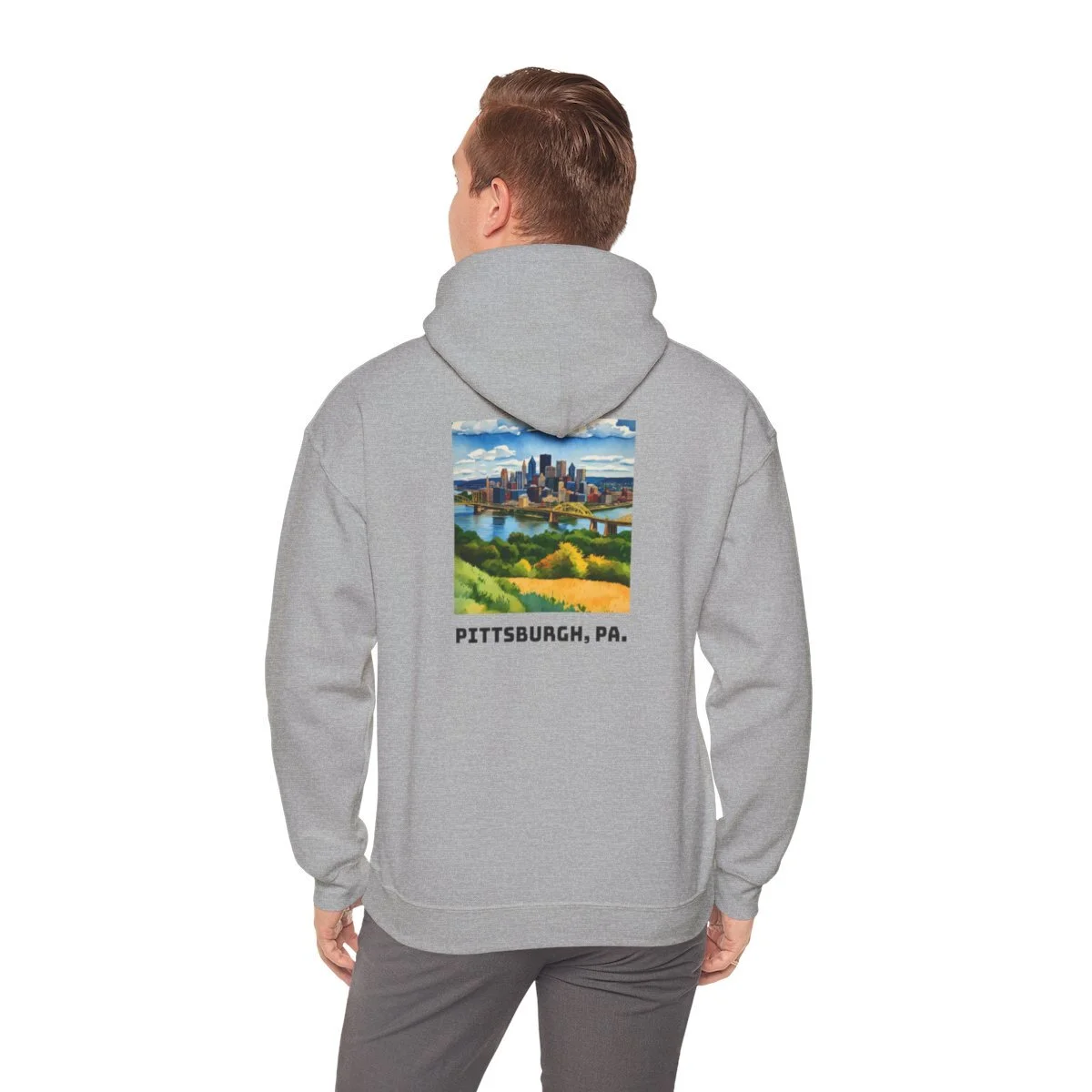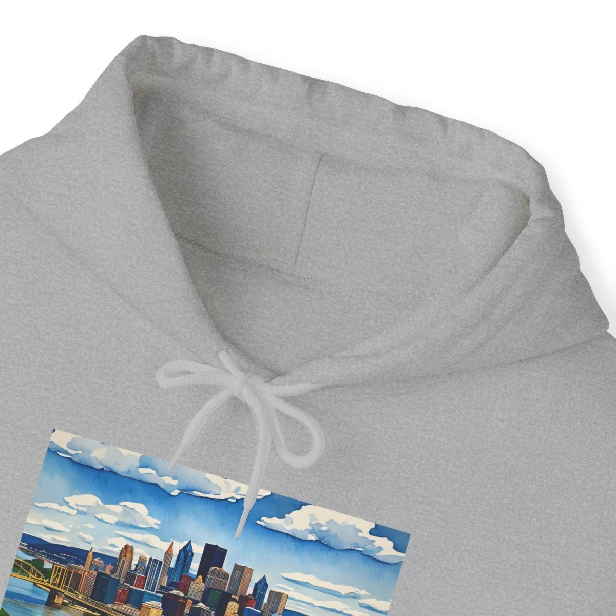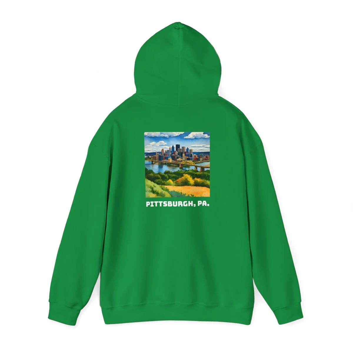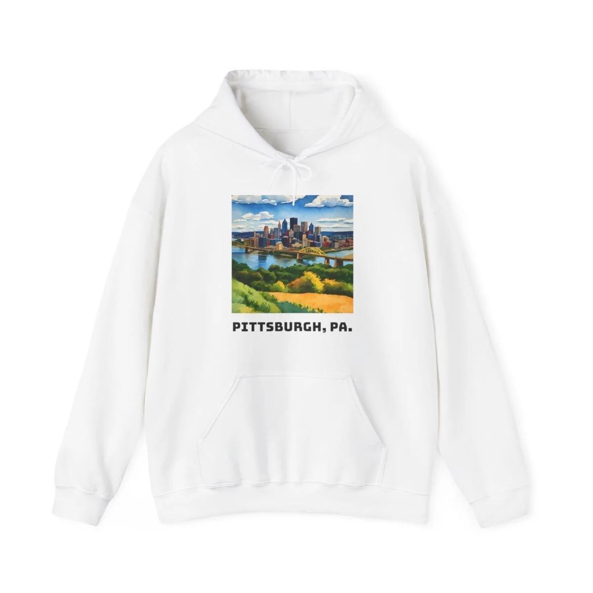 This hoodie is designed with a watercolor image of the skyline of downtown Pittsburgh, Pennsylvania on a beautiful day. This unisex heavy blend hoodie is relaxation itself. Made with a thick blend of cotton and polyester, it feels plush, soft and warm, a perfect choice for any cold day. The image and lettering are on both sides. In the front, the spacious kangaroo pocket adds daily practicality while the hood's drawstring is the same color as the base sweater for extra style points.