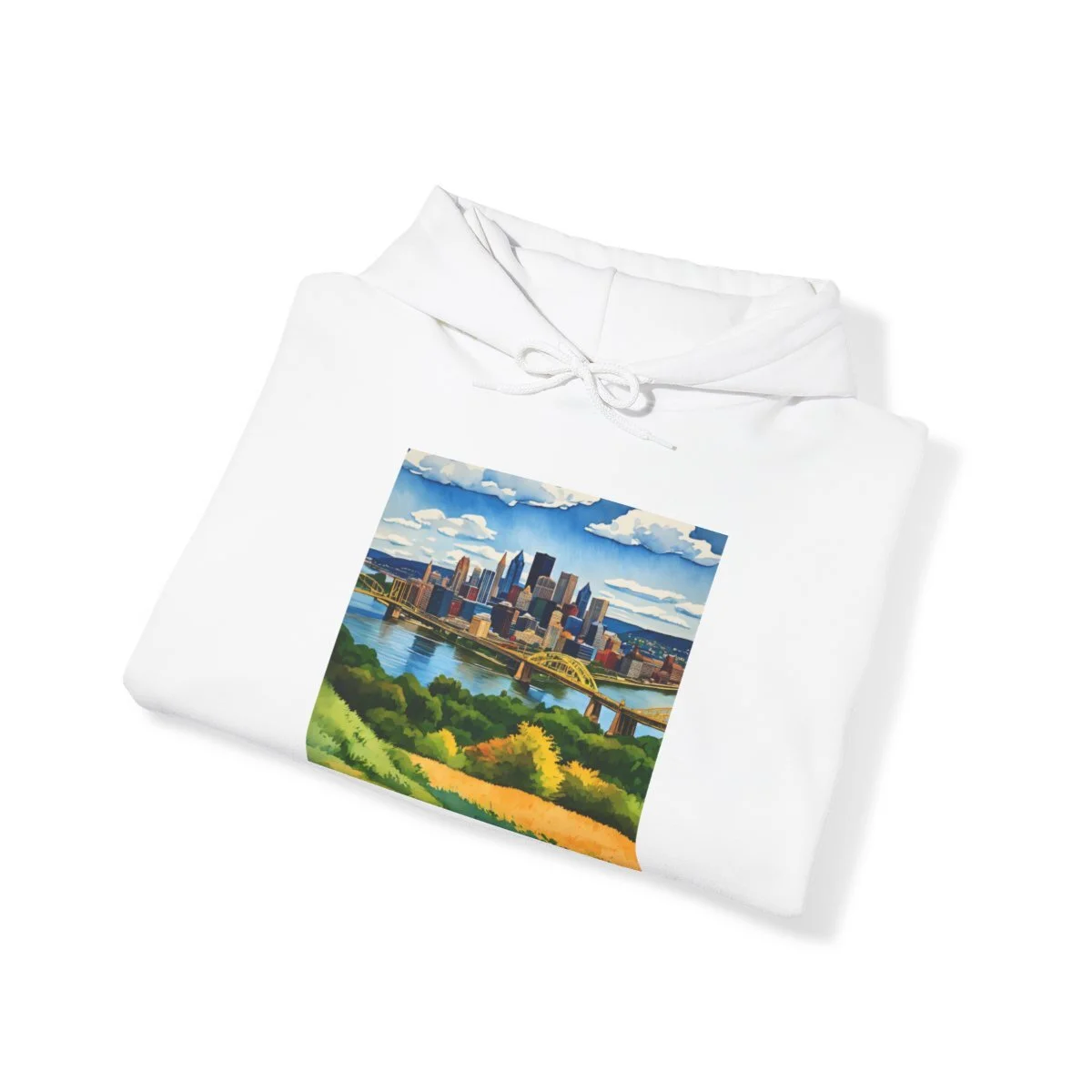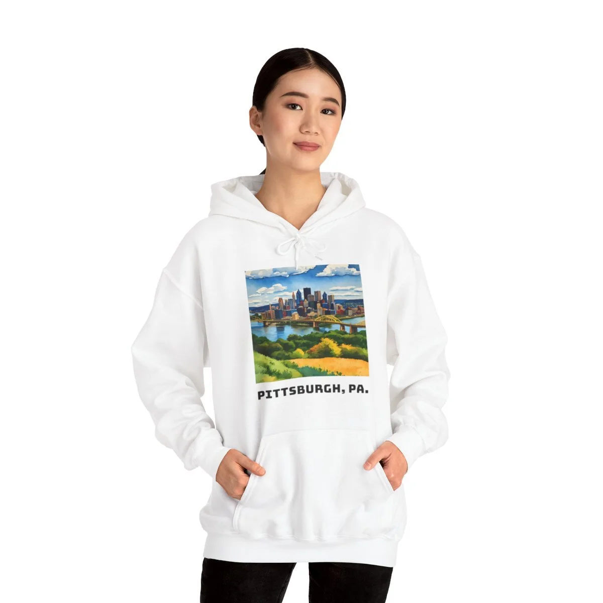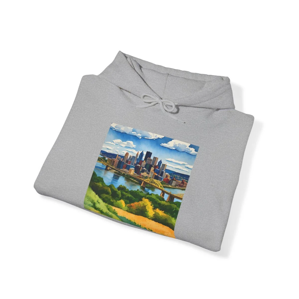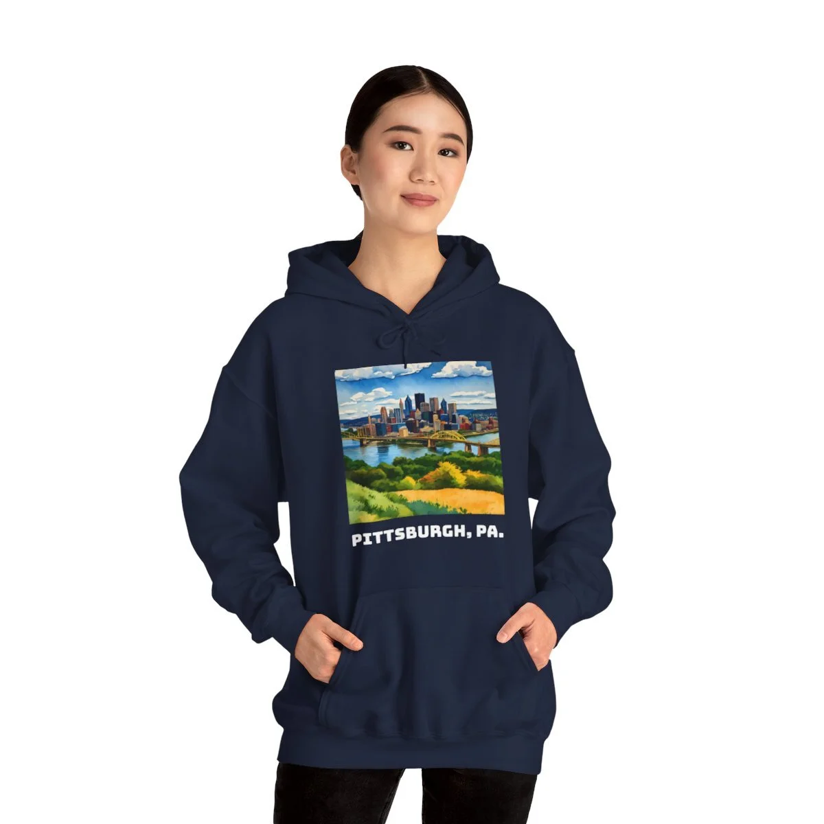 This hoodie is designed with a watercolor image of the skyline of downtown Pittsburgh, Pennsylvania on a beautiful day. This unisex heavy blend hoodie is relaxation itself. Made with a thick blend of cotton and polyester, it feels plush, soft and warm, a perfect choice for any cold day. The image and lettering are on both sides. In the front, the spacious kangaroo pocket adds daily practicality while the hood's drawstring is the same color as the base sweater for extra style points.