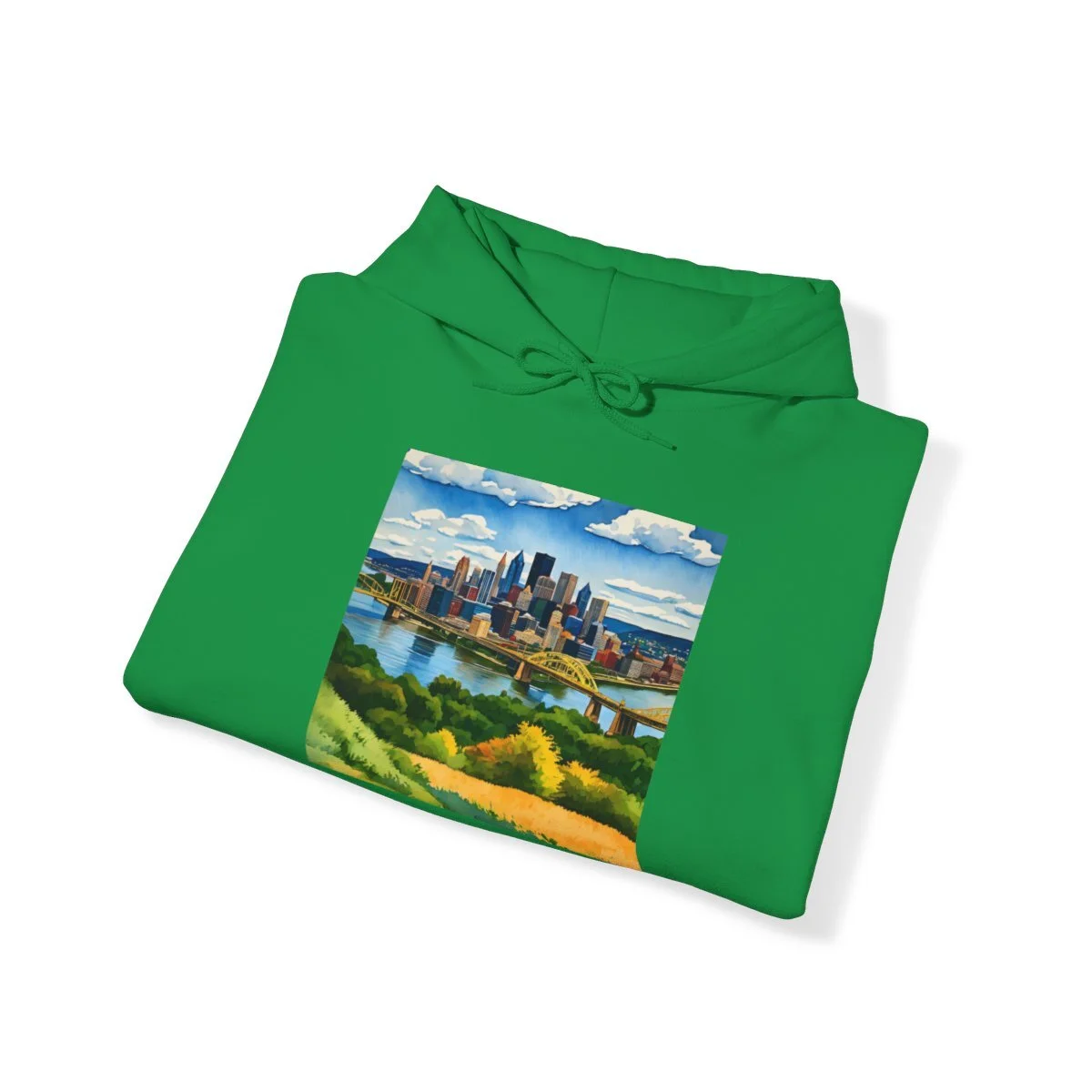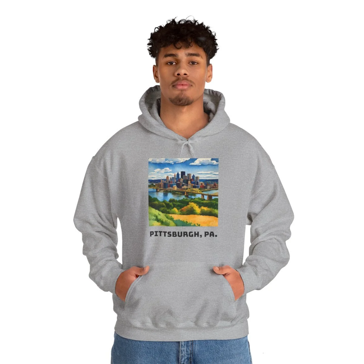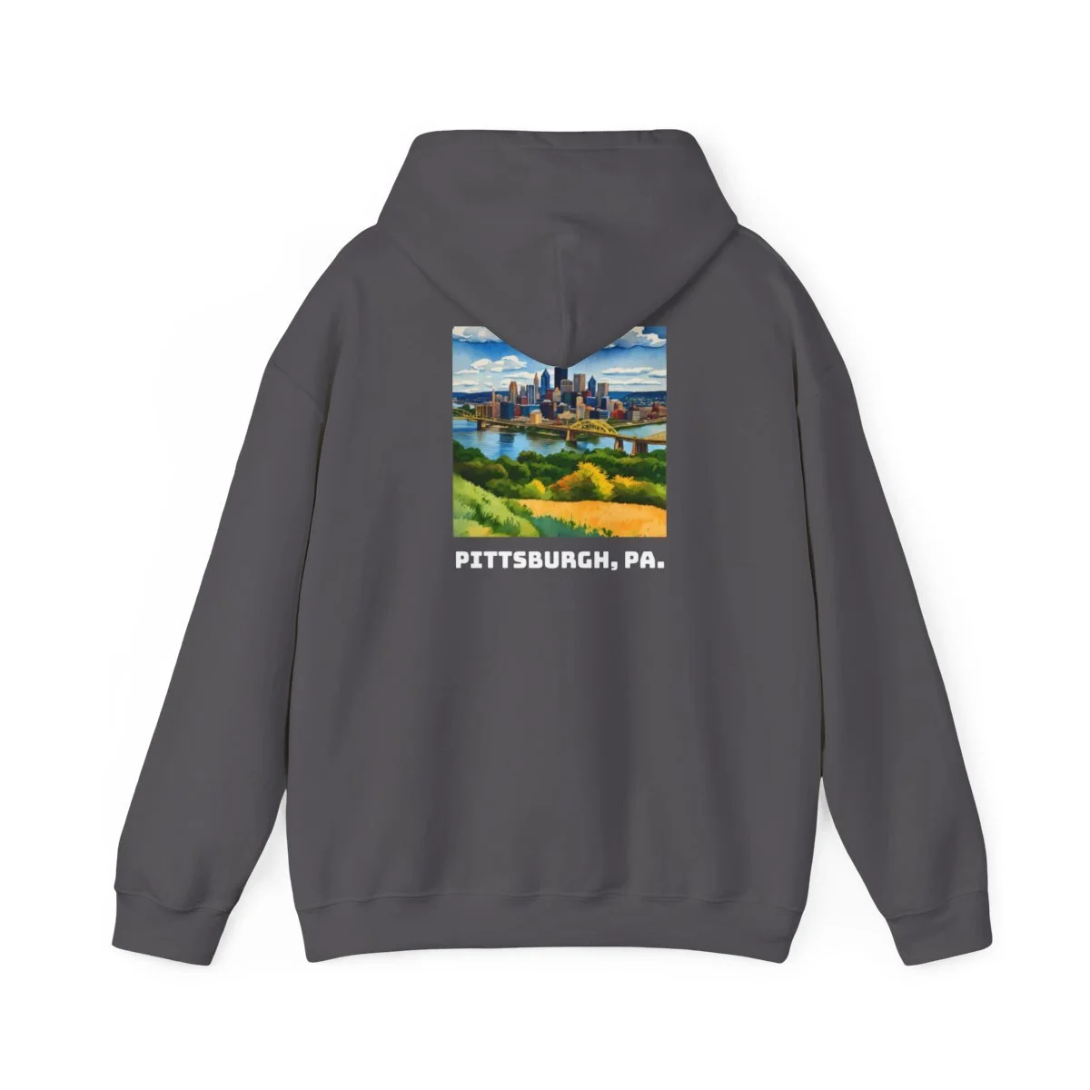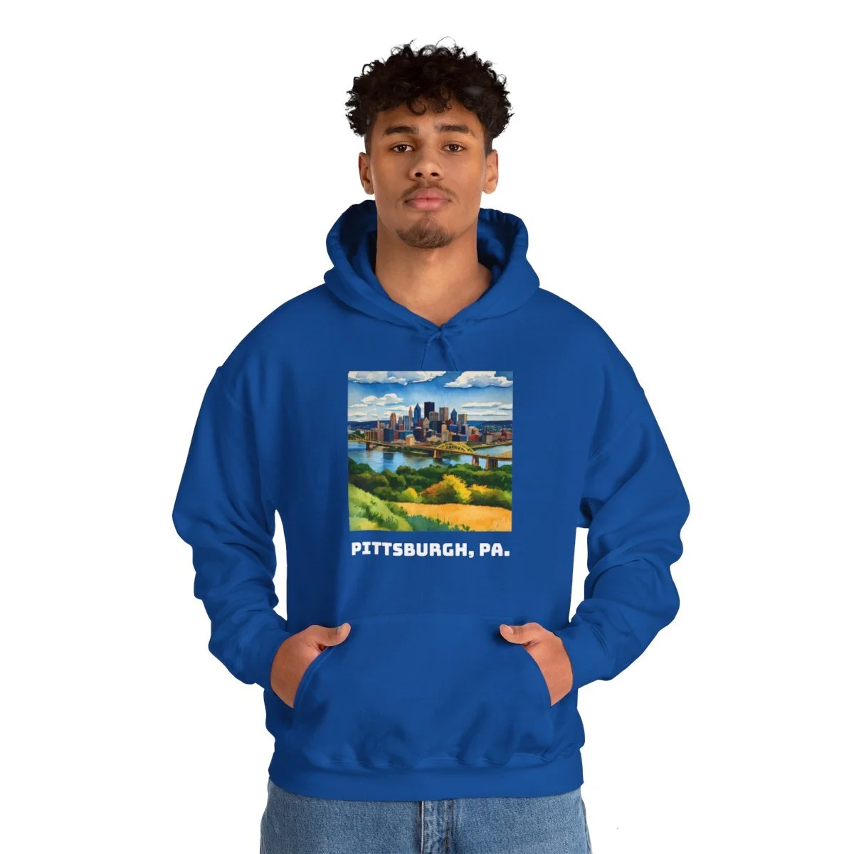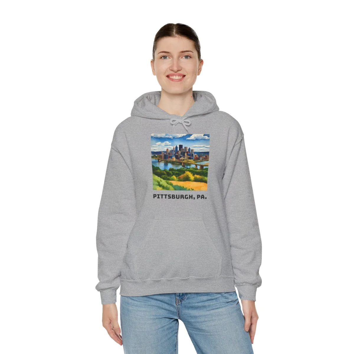This hoodie is designed with a watercolor image of the skyline of downtown Pittsburgh, Pennsylvania on a beautiful day. This unisex heavy blend hoodie is relaxation itself. Made with a thick blend of cotton and polyester, it feels plush, soft and warm, a perfect choice for any cold day. The image and lettering are on both sides. In the front, the spacious kangaroo pocket adds daily practicality while the hood's drawstring is the same color as the base sweater for extra style points.