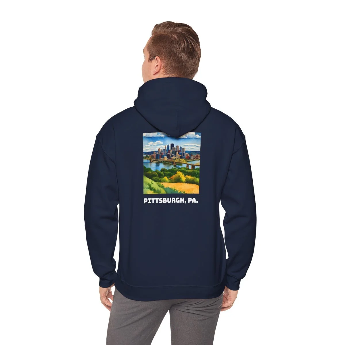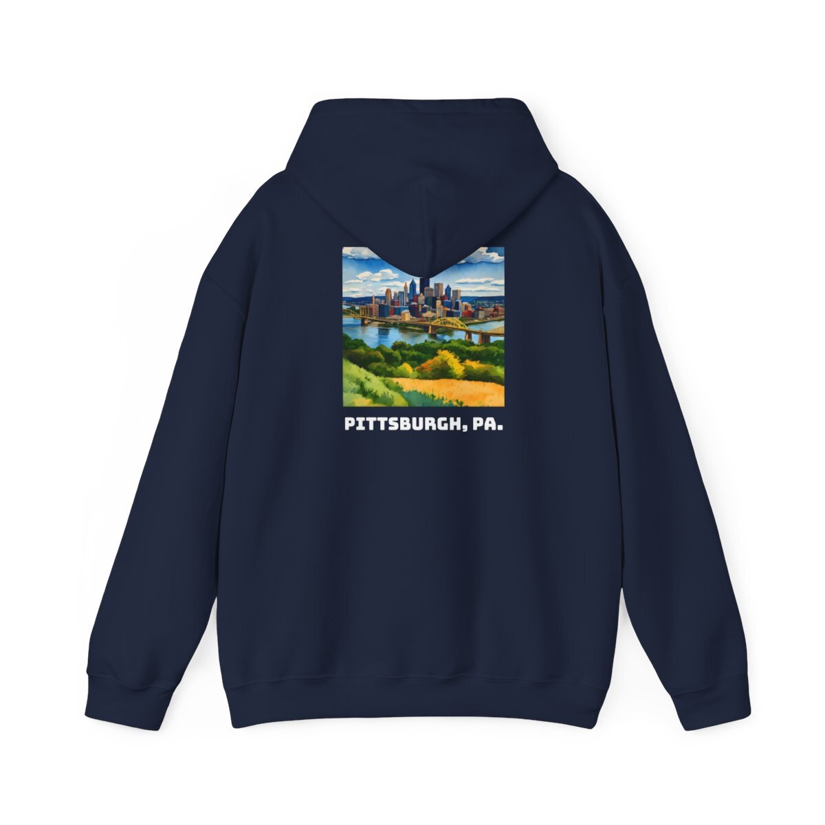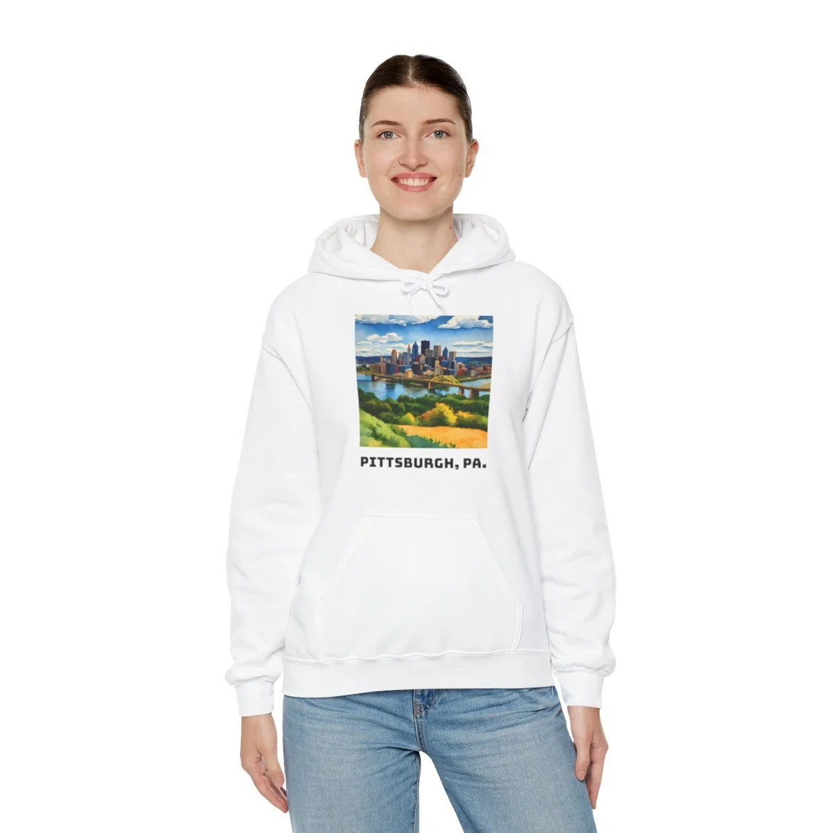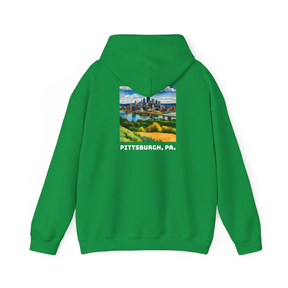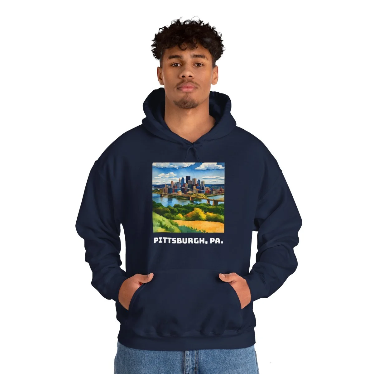 This hoodie is designed with a watercolor image of the skyline of downtown Pittsburgh, Pennsylvania on a beautiful day. This unisex heavy blend hoodie is relaxation itself. Made with a thick blend of cotton and polyester, it feels plush, soft and warm, a perfect choice for any cold day. The image and lettering are on both sides. In the front, the spacious kangaroo pocket adds daily practicality while the hood's drawstring is the same color as the base sweater for extra style points.
