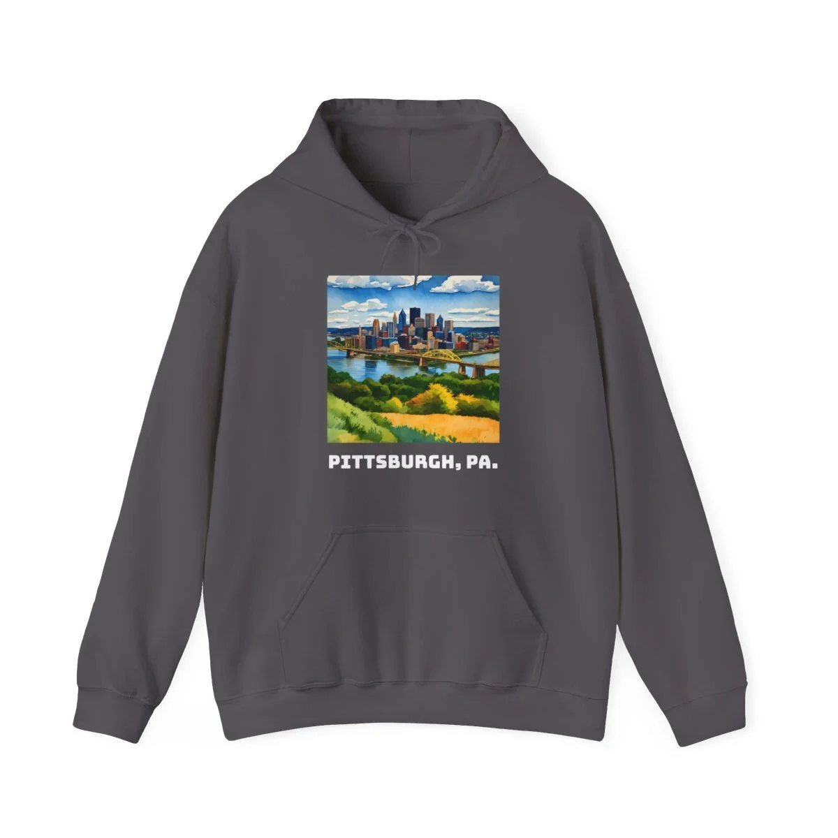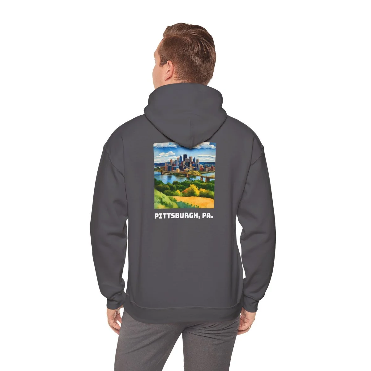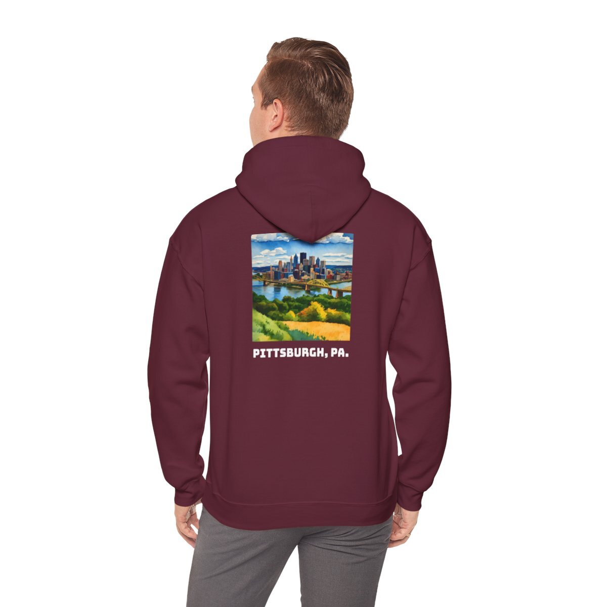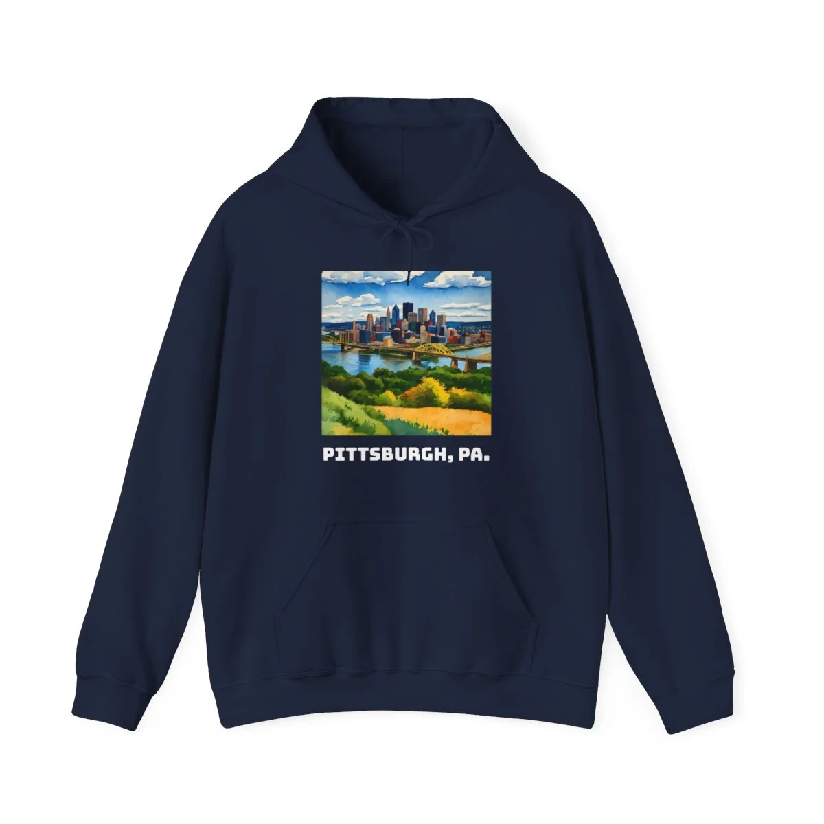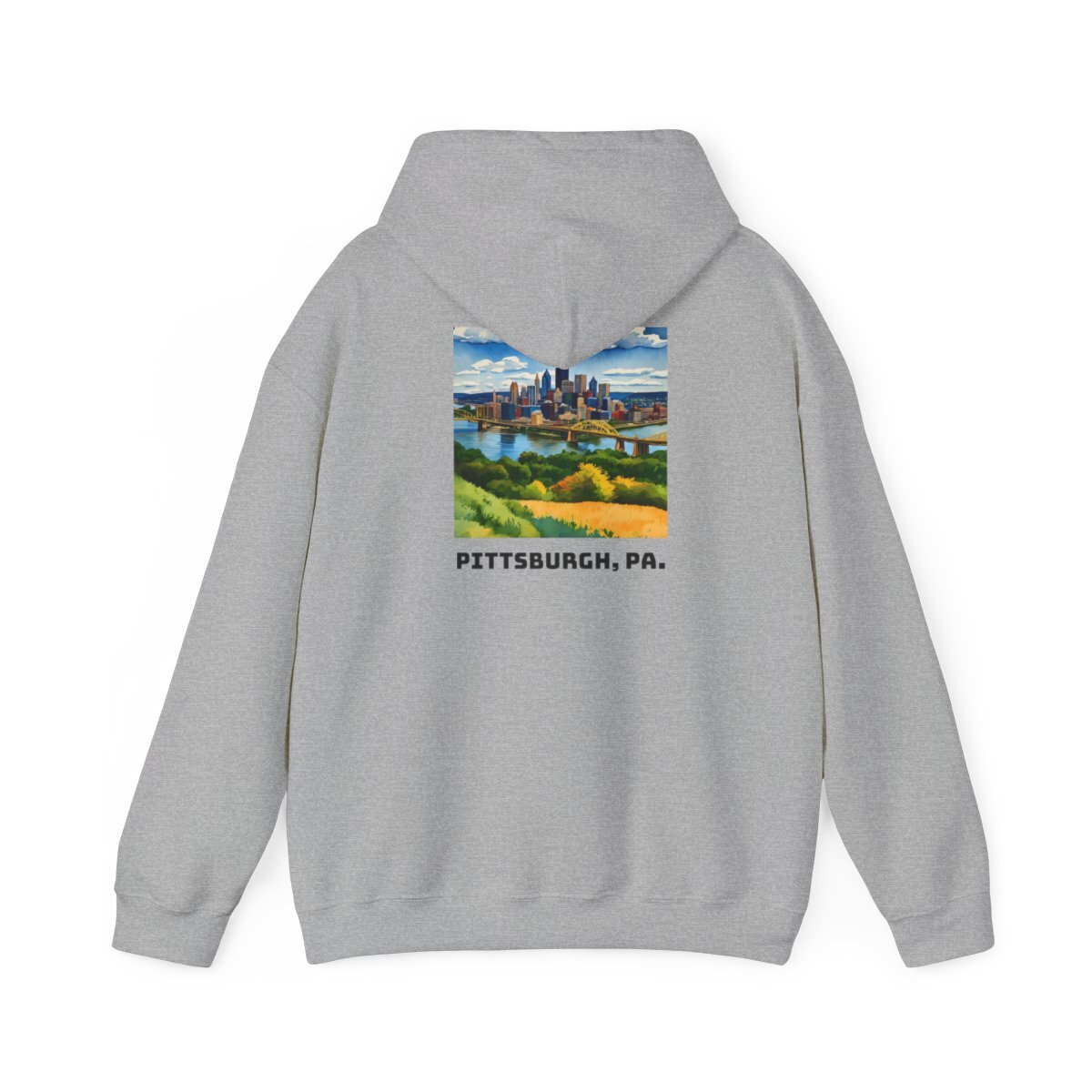 This hoodie is designed with a watercolor image of the skyline of downtown Pittsburgh, Pennsylvania on a beautiful day. This unisex heavy blend hoodie is relaxation itself. Made with a thick blend of cotton and polyester, it feels plush, soft and warm, a perfect choice for any cold day. The image and lettering are on both sides. In the front, the spacious kangaroo pocket adds daily practicality while the hood's drawstring is the same color as the base sweater for extra style points.
