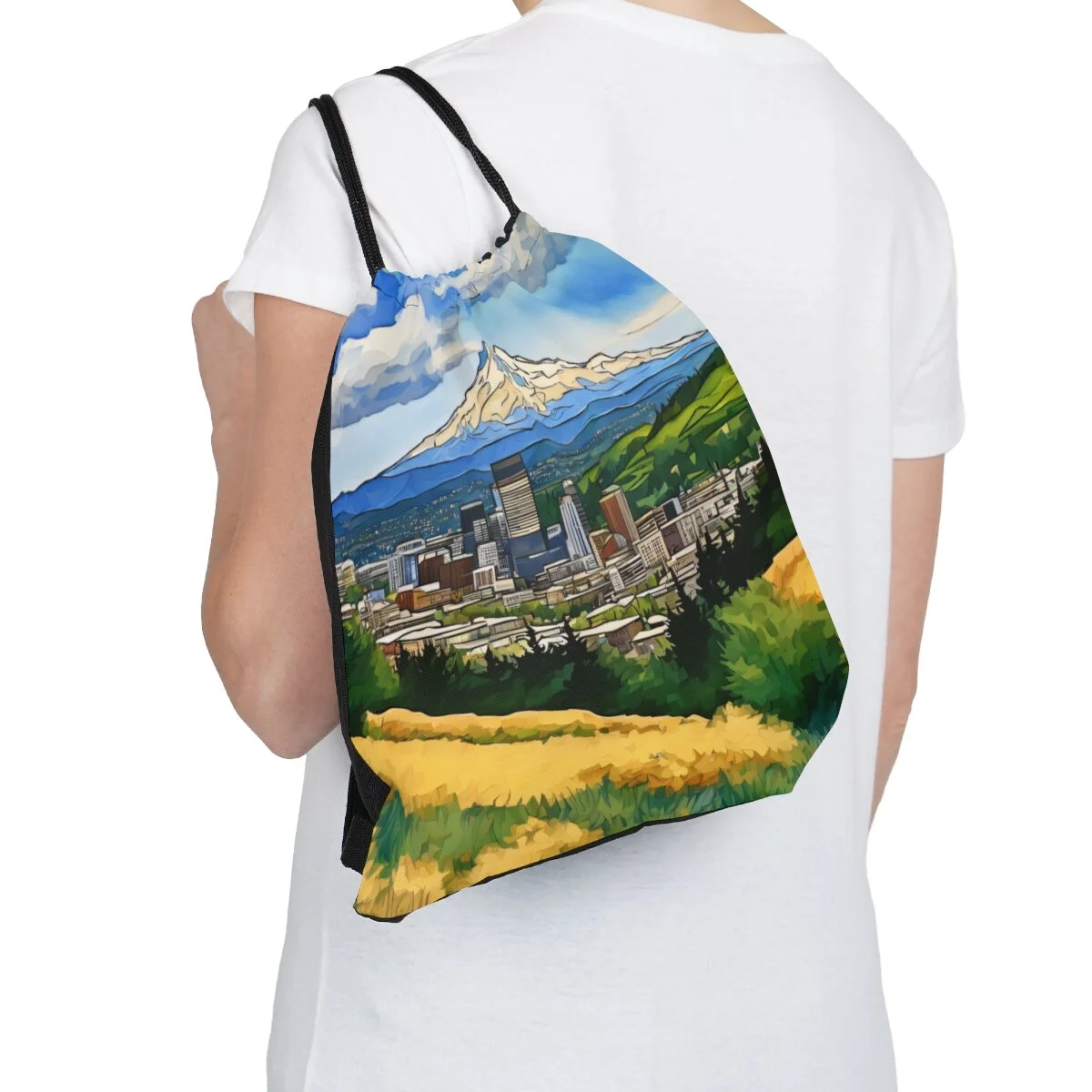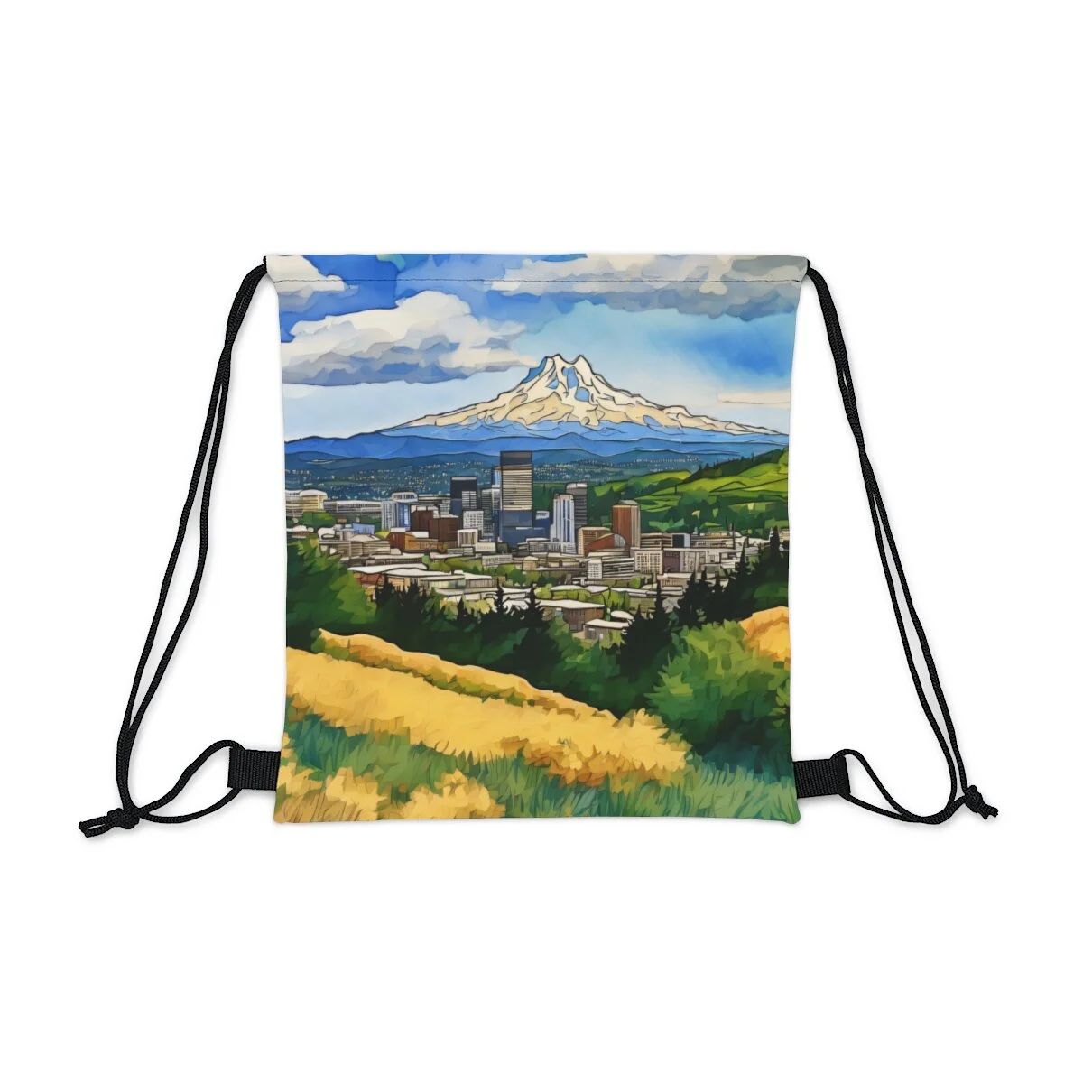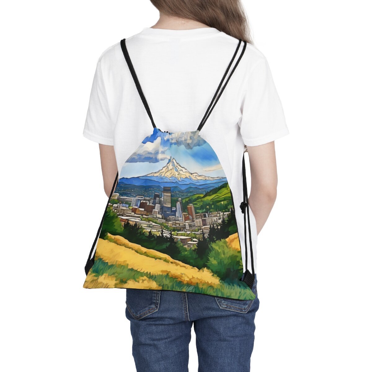 This drawstring bag is here to become a daily go-to choice that is both stylish and practical. This bag is designed with a watercolor image of the Portland, Oregon skyline nestled in the Willamette Valley, with Mount Hood in the background. It’s a great combination of beautiful scenery and vibrant colors. On top of good looks, the broadcloth fabric makes each bag supremely soft to the touch.