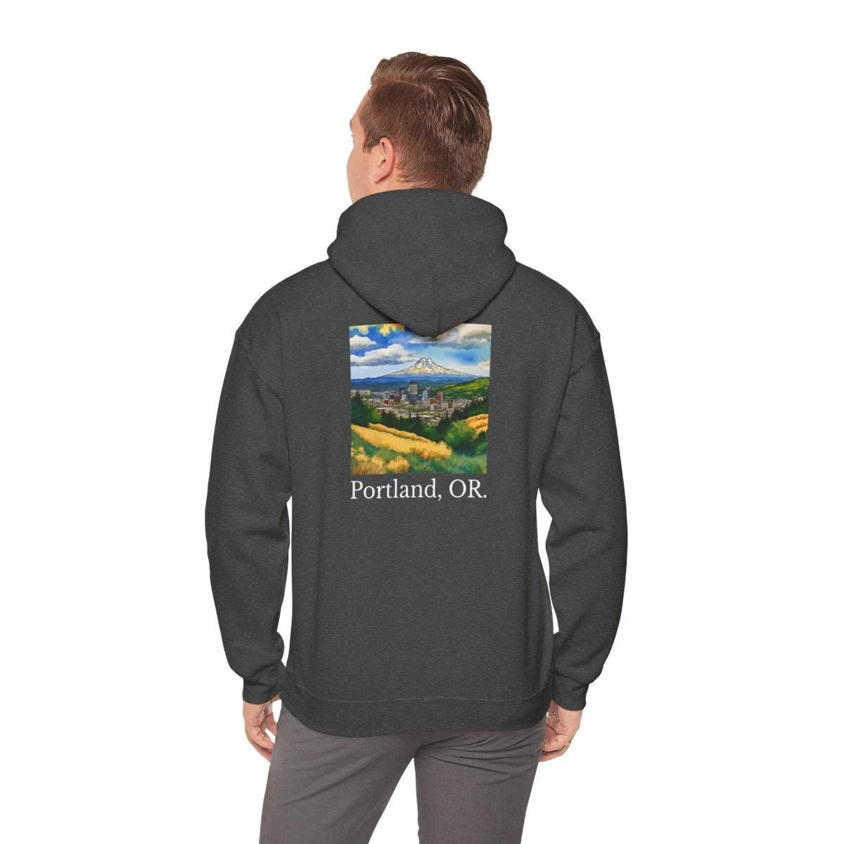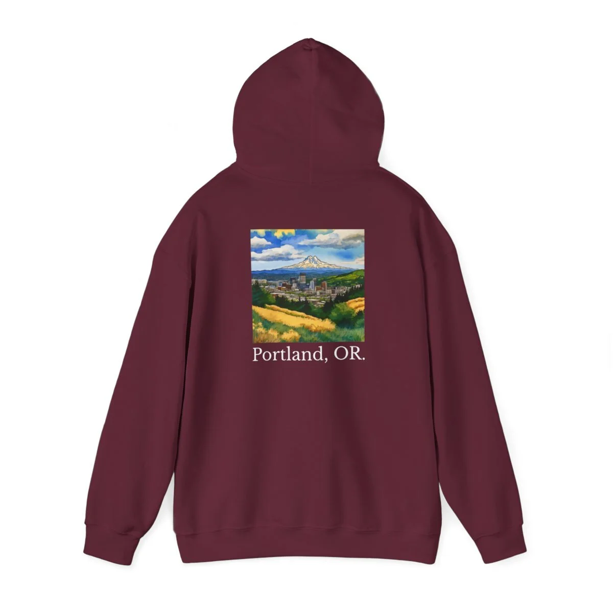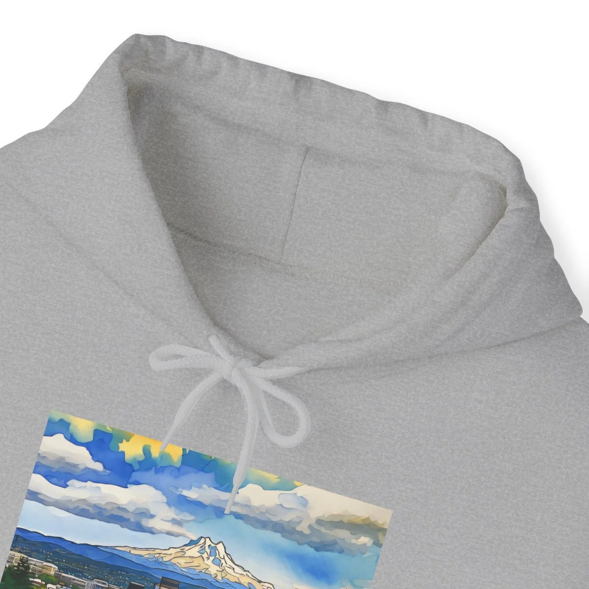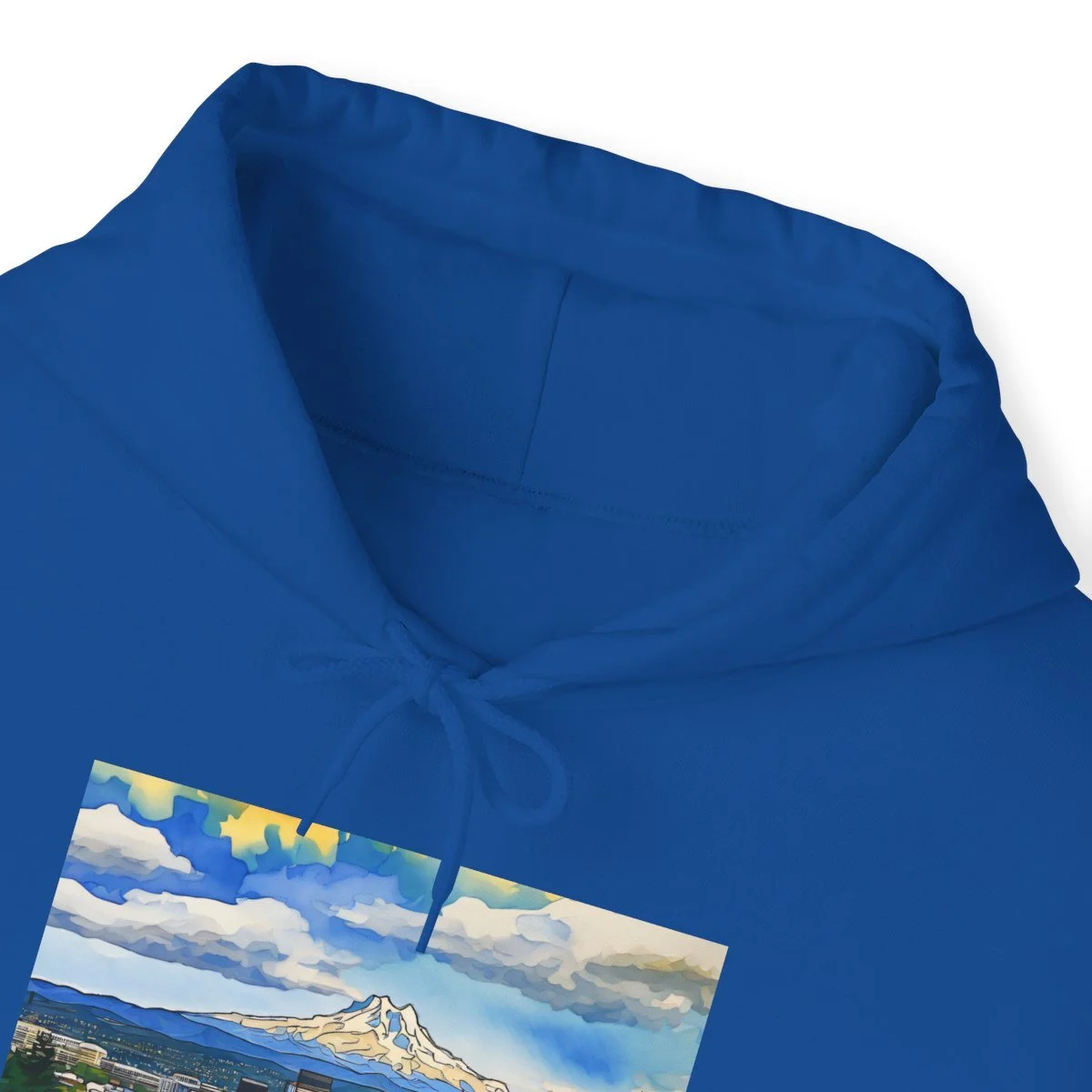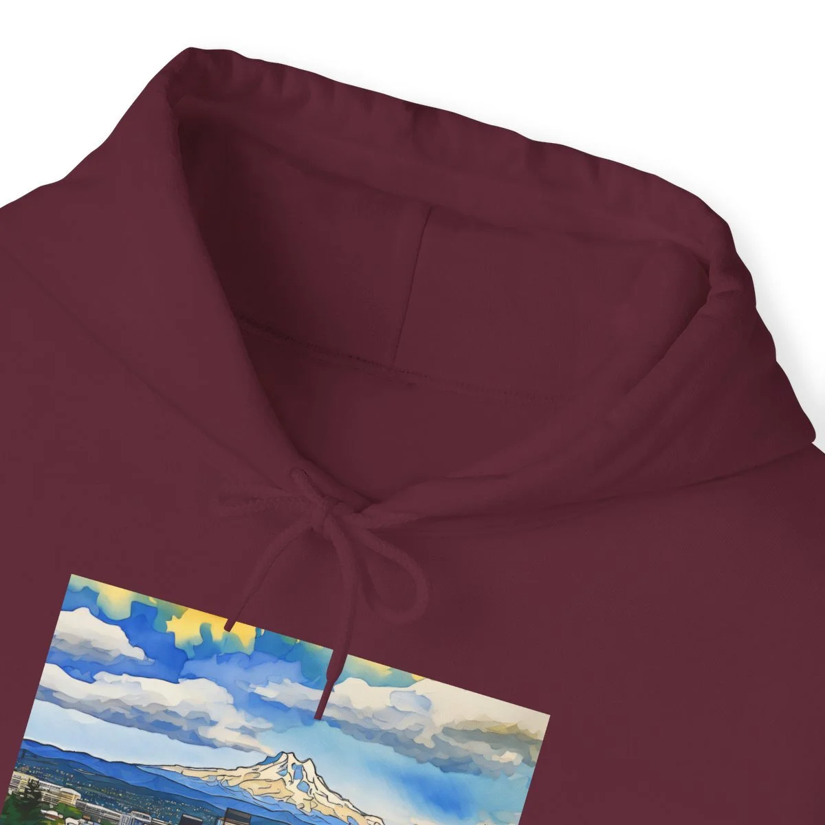 This hoodie is designed with a watercolor image of the Portland, Oregon skyline nestled in the Willamette Valley, with Mount Hood in the background. This unisex heavy blend hooded sweatshirt is relaxation itself. Made with a thick blend of cotton and polyester, it feels plush, soft and warm, a perfect choice for any cold day. The image and lettering are on both sides. In the front, the spacious kangaroo pocket adds daily practicality while the hood's drawstring is the same color as the base sweater for extra style points.