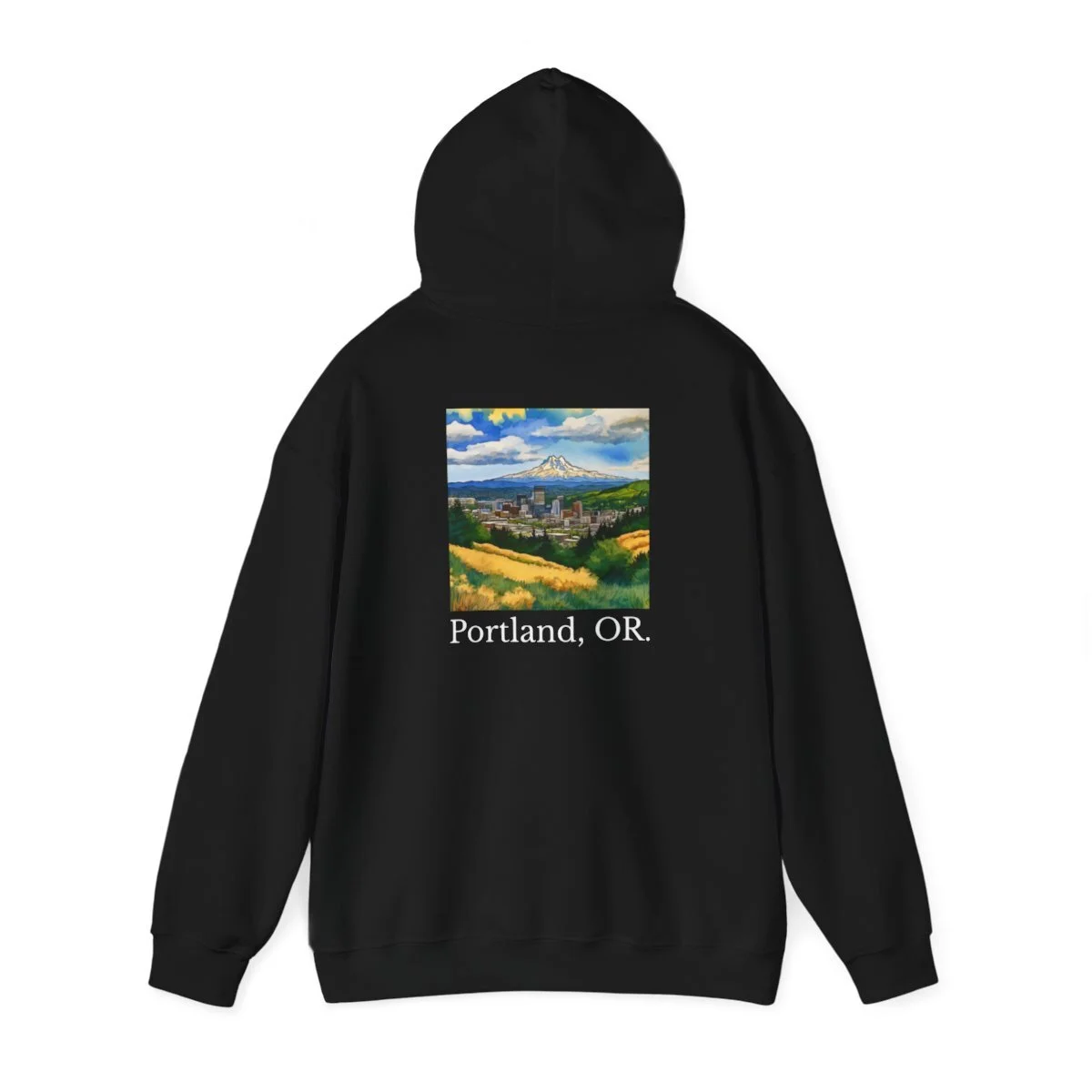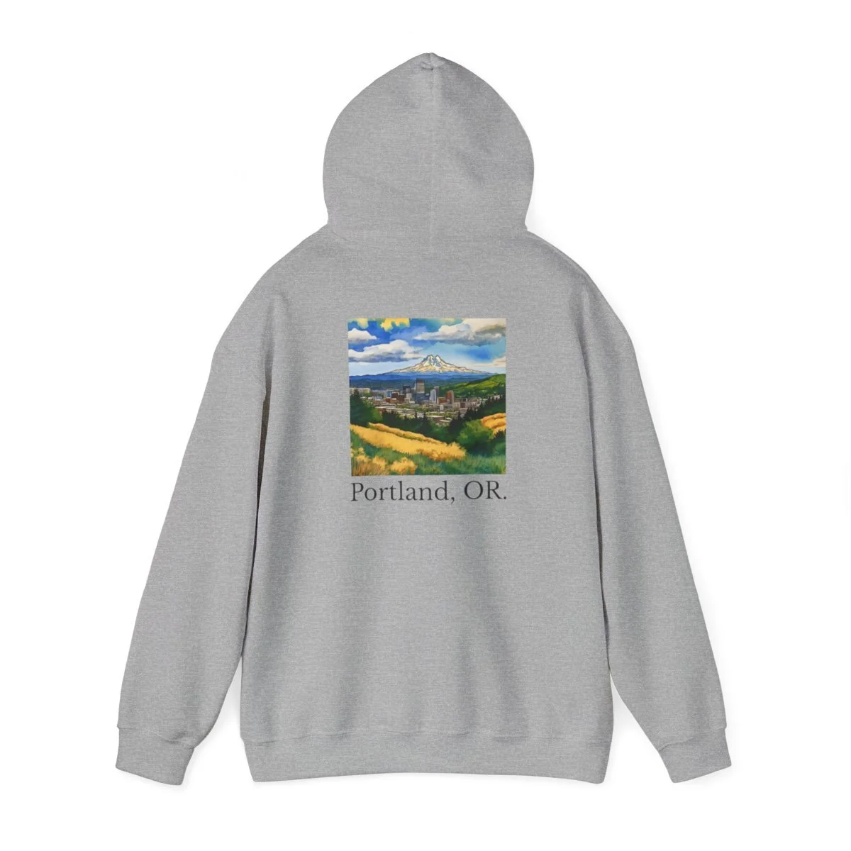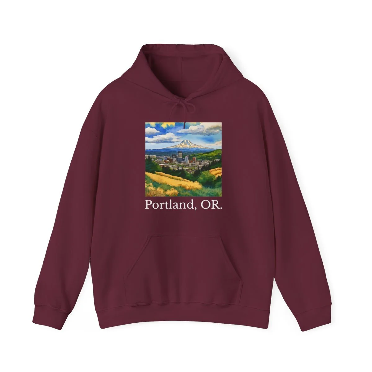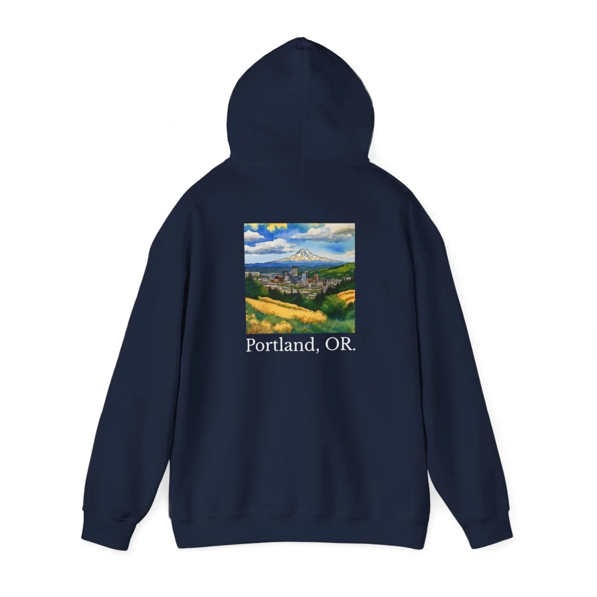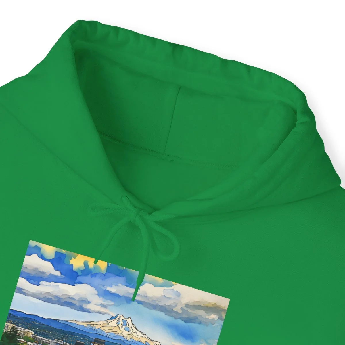 This hoodie is designed with a watercolor image of the Portland, Oregon skyline nestled in the Willamette Valley, with Mount Hood in the background. This unisex heavy blend hooded sweatshirt is relaxation itself. Made with a thick blend of cotton and polyester, it feels plush, soft and warm, a perfect choice for any cold day. The image and lettering are on both sides. In the front, the spacious kangaroo pocket adds daily practicality while the hood's drawstring is the same color as the base sweater for extra style points.