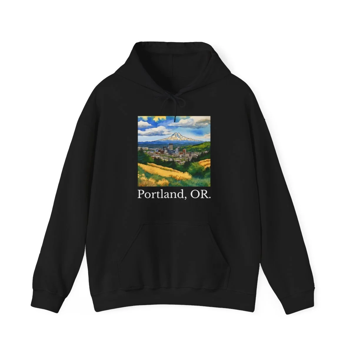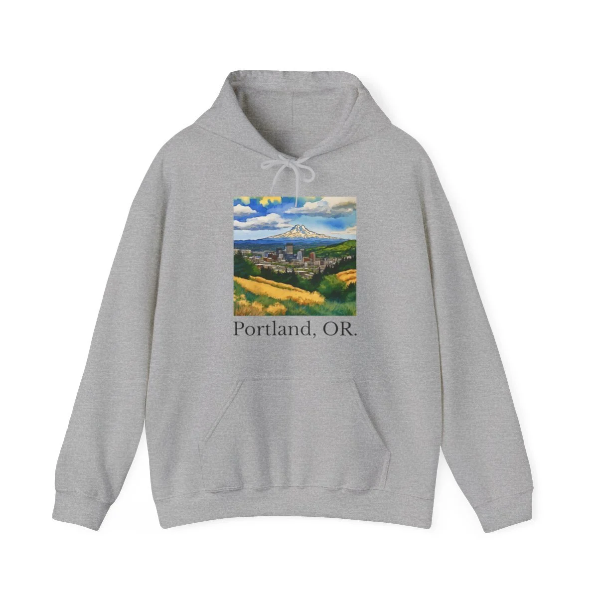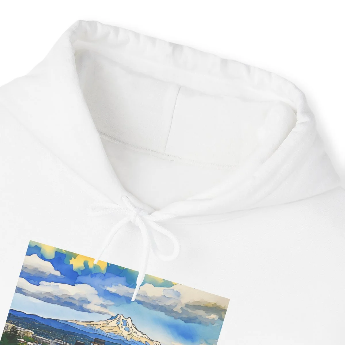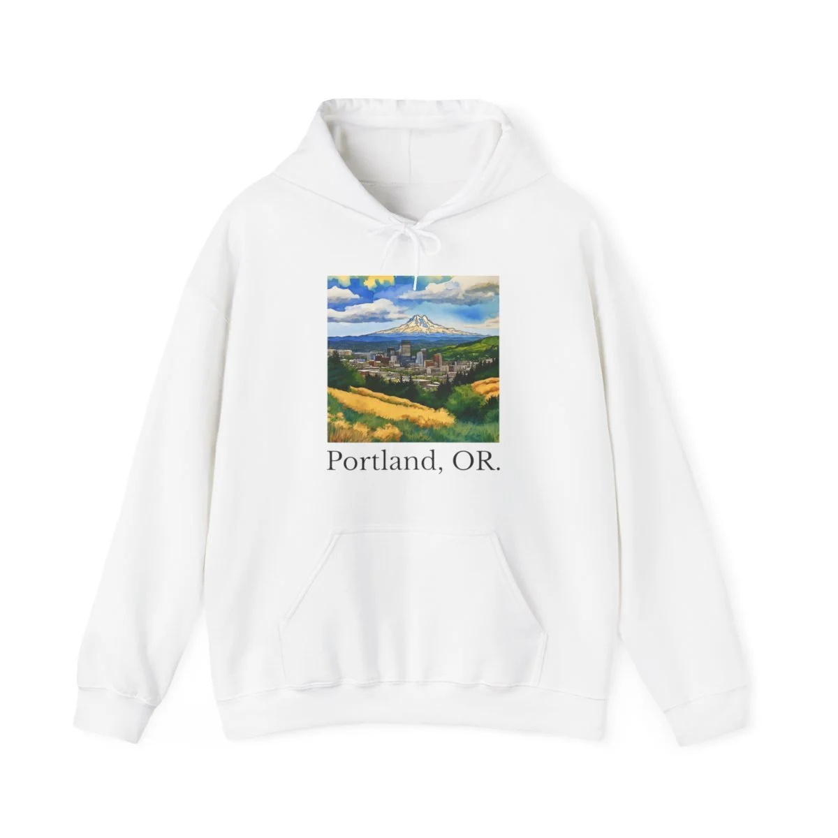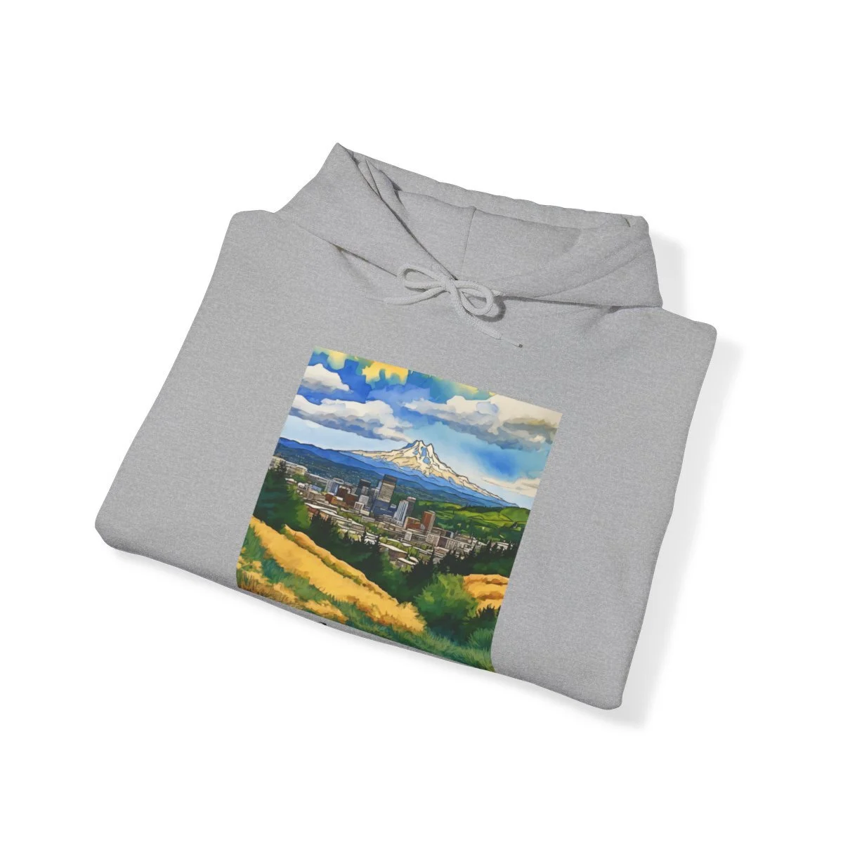 This hoodie is designed with a watercolor image of the Portland, Oregon skyline nestled in the Willamette Valley, with Mount Hood in the background. This unisex heavy blend hooded sweatshirt is relaxation itself. Made with a thick blend of cotton and polyester, it feels plush, soft and warm, a perfect choice for any cold day. The image and lettering are on both sides. In the front, the spacious kangaroo pocket adds daily practicality while the hood's drawstring is the same color as the base sweater for extra style points.
