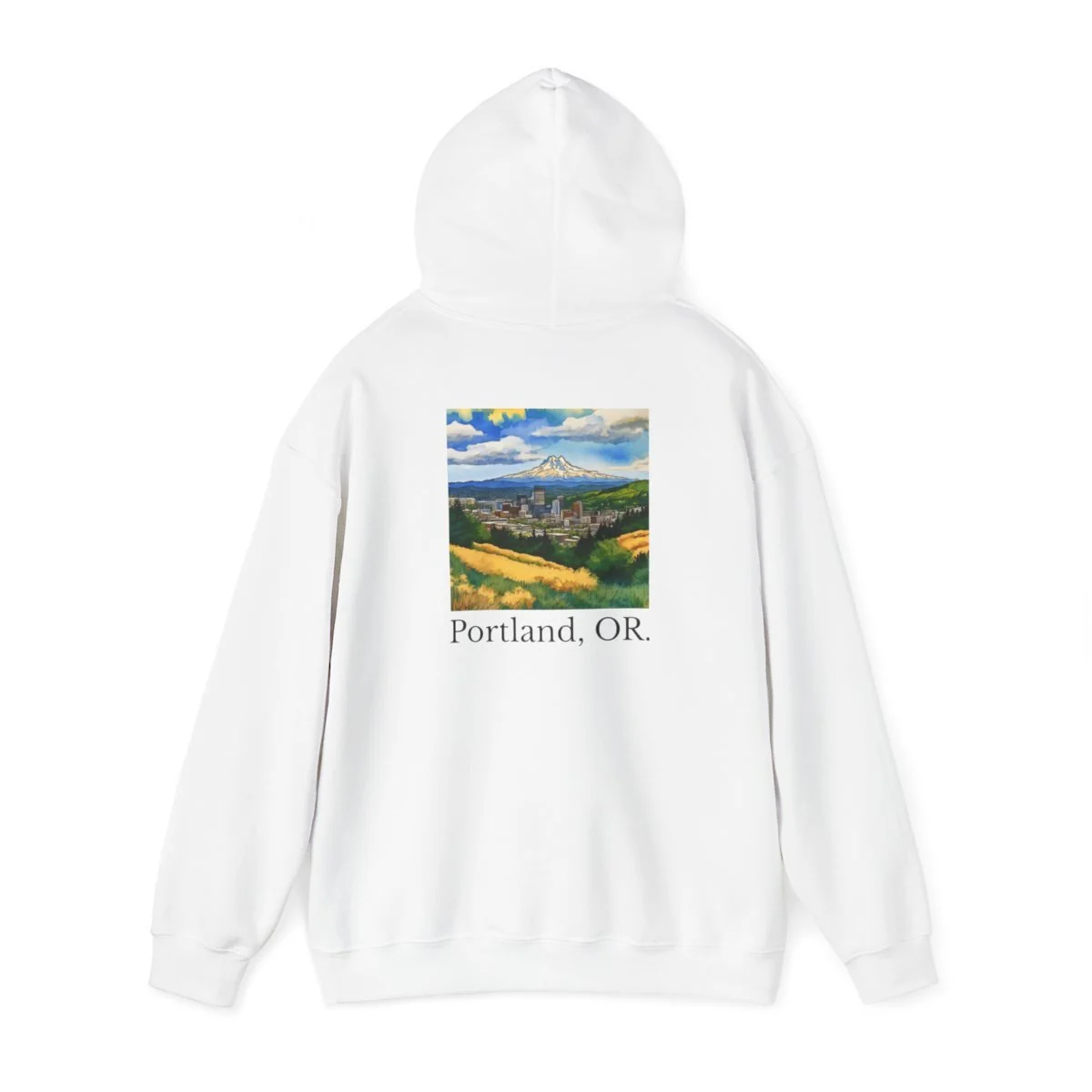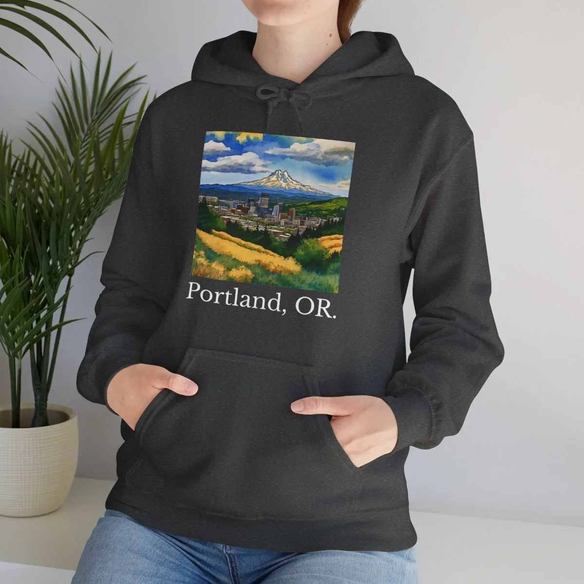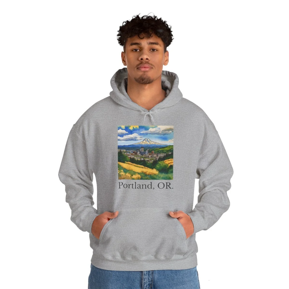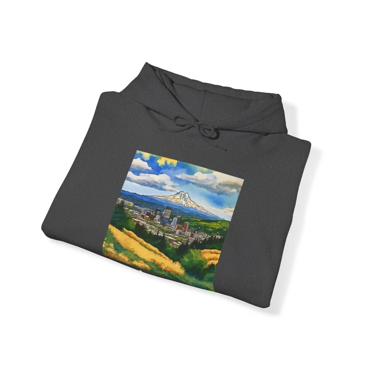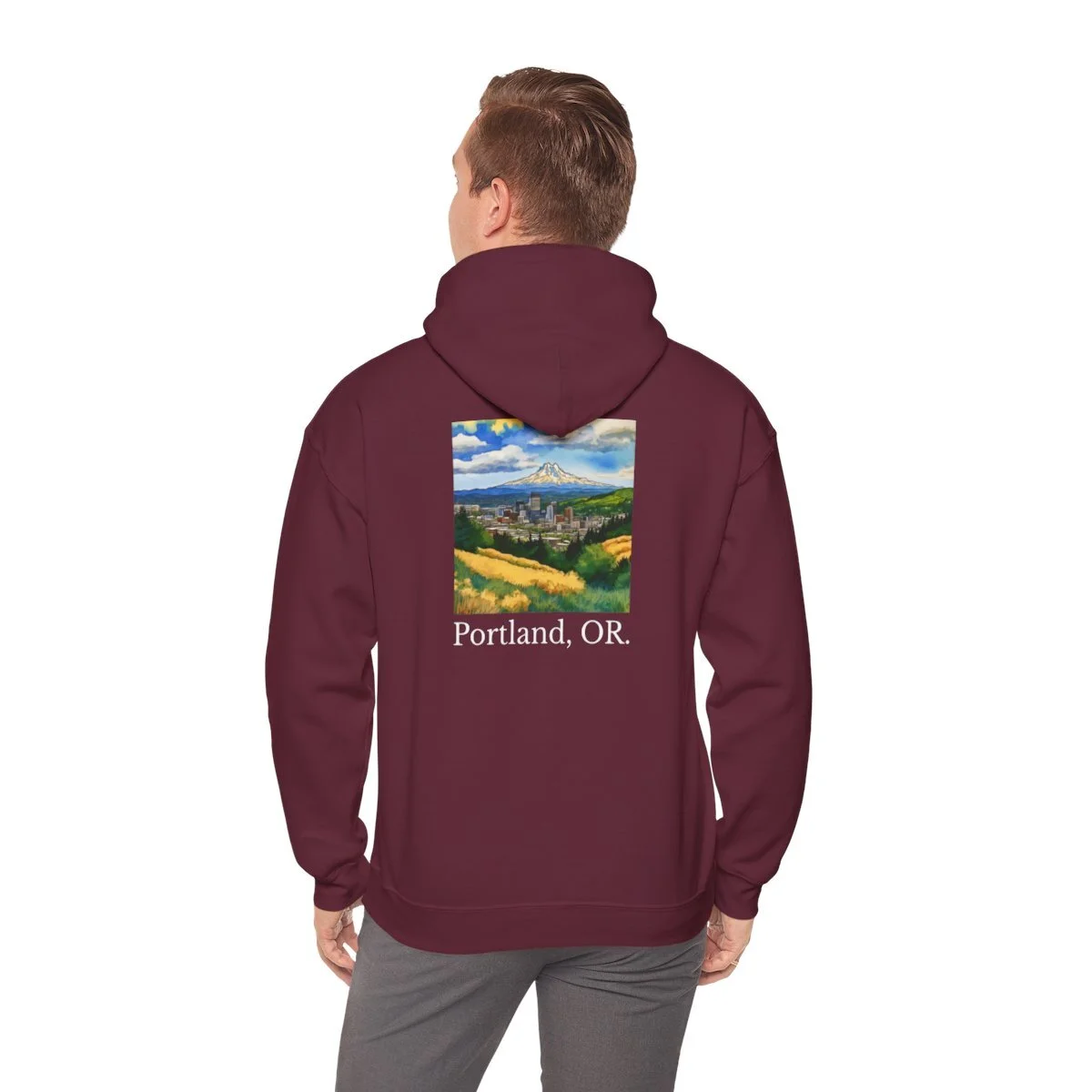 This hoodie is designed with a watercolor image of the Portland, Oregon skyline nestled in the Willamette Valley, with Mount Hood in the background. This unisex heavy blend hooded sweatshirt is relaxation itself. Made with a thick blend of cotton and polyester, it feels plush, soft and warm, a perfect choice for any cold day. The image and lettering are on both sides. In the front, the spacious kangaroo pocket adds daily practicality while the hood's drawstring is the same color as the base sweater for extra style points.