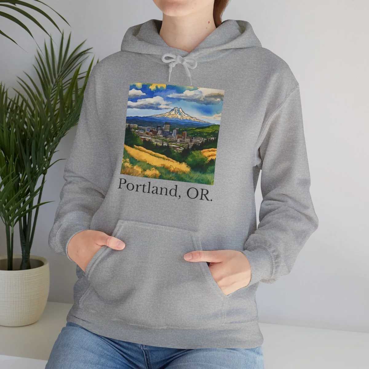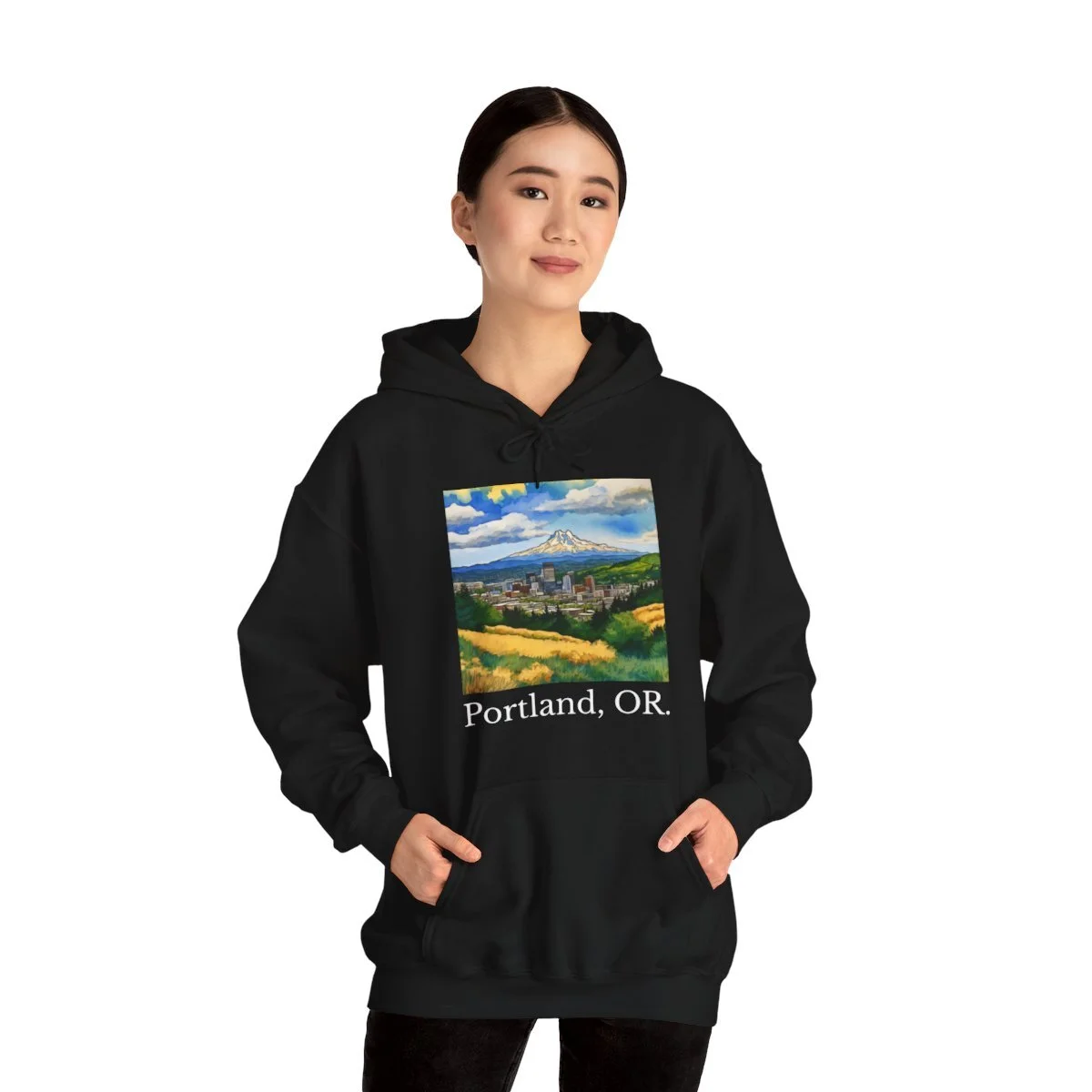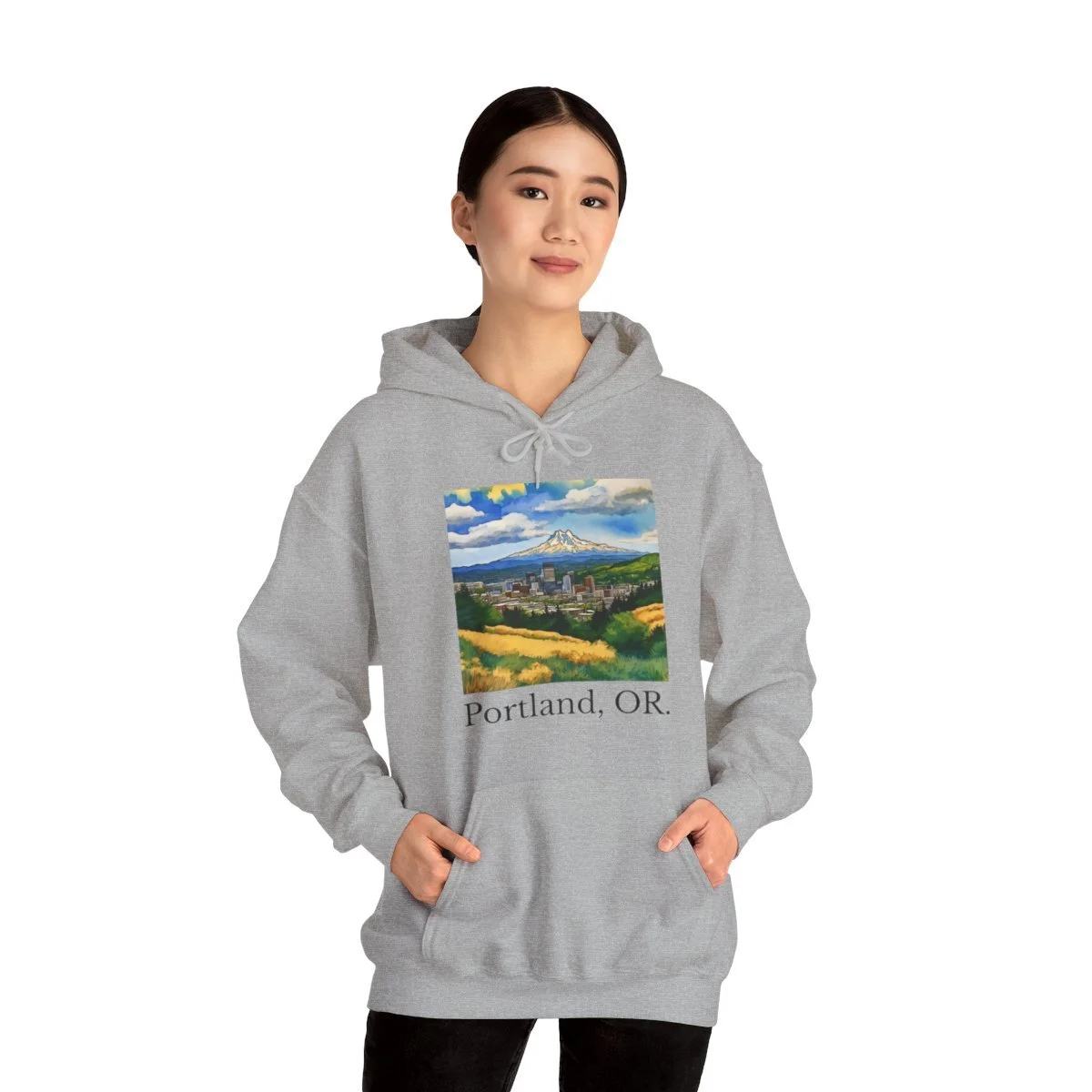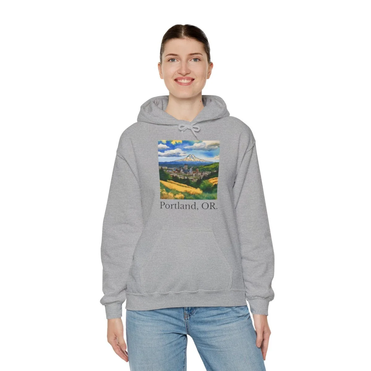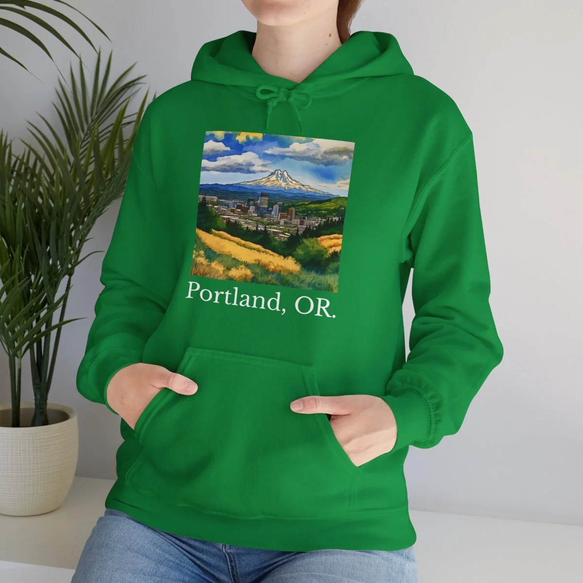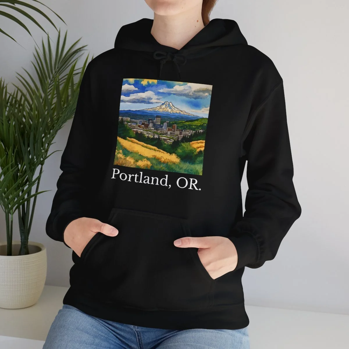This hoodie is designed with a watercolor image of the Portland, Oregon skyline nestled in the Willamette Valley, with Mount Hood in the background. This unisex heavy blend hooded sweatshirt is relaxation itself. Made with a thick blend of cotton and polyester, it feels plush, soft and warm, a perfect choice for any cold day. The image and lettering are on both sides. In the front, the spacious kangaroo pocket adds daily practicality while the hood's drawstring is the same color as the base sweater for extra style points.