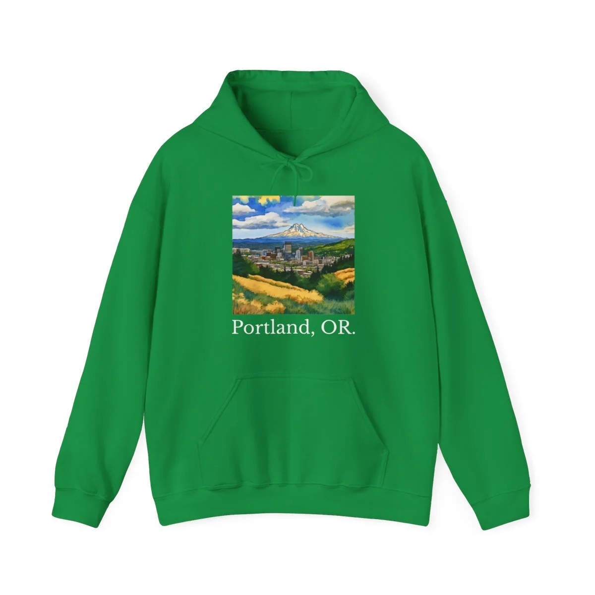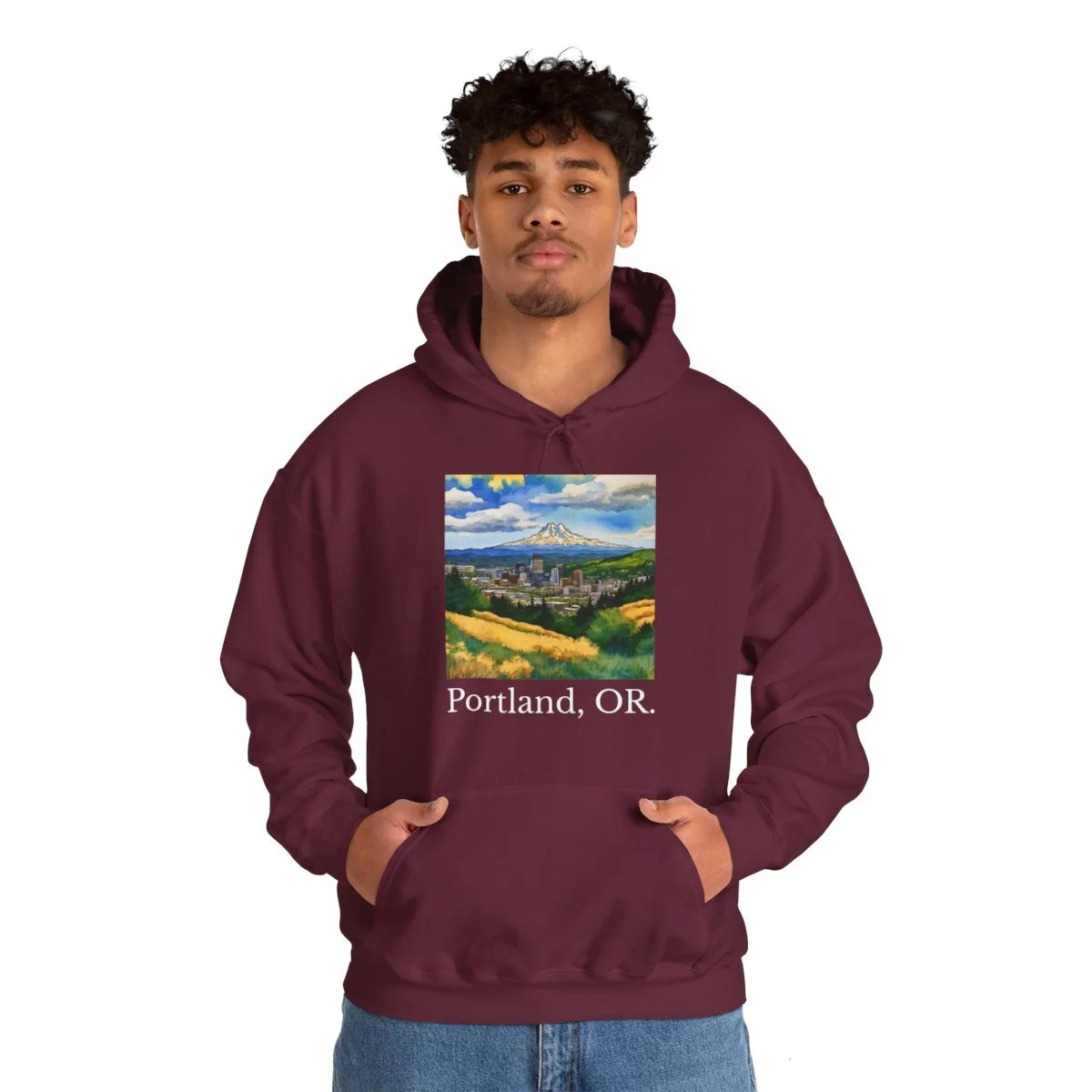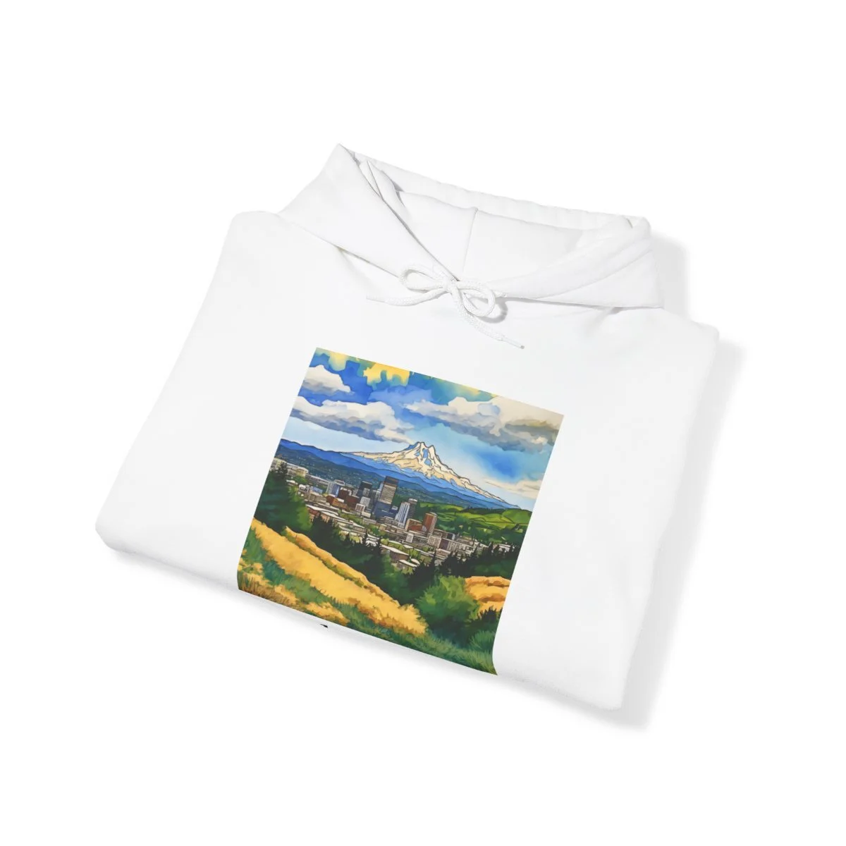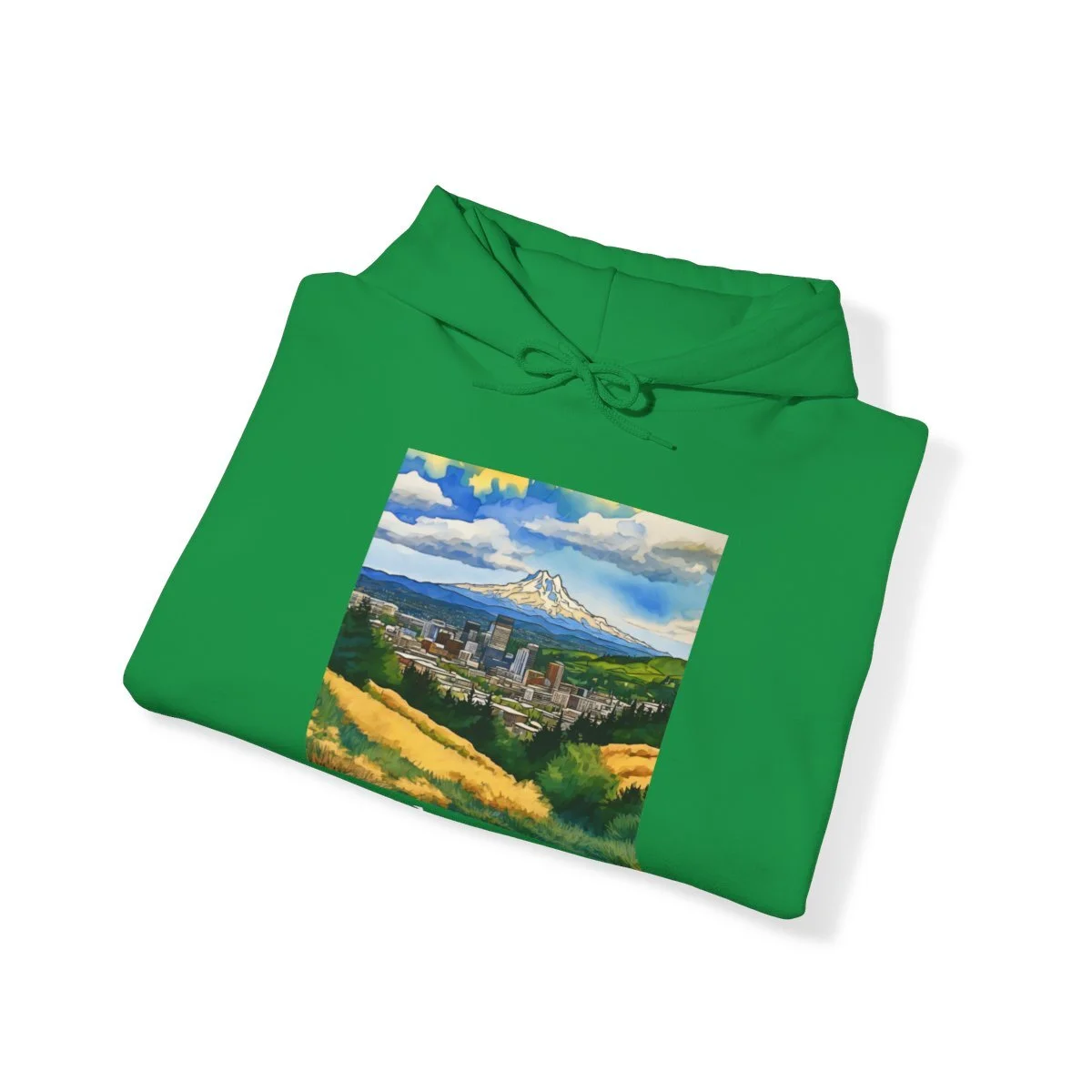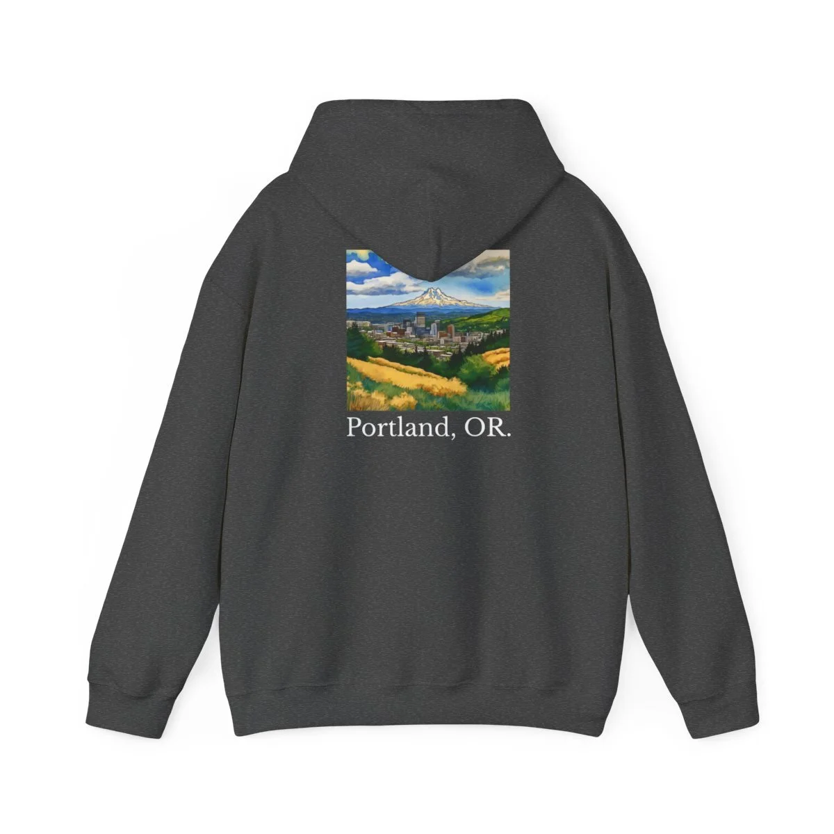 This hoodie is designed with a watercolor image of the Portland, Oregon skyline nestled in the Willamette Valley, with Mount Hood in the background. This unisex heavy blend hooded sweatshirt is relaxation itself. Made with a thick blend of cotton and polyester, it feels plush, soft and warm, a perfect choice for any cold day. The image and lettering are on both sides. In the front, the spacious kangaroo pocket adds daily practicality while the hood's drawstring is the same color as the base sweater for extra style points.