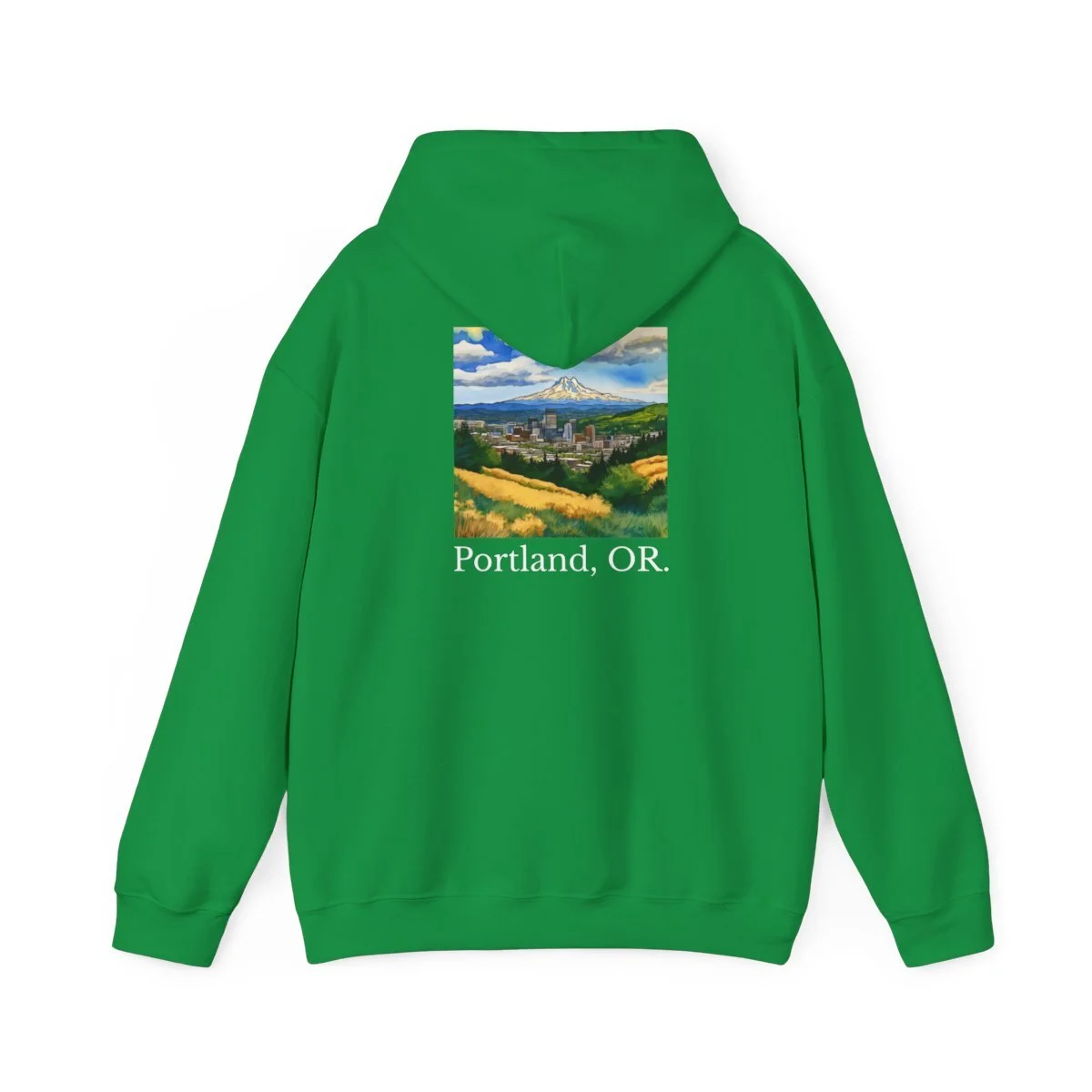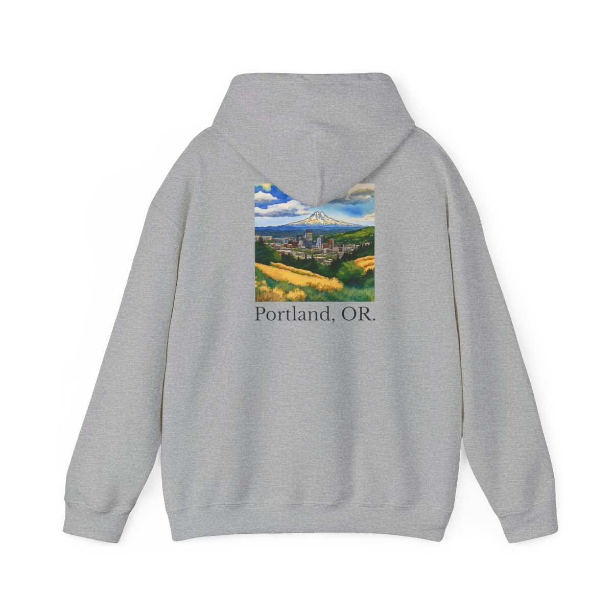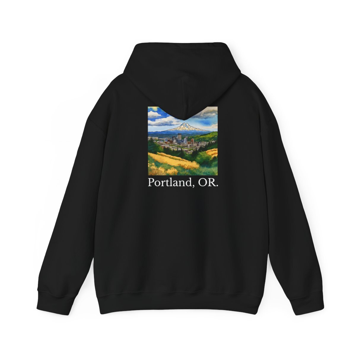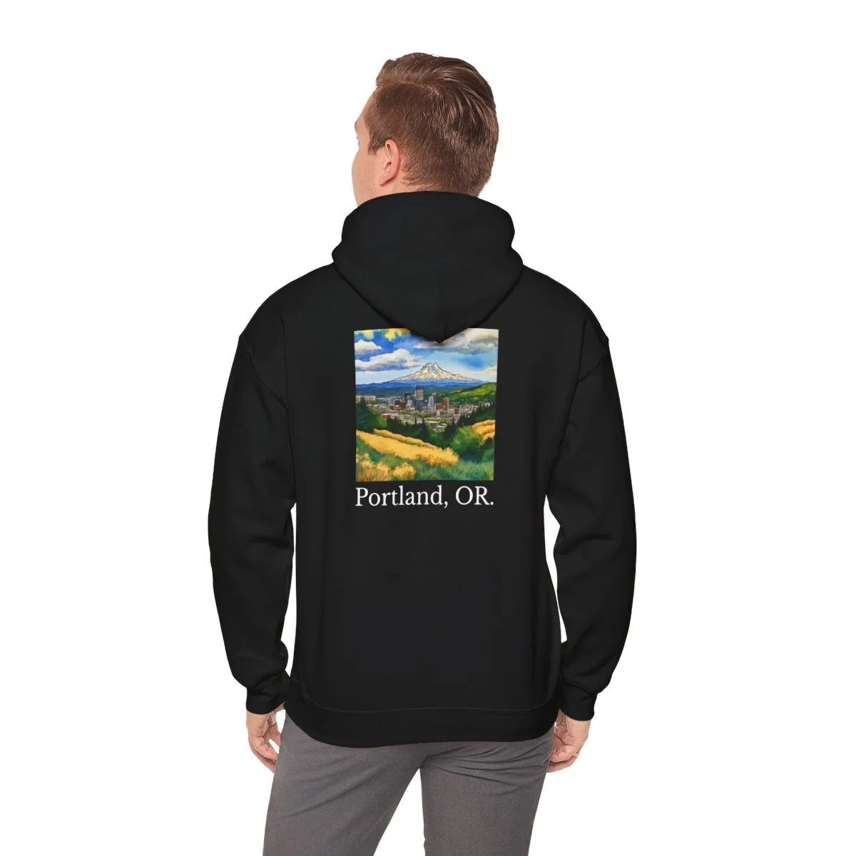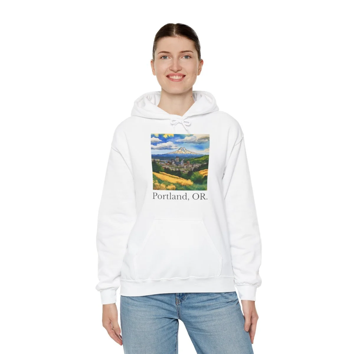 This hoodie is designed with a watercolor image of the Portland, Oregon skyline nestled in the Willamette Valley, with Mount Hood in the background. This unisex heavy blend hooded sweatshirt is relaxation itself. Made with a thick blend of cotton and polyester, it feels plush, soft and warm, a perfect choice for any cold day. The image and lettering are on both sides. In the front, the spacious kangaroo pocket adds daily practicality while the hood's drawstring is the same color as the base sweater for extra style points.