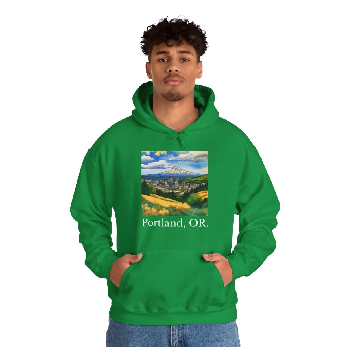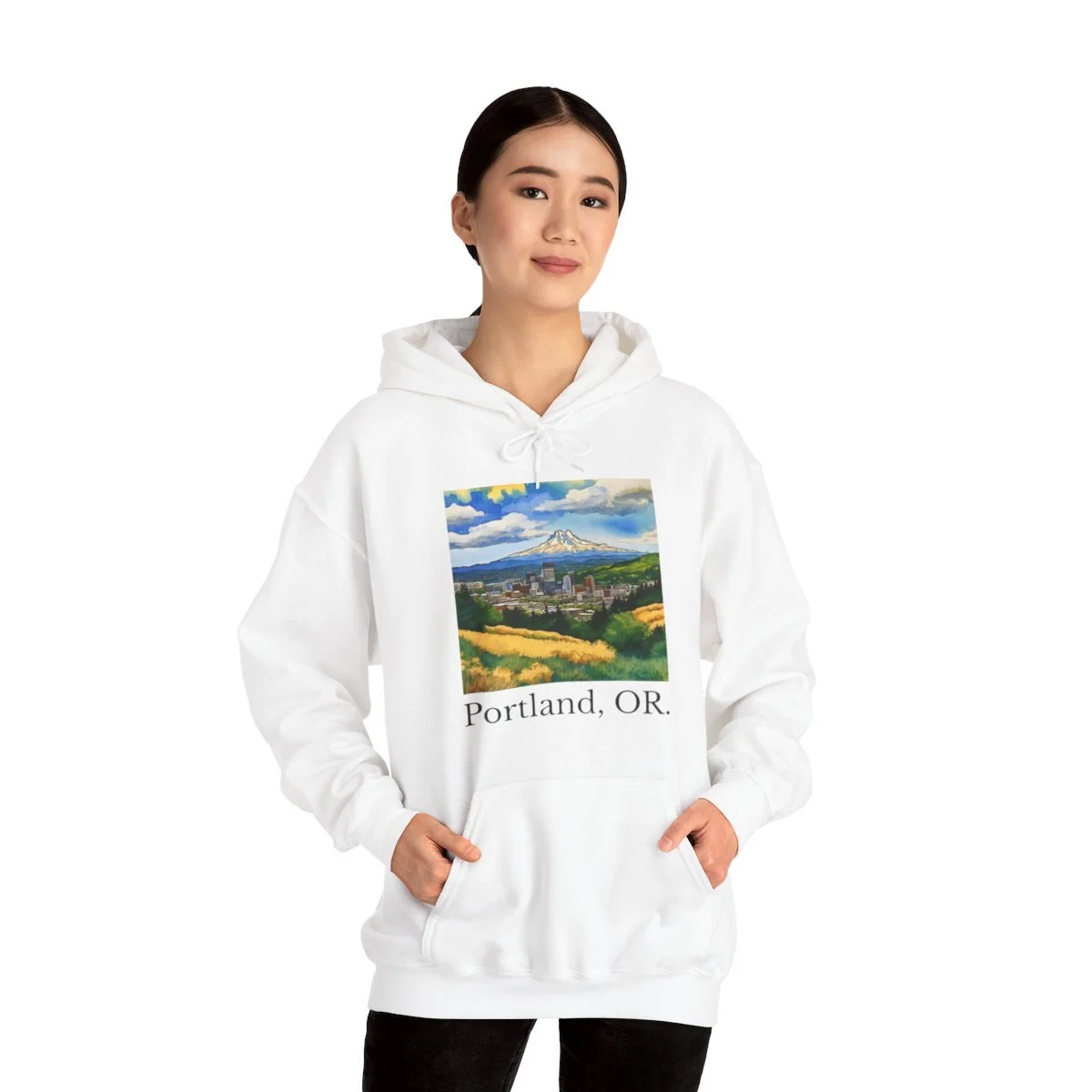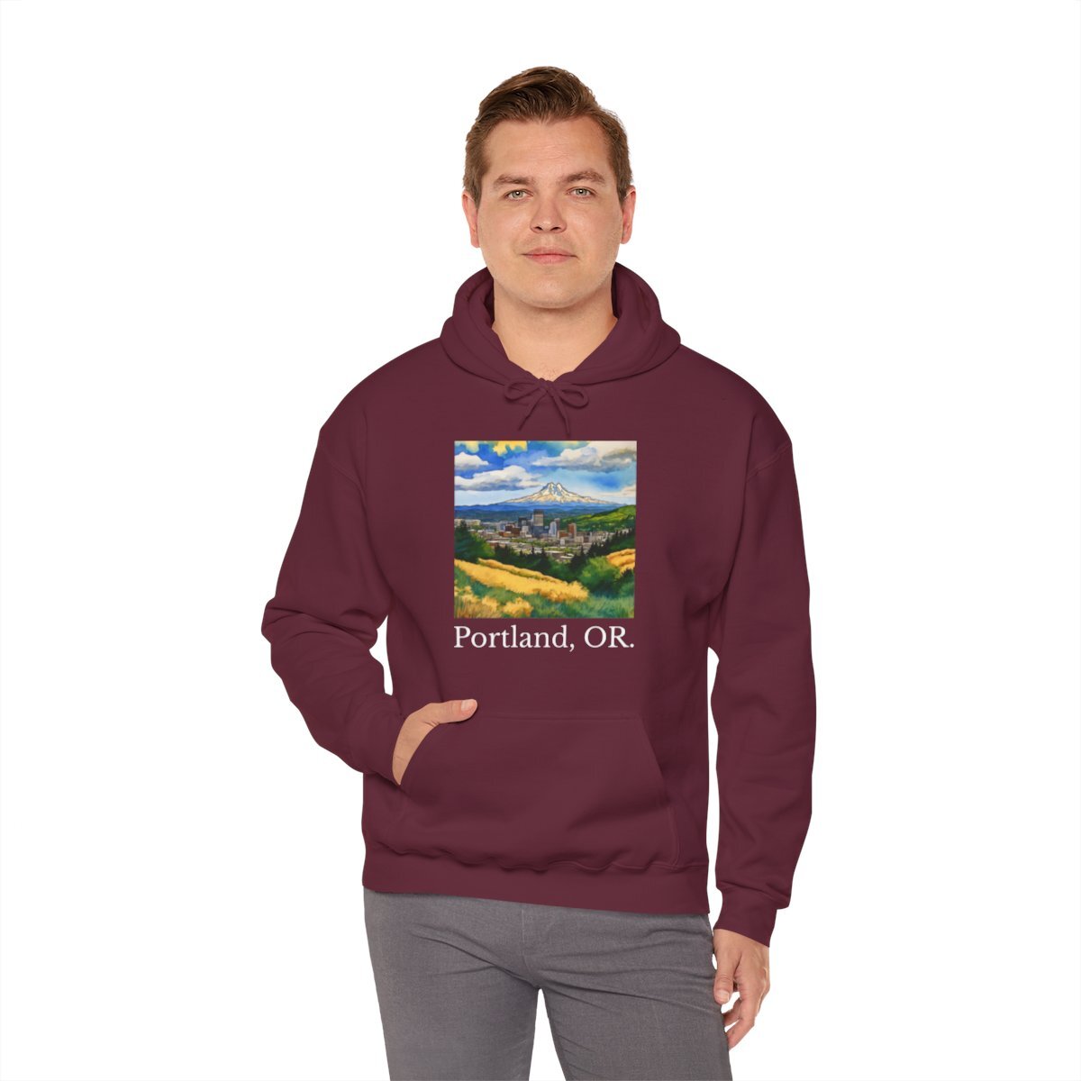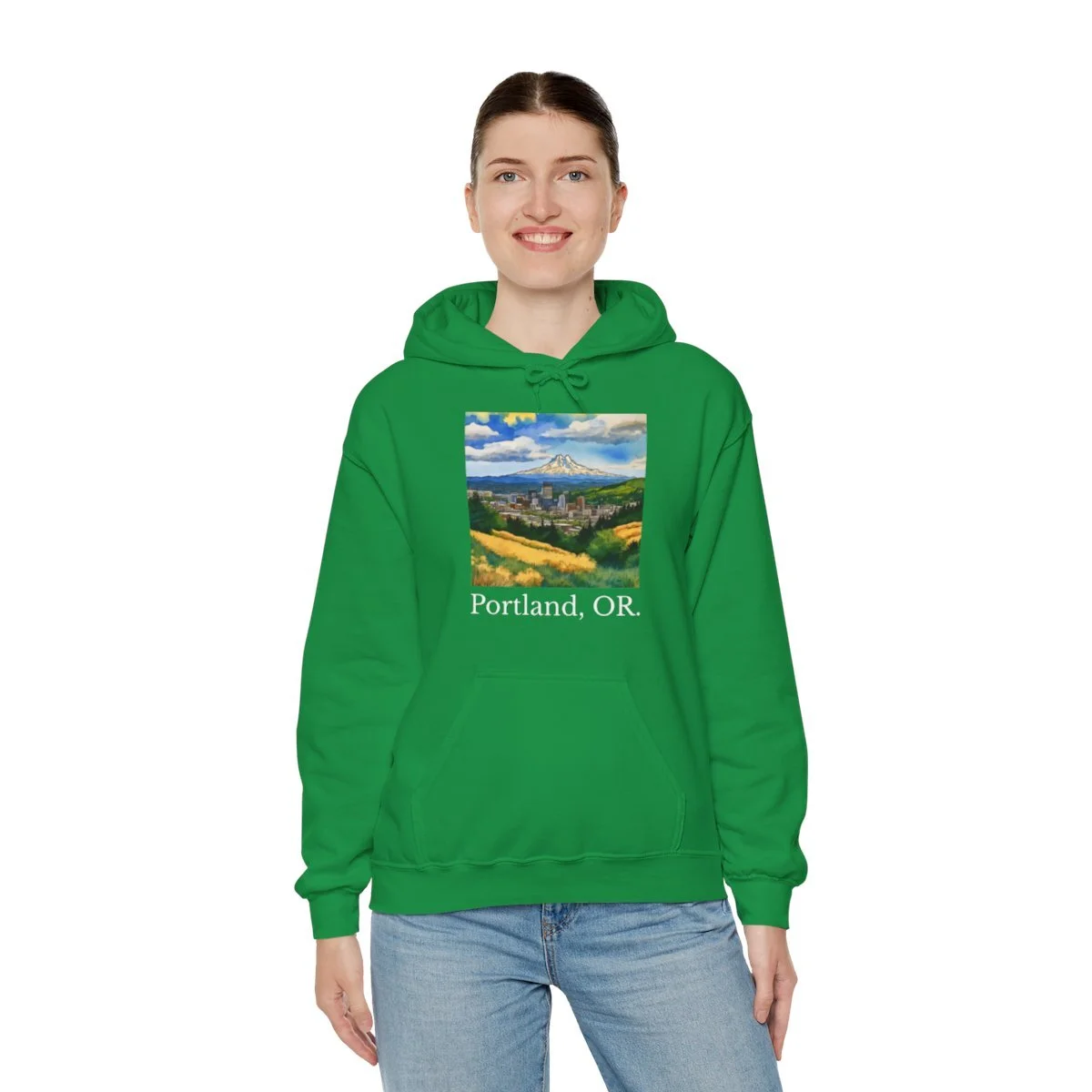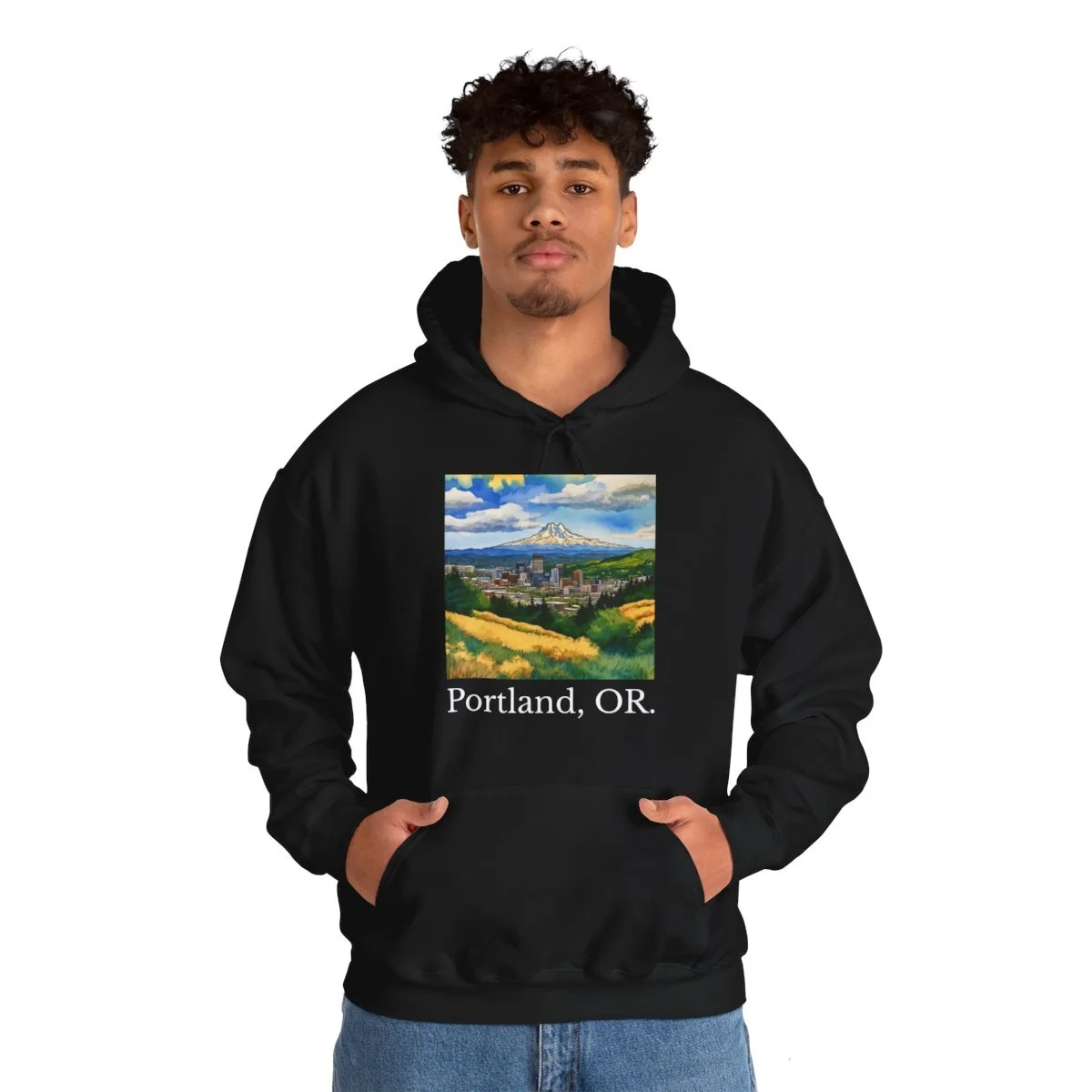 This hoodie is designed with a watercolor image of the Portland, Oregon skyline nestled in the Willamette Valley, with Mount Hood in the background. This unisex heavy blend hooded sweatshirt is relaxation itself. Made with a thick blend of cotton and polyester, it feels plush, soft and warm, a perfect choice for any cold day. The image and lettering are on both sides. In the front, the spacious kangaroo pocket adds daily practicality while the hood's drawstring is the same color as the base sweater for extra style points.