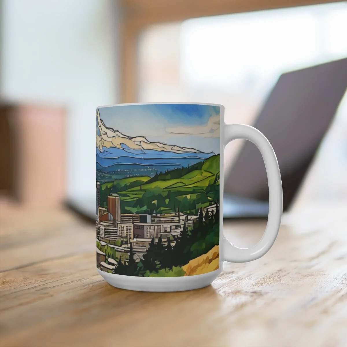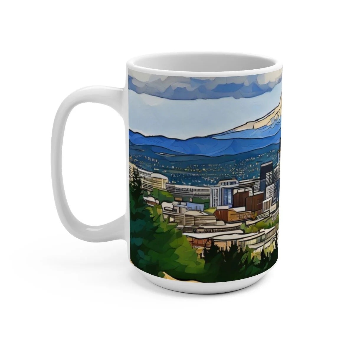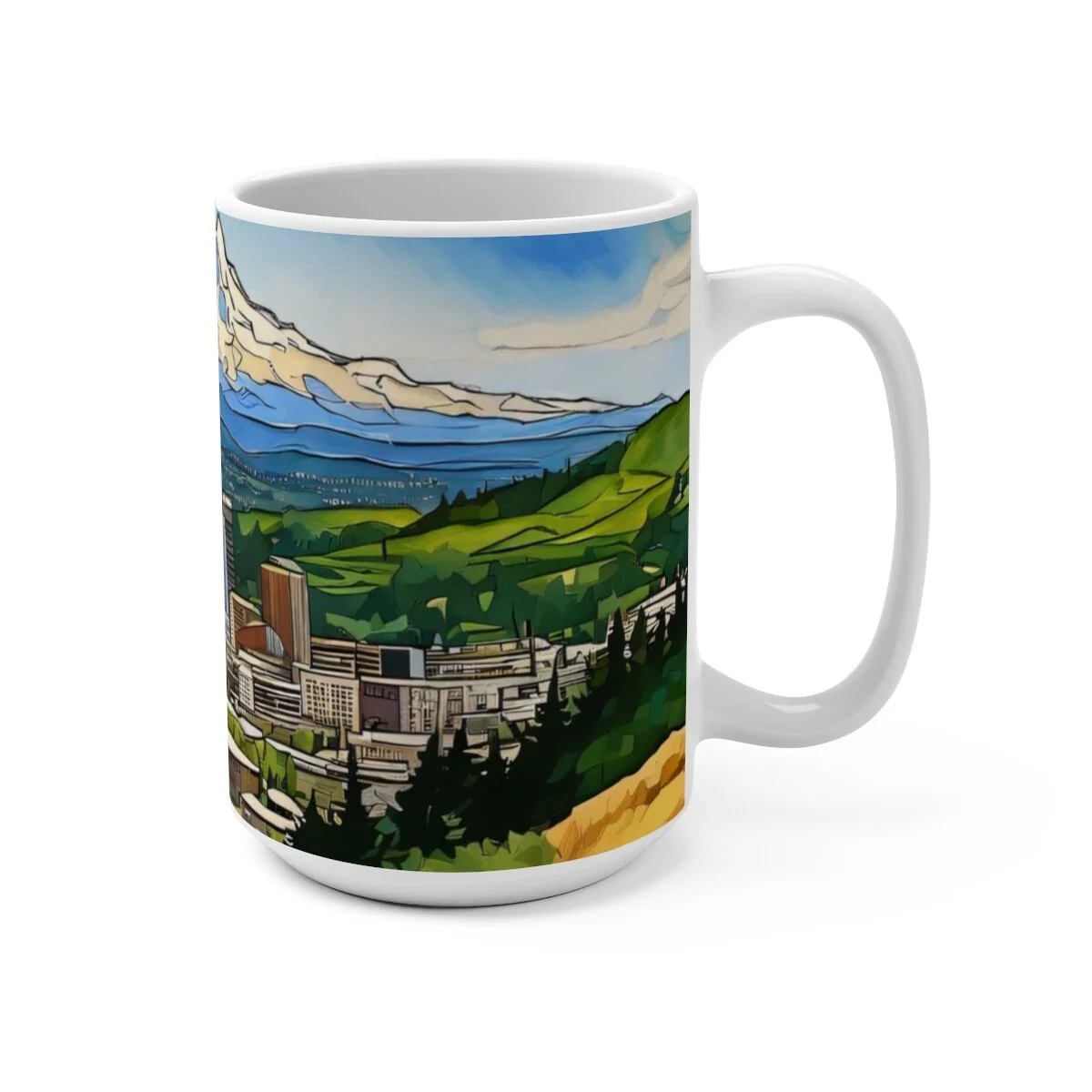 This coffee mug is designed with a vibrant watercolor image of the Portland, Oregon skyline nestled in the Willamette Valley, with Mount Hood in the background. There's never too much coffee! A big size (15oz) white, durable ceramic mug is just what you need. It's also perfect for tea and hot chocolate. This gorgeous, high quality mug is a great addition fot your personal collection and it makes it an appreciated gift to every true hot beverage lover.