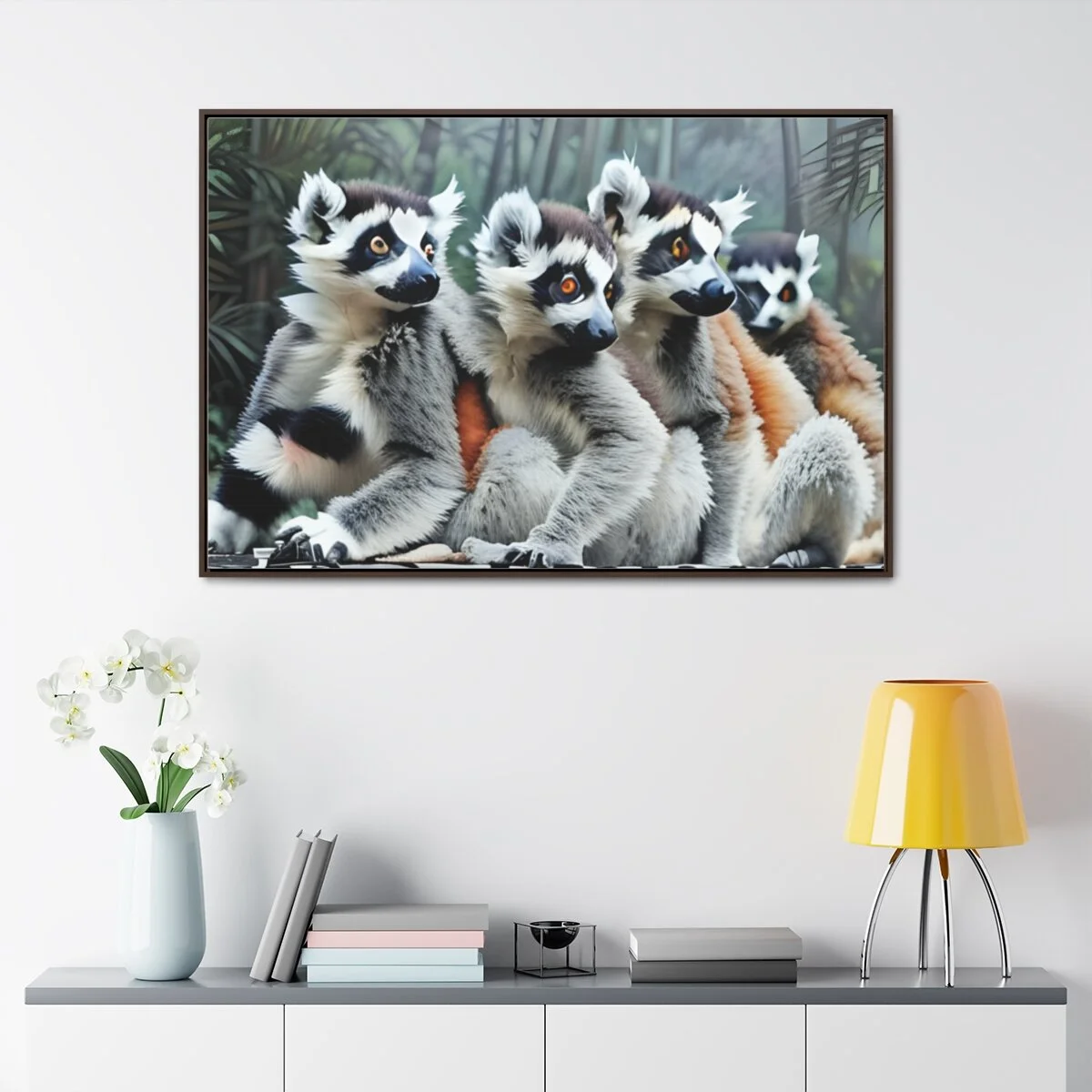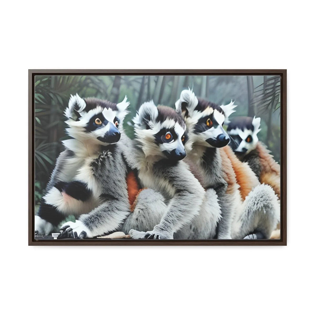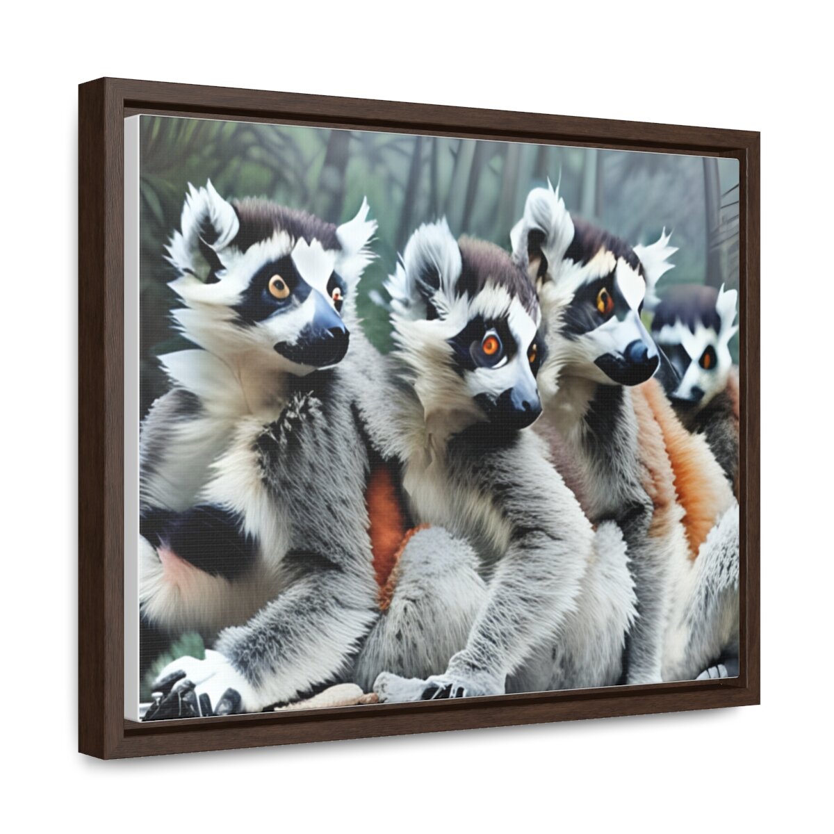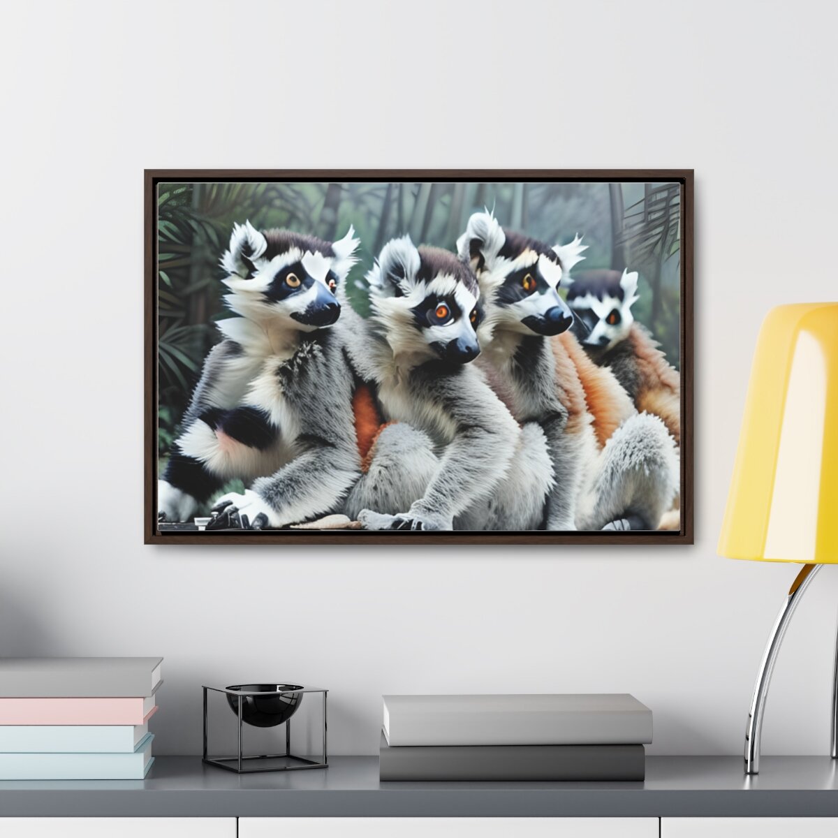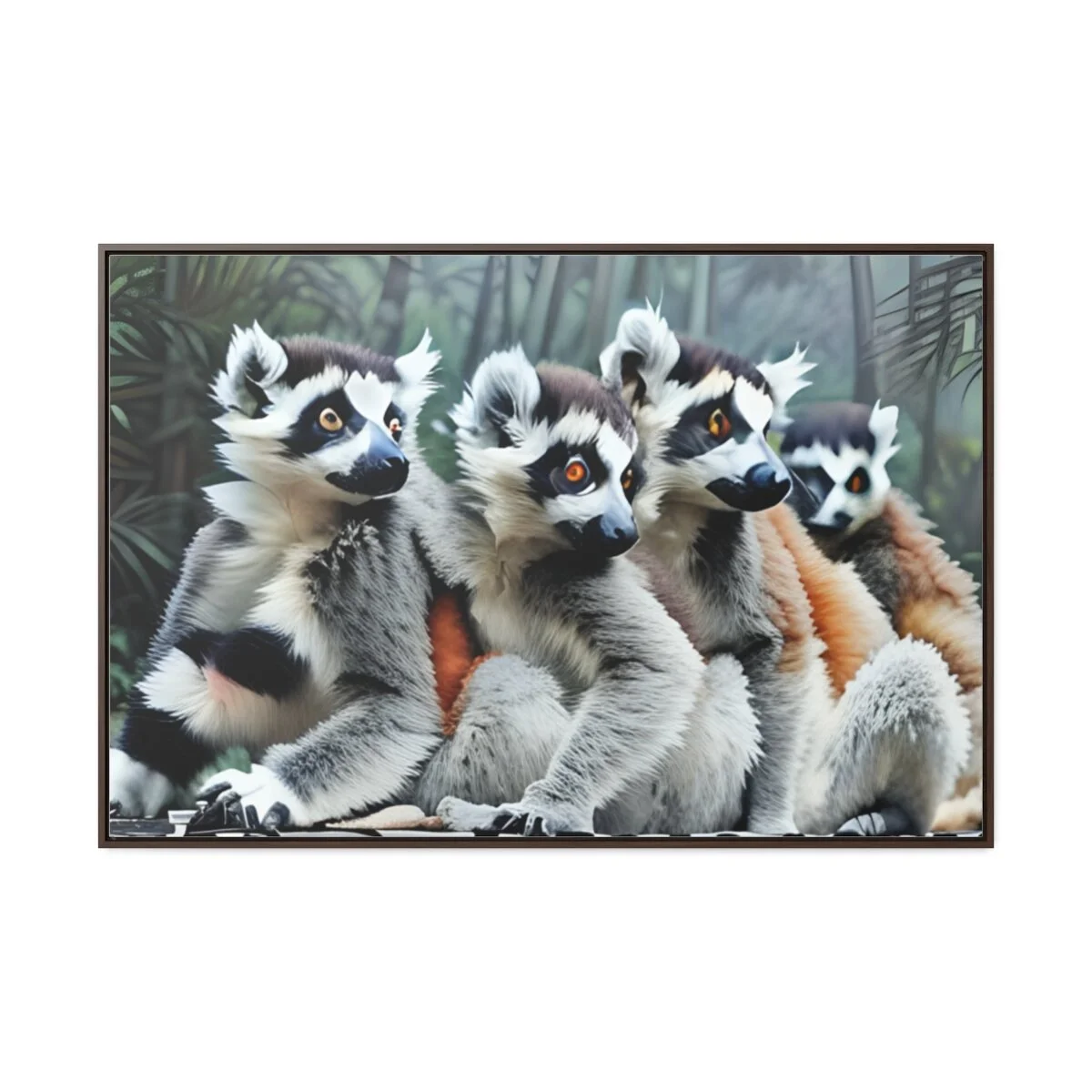 The Lemur Gang watercolor image will give any room a bit whimsical flair, and style. It's not something you are going to see every day. This horizontal gallery wrapped canvas print will always look as tight and flat as the day it was made. Every frame is built with a solid face to support the canvas and prevent deforming. Available in multiple sizes, comes in walnut and black frame options.