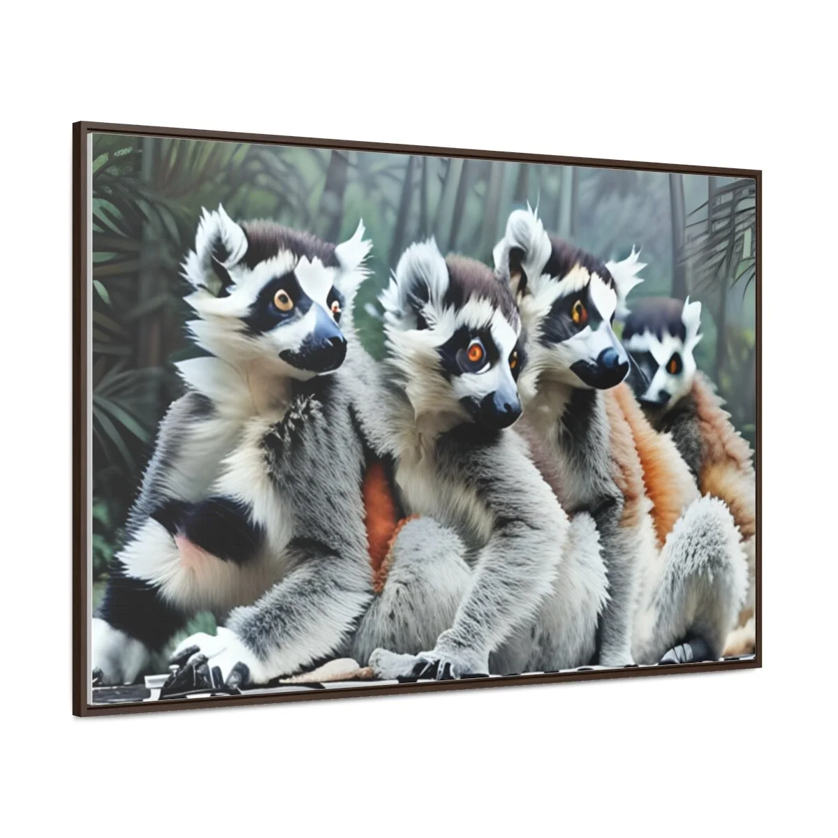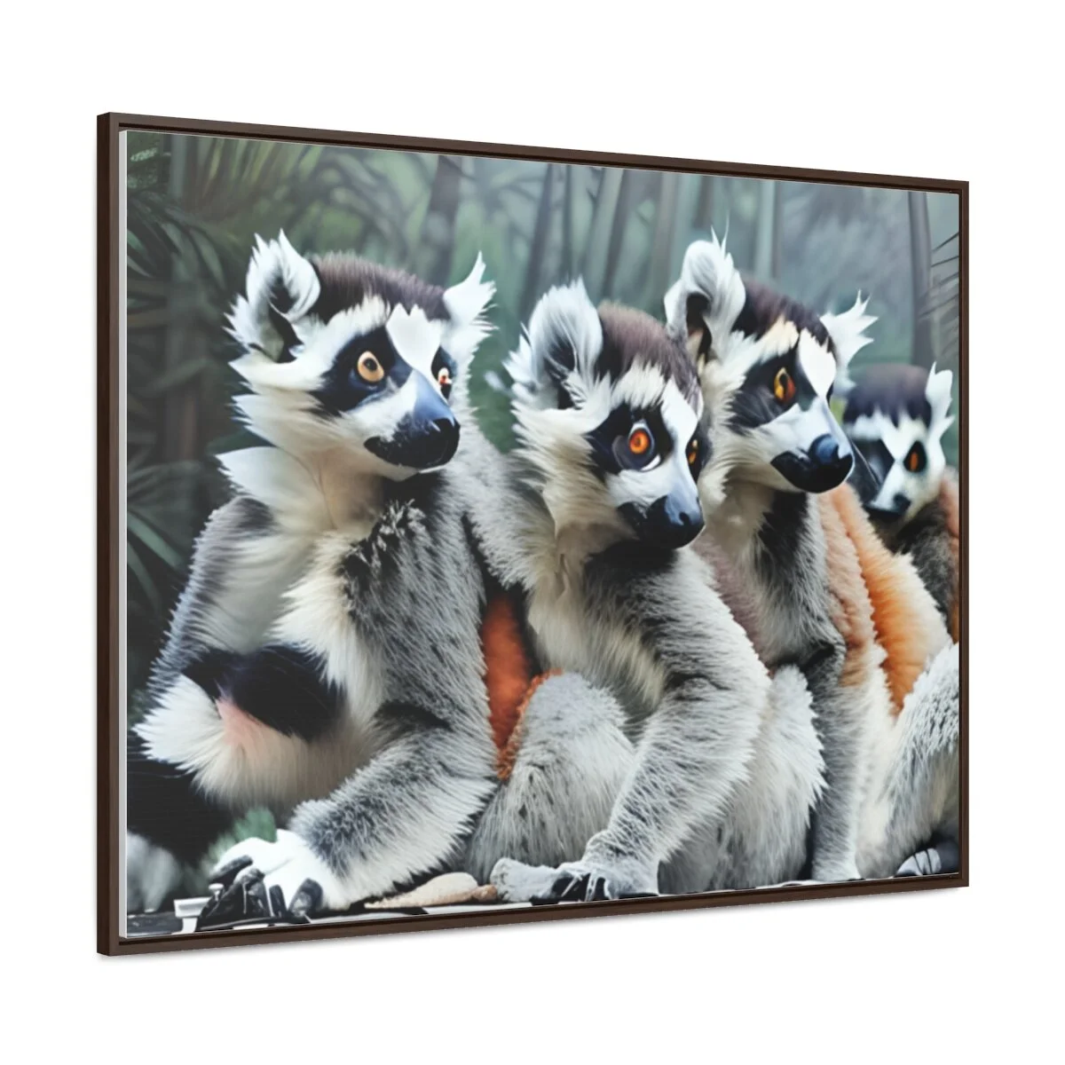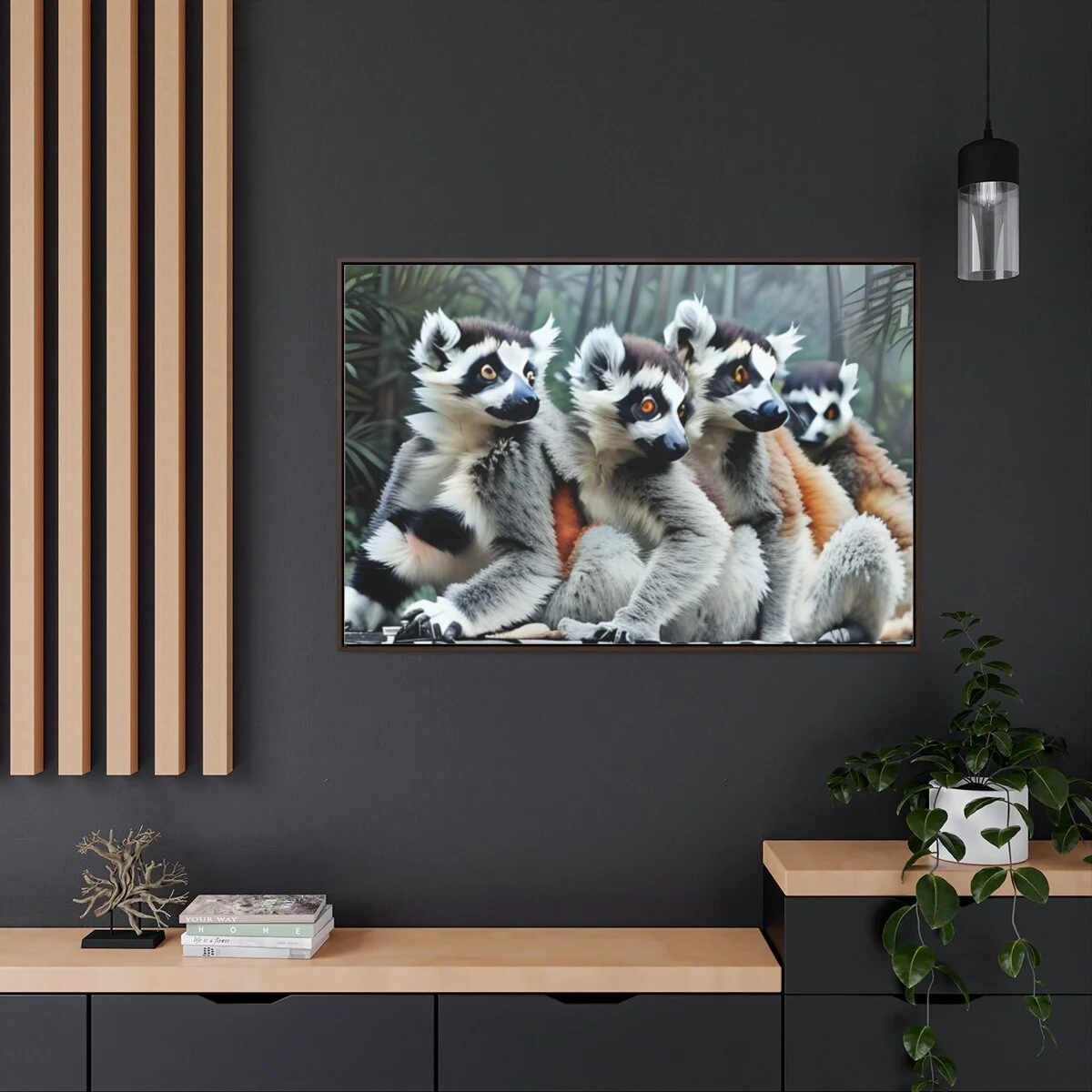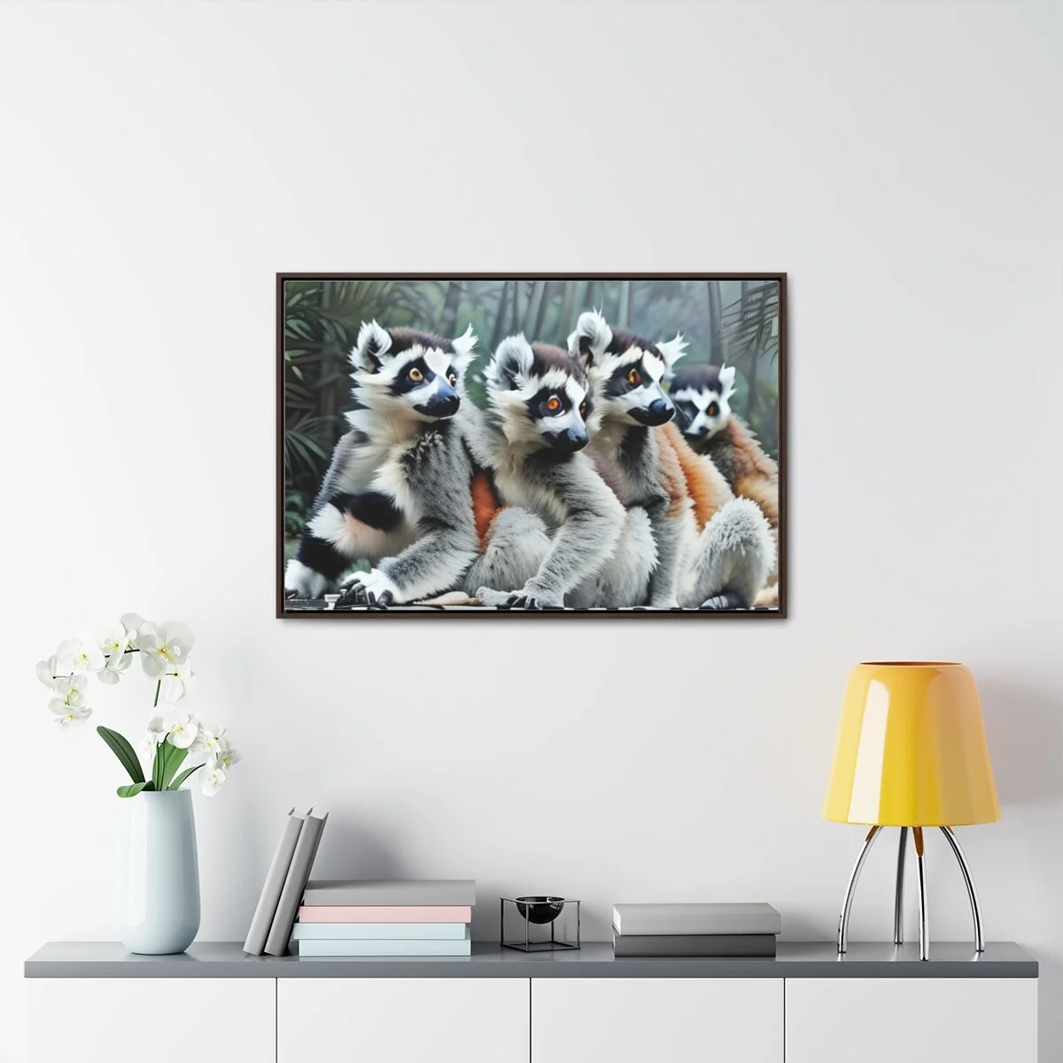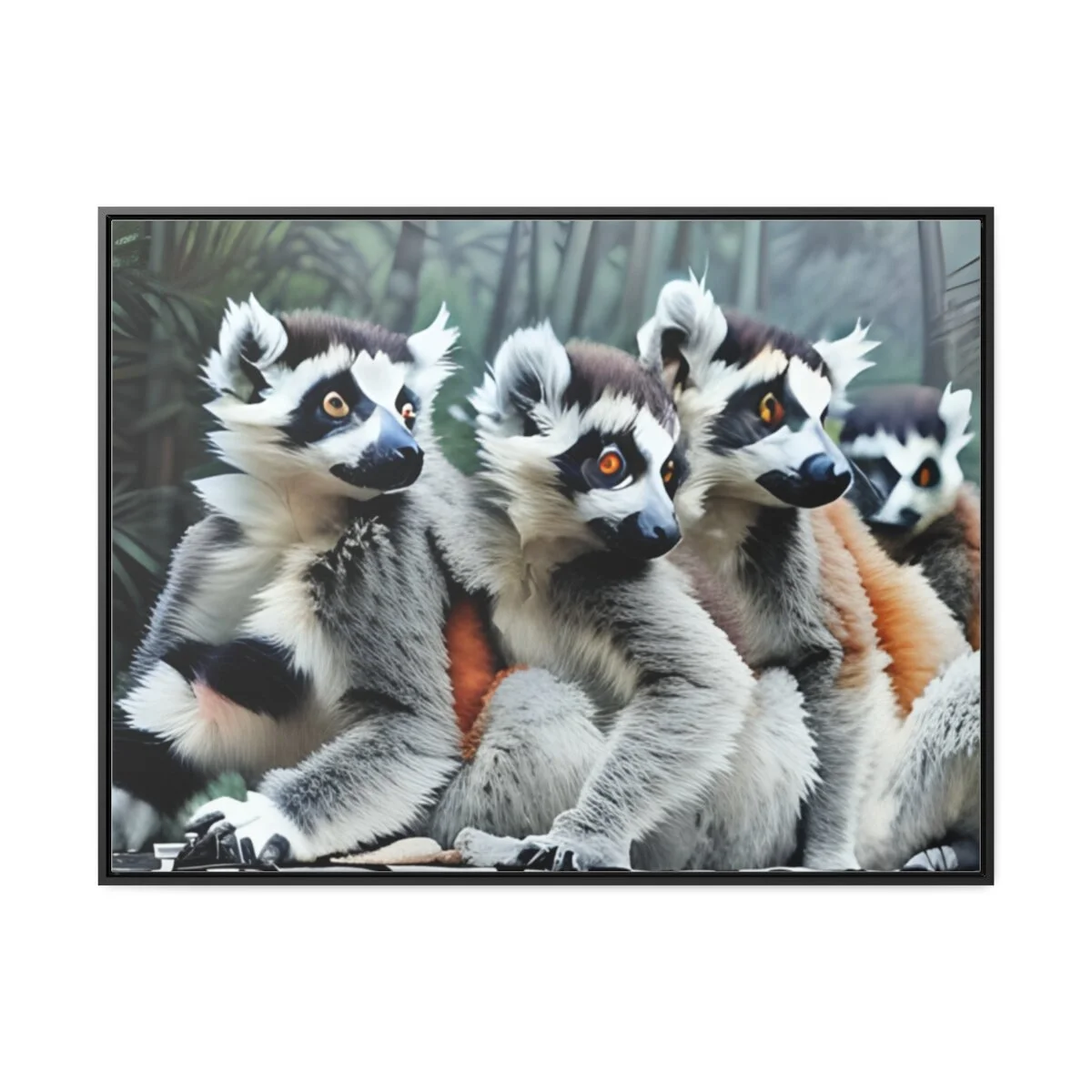 The Lemur Gang watercolor image will give any room a bit whimsical flair, and style. It's not something you are going to see every day. This horizontal gallery wrapped canvas print will always look as tight and flat as the day it was made. Every frame is built with a solid face to support the canvas and prevent deforming. Available in multiple sizes, comes in walnut and black frame options.